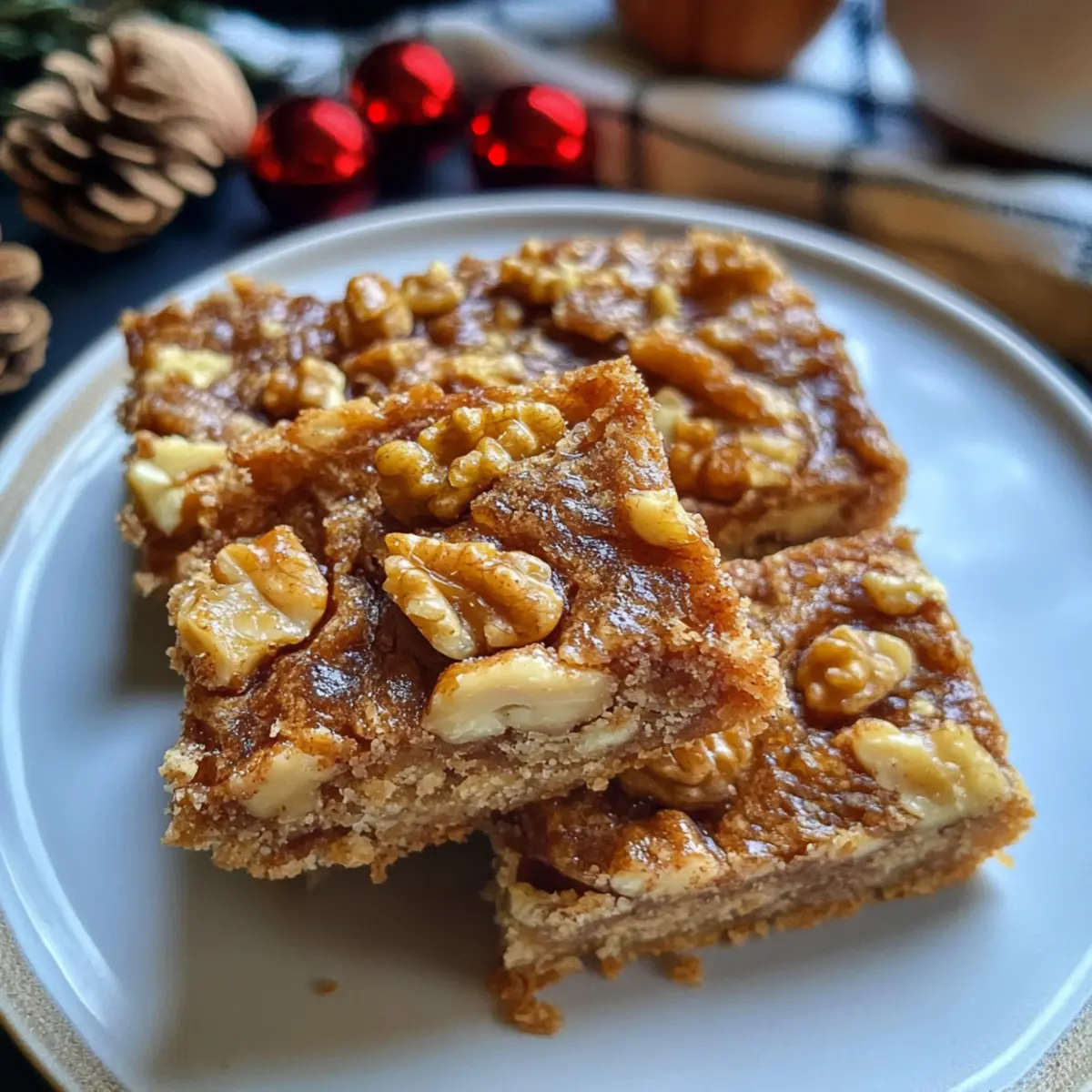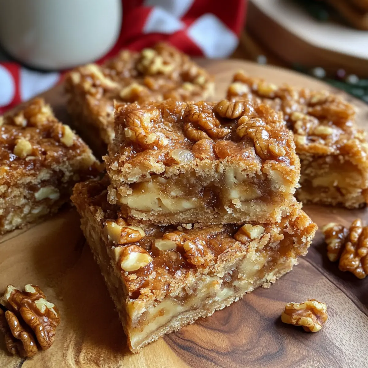 Als ich letztens durch einen kleinen Bauernmarkt schlenderte, fiel mein Blick auf einen frisch gepressten Ahornsirup, dessen süßer Duft Erinnerungen an kalte Winterabende weckte. In diesem Moment wusste ich, dass ich meine Liebe zu einem ganz besonderen Rezept teilen musste: Ahorn-Walnuss-Riegel. Diese köstlichen Bars vereinen eine buttrige, zarte Kruste mit einer cremigen, zähen Füllung aus Ahornsirup und knusprigen Walnüssen – das perfekte Dessert für jede Gelegenheit, besonders in der festlichen Saison. Die Zubereitung ist nicht nur schnell, sondern auch ideal für alle, die sich eine kleine Auszeit vom hektischen Alltag gönnen möchten. Wie wäre es, diese verführerische Kombination in eurer eigenen Küche auszuprobieren? Warum sind diese Ahorn-Walnuss-Riegel einzigartig? Einfachheit: Die Zubereitung dieser Riegel ist schnell und unkompliziert. Nur wenige Zutaten und grundlegende Backfähigkeiten genügen, um ein kreatives Dessert zu zaubern. Vielseitigkeit: Diese Riegel können nach Belieben mit anderen Nüssen oder sogar Schokoladenstückchen abgewandelt werden, was sie ideal für verschiedene Geschmäcker macht. Reicher Geschmack: Die Kombination aus reichhaltigem Ahornsirup und knackigen Walnüssen sorgt für einen unvergesslichen Genuss, der jeden begeistert. Perfekt für Feste: Egal ob Weihnachten oder einfach ein gemütlicher Abend zu Hause; sie bringen einen Hauch von Festlichkeit auf jede Desserttabelle. Zeitersparnis: Die Backzeit beträgt nur etwa 30 Minuten, sodass du die Riegel in kürzester Zeit genießen kannst. Für mehr inspirierende Rezepte, schau dir auch unsere leckeren Weihnachtsgebäcke an! Ahorn-Walnuss-Riegel Zutaten • Für jede Naschkatze, die frische und köstliche Aromen liebt! Butter – sorgt für die Reichhaltigkeit und eine zarte Kruste; kann durch Margarine ersetzt werden, um laktosefrei zu sein. Zucker – fügt der Kruste Süße hinzu; Kokosnusszucker kann für einen niedrigeren glykämischen Index verwendet werden. Mehl – bildet die Struktur der Kruste und bindet die Füllung; glutenfreies Mehl kann als Alternative genutzt werden. Zimt & Muskatnuss – verleihen der Kruste eine besondere Geschmacksnote; optional für jene, die es einfacher mögen. Salz – balanciert die Süße und verstärkt den Geschmack. Eier – bringen Feuchtigkeit und dienen als Bindemittel in der Füllung; für vegane Varianten können Leinsamen-Eier verwendet werden. Brauner Zucker – sorgt für eine tiefere Süße mit einem Hauch von Melasse; kann mit Kokosnusszucker ersetzt werden. Ahornsirup – der Herzstück der Füllung, der den unverwechselbaren Geschmack liefert; kann durch Agavensirup für ähnliche Süße ersetzt werden. Schlagsahne – trägt zur cremigen Textur der Füllung bei; kann durch Kokosnusscreme als laktosefreie Option ersetzt werden. Vanilleextrakt – verbessert den Gesamtgeschmack; kann weggelassen werden, wenn gewünscht. Walnüsse – sorgen für den knusprigen Biss und den nussigen Geschmack; können durch Pekannüsse ersetzt oder ganz weggelassen werden für nussfreie Riegel. Schritt-für-Schritt-Anleitung für Ahorn-Walnuss-Riegel Step 1: Backform vorbereiten Heize den Ofen auf 180 °C vor und lege eine 20 cm große Backform mit Backpapier aus. Die Backform sollte gleichmäßig bedeckt sein, um ein Ankleben der Riegel zu verhindern. Bereite dir alle Zutaten und Utensilien wie eine Rührschüssel, Mixer und eine Teigschaufel bereit, damit du im nächsten Schritt zügig arbeiten kannst. Step 2: Kruste zubereiten Vermische in einer Rührschüssel die Butter und den Zucker mit einem Mixer, bis die Mischung cremig und gleichmäßig ist. Füge langsam das Mehl, Zimt, Muskatnuss und Salz hinzu und rühre weiter, bis der Teig krümelig ist. Drücke die Mischung gleichmäßig in die vorbereitete Backform und backe sie 15-20 Minuten lang, bis sie leicht goldbraun ist. Step 3: Füllung aufschlagen In einer separaten Schüssel verquirlst du die Eier, den braunen Zucker, den Ahornsirup, die Schlagsahne, den Vanilleextrakt, das Mehl und das Salz, bis die Mischung schaumig und gut verbunden ist. Achte darauf, dass keine Klumpen entstehen, damit die Füllung gleichmäßig in den Riegeln verteilt werden kann. Step 4: Walnüsse hinzufügen Verteile die grob gehackten Walnüsse gleichmäßig über die gebackene Kruste. Gieße die vorbereitete Eiermischung gleichmäßig über die Walnüsse und achte darauf, dass alles gut abgedeckt ist. Diese Schicht sorgt für einen leckeren, nussigen Geschmack in den Ahorn-Walnuss-Riegeln. Step 5: Riegel backen Setze die Backform wieder in den Ofen und backe die Riegel für weitere 30-35 Minuten, bis die Füllung fest ist und die Oberfläche leicht goldbraun aussieht. Achte darauf, den Garprozess nicht zu übersehen, damit die Riegel schön saftig und nicht zu trocken werden. Step 6: Abkühlen und schneiden Lass die Riegel vollständig in der Backform abkühlen, bevor du sie heraushebst. Schneide die abgekühlten Riegel in 16 gleich große Stücke. Für besonders saubere Schnitte kannst du die Riegel nach dem Abkühlen auch für 30 Minuten in den Kühlschrank legen. Expert Tips für Ahorn-Walnuss-Riegel Teig Handling: Wenn der Teig während der Zubereitung klebrig ist, befeuchte deine Finger leicht, um das Drücken in die Form zu erleichtern. Kühlschrank-Trick: Stelle die Riegel nach dem Backen für 30 Minuten in den Kühlschrank, um schönere, saubere Schnitte zu erhalten. Nusswarnung: Informiere deine Gäste über die enthaltenen Walnüsse, um allergischen Reaktionen vorzubeugen. Variationen ausprobieren: Experimentiere, indem du anstelle von Walnüssen Pekannüsse oder gehackte Mandeln verwendest, um den Geschmack deiner Ahorn-Walnuss-Riegel zu variieren. Frische Zutaten: Achte darauf, frischen Ahornsirup zu verwenden, da dies den Geschmack der Füllung erheblich verbessert. Was passt zu Ahorn-Walnuss-Riegeln? Genieße diese himmlischen Riegel mit einer Auswahl an Beilagen, die perfekt ihre süßen und nussigen