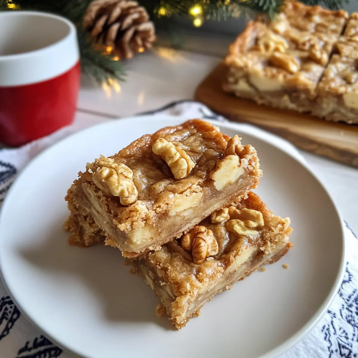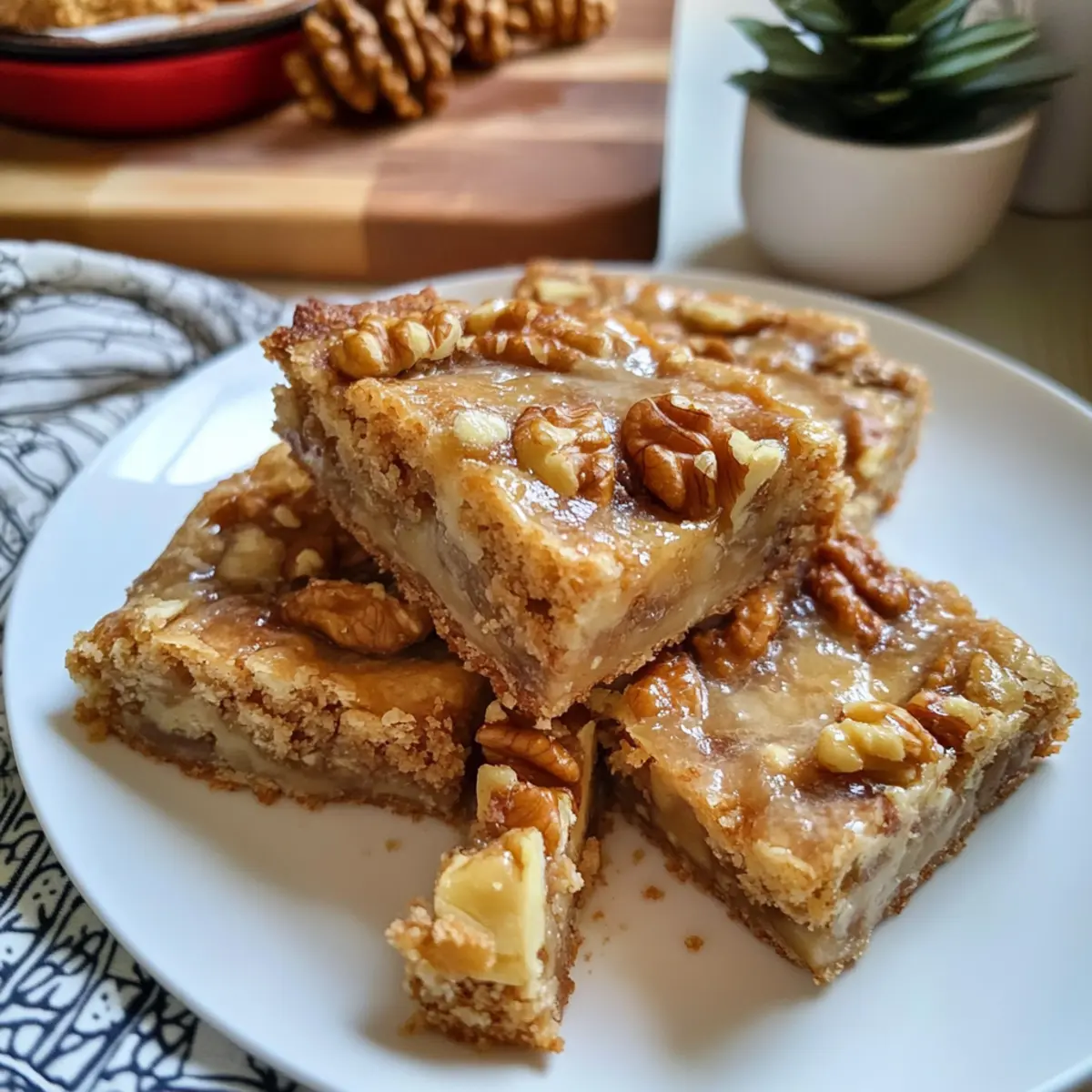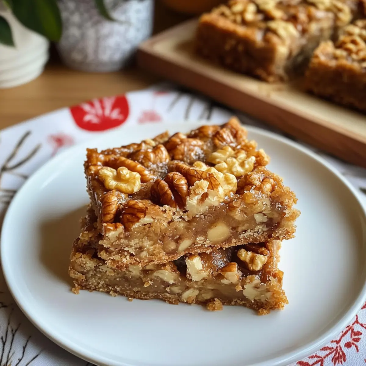 Die köstliche Kombination von Ahornsirup und knackigen Walnüssen ist für mich wie eine Umarmung an einem kalten Tag. Diese Ahorn-Walnuss-Riegel mit cremiger Füllung sind nicht nur eine wunderbare Nascherei, sondern auch der perfekte süße Snack für jede Gelegenheit, sei es für die festliche Kaffeetafel oder einfach zum Genießen am Nachmittag. Mit einem buttrigen Shortbread-Boden und einer weich-chewy Füllung sind sie eine echte Freude für die Tastebuds. Und das Beste daran? Die Zubereitung ist schnell und einfach, sodass du mehr Zeit mit deinen Freunden und deiner Familie verbringen kannst. Neugierig, wie man diese leckeren Riegel zaubert? Lass uns gemeinsam in die Welt der Aromen eintauchen! Warum sind diese Ahorn-Walnuss-Riegel ein Muss? Ein Genuss für alle: Diese Riegel kombinieren die Aromen von süßem Ahornsirup und knackigen Walnüssen, was sie unwiderstehlich macht. Einfache Zubereitung: Die Schritte sind simpel und schnell, selbst Anfänger in der Küche werden sie meistern. Perfekt für jeden Anlass: Ob zu Feierlichkeiten oder als snackige Nascherei am Nachmittag – sie passen immer. Texturen, die begeistern: Der buttrige Boden und die cremige Füllung sorgen für einen herrlichen Biss. Und wenn du mehr tolle Rezepte suchst, schau dir auch diese Köstlichen Kekse für die Feiertage an! Ahorn-Walnuss-Riegel Zutaten • Für den Boden Butter – sorgt für reichhaltigen Geschmack und eine gute Struktur im Boden. Stelle sicher, dass sie weich ist, um das Mischen zu erleichtern. Zucker – süßt den Boden; brauner Zucker kann für einen tieferen Geschmack verwendet werden. Weißes Mehl – bildet die Grundlage des Bodens und sorgt für Stabilität. Vollkornmehl kann für mehr Nährstoffe ausgetauscht werden. Zimt – verleiht dem Boden Wärme und Gewürz; Muskatnuss ist eine gute Alternative, wenn Zimt nicht verfügbar ist. Muskatnuss – ergänzt den Zimt; kann weggelassen werden, wenn sie nicht vorhanden ist. Salz – hebt den Geschmack der anderen Zutaten hervor; eine Prise Meersalz passt hier gut. • Für die Füllung Eier – sorgen für Struktur und Feuchtigkeit; verwende Leinsamen für eine vegane Variante. Brauner Zucker – bringt Tiefe und Geschmack in die Füllung; weißer Zucker kann als Ersatz genutzt werden. Ahornsirup – verleiht der Füllung ihren charakteristischen Geschmack und Süße; benutze bestenfalls reinen Ahornsirup. Schlagsahne – sorgt für Reichhaltigkeit in der Füllung; für eine leichtere Variante kannst du auch Halbfett-Sahne oder Kokoscreme verwenden. Vanilleextrakt – verbessert das Geschmackserlebnis insgesamt; kann weggelassen werden, wenn erforderlich. Hackwalnüsse – sorgen für Textur und Geschmack; Mandeln oder Pekannüsse sind ebenfalls gute Alternativen. Diese Ahorn-Walnuss-Riegel sind eine gelungene Kombination aus Geschmack und Konsistenz, perfekt für jeden Anlass! Schritt-für-Schritt-Anleitung für Ahorn-Walnuss-Riegel Schritt 1: Ofen Vorheizen Heize den Ofen auf 180°C (350°F) vor. Bereite eine 20×20 cm (8×8 Zoll) Backform vor, indem du sie einfettest und mit Backpapier auslegst, damit sich die Riegel später leichter herausnehmen lassen. Diese Vorbereitung ist entscheidend für das perfekte Backergebnis der Ahorn-Walnuss-Riegel. Schritt 2: Den Boden Zubereiten In einer Rührschüssel die weiche Butter mit dem Zucker cremig schlagen, bis die Mischung leicht und schaumig ist. Dann das Mehl, Zimt, Muskatnuss und Salz hinzufügen und alles gut vermengen, bis ein krümeliger Teig entsteht. Drücke die Mischung gleichmäßig in die vorbereitete Backform und backe sie 15-20 Minuten lang, bis der Boden leicht golden und fest ist. Schritt 3: Füllung Vorbereiten Während der Boden bäckt, kannst du die Füllung zubereiten. In einer separaten Schüssel die Eier, den braunen Zucker, den Ahornsirup, die Schlagsahne, den Vanilleextrakt, etwas zusätzliches Mehl und eine Prise Salz mit einem Schneebesen gut aufschlagen, bis die Mischung schaumig ist. Diese Füllung sorgt für die köstliche cremige Textur der Ahorn-Walnuss-Riegel. Schritt 4: Riegel Zusammenstellen Sobald der Boden fertig gebacken ist, nimm ihn aus dem Ofen und streue die gehackten Walnüsse gleichmäßig darüber. Gieße die vorbereitete Füllung vorsichtig auf den Walnüssen und den gebackenen Boden. Schiebe die Form zurück in den Ofen und backe die Riegel weitere 30-35 Minuten, bis die Füllung fest und leicht goldbraun wird. Schritt 5: Abkühlen und Schneiden Lass die Ahorn-Walnuss-Riegel in der Form abkühlen, damit sie sich setzen können. Nutze das Backpapier, um die Riegel vorsichtig herauszuheben. Schneide sie dann in 16 gleichmäßige Quadrate. Diese Schritte sorgen dafür, dass die Riegel die perfekte Konsistenz und Optik haben und sich gut portionieren lassen. Tipps für die besten Ahorn-Walnuss-Riegel Butter richtig wählen: Achte darauf, dass die Butter weich ist, damit sie sich leicht mit dem Zucker vermischen lässt. Dies sorgt für eine gleichmäßige Textur im Boden. Zucker-Optionen nutzen: Experimentiere mit braunem Zucker statt weißem für einen intensiveren Karamellgeschmack in der Füllung. Dies passt perfekt zu den Ahorn-Walnuss-Riegeln. Teig nicht übermischen: Vermeide es, den Teig für den Boden zu übermischen, da dies die Riegel zäh machen kann. Mische nur so lange, bis alles gut kombiniert ist. Füllung gut aufschlagen: Stelle sicher, dass die Füllung schaumig und gut vermischt ist, bevor du sie über die Walnüsse gießt. So wird die Füllung schön cremig und gleichmäßig. Riegel richtig schneiden: Um saubere Schnitte zu erzielen, lass die Riegel nach dem Abkühlen im Kühlschrank für etwa 30 Minuten ruhen, bevor du sie schneidest. Das gibt dir schöne, gleichmäßige Stücke. Ahorn-Walnuss-Riegel für die optimale Vorbereitung Die Ahorn-Walnuss-Riegel sind perfekt für alle, die Zeit sparen möchten! Du kannst die Grundzutaten für den Boden (Butter, Zucker, Mehl, Zimt, Muskatnuss und Salz) bis zu 24 Stunden im Voraus zusa