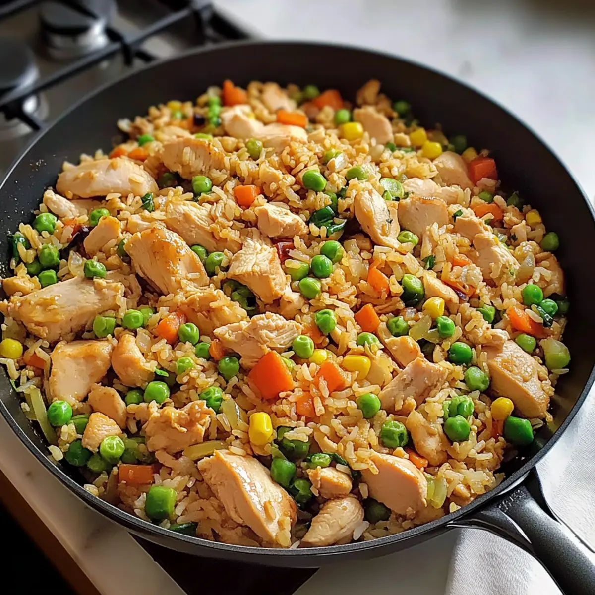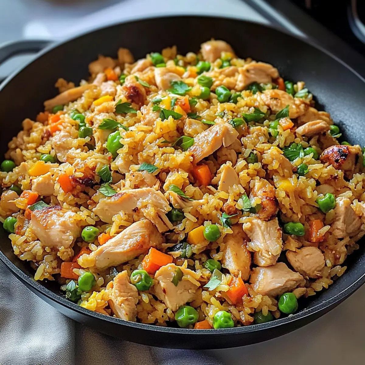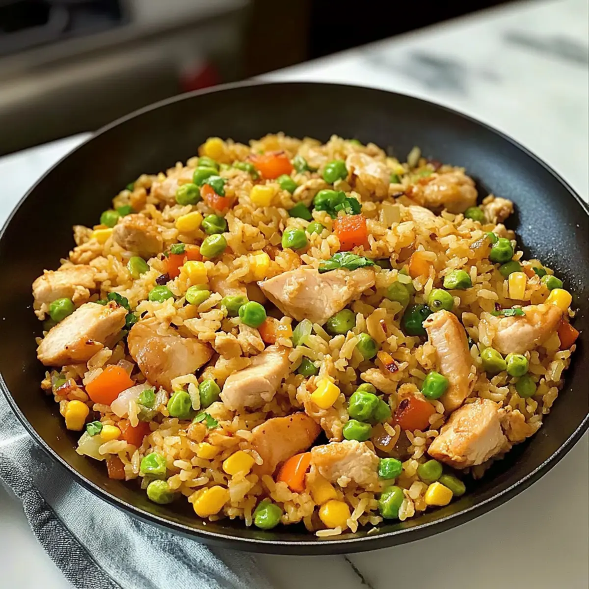 Stell dir vor, du kommst nach einem langen Tag nach Hause und der Magen knurrt laut, während du sehnlichst auf etwas Leckeres wartest. Genau hier kommt mein Rezept für Asiatischer Hähnchen gebratener Reis ins Spiel! Dieses Rezept ist nicht nur ein echter Lebensretter für hektische Wochentage, sondern bietet auch die perfekte Möglichkeit, übrig gebliebenen Reis kreativ zu verwerten. In nur 20 Minuten zauberst du ein schmackhaftes Gericht, das mit zartem Hähnchen, knackigem Gemüse und einer köstlichen Soße glänzt. Der große Pluspunkt? Es ist ein vielgesichtiger, einpfänniger Genuss, der dir auch beim Aufräumen viel Zeit spart! Welche aufregende Anpassung wirst du diesem Rezept geben? Warum wirst du dieses Rezept lieben? Einfachheit auf den Punkt: Die Zubereitung ist kinderleicht und erfordert nur grundlegende Kochfähigkeiten. Schnelle Vorbereitung: In nur 20 Minuten hast du ein komplettes, schmackhaftes Abendessen auf dem Tisch. Vielseitige Optionen: Du kannst das Rezept problemlos anpassen, indem du verschiedene Gemüse oder Proteine wie Garnelen oder Tofu verwendest. Frische Aromen: Die Kombination aus würziger Soße und knackigem Gemüse garantiert einen unverwechselbaren Geschmack. Wenig Abfall: Nutze deinen übrig gebliebenen Reis und genieße ein Gericht, das den Abfall minimiert und gleichzeitig köstlich ist. Ein Pfannen-Wunder: Weniger Geschirr, mehr Freude – alles wird in einer einzigen Pfanne zubereitet! Lass dich von diesem Rezept inspirieren und entdecke weitere schnelle Rezepte wie mein schnelles Gemüse-Curry. Asiatischer Hähnchen gebratener Reis Zutaten • Diese Zutaten sorgen für ein köstliches und ausgewogenes Gericht, das einfach zuzubereiten ist. Für die Soße Chinesischer Kochwein – Verleiht der Soße eine tiefere Geschmacksnote; alternativ kann trockener Sherry verwendet werden. Austernsauce – Fügt einen herzhaften Umami-Geschmack hinzu; vegetarische Austernsauce ist eine großartige pflanzliche Option. Hellsojasauce – Gibt dem Gericht die nötige Salzigkeit; für glutenfreie Optionen eignet sich Tamari. Sesamöl – Sorgt für ein nussiges Aroma; kann durch Pflanzenöl ersetzt werden, wenn ein neutraler Geschmack gewünscht ist. Weißer Pfeffer – Bietet eine subtile Schärfe; schwarzer Pfeffer kann ebenfalls verwendet werden. Für das Hauptgericht Eier – Liefern Protein und sorgen für eine angenehme Textur; für eine vegane Variante kann Seidentofu genutzt werden. Hähnchenbrust – Die Hauptproteinquelle, klein geschnitten für schnelles Garen; kann durch Garnelen oder Tofu ersetzt werden. Knoblauch – Fügt aromatische Tiefe hinzu; falls kein frischer Knoblauch zur Hand ist, ist Knoblauchpulver eine gute Alternative. Zwiebel – Sorgt für Süße und bildet die Geschmacksbasis; Schalotten können für einen milderen Geschmack verwendet werden. Bacon – Verleiht dem Gericht einen rauchigen Geschmack; kann durch Truthahnbacon oder ganz weggelassen werden. Für das Gemüse Karotte – Fügt Farbe und milde Süße hinzu; Zucchini oder Paprika können ebenfalls verwendet werden. Mais – Bringt Süße und Textur ins Gericht; frischer oder gefrorener Mais eignet sich gut, oder kann weggelassen werden. Erbsen – Bieten einen süßen Pop bei jedem Biss; Edamame ist eine tolle Alternative. Frisch gekochter weißer Reis – Am besten ist übrig gebliebener Reis für die optimale Konsistenz; frischen Reis auf einem Backblech auskühlen lassen. Für die Garnitur Frühlingszwiebeln – Zur Garnierung und für zusätzlichen Geschmack; die grünen Teile separat zur Fertigstellung des Gerichts aufbewahren. Bereite dich jetzt darauf vor, deinen eigenen asiatischen Hähnchen gebratenen Reis in nur 20 Minuten zuzubereiten! Schritt-für-Schritt-Anleitung für Asiatischer Hähnchen gebratener Reis Step 1: Soße zubereiten Mische in einer Schüssel den chinesischen Kochwein, die Austernsauce, die Hellsojasauce, das Sesamöl, den weißen Pfeffer und den gemahlenen Ingwer gut durch. Lasse die Soße beiseite, während du die anderen Zutaten vorbereitest. Dies sorgt dafür, dass sich die Aromen gut miteinander verbinden und deinem Asiatischen Hähnchen gebratenen Reis eine köstliche Tiefe verleihen. Step 2: Zutaten vorbereiten Hacke den Knoblauch fein und schneide die Zwiebel sowie die Karotte in kleine Würfel. Teile die Frühlingszwiebeln, indem du die Weißen und die Grünen separat aufbewahrst. Schneide das Hähnchen und den Bacon in Stücke von etwa 1,5 cm. Mit diesen Vorbereitungen bist du bereit für die nächsten Schritte und kannst gleich mit dem Kochen beginnen. Step 3: Eier kochen Erhitze einen Wok bei mittlerer bis hoher Temperatur und füge einen Esslöffel Öl hinzu. Schlage die Eier in die heiße Pfanne und rühre sie etwa 2-3 Minuten, bis sie leicht gestockt und goldgelb sind. Nimm die Eier dann vom Feuer und lege sie auf einen Teller. Dies gibt deinem Asiatischen Hähnchen gebratenen Reis eine wunderbare Textur und zusätzlichen Geschmack. Step 4: Bacon und Aromastoffe anbraten Gib das verbleibende Öl in den Wok und erhitze es. Füge den Bacon hinzu und brate ihn für etwa eine Minute, bis er leicht knusprig ist. Gib dann den gehackten Knoblauch und die Zwiebel hinzu und brate alles für 30 Sekunden weiter, bis die Aromen freigesetzt werden und die Zwiebel leicht glasig ist. Dies bildet die aromatische Basis deines Gerichts. Step 5: Hähnchen garen Füge die Hähnchenstücke in den Wok und brate sie für etwa 1 bis 1,5 Minuten, bis sie außen goldbraun sind und innen nicht mehr rosa sind. Achte darauf, die Stücke gut zu verteilen, damit sie gleichmäßig garen. Dadurch erhält dein Asiatischer Hähnchen gebratener Reis saftiges und zartes Fleisch. Step 6: Gemüse hinzufügen Gib die gewürfelte Karotte, den Mais und die Erbsen in den Wok. Brate sie für weitere 1-2 Minuten an, bis sie leicht aufgeheizt, aber noch knackig sind. Dies sorgt für einen schönen Kontrast in der Textur zu deinem Hähnchen und bringt frische Aromen in den A