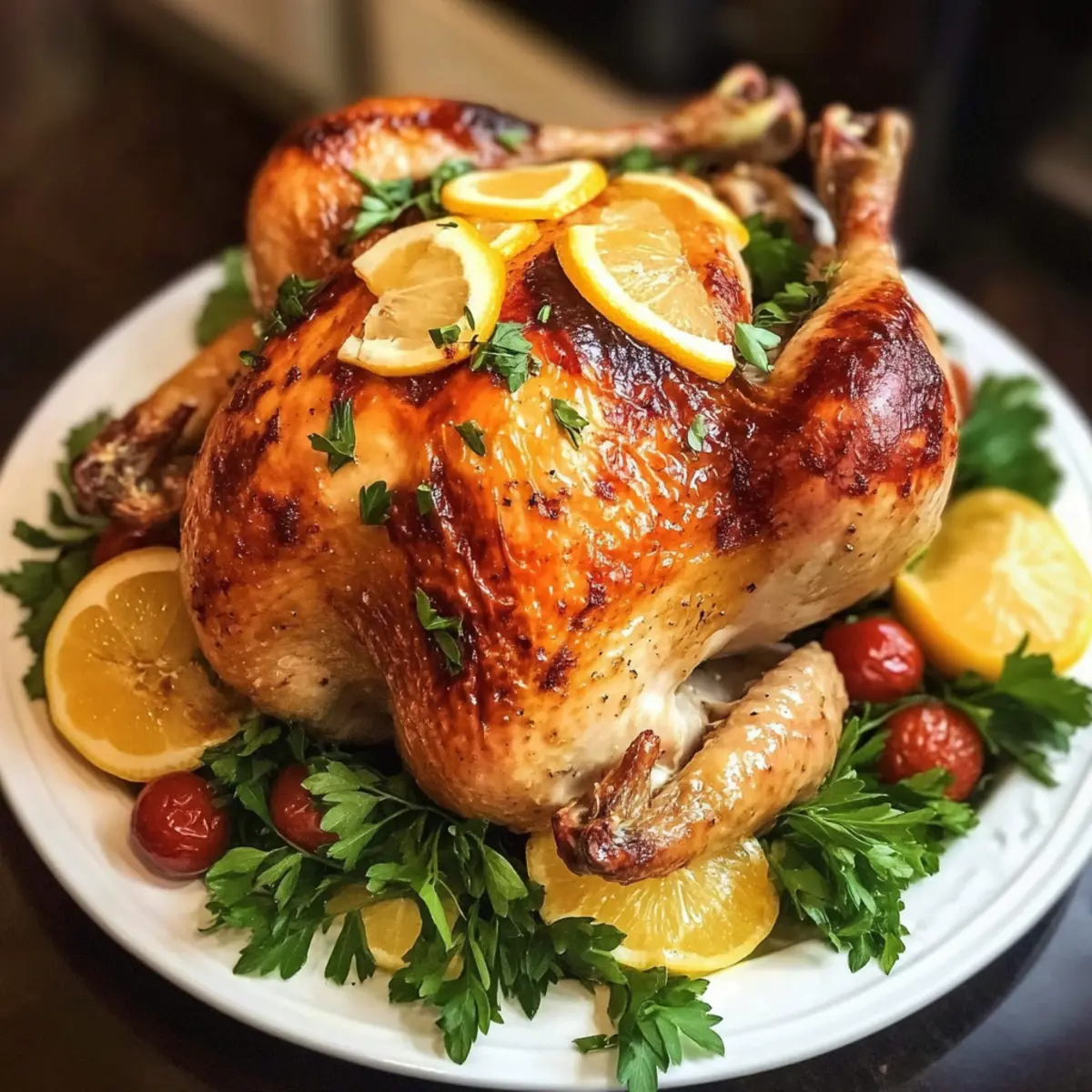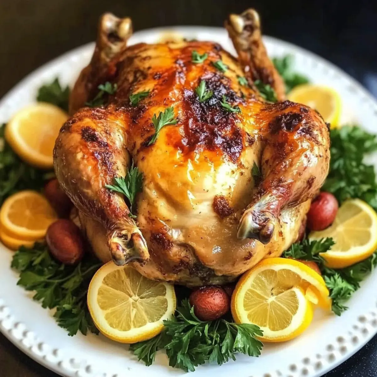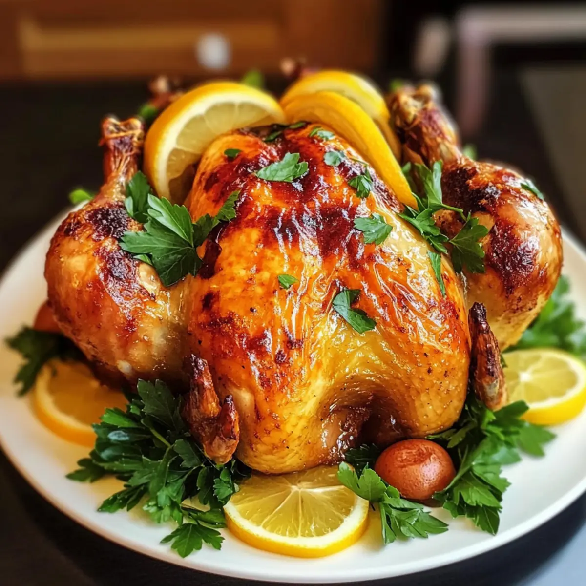 „Hast du schon einmal den Duft von frisch gebratenem Hähnchen erlebt, der durch dein Zuhause zieht? Dieses Backofen Röst Hähnchen Rezept ist nicht nur ein Fest für die Sinne, sondern auch ein wahrer Publikumsmagnet für deine nächste Familienfeier oder als köstliche Alternative zu Truthahn an den Feiertagen. Mit einer Kombination aus aromatischen Kräutern, spritziger Zitrone und zartem Knoblauch wird jedes Stück zu einem saftigen Genuss. Und das Beste? Es ist angenehm schnell zubereitet und kann sowohl im Ofen als auch im Air Fryer gegart werden. Bist du bereit, dein Kocherlebnis auf die nächste Stufe zu heben und deinen Lieben ein unvergessliches Abendessen zu zaubern? Lass uns loslegen!“ Warum dieses Röst Hähnchen Rezept unwiderstehlich ist? Einfachheit, die begeistert: Dieses Röst Hähnchen Rezept erfordert nur grundlegende Kochkenntnisse und ist daher ideal für Küchenneulinge und erfahrene Köche. Zarte Aromen: Aromatische Kräuter und spritzige Zitrone verleihen jedem Bissen eine frische Note und machen das Gericht zu einem echten Geschmackserlebnis. Vielfalt der Zubereitung: Egal, ob du den traditionellen Ofen oder den modernen Air Fryer verwendest, dieses Rezept passt sich deinem Küchenstil an. Perfekte Geselligkeit: Ideal für Familienfeiern oder als köstliche Alternative zu Truthahn – alle werden begeistert sein! Zeitersparnis: Mit nur wenigen Schritte erreichst du Ergebnisse, die alle verblüffen werden. Immer eine tolle Idee, um deine Gäste zu beeindrucken. Praktische Lagerung: Reste können problemlos aufbewahrt und erneut genossen werden – perfekt für Meal Prep oder schnelle Abendessen während der Woche. Backofen Röst Hähnchen Zutaten • Entdecke die Geheimnisse hinter diesem köstlichen Rezept! Für das Hähnchen Ganzes Hähnchen (1,8 kg) – Hauptzutat; sorgt für reichlich Protein und Geschmack. Achte darauf, die Innereien und den Hals zu entfernen. Geschmolzene ungesalzene Butter (60 ml) – Fügt Reichtum hinzu und sorgt für eine knusprige Haut. Kann für eine milchfreie Variante durch Olivenöl ersetzt werden. Extra natives Olivenöl (60 ml) – Verstärkt den Geschmack und hilft beim Bräunen. Bei Bedarf durch ein anderes Öl wie Avocado ersetzen. Weißwein (60 ml, Chardonnay) – Bringt Tiefe in den Geschmack; kann durch Hühnerbrühe ersetzt werden, wenn du alkoholfrei bleiben möchtest. Meersalz – Wichtig für die Würze; nach Geschmack anpassen. Frisch gemahlener schwarzer Pfeffer – Sorgt für eine würzige Note; je nach Vorliebe anpassen. Frisch gepresster Zitronensaft (30-45 ml) – Bringt Frische und hält das Fleisch saftig; Limettensaft kann als Alternative verwendet werden. Knoblauchzehen (4, fein gehackt) – Verleiht Aroma und Geschmack; kann durch Knoblauchpulver ersetzt werden, wenn kein frischer verfügbar ist. Frische Petersilie (3 EL, gehackt) – Fügt Frische hinzu; kann durch andere Kräuter wie Thymian oder Oregano ersetzt werden. Große Zitrone (1, für die Füllung) – Gibt während des Röstens einen zitrusfrischen Geschmack ab. Große Knoblauchknolle (1, in der Mitte durchgeschnitten) – Sorgt für zusätzlichen Geschmack; kann durch mehr gehackten Knoblauch ersetzt werden. Frische Rosmarin- oder Thymianzweige (3) – Bieten ein würziges Aroma; für die trockene Variante weniger verwenden. Für die Zubereitung Backpapier – Um das Backblech vorzubereiten und das Hähnchen leichter zu transportieren. Mit diesen Zutaten bist du bereit, ein unwiderstehliches Backofen Röst Hähnchen Rezept zuzubereiten, das garantiert jeden Gaumen verzaubert! Schritt-für-Schritt-Anleitung für das Backofen Röst Hähnchen Rezept Step 1: Ofen vorheizen Heize deinen Backofen auf 220°C (420°F) vor. Während der Ofen aufheizt, lege ein Backblech mit Backpapier aus, um das Röst Hähnchen leicht zu transportieren und das Blech vor anhaftendem Fett zu schützen. Achte darauf, dass der Ofen wirklich die richtige Temperatur erreicht, bevor du mit dem nächsten Schritt fortfährst. Step 2: Gewürzmischung zubereiten In einer Schüssel kombinierst du die geschmolzene Butter, das Olivenöl, den Weißwein, Salz, Pfeffer, Zitronensaft, Knoblauch und die frisch gehackte Petersilie. Rühre die Zutaten gut um, bis alles gleichmäßig vermischt ist. Diese Gewürzmischung wird die Grundlage für den vollen Geschmack in deinem Backofen Röst Hähnchen Rezept sein. Step 3: Hähnchen würzen Reibe die Hälfte der prepared Gewürzmischung gleichmäßig über das ganze Hähnchen, sodass es gut bedeckt ist. Die restliche Mischung füllst du in die Bauchhöhle des Hähnchens hinein, damit das Fleisch während des Garens die köstlichen Aromen aufsaugen kann. Dies ist ein entscheidender Schritt, um sicherzustellen, dass jedes Stück zart und geschmackvoll wird. Step 4: Hähnchen füllen Fülle nun die Bauchhöhle des Hähnchens mit einer ganzen Zitrone, der halbierten Knoblauchknolle und den frischen Kräuterzweigen. Diese Füllung trägt dazu bei, die Aromen während des Röstens zu intensivieren. Binde die Füße des Hähnchens mit Küchengarn zusammen, damit die Füllung beim Braten nicht herausfällt. Step 5: Hähnchen rösten Platziere das Hähnchen mit der Brustseite nach oben auf das vorbereitete Backblech. Röste das Hähnchen für etwa 1 Stunde und 20 Minuten. Baste das Hähnchen nach 30 Minuten und erneut nach einer Stunde mit dem austretenden Bratensaft, um die Haut knusprig und das Fleisch saftig zu halten. Achte darauf, dass der Saft klar ist und die Innentemperatur 75°C (165°F) erreicht. Step 6: Letzte Berührung Optional kannst du das Hähnchen für weitere 3-4 Minuten unter den Grill stellen, um eine noch goldene und knusprige Haut zu erzielen. Behalte das Hähnchen dabei im Auge, damit es nicht zu dunkel wird. Dieses Extra gibt deinem Backofen Röst Hähnchen Rezept den perfekten Abschluss. Step 7: Ruhen lassen und servieren Lasse das Hähnchen nach dem Rösten für etwa 10 Minuten unter Folie ruhen, damit sich die Säfte setzen