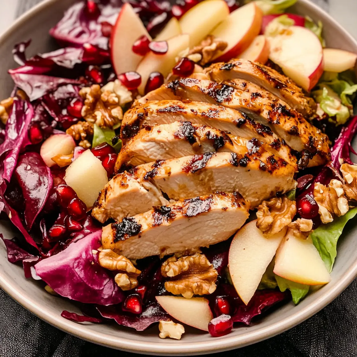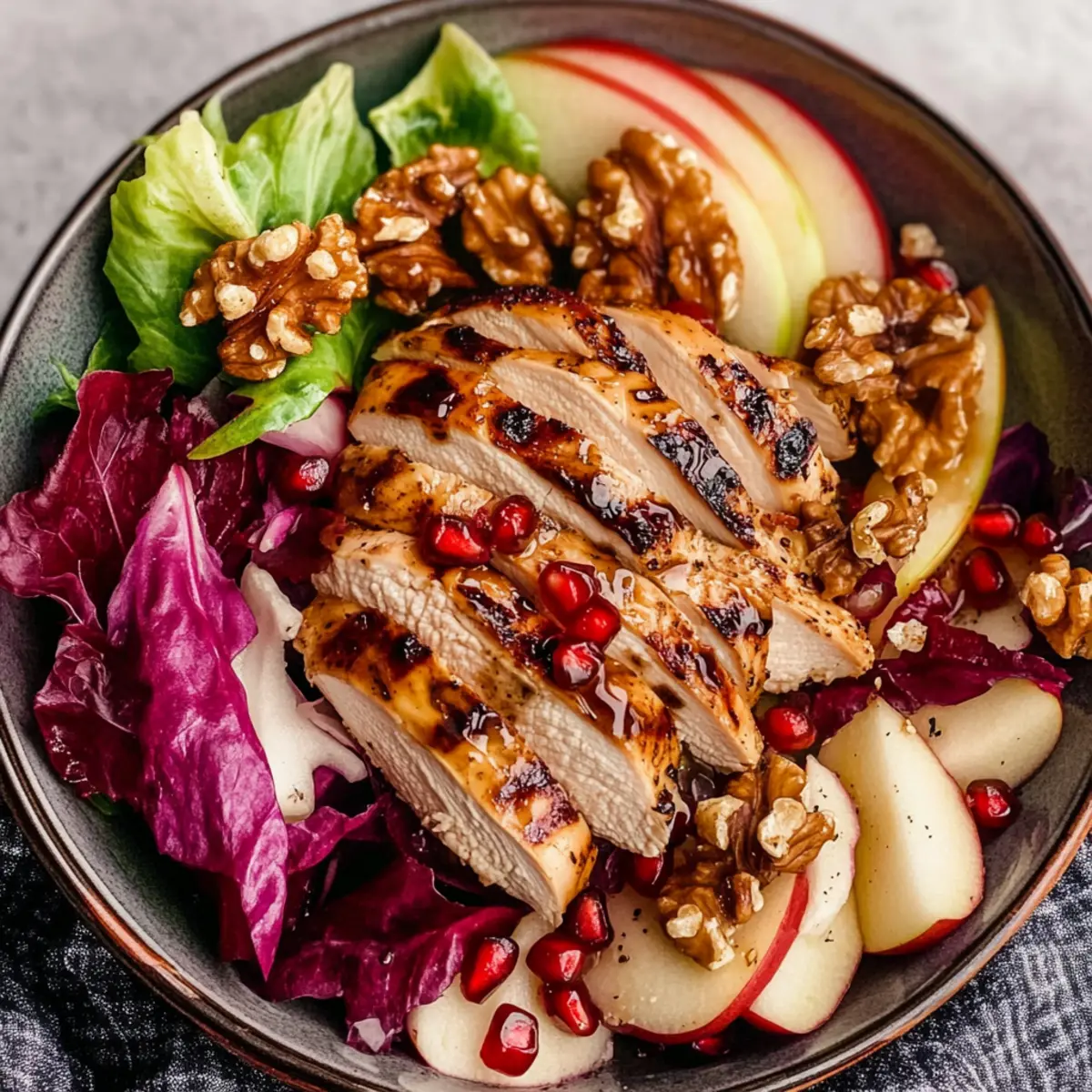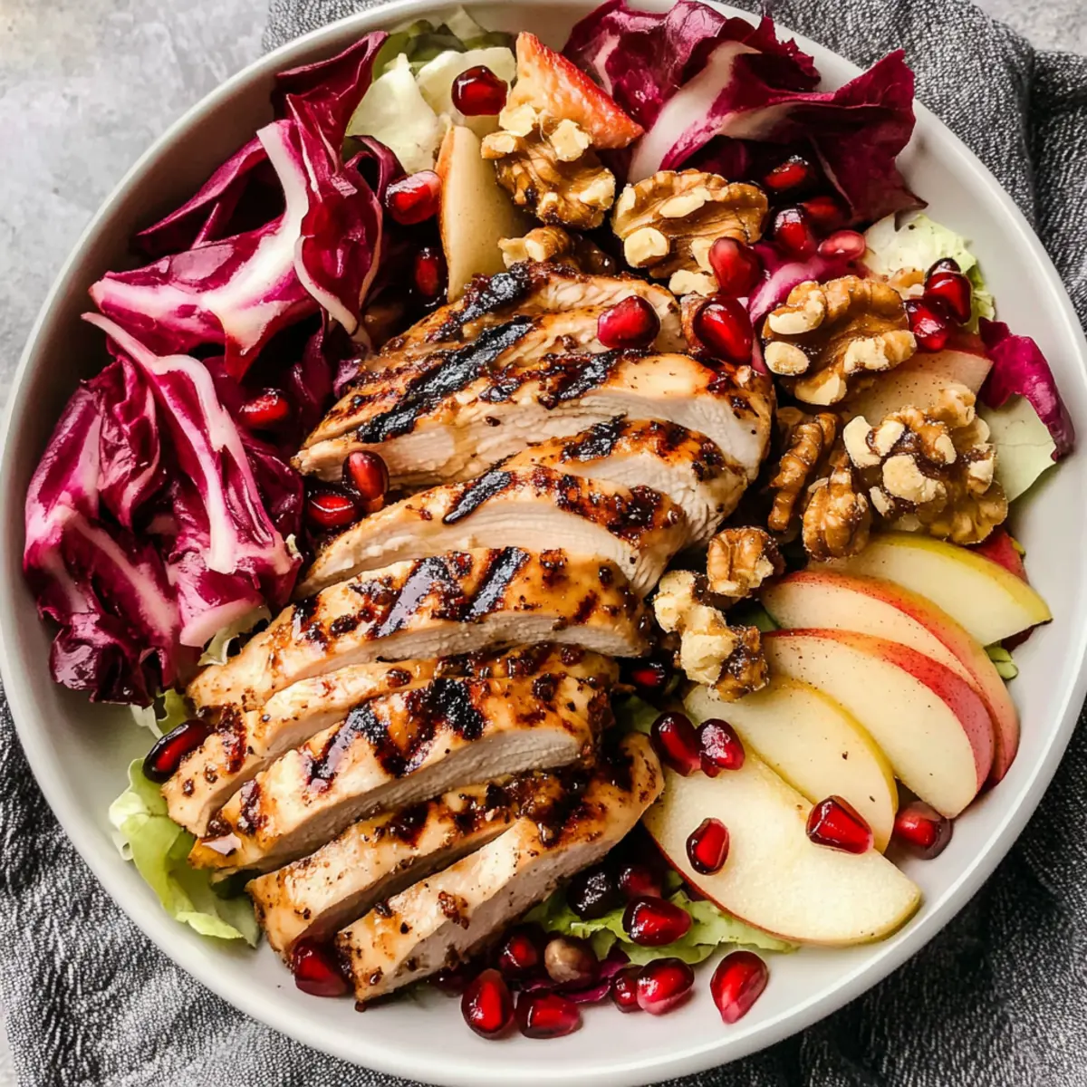 Die Grillgerüche durchziehen den Garten und wecken Erinnerungen an laue Herbstabende. Wenn die Blätter anfangen zu fallen und die Temperaturen sinken, sehnt man sich nach warmen, wohltuenden Gerichten. Heute stelle ich euch meinen Balsamico Gegrillten Hähnchensalat vor, eine perfekte Kombination aus gegrilltem Hühnchen, knackigem Radicchio, süßen Apfelscheiben und knackigen Walnüssen – alles umhüllt von einem cremigen Maple-Dijon-Dressing. Dieses Gericht ist nicht nur reich an Proteinen, sondern bringt auch die köstlichen Aromen des Herbstes auf euren Tisch. Es lässt sich schnell zubereiten, was es zu einer idealen Wahl für ein gesundes Abendessen macht, das ganz sicher Eindruck bei euren Lieben hinterlässt. Seid ihr bereit, diesen herbstlichen Leckerbissen auszuprobieren? Warum wird dieser Salat Ihr neuer Favorit? Vielfalt der Aromen: Die Kombination aus balsamischem Dressing und gegrilltem Hähnchen sorgt für eine unvergleichliche Geschmacksexplosion. Herbstliche Zutaten wie Äpfel und Granatapfel verleihen jedem Biss Frische. Einfachheit: Die Zubereitung ist unkompliziert und benötigt nur minimale Kochkünste – ideal, um schnell ein gesundes Abendessen zu zaubern. Kreative Möglichkeiten: Variieren Sie den Salat mit verschiedenen Zutaten oder probieren Sie eine vegetarische Variante mit Kichererbsen! Perfekte Präsentation: Das kontrastreiche Spiel von Farben und Texturen macht diesen Salat zum Blickfang auf jedem Tisch. Familienfreundlich: Dieser Salat ist eine köstliche Möglichkeit, Ihre Familie mit nährstoffreichen Zutaten zu begeistern. Und wenn Sie nach einer köstlichen Beilage suchen, empfehle ich unseren Haehnchensalat Rezept Genuss. Balsamico Gegrillter Hähnchensalat Zutaten Für das Hähnchen Hähnchenbrust ohne Knochen und Haut – Hauptquelle für Protein; dünn klopfen für gleichmäßiges Grillen. Olivenöl – Zum Kochen und für Geschmack; kann durch Avocadoöl für eine leichtere Option ersetzt werden. Balsamico-Essig – Sorgt für Säure und Geschmackstiefe; gereifter Balsamico kann die Süße erhöhen. Dijon-Senf – Fügt Würze und Komplexität hinzu; bei Bedarf kann gelber Senf verwendet werden. Frischer Rosmarin – Frisches Kraut für zusätzlichen Geschmack; Thymian oder Oregano sind ebenfalls gute Alternativen. Frischer Knoblauch – Aromatische Basis für das Dressing; Knoblauchpulver kann im Notfall ersetzt werden. Salz und Pfeffer – Grundgewürze, die je nach Geschmack angepasst werden können. Für das Dressing Naturjoghurt – Cremige Basis für das Dressing; kann durch Sauerrahm für eine ähnliche Textur ersetzt werden. Apfelessig – Sorgt für Säure im Dressing; regulärer Essig kann verwendet werden, wenn Apfelessig nicht verfügbar ist. Schalotte – Mildes Zwiebelaroma für das Dressing; rote Zwiebel kann substituiert werden, aber weniger verwenden. Für den Salat Radicchio – Bittere Blätter sorgen für Textur; können bei Bedarf durch Romana oder Spinat ersetzt werden. Endivie – Fügt Knusprigkeit und leicht bitteren Geschmack hinzu; kann mit anderen Grünen wie Rucola gemischt werden. Granatapfel – Liefert saftige, süße Spritzer; kann durch Cranberries oder gehackte Äpfel ersetzt werden. Honeycrisp-Äpfel – Verleiht Süße und Knusprigkeit; jede andere herbe Apfelsorte funktioniert ebenfalls gut. Italienische Petersilie – Frischer Kräutergarnitur; Koriander kann für einen anderen Geschmack verwendet werden. Walnüsse – Knuspriges Element und gesunde Fette; verwenden Sie Pekannüsse oder Mandeln für unterschiedliche Geschmäcker. Gehobelter Parmesan – Für einen herzhaften Abschluss; Hefeflocken können als milchfreie Alternative verwendet werden. Schritt-für-Schritt-Anleitung für Balsamico Gegrillter Hähnchensalat Step 1: Hähnchen vorbereiten Die Hähnchenbrustfilets gründlich abtropfen lassen und danach dünn klopfen, damit sie gleichmäßig durchgaren. Legt die Filets zwischen zwei Lagen Frischhaltefolie und verwendet einen Fleischhammer oder ein Nudelholz, um die Dicke auf etwa 1,5 cm zu reduzieren. Diese Methode sorgt dafür, dass das Hähnchen besonders zart wird. Step 2: Hähnchen marinieren In einer Schüssel Balsamico-Essig, Olivenöl, Dijon-Senf, frisch gehackten Rosmarin, zerdrückten Knoblauch sowie etwas Salz und Pfeffer gut vermengen. Legt die klopften Hähnchenbrustfilets in diese Marinade und lasst sie abgedeckt im Kühlschrank für 1-2 Stunden ziehen. Je länger die Marinierzeit, desto intensiver wird der Geschmack. Step 3: Grillen Heizt den Grill oder eine Grillpfanne auf mittelhohe Hitze vor, bis sie heiß ist. Legt die marinierten Hähnchenfilets auf den Grill und grillt sie etwa 5-7 Minuten pro Seite. Ihr erkennt, dass das Hähnchen fertig ist, wenn es eine goldene Farbe annimmt und die Innentemperatur 75 °C erreicht hat. Step 4: Hähnchen ruhen lassen Nach dem Grillen die Hähnchenbrustfilets lose mit Aluminiumfolie abdecken und für etwa 5 Minuten ruhen lassen. Dies ermöglicht es den Fleischsäften, sich gleichmäßig zu verteilen und das Hähnchen besonders saftig zu halten. Danach in dünne Scheiben schneiden. Step 5: Dressing zubereiten In einer Schüssel Naturjoghurt, Dijon-Senf, Apfelessig, Olivenöl, fein gehackte Schalotte sowie eine Prise Salz und Pfeffer gut miteinander verrühren. Das Dressing sollte cremig und gut gewürzt sein; probiert es aus und passt es je nach Geschmack an. Dieses Dressing gibt eurem Balsamico Gegrillten Hähnchensalat den perfekten Kick. Step 6: Salatzutaten vorbereiten Während das Hähnchen ruht, könnt ihr die Salatzutaten vorbereiten. Radicchio und Endivie in feine Streifen schneiden, Äpfel entkernen und in dünne Scheiben schneiden. Granatapfelkerne vorsichtig herauslösen und die Petersilie hacken. Alle Zutaten haben ihren eigenen Charme und bringen frische Aromen in euren Salat. Step 7: Salat anrichten In einer großen Schüssel Radicchio, Endivie, Apfelscheiben, Granatapfelkerne und die gehackte Petersilie vorsichtig vermengen. 