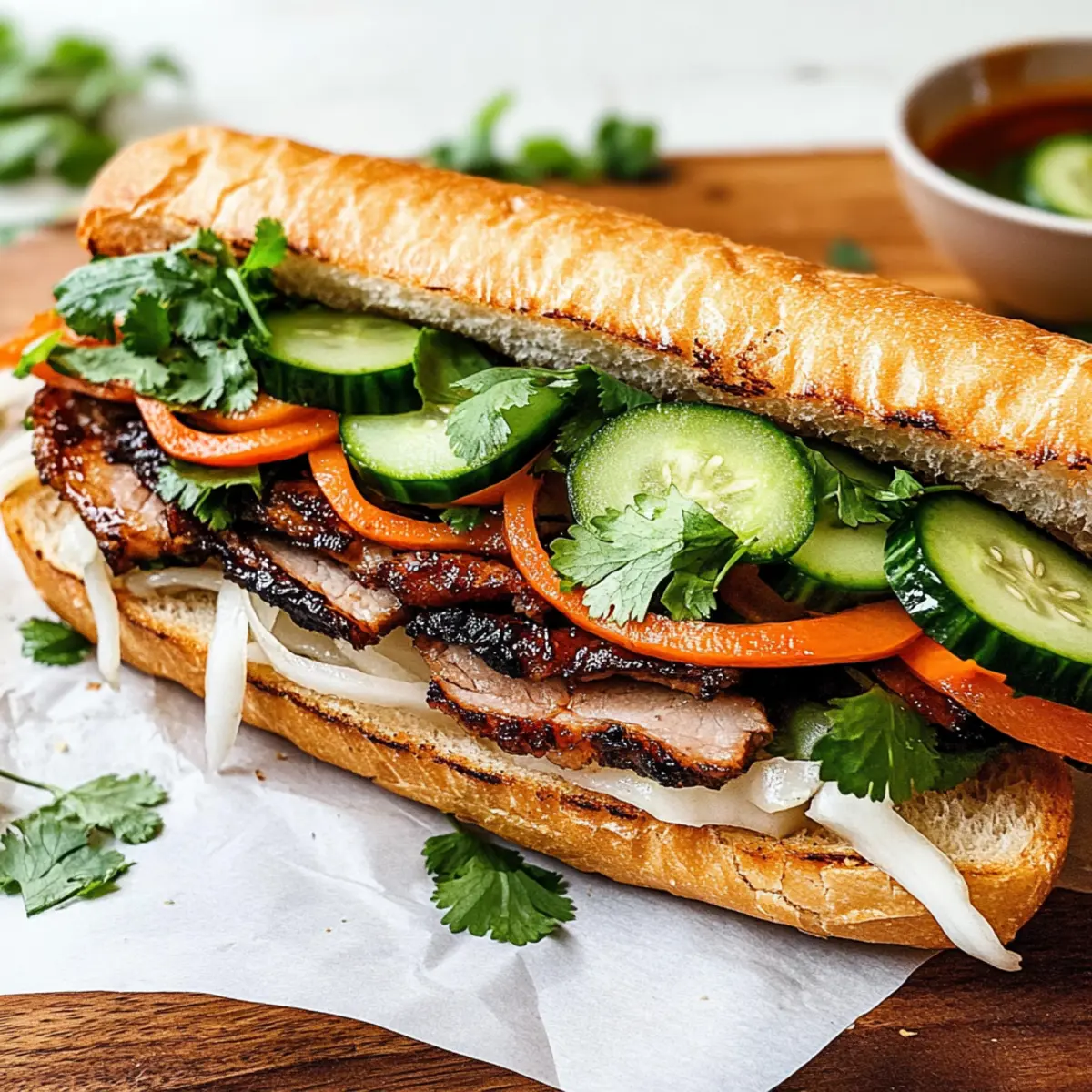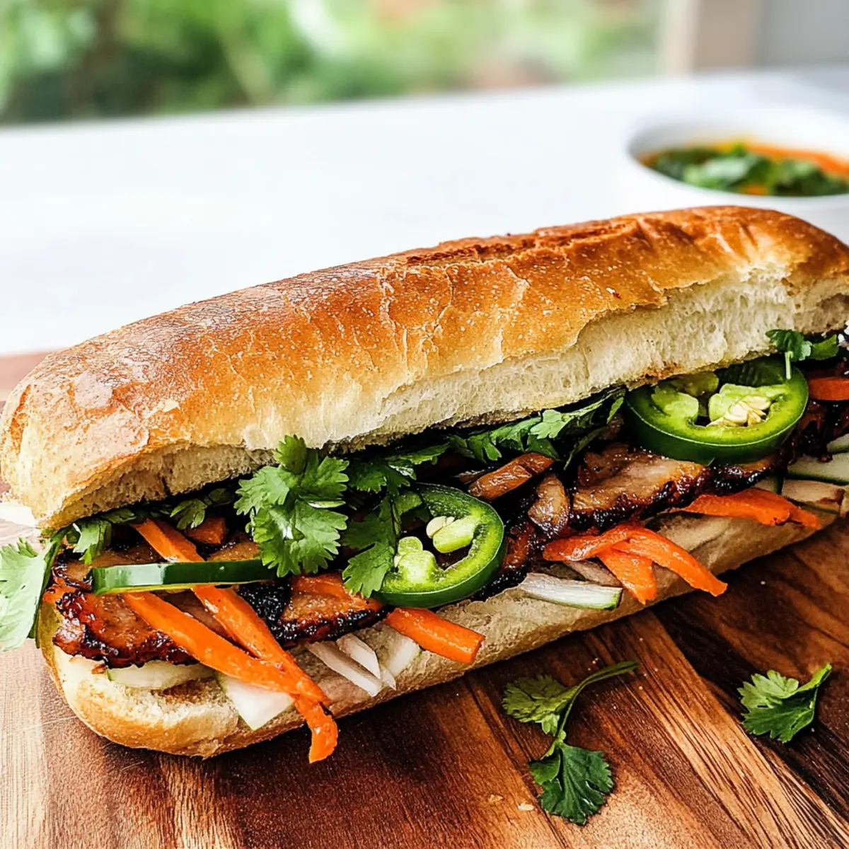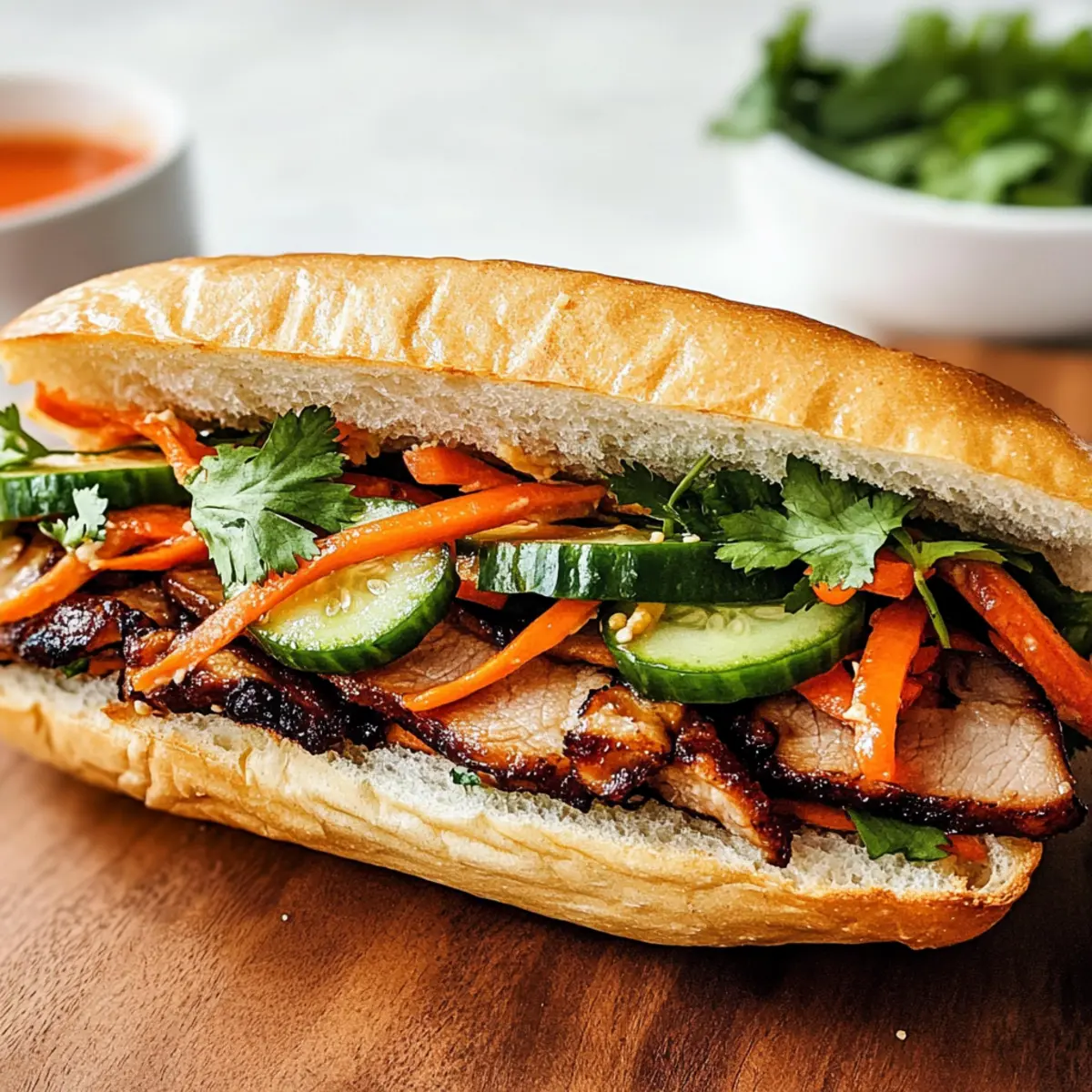 „Hast du schon einmal von einem Sandwich gehört, das sowohl die Seele wärmt als auch die Geschmacksknospen auf eine Reise schickt? Der Banh Mi Sandwich bringt den Geist Vietnams auf deinen Teller. Mit einer herrlichen Kombination aus knusprigem Baguette, zart mariniertem Schweinefleisch und erfrischendem, eingelegtem Gemüse ist dieses Rezept ein wahres Fest der Aromen. Perfekt für ein schnelles Mittagessen oder ein entspanntes Abendessen, bietet der Banh Mi sowohl eine gesunde Abwechslung zum Fast Food als auch die Möglichkeit zur individuellen Anpassung. Und das Beste? Du kannst die Zutaten ganz nach deinem Geschmack variieren! Bist du bereit, in die Welt der Aromen einzutauchen? Lass uns gemeinsam diesen köstlichen Banh Mi Sandwich zubereiten!“ Warum wirst du dieses Banh Mi Sandwich lieben? Einzigartige Aromen: Der Banh Mi Sandwich vereint süße, salzige und saure Geschmäcker in perfekten Harmonie. Die frisch eingelegten Gemüse bringen einen wunderbaren Crunch, während das marinierte Schweinefleisch zart und würzig ist. Einfach zuzubereiten: Die Vorbereitung ist schnell und unkompliziert, ideal für Kochanfänger und erfahrene Chefs. In nur wenigen Schritten hast du ein Gericht, das deine Gäste beeindrucken wird. Vielseitig anpassbar: Ob du Vegetarier bist oder einfach mal etwas anderes probieren möchtest – tausche das Schweinefleisch gegen Hähnchen oder Tofu aus und genieße deine eigene Variante. Frische Zutaten: Du verwendest frische und gesunde Zutaten, die deinem Körper gut tun und gleichzeitig den Gaumen erfreuen. Wer kann da schon widerstehen? Perfekt für jede Gelegenheit: Egal ob du ein schnelles Mittagessen zubereitest oder ein entspannendes Abendessen planst, dieser Sandwich hat das Potenzial, zu deinem neuen Favoriten zu werden! Bahn Mi Sandwich Zutaten Für das Marinierte Schweinefleisch Schweinefilet – Hauptproteinquelle, die Zartheit und Geschmack bietet. Kann durch Hähnchen oder Tofu ersetzt werden für Variationen. Schalotten – Aromatische Grundlage; der süße Geschmack verstärkt die Marinade. Gelbe Zwiebeln sind als Ersatz möglich. Zitronengras – Verleiht ein zitrusartiges Aroma; unerlässlich für den authentischen Geschmack. 1 TL Zitronengraspaste kann pro Stängel verwendet werden. Fischsauce – Fügt Umami hinzu; entscheidend für den Geschmack der Marinade. Kann durch Sojasauce für eine vegetarische Option ersetzt werden, wird jedoch geschmacklich variieren. Austernsauce – Balanciert die süßen und salzigen Geschmäcker in der Marinade. Sojasauce oder Hoisin-Sauce als Ersatz nutzen. Limettensaft – Sorgt für Säure und Frische in der Marinade. Frische Limetten sind bevorzugt, aber abgepackter Saft funktioniert ebenfalls. Ahornsirup & Brauner Zucker – Fügen Süße hinzu, um die Aromen auszubalancieren. Kann komplett durch braunen Zucker ersetzt werden, wenn nötig. Ingwer – Verleiht Wärme und Tiefe in der Marinade. Frisch ist am besten, gemahlener Ingwer kann im Notfall verwendet werden. Knoblauch – Infiziert die Marinade mit Geschmack; verstärkt andere Komponenten. Kann durch Knoblauchpulver (1 TL für 5 Zehen) ersetzt werden. Geröstetes Sesamöl – Verbessert das nussige Aroma; integrierter Bestandteil der Marinade. Regelmäßiges Sesamöl kann bei Bedarf ersetzt werden. Chilipaste – Fügt Schärfe und Tiefe hinzu; wähle je nach Vorliebe. Sriracha kann als Alternative verwendet werden. Für die eingelegten Gemüse Karotten & Daikon – Gemüse zum Einlegen; bieten Knusprigkeit und einen frischen, sauren Geschmack. Reguläre Radieschen können daikon ersetzen. Reisessig – Unerlässlich für das Einlegen von Gemüse; gibt der Mischung Säure. Ungewürzter Reisessig sollte verwendet werden. Zucker & Salz – Wichtige Zutaten zur Balance der Einlegeslösung. Regulärer Haushaltszucker ist zum Einlegen geeignet. Für das Sandwich Französisches Baguette – Das Gefäß für das Sandwich; muss knusprig und luftig sein. Krustenbrötchen können bei Bedarf als Ersatz dienen. Mayonnaise & Pâté – Aufstriche für Cremigkeit; essentiell für den traditionellen Geschmack. Vegane Mayonnaise kann für eine milchfreie Option verwendet werden. Dieser Bahn Mi Sandwich ist ein genussvolles Erlebnis voller frischer Zutaten, die du nach deinem Geschmack anpassen kannst. Bereite dich darauf vor, in die Welt der vietnamesischen Aromen einzutauchen! Schritt-für-Schritt-Anleitung für Banh Mi Sandwich mit würzig mariniertem Schwein Step 1: Eingelegte Gemüse vorbereiten In einer mikrowellengeeigneten Schüssel vermischt du Reisessig, Wasser und Zucker. Erhitze diese Mischung für 1-2 Minuten in der Mikrowelle, bis sich der Zucker vollständig aufgelöst hat. Anschließend gibst du die in Streifen geschnittenen Karotten und den Daikon dazu, drückst sie unter die Flüssigkeit und lässt alles mindestens eine Stunde im Kühlschrank ziehen, bis es schön abgekühlt ist. Step 2: Schweinefleisch marinieren Schneide das Schweinefilet in lange, dünne Streifen, damit es saftig bleibt. In einem Mixer vermischst du die Marinade-Zutaten, bis sie glatt sind. Gib das marinierte Fleisch zusammen mit der Marinade in einen Beutel und verschließe ihn gut. Lasse das Fleisch mindestens 4 bis 8 Stunden im Kühlschrank marinieren, damit es die Aromen optimal aufnimmt. Step 3: Baguettes rösten Sobald das Fleisch mariniert ist, kannst du die französischen Baguettes vorbereiten. Schneide sie der Länge nach auf und grille die Innenseiten in einer heißen Pfanne oder auf dem Grill, bis sie goldbraun und knusprig sind. Dies dauert ungefähr 2-3 Minuten und sorgt dafür, dass die Baguettes die köstlichen Säfte des Banh Mi Sandwiches besser aufnehmen. Step 4: Schweinefleisch garen Erhitze etwas Öl in einer Grillpfanne oder auf dem Grill bei mittlerer Hitze. Lege die marinierten Schweinefleischstreifen in die Pfanne und grille sie etwa 2 Minuten pro Seite, bis sie leicht gebräunt und gut durchgegart sind. Achte darauf, das Fleisch nicht zu übergar