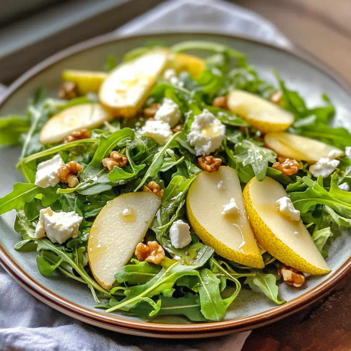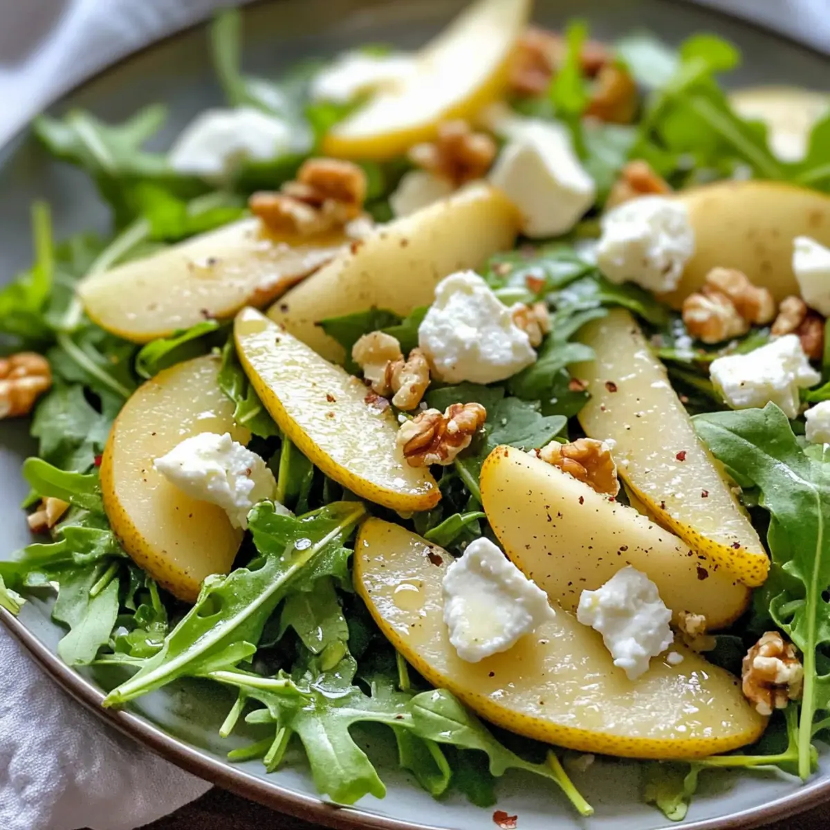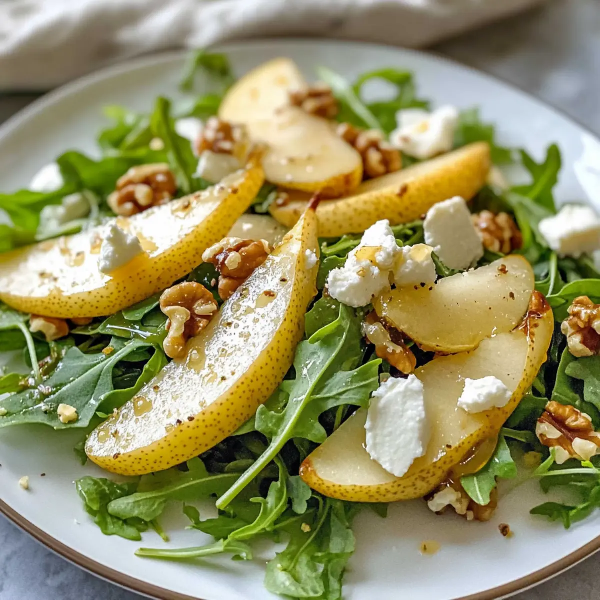 Frisch aus dem Garten und voller lebendiger Farben – unser Birnen- und Rucola-Salat mit Honig-Vinaigrette wird dein Herz im Sturm erobern! Dieses Rezept ist nicht nur ein wahrer Genuss für die Augen, sondern auch ein schnelles und gesundes Gericht, das in nur 10 Minuten zubereitet ist. Mit der perfekten Balance aus süßen, knusprigen Birnen, cremigem Ziegenkäse und knackigen Walnüssen ist dieser Salat ideal für ein leichtes Mittagessen oder als elegante Beilage zum Abendessen. Der zesty Honig-Dressing sorgt für das gewisse Etwas und macht jeden Bissen zu einem Fest der Aromen. Bist du bereit, deine Kochkünste mit diesem frischen Rezept weiter zu verfeinern? Lass uns gleich loslegen! Warum wird dir dieses Rezept gefallen? Einfachheit: Die Zubereitung ist kinderleicht und erfordert nur elf Minuten – perfekt für ein schnelles Abendessen! Frischer Geschmack: Die Kombination aus süßen Birnen und würzigem Rucola bringt eine aufregende Geschmacksexplosion auf deinen Teller. Gesund und nahrhaft: Dieser Salat ist nicht nur lecker, sondern auch leicht und gesund, ideal für bewusste Genießer. Vielseitig einsetzbar: Ob als leichtes Mittagessen oder als Beilage zu Grillgerichten, er passt zu jedem Anlass! Farbenspiel: Die lebendigen Farben des Salats machen ihn zu einem echten Blickfang auf deinem Tisch – perfekt für besondere Anlässe. Für weitere köstliche und gesunde Rezepte kannst du auch unseren Schnellen Quinoasalat oder den Leckeren Couscous-Salat ausprobieren! Birnen- und Rucola-Salat mit Honig-Vinaigrette Zutaten Für den Salat Rucola – bildet die würzige Basis des Salats und sorgt für eine interessante Geschmacksnote. Kann auch durch Spinat oder gemischte Blattsalate ersetzt werden. Bartlett-Birnen (1 ½ Tassen, gehackt) – verleihen Süße und Saftigkeit; jede reife Birnensorte ist als Ersatz geeignet. Ziegenkäse (⅓ Tasse) – bringt Cremigkeit und eine leicht herzhafte Note; Feta kann für eine ähnliche Geschmacksrichtung verwendet werden. Walnüsse (¼ Tasse) – sorgen für einen knackigen Biss und nussigen Geschmack; auch Pekannüsse oder Mandeln sind eine gute Wahl. Frischer Thymian (1 Esslöffel) – fügt eine erdige Frische hinzu; kann optional durch Rosmarin ersetzt werden. Für die Honig-Vinaigrette Olivenöl (3 Esslöffel) – verleiht dem Dressing Reichhaltigkeit und hilft bei der Emulgierung. Verwende extra natives Olivenöl für besseren Geschmack. Apfelessig (1 Esslöffel) – sorgt für eine angenehme Säure; kann durch weißen Weinessig ersetzt werden. Frischer Zitronensaft (1 Esslöffel) – bringt Frische und Helligkeit; auch Limettensaft eignet sich gut. Honig (1 Esslöffel) – sorgt für natürliche Süße und balanciert die Vinaigrette; Agavendicksaft kann als vegane Alternative verwendet werden. Schalotten (2 Esslöffel, fein gehackt) – geben eine milde Zwiebelnote; bei Bedarf können sie durch reguläre Zwiebeln ersetzt werden, wobei weniger verwendet werden sollte. Knoblauch (1 Zehe, gehackt) – intensiviert die Geschmacksvielfalt; kann weggelassen werden, wenn du keinen Knoblauch magst. Salz (½ Teelöffel) und Schwarzer Pfeffer (¼ Teelöffel) – zum Abschmecken, intensivieren den gesamten Geschmack des Salats. Mit diesen frischen Zutaten bereitest du einen köstlichen Birnen- und Rucola-Salat mit Honig-Vinaigrette zu, der nicht nur deinen Gaumen verwöhnt, sondern auch ein Augenschmaus ist! Schritt-für-Schritt-Anleitung für Birnen- und Rucola-Salat mit Honig-Vinaigrette Step 1: Vinaigrette zubereiten In einem kleinen Glas oder einer Schüssel vermischst du das Olivenöl, den Apfelessig, den frischen Zitronensaft, den Honig, die fein gehackten Schalotten, den gehackten Knoblauch, sowie das Salz und den schwarzen Pfeffer. Mit einem Schneebesen gut umrühren, bis eine gleichmäßige Emulsion entsteht. Dies dauert etwa 1-2 Minuten und sorgt für eine harmonische Verbindung der Aromen in deinem Dressing. Step 2: Salatzutaten vorbereiten Nimm eine große Schüssel und gib den Rucola hinein. Schneide die Bartlett-Birnen in kleine Würfel und füge sie hinzu, gefolgt von dem zerbröselten Ziegenkäse und den grob gehackten Walnüssen. Wenn du frischen Thymian verwendest, streue ihn ebenfalls über die Zutaten. Die Kombination sorgt für einen wunderbaren Mix aus Texturen und Geschmäckern. Step 3: Salat anrichten Gieße die vorbereitete Honig-Vinaigrette gleichmäßig über die Salatzutaten in der Schüssel. Sei großzügig, aber achte darauf, dass du nicht alles auf einmal hinzufügen musst – so kannst du die Menge an Dressing an deinen persönlichen Geschmack anpassen. Verwende eine große Zange, um alles vorsichtig zu vermengen, bis der Rucola und die anderen Zutaten gut überzogen sind. Step 4: Abschmecken und servieren Jetzt ist der perfekte Zeitpunkt, um den Birnen- und Rucola-Salat mit Honig-Vinaigrette abzuschmecken. Probiere eine kleine Portion und füge bei Bedarf mehr Salz, Pfeffer oder Dressing hinzu, um den perfekten Geschmack zu erreichen. Sobald alles gut vermischt und abgestimmt ist, richte den Salat auf einem schönen Teller an, um die lebendigen Farben zum Strahlen zu bringen. Lagerungstipps für Birnen- und Rucola-Salat mit Honig-Vinaigrette Raumtemperatur: Vor dem Servieren solltest du den Salat nicht länger als 1 Stunde bei Raumtemperatur stehen lassen, um die Frische zu gewährleisten. Kühlschrank: Ein bereits angemachter Salat sollte innerhalb von 1 Tag konsumiert werden, da die Zutaten sonst ihre Knackigkeit verlieren können. Einzelne Komponenten: Bewahre die Zutaten wie Rucola, Birnen, Ziegenkäse und Vinaigrette getrennt auf, um die Frische zu maximieren; so bleibt jeder Bestandteil länger haltbar. Einfrieren: Es wird nicht empfohlen, den Salat einzufrieren, da die Textur der frischen Zutaten beim Auftauen leidet. Genießen Sie den Birnen- und Rucola-Salat mit Honig-Vinaigrette frisch für das beste Geschmackserlebnis. Was passt gut zu Birnen- und Rucola-Salat mit Honig-Vinaigrette? Frisch, lecker und