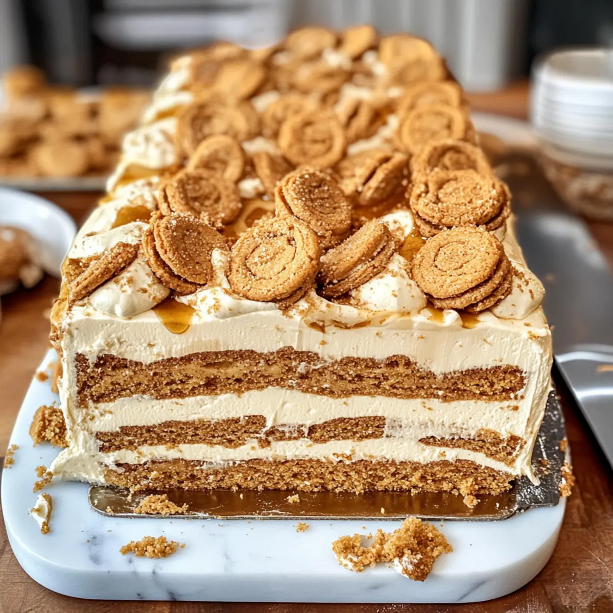 Als ich neulich einen heißen Sommernachmittag verbrachte, fiel mir auf, dass nichts besser gegen die drückende Hitze helfen kann als ein erfrischendes Dessert. Genau hier kommt mein Biscoff Kühlschrankkuchen ins Spiel! Mit nur vier Zutaten und ohne Backen ist er nicht nur ein Kinderspiel, sondern auch eine wahre Freude für die Zunge. Die verführerische Kombination aus knusprigen Biscoff-Keksen und luftiger, Biscoff-infundierter Creme macht diesen Kuchen zu einem perfekten Highlight für jedes Treffen oder einfach für einen süßen Genuss zu Hause. Und das Beste daran? Man kann ihn im Voraus zubereiten und im Kühlschrank aufbewahren – ideal für Momente, in denen Gäste überraschend vorbeikommen oder man sich selbst einfach etwas gönnen möchte. Neugierig, wie einfach es ist, diese köstliche Kreation zu zaubern? Dann lasst uns gemeinsam eintauchen! Warum ist dieser Biscoff Kühlschrankkuchen besonders? Einfachheit: Mit nur vier Zutaten ist die Zubereitung im Handumdrehen erledigt! Keine Backzeit: Ideal für heiße Tage, wenn der Ofen nicht angeschaltet werden soll. Köstliche Kombination: Die Mischung aus knusprigen Biscoff-Keksen und cremiger Füllung zaubert ein Geschmackserlebnis der besonderen Art. Vielseitigkeit: Perfekt als Dessert für Partys oder einfach für einen gemütlichen Abend zu Hause. Vorbereitungsfreundlich: Dieser Kuchen kann im Voraus zubereitet werden, sodass du mehr Zeit mit deinen Gästen verbringen kannst. Nutze ihn auch als besondere Leckerei, die perfekt zu einem Gemueseauflauf Mit Creme passt! Biscoff Kühlschrankkuchen Zutaten • Hinweis: Hier sind die einfachen Zutaten, um deinen köstlichen Biscoff Kühlschrankkuchen zuzubereiten. Für die Creme • Schlagsahne – sorgt für die cremige Basis des Kuchens; stelle sicher, dass sie kalt ist für beste Ergebnisse. • Gezuckerter Kondensmilch – süßt die Creme und sorgt für einen reichhaltigen Geschmack; kann durch Puderzucker ersetzt werden, um die Süße zu steuern. • Lotus Biscoff Aufstrich – das Herzstück des Geschmacks, das den ikonischen Biscoff-Geschmack liefert; verschiedene Marken können verwendet werden. Für die Schichtung • Lotus Biscoff Kekse – perfekt zum Schichten und Garnieren; sorgen für die knusprige Textur. Sie können auch durch ähnliche Kekse ersetzt werden. Schritt-für-Schritt-Anleitung für den Biscoff Kühlschrankkuchen Step 1: Sahne schlagen Schlage in einer gekühlten Schüssel die kalte Schlagsahne und die gezuckerte Kondensmilch mit einem Handmixer oder einer Küchenmaschine, bis sich steife Spitzen bilden. Dies dauert etwa 3-5 Minuten. Achte darauf, dass die Mischung luftig und leicht ist, um die cremige Basis für den Biscoff Kühlschrankkuchen zu gewährleisten. Step 2: Biscoff Aufstrich hinzufügen Sobald die Sahne gut geschlagen ist, kannst du den Lotus Biscoff Aufstrich vorsichtig unterheben. Benutze einen Spatel und falte die Mischung sanft, damit die Luftigkeit der Sahne erhalten bleibt. Dies sollte nur kurz dauern, bis der Aufstrich gut eingearbeitet ist und eine homogene, cremige Textur ergibt. Step 3: Biscoff Aufstrich erwärmen Erhitze etwas von dem verbleibenden Biscoff Aufstrich in der Mikrowelle für etwa 10-15 Sekunden, bis er flüssig und gut gießbar ist. Rühre den Aufstrich gleichmäßig durch, um sicherzustellen, dass er nicht zu heiß wird, sondern die perfekte Konsistenz hat, um ihn später über die Schichten zu träufeln. Step 4: Backform vorbereiten Lege eine 9×5 Zoll große Kastenform mit Frischhaltefolie aus, so dass die Folie an den Rändern übersteht. Dies macht es einfacher, den Biscoff Kühlschrankkuchen später herauszunehmen. Stelle sicher, dass die Folie gut sitzt, damit die Form stabil bleibt und nichts ausläuft. Step 5: Erste Schicht verteilen Verteile eine dünne Schicht der Sahnemischung gleichmäßig auf dem Boden der vorbereiteten Kastenform. Diese erste Schicht sorgt dafür, dass die Kekse fest sitzen, wenn du die nächsten Schichten hinzufügst. Die Konsistenz sollte glatt sein, und du kannst die Rückseite eines Löffels verwenden, um die Creme gleichmäßig zu verteilen. Step 6: Kekse schichten Lege eine Schicht der Lotus Biscoff Kekse über die Sahnemischung, sodass sie gleichmäßig verteilt sind. Die Kekse sollten fest aneinanderliegen, um die Struktur des Biscoff Kühlschrankkuchens zu sichern. Diese knusprige Schicht fügt Textur und Geschmack hinzu, die wunderbar mit der cremigen Füllung harmonieren. Step 7: Weitere Schichten hinzufügen Gib ein Drittel der restlichen Sahnemischung über die Kekse und träufle etwas von dem erwärmten Biscoff Aufstrich darüber. Diese Kombination sorgt für eine leckere Fusion der Aromen und macht den Kuchen besonders schmackhaft. Wiederhole diese Schichtung zweimal, bis alle Zutaten aufgebraucht sind, und schließe mit einer finalen Schicht Sahne und Biscoff Aufstrich ab. Step 8: Kuchen kühlen Decke die Form mit Frischhaltefolie ab und stelle sie in den Gefrierschrank, um den Biscoff Kühlschrankkuchen mindestens 2 Stunden oder über Nacht kühlen zu lassen. Der Kuchen muss fest werden, damit er sich beim Schneiden nicht auseinanderfallen kann. Überprüfe gegen Ende dieser Zeit die Konsistenz; er sollte fest, aber leicht cremig sein. Step 9: Servieren Lasse den Biscoff Kühlschrankkuchen vor dem Servieren für etwa 15 Minuten bei Raumtemperatur ruhen, damit er die ideale Textur erreicht.Nachdem der Kuchen etwas aufgetaut ist, schneide ihn vorsichtig in Scheiben. Du kannst ihn zusätzlich mit einem warmen Biscoff Aufstrich oder zerbröselten Keksen garnieren, um eine ansprechende Präsentation zu erzielen. Biscoff Kühlschrankkuchen Variationen Lass deiner Kreativität freien Lauf und passe diesen köstlichen Biscoff Kühlschrankkuchen nach deinem Geschmack an! Vegane Version: Ersetze die Schlagsahne durch eine pflanzliche Alternative und nutze Kokosnussmilch für die Creme. Glutenfrei: Verwende glutenfreie Kekse, um eine leckere Variante für glutenempfindliche Gä