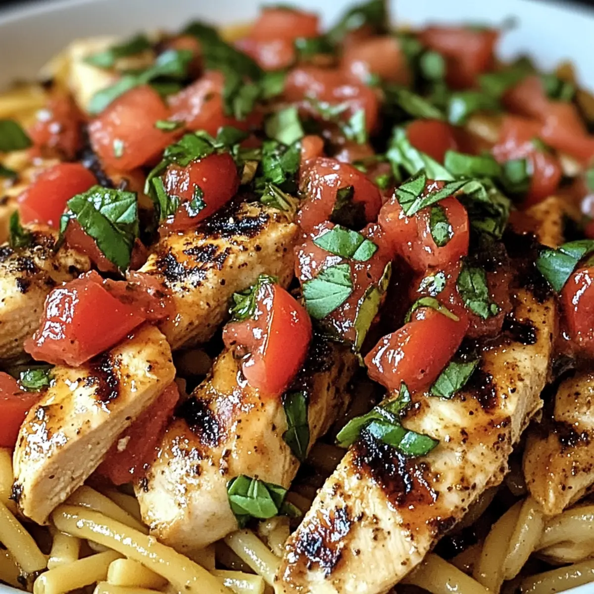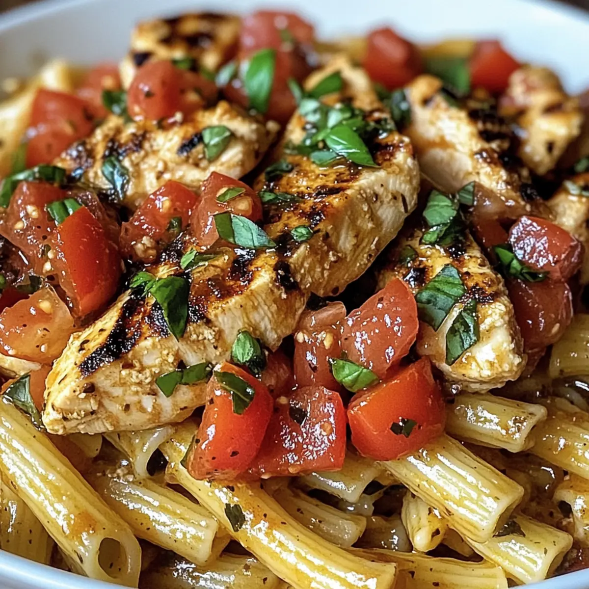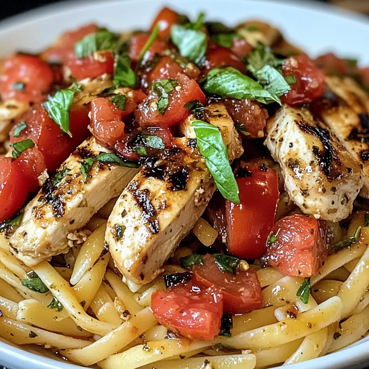 Es war einer dieser hektischen Abende, an denen ich einfach nicht wusste, was ich kochen sollte. Die Lösung? Diese köstliche Bruschetta Hähnchen Pasta! Mit ihrer Kombination aus saftigen Hähnchenbrustfilets, frischen Tomaten und aromatischem Basilikum bringt dieses Rezept die Sonne Italiens direkt auf deinen Tisch. Was mich besonders begeistert, ist, dass ich dieses Gericht innerhalb von nur 30 Minuten zubereiten kann – perfekt für das spontane Abendessen unter der Woche! Zudem bietet es eine gesunde Portion Protein und lässt sich ganz nach deinem Geschmack anpassen. Bereit, deine Küche in ein kleines mediterranes Restaurant zu verwandeln? Lass uns gemeinsam diesen Gaumenschmaus kreieren! Warum wirst du dieses Rezept lieben? Einfachheit in der Zubereitung: Die Schritte sind klar und unkompliziert, sodass du in nur 30 Minuten ein beeindruckendes Gericht auf den Tisch bringen kannst. Frische Aromen: Die Kombination aus saftigen Tomaten, frisch zerrissenem Basilikum und würzigem Hähnchen sorgt für einen authentischen italienischen Geschmack, der dich sofort in Urlaubsstimmung versetzt. Vielseitigkeit für jeden Geschmack: Ob du veganisierst, das Hähnchen durch Garnelen ersetzt oder Gemüse hinzufügst – dieses Rezept lässt sich ganz nach deinen Vorlieben anpassen. Proteinreiche Mahlzeit: Mit etwa 34g Eiweiß pro Portion ist dies eine nahrhafte Option, die dich satt hält und deine Fitnessziele unterstützt. Perfekt für spontane Abendessen: Keine Planungszeit nötig – schnapp dir einfach die Zutaten und leg los. Solltest du nach weiteren leckeren Ideen suchen, schau dir auch unser Rezept für einen Schnellen Caesar-Salat an! Bruschetta Hähnchen Pasta Zutaten Für das Hähnchen: Hähnchenbrustfilets – Hauptproteinquelle; achte darauf, dass sie gleichmäßig dick sind für eine gleichmäßige Garung. Alternativ kannst du auch Hähnchenschenkel verwenden. Olivenöl – Ideal zum Braten und verbessert den Geschmack; wähle hochwertiges, extra vergine für das beste Aroma. Knoblauch – Sorgt für Tiefe und Reichtum; frisch gehackt ist am besten, vermeide vorverpackte Alternativen. Salz & Pfeffer – Unverzichtbar für die richtige Würze. Für die Bruschetta-Mischung: Roma-Tomaten – Bieten frischen, lebendigen Geschmack und eine grobe Textur; falls nicht verfügbar, kannst du auch Kirschtomaten verwenden. Frisches Basilikum – Essenziell für den authentischen Geschmack; zerreiße die Blätter, um das Bräunen zu verhindern. Im Notfall kann getrocknetes Basilikum verwendet werden. Balsamico-Essig – Fügt eine süß-säuerliche Dimension hinzu; für einen Twist probiere roten Weinessig. Zucker – Eine Prise hilft, die Aromen der Tomaten zu intensivieren. Für die Pasta: Pasta (Engelshaar oder Penne) – Dient als Basis des Gerichts; koche sie al dente für die beste Konsistenz. Parmesankäse – Sorgt für eine cremige Note; optional, aber geschmacklich sehr empfehlenswert. Das Rezept für Bruschetta Hähnchen Pasta ist nicht nur schnell zubereitet, sondern auch anpassbar und voller Geschmack – ideal für dein nächstes Abendessen! Schritt-für-Schritt-Anleitung für Bruschetta Hähnchen Pasta Step 1: Bruschetta Topping vorbereiten Die Roma-Tomaten in kleine Würfel schneiden und in eine Schüssel geben. Füge den fein gehackten Knoblauch, frisches, zerrissenes Basilikum, Olivenöl, Balsamico-Essig, eine Prise Zucker, Salz und Pfeffer hinzu. Alles gut vermengen und die Mischung 15 Minuten ziehen lassen, damit die Aromen intensiver werden und sich perfekt miteinander verbinden. Step 2: Hähnchen braten Die Hähnchenbrustfilets auf etwa 1,5 cm Dicke klopfen und mit Salz und Pfeffer würzen. Eine Pfanne mit Olivenöl auf mittlerer bis hoher Hitze erhitzen und die Hähnchenfilets darin für 3-4 Minuten pro Seite braten, bis sie durchgegart sind und eine goldbraune Farbe haben (die Innentemperatur sollte 75 °C erreichen). Nach dem Braten das Hähnchen beiseitelegen. Step 3: Pasta kochen Einen großen Topf mit gesalzenem Wasser zum Kochen bringen. Die Pasta (Engelshaar oder Penne) gemäß den Anweisungen auf der Verpackung al dente kochen, normalerweise etwa 8-10 Minuten. Vor dem Abgießen 60 ml des Nudelwassers aufbewahren, da es später für die Sauce benötigt wird. Die Pasta abgießen und kurz zur Seite stellen. Step 4: Alles kombinieren In der gleichen Pfanne, in der das Hähnchen gebraten wurde, die vorbereitete Bruschetta-Mischung und das reservierte Nudelwasser bei mittlerer Hitze hinzufügen. Alles gut umrühren und die Hitze für 1-2 Minuten leicht erhöhen, bis die Mischung warm wird, aber nicht kocht. Step 5: Anrichten und servieren Die abgetropfte Pasta in die Pfanne geben und vorsichtig unter die Bruschetta-Mischung heben, sodass die Pasta gleichmäßig umhüllt ist. Auf Teller anrichten und mit den in Scheiben geschnittenen Hähnchenbrustfilets belegen. Zum Schluss frisch geriebenen Parmesan und zusätzliche Basilikumblätter als Garnitur hinzufügen und sofort servieren. Expertentipps für Bruschetta Hähnchen Pasta Hähnchen gut würzen: Achte darauf, das Hähnchen großzügig zu würzen. So erhältst du ein schmackhaftes Ergebnis und verhinderst, dass es fade schmeckt. Frische Zutaten verwenden: Nutze frische Roma-Tomaten und Basilikum für den besten Geschmack. Getrocknete Varianten sind schlechter, also greife zu frischem, wo immer es möglich ist. Pasta al dente kochen: Koche die Pasta genau nach den Anweisungen, um die perfekte Konsistenz zu erreichen. Überkochende Pasta kann das gesamte Gericht beeinträchtigen. Nudelwasser zur Sauce: Bewahre etwas Nudelwasser auf, um die Sauce geschmeidiger zu machen. Dieses Wasser enthält Stärke, die hilft, alle Geschmäcker zu verbinden. Lass die Bruschetta ziehen: Lass die Bruschetta-Mischung vor dem Kochen ziehen, damit sich die Aromen intensivieren. Dies ist entscheidend für den vollen Geschmack der Bruschetta Hähnchen Pasta. Lagerungstipps für Bruschetta Hähnchen Pasta Zimmertemperatur: Nachdem die Pas