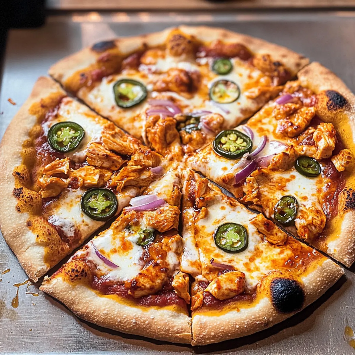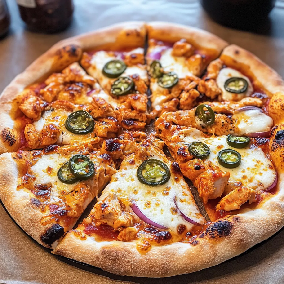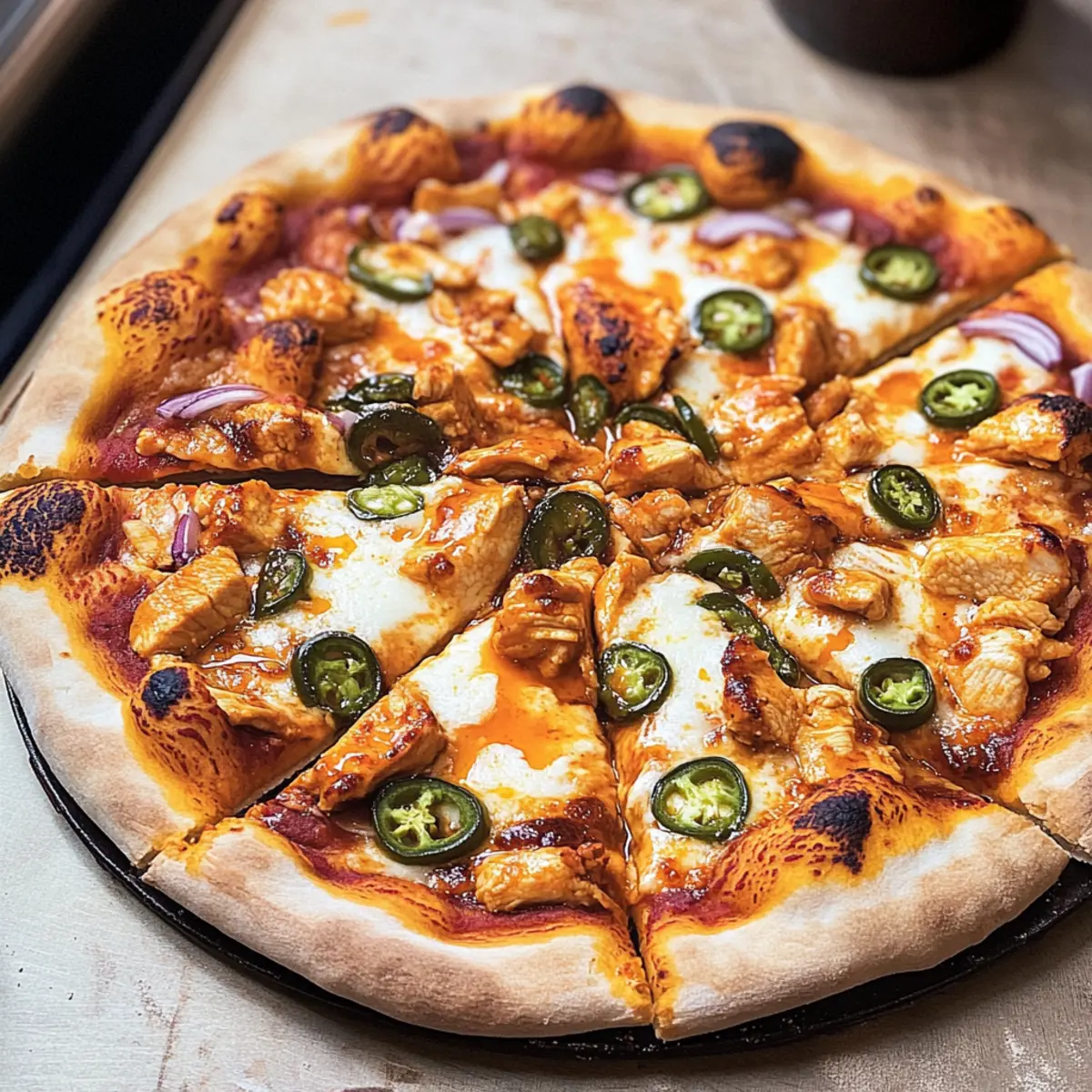 Der Duft von frisch gebackenem Brot und würzigem Hühnchen strömt durch die Küche, während ich die perfekte Pizza zubereite. Diese Buffalo-Hühnchen-Pizza vereint mühelos die Aromen von würziger Buffalo-Sauce, zartem Hähnchen und einer angenehmen Honig-Drizzle, die dem Ganzen eine süße Note verleiht. Die Zubereitung ist schnell und einfach, ideal für einen aufregenden Spieltag oder ein entspanntes Abendessen unter der Woche. Dank der Möglichkeit, sie ganz nach eigenen Vorlieben zu gestalten, wird jeder Bissen zu einem kleinen Fest. Bist du bereit, deine Gäste mit dieser köstlichen Kombination aus scharf und süß zu überraschen? Warum ist diese Pizza ein Muss? Einfachheit: Die Zubereitung dieser Buffalo-Hühnchen-Pizza erfordert nur grundlegende Kochkünste und keine speziellen Geräte. Würziger Genuss: Die Kombination aus scharfer Buffalo-Sauce und zartem Hähnchen sorgt für ein Geschmackserlebnis, das deine Geschmacksknospen belebt. Einfache Anpassung: Du kannst die Zutaten ganz nach deinem Geschmack anpassen – vielleicht etwas weniger Schärfe oder eine extra Portion Käse? Perfekt für alle Anlässe: Egal, ob du eine Feier planst oder einfach nur ein schnelles Abendessen möchtest, diese Pizza bringt jeden zusammen. Einzigartiger Genuss: Die süße Honig-Drizzle rundet das Ganze ab und sorgt für einen überraschenden Geschmacks-Kontrast. Buffalo-Hühnchen-Pizza Zutaten • Diese Buffalo-Hühnchen-Pizza ist ein echtes Geschmackserlebnis! Für den Pizzateig Pizzateig – Der Grundbaustein deiner Pizza; verwende fertigen Teig für mehr Bequemlichkeit. Für die Beläge Hähnchenbrust (227 g) – Sorgt für eine proteinreiche und geschmackvolle Basis; auch vorgekochtes Hähnchen eignet sich gut. Frische Mozzarella (170 g) – Gibt der Pizza eine cremige und reichhaltige Note; verwende Mozzarella-Perlen für eine gleichmäßige Verteilung. Buffalo-Sauce (120 ml, geteilt) – Hauptgeschmacksträger; passe die Menge an deine Schärfetoleranz an, heiße Sauce ist ein guter Ersatz. Rote Zwiebel (1/2, dünn geschnitten) – Verleiht einen knackigen Biss; grüne Zwiebeln sind eine mildere Alternative. Frischer Jalapeño (in Scheiben) – Sorgt für die nötige Schärfe; weglassen oder mit süßen Paprika ersetzen, wenn du es milder magst. Mehl (40 g) – Zum Bestäuben der Arbeitsfläche, um ein Ankleben zu verhindern; verwende einfaches Weizenmehl. Honig (zum Drizzlen) – Gibt einen süßen Abschluss; auch Ahornsirup als vegane Option ist möglich. Ranch-/Blauschimmelkäse-Dressing (zum Servieren) – Eine tolle Ergänzung; jede cremige Sauce kann hier verwendet werden. Schritt-für-Schritt-Anleitung für Buffalo-Hühnchen-Pizza Schritt 1: Teig vorbereiten Nimm den Pizzateig aus dem Kühlschrank und lege ihn in eine gefettete Schüssel. Lass den Teig 3-4 Stunden bei Raumtemperatur ruhen, bis er sich doppelt vergrößert. Achte darauf, dass der Teig schön aufgegangen und luftig ist, bevor du mit dem nächsten Schritt fortfährst. Schritt 2: Ofen vorheizen Heize den Ofen auf 260-290°C vor und stelle dabei einen Pizzastein oder ein Backblech im unteren Drittel des Ofens für eine Stunde hinein. Dadurch wird der Stein optimal heiß, was eine perfekte Basis für deine Buffalo-Hühnchen-Pizza schafft. Schritt 3: Hähnchen braten Erhitze etwas Öl in einer Pfanne bei mittlerer Hitze. Gebe die Hähnchenbruststücke hinein und brate sie 6-8 Minuten lang goldbraun. Anschließend nimm das Hähnchen aus der Pfanne, träufle die Buffalo-Sauce darüber und lass es beiseite, damit sich die Aromen entfalten können. Schritt 4: Teig formen Streue etwas Mehl auf eine saubere Arbeitsfläche, dann lege den Teig darauf. Dehne und forme den Teig vorsichtig zu einem 30 cm großen Kreis, wobei die Ränder etwas dicker bleiben sollten, um einen schönen Krusteneffekt zu erzielen. Schritt 5: Auf das Pizzaschieber legen Bestäube den Pizzaschieber mit etwas Mehl, um ein Ankleben zu verhindern. Lege den gedehnten Pizzateig vorsichtig auf den Schieber und achte darauf, dass er gleichmäßig verteilt ist, sodass er später einfach auf den heißen Stein gleiten kann. Schritt 6: Pizza belegen Verteile eine großzügige Menge Buffalo-Sauce gleichmäßig auf dem Pizzateig und lasse dabei einen Rand von etwa 2,5 cm frei. Belege die Pizza mit dem gebratenen Hähnchen, der frischen Mozzarella, roten Zwiebeln und Jalapeños für den Schärfekick. Schritt 7: Pizza backen Schiebe die Pizza vorsichtig auf den heißen Pizzastein im vorgeheizten Ofen und backe sie 5-6 Minuten, bis der Rand goldbraun ist. Schalte den Grill bei Bedarf für die letzten 2-3 Minuten ein, um eine leicht angebräunte Oberseite zu erzielen. Schritt 8: Fertigstellen Nimm die Pizza aus dem Ofen und träufle etwas Honig über die warme Oberfläche für eine wunderbare süße Note. Lass sie leicht abkühlen, schneide die Pizza in Stücke und serviere sie warm, eventuell mit einem Dressing deiner Wahl für den perfekten Genuss. Vorbereitungen für die Buffalo-Hühnchen-Pizza Diese Buffalo-Hühnchen-Pizza eignet sich hervorragend für die Vorbereitung, um Zeit zu sparen und Stress zu vermeiden! Du kannst den Pizzateig bis zu 24 Stunden im Voraus zubereiten; einfach in einem luftdichten Behälter im Kühlschrank aufbewahren. Das Hähnchen kann ebenfalls vorgegart werden und hält sich bis zu 3 Tage im Kühlschrank, wenn du es in Buffalo-Sauce einlegst, um die Feuchtigkeit zu bewahren. Bei der finalen Zubereitung musst du nur den Teig ausrollen, die Pizza belegen und für 5-6 Minuten backen. So genießt du den vollen Geschmack ohne viel Aufwand – perfekt für hektische Abende! Was passt gut zur Buffalo-Hühnchen-Pizza? Erlebe ein harmonisches Zusammenspiel der Aromen, während du deine Geschmacksknospen mit verschiedenen Beilagen verwöhnst. Cremiger Kartoffelsalat: Sein zarter, cremiger Geschmack ergänzt die würzige Pizza perfekt, während die frischen Kräuter dagegen einen angenehmen Kontrast bieten. Frischer grüner Salat: Ein knackiger, e