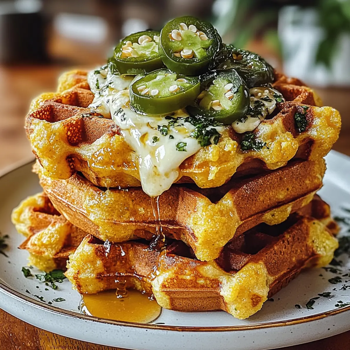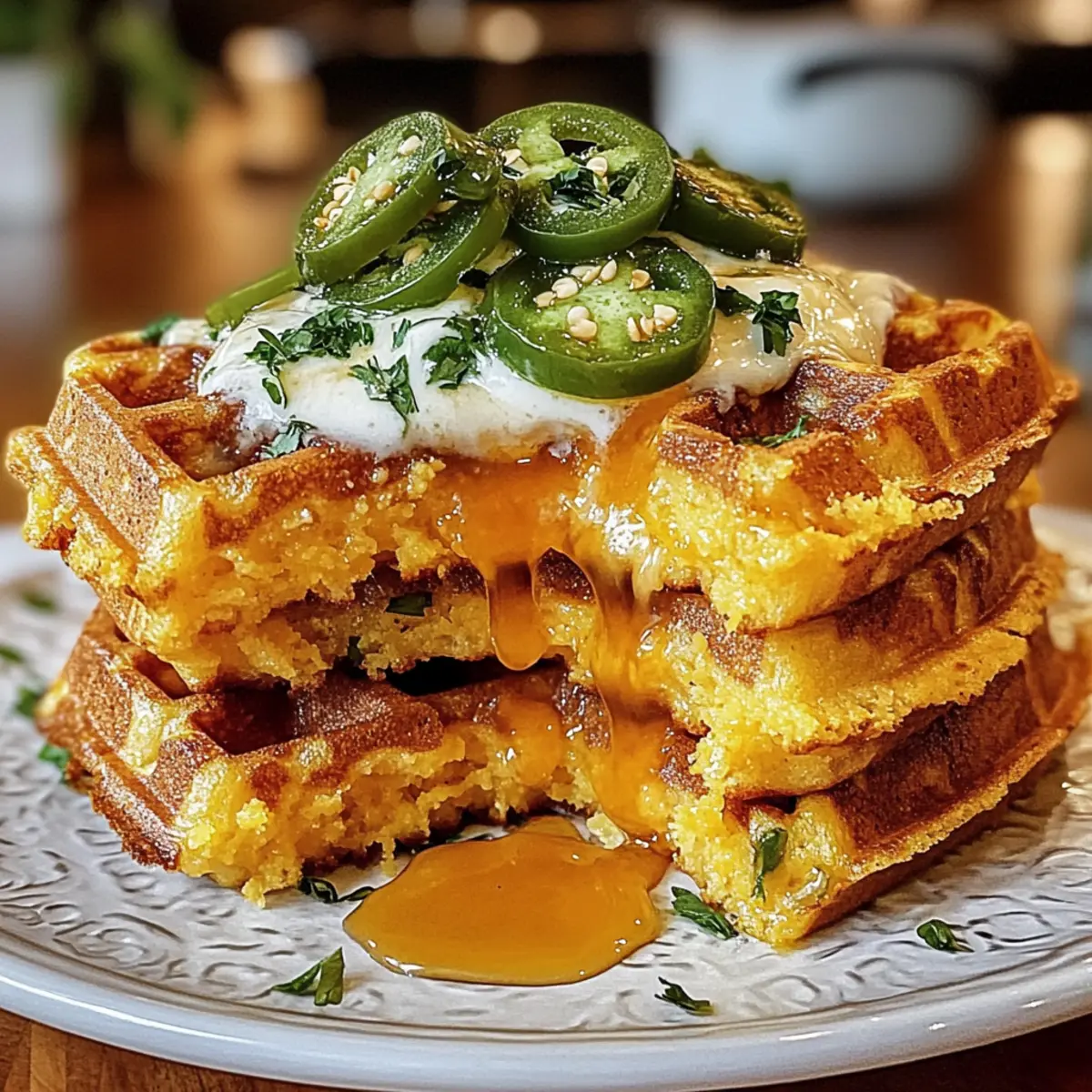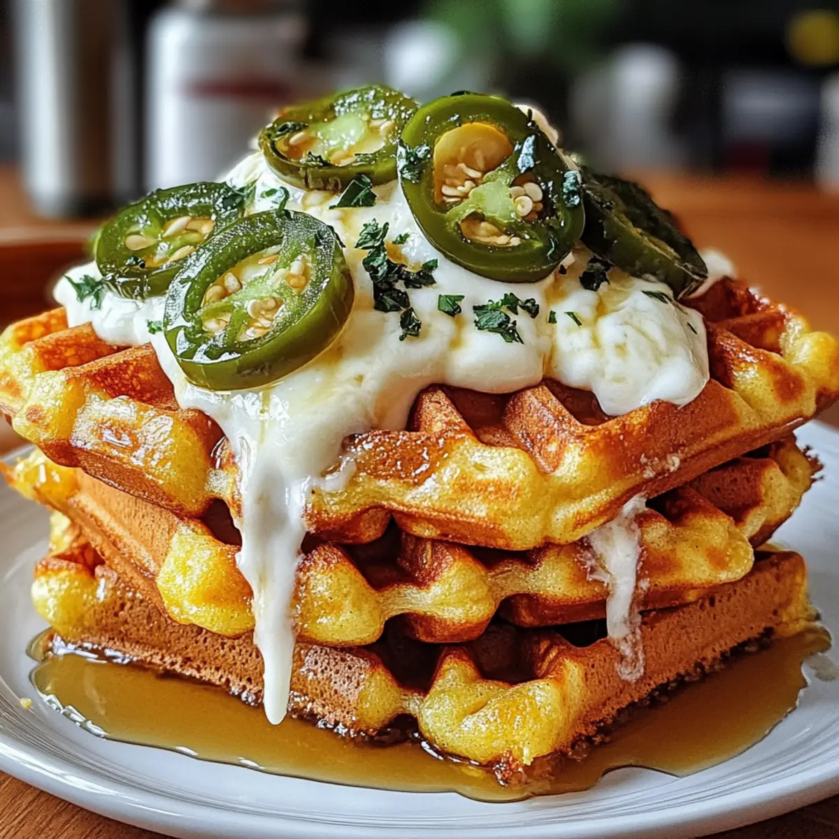 Ich erinnere mich an einen unvergesslichen Brunch mit Freunden, als ich das erste Mal die Cheddar Jalapeño Maisbrot Waffeln servierte. Der aufregende Mix aus süßem Maisbrot und dem feurigen Kick von Jalapeños sorgte sofort für Begeisterung am Tisch! Diese herzhaften Waffeln sind nicht nur einfach und schnell zuzubereiten, sondern auch so vielseitig, dass sie perfekt für Frühstück, Mittagessen oder sogar als Beilage zum Abendessen sind. Egal, ob du sie mit einem Spiegelei, etwas Avocado oder einfach nur mit einem guten Schuss Salsa genießt, sie bringen echten Komfort und Geschmack in jede Mahlzeit. Bist du bereit, deine nächste Küchenkreation zu feiern? Lass uns eintauchen! Warum sind diese Waffeln so besonders? Einzigartiger Geschmack: Die Kombination aus Cheddar und Jalapeños bringt die perfekte Balance aus cremiger Reichhaltigkeit und würziger Schärfe. Einfache Zubereitung: Mit nur wenigen Zutaten sind diese Waffeln im Handumdrehen fertig, ideal für spontane Brunch-Events! Vielseitig einsetzbar: Perfekt als Frühstück, Mittagessen oder als herzhaftes Abendessen, diese Waffeln passen zu jeder Gelegenheit. Gesunde Abwechslung: Sie sind nicht nur lecker, sondern bieten auch eine nahrhafte Option im Vergleich zu Fast Food. Kreativität beim Servieren: Toppe sie mit Salsa, Avocado oder Spiegelei für ein unvergessliches Geschmackserlebnis! Cheddar Jalapeño Maisbrot Waffeln Zutaten Für den Teig • Maismehl – sorgt für den unverwechselbaren Maisbrotgeschmack und eine angenehme Textur. • Weizenmehl – gibt Stabilität; kann durch glutenfreies Mehl ersetzt werden, wenn du eine glutenfreie Variante möchtest. • Backpulver – notwendiges Triebmittel für die Fluffigkeit; stelle sicher, dass es frisch ist. • Backsoda – unterstützt das Aufgehen in Kombination mit Buttermilch; keine Substitution nötig. • Salz – verbessert die Geschmacksbalance; kann reduziert werden, wenn du auf Natrium achtest. • Buttermilch – sorgt für Feuchtigkeit und aktiviert das Backpulver; kann durch Milch mit etwas Essig oder Zitronensaft ersetzt werden. • Ungesalzene Butter – verleiht den Waffeln Reichhaltigkeit; kann durch pflanzliches Öl für eine milchfreie Option ersetzt werden. • Eier – binden die Zutaten und fügen Feuchtigkeit hinzu; für eine eifreie Variante funktionieren Leinsamenmehl oder Chia-Eier gut. • Scharfer Cheddar-Käse – liefert einen cremigen, herzhaften Geschmack; kann für einen milderen Geschmack durch Monterey Jack ersetzt werden. • Eingelegte Jalapeños – bringen Schärfe und eine säuerliche Note; passe die Menge nach deinem gewünschten Schärfegrad an. • Honig – optional, um einen Hauch von Süße hinzuzufügen; kann weggelassen werden, wenn nicht gewünscht. Topping Ideen • Avocado – für eine cremige Komponente, die sich wunderbar mit den Waffeln ergänzt. • Salsa – bringt Frische und zusätzliche Würze; perfekt für den letzten Schliff! • Frittierte Eier – ein sättigendes Topping, das diese Waffeln zu einer vollwertigen Mahlzeit macht. Fühle die Freude beim Zubereiten dieser Cheddar Jalapeño Maisbrot Waffeln, die perfekt für jeden Anlass sind! Schritt-für-Schritt-Anleitung für Cheddar Jalapeño Maisbrot Waffeln Step 1: Waffeleisen vorbereiten Heize dein Waffeleisen auf mittlere Temperatur vor und fette es leicht mit etwas Öl oder Butter ein, um ein Ankleben der Teigmasse zu verhindern. Überprüfe nach etwa 5 Minuten die Temperatur, indem du einen Tropfen Wasser darauf spritzt; das Wasser sollte sofort zerplatzen. Step 2: Trockene Zutaten mischen In einer großen Schüssel vermengst du das Maismehl, das Weizenmehl, das Backpulver, das Backsoda und das Salz gründlich. Stelle sicher, dass alle trockenen Zutaten gut vermischt sind und keine Klumpen enthalten sind. Dies ist der Grundbaustein für die Cheddar Jalapeño Maisbrot Waffeln. Step 3: Feuchte Zutaten vorbereiten In einer separaten Schüssel verquirlst du die Buttermilch, die geschmolzene Butter, die Eier und den Honig, bis eine homogene Masse entsteht. Die Buttermilch sorgt hierbei für die notwendige Feuchtigkeit und aktiviert das Backpulver. Achte darauf, dass alles gut vermischt ist, um einen geschmeidigen Teig zu erhalten. Step 4: Teig zusammenführen Jetzt kombinierst du die beiden Mischungen, indem du die feuchten Zutaten zu den trockenen gibst. Falte die Zutaten vorsichtig zusammen, während du den scharfen Cheddar und die eingelegten Jalapeños hinzufügst. Übermische den Teig nicht, damit die Cheddar Jalapeño Maisbrot Waffeln schön fluffig bleiben. Step 5: Teig auf das Waffeleisen geben Sobald der Teig fertig ist, gieße etwa 3/4 Tasse des Teigs auf das vorgeheizte Waffeleisen. Schließe das Eisen und lasse die Waffeln 5–7 Minuten lang backen, bis sie golden und knusprig sind. Überprüfe den Garzustand, indem du die Waffeln vorsichtig öffnest; sie sollten eine schöne goldene Farbe haben. Step 6: Waffeln ruhen lassen Nach dem Backen lasse die Waffeln kurz ruhen, damit sie ihre Knusprigkeit behalten. Du kannst sie auf einem Kuchengitter ablegen, während du den restlichen Teig verarbeitest. Diese Cheddar Jalapeño Maisbrot Waffeln sind warm am besten und bieten den perfekten Biss! Step 7: Servieren Serviere die frisch gebackenen Waffeln mit deinen liebsten Toppings, wie Avocado oder Salsa. Genieße die geschmackvolle Kombination aus cremigem Cheddar und würzigen Jalapeños, die dein Brunch-Glück perfekt machen! Expertentipps für Cheddar Jalapeño Maisbrot Waffeln Waffeleisen richtig vorheizen: Ein gut vorgeheiztes Waffeleisen sorgt für knusprige Waffeln. Warte mindestens 5 Minuten, bevor du den Teig einfüllst. Nicht übermischen: Achte darauf, den Teig nur kurz zu mischen. Kleine Klumpen sind in Ordnung und verhindern, dass die Cheddar Jalapeño Maisbrot Waffeln zäh werden. Anpassung der Backzeit: Jeder Waffeleisen ist unterschiedlich; beobachte die Farbe der Waffeln. Sie sollten goldbraun sein, bevor du sie entnimmst. Knusprigkeit e