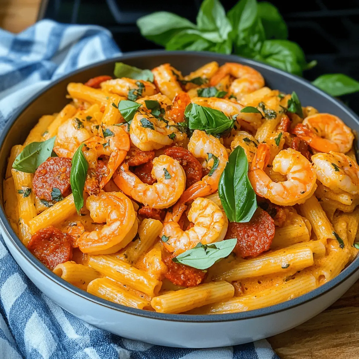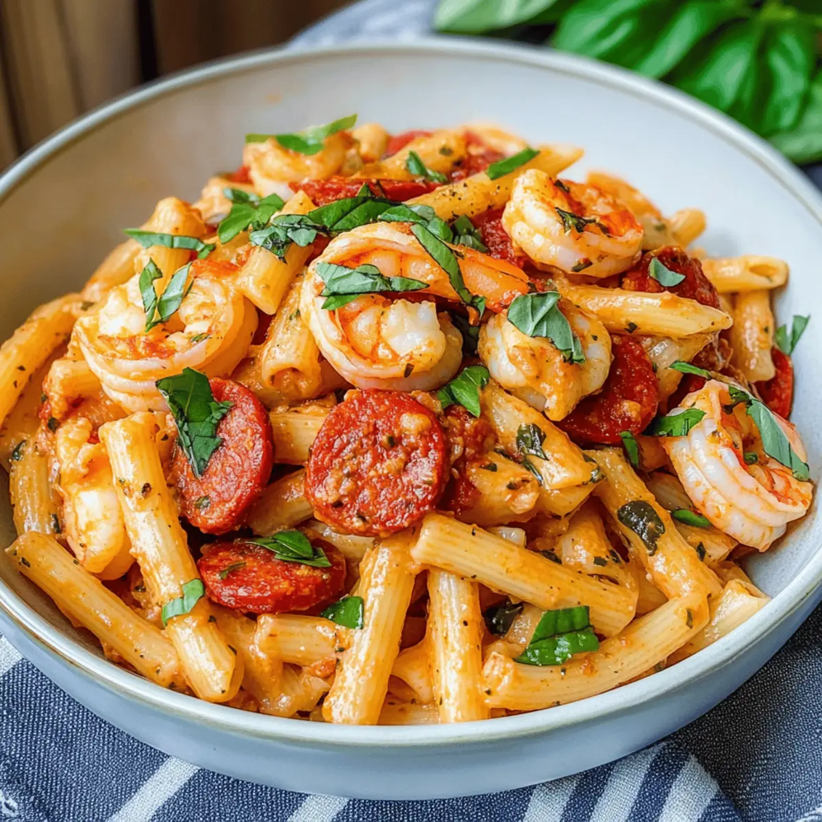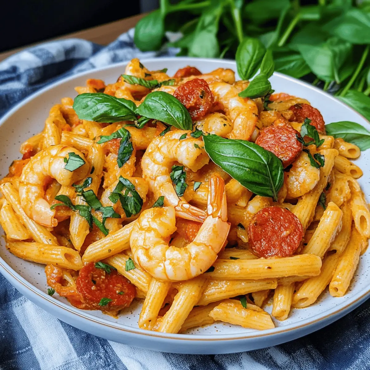 Die Küche war erfüllt von köstlichen Düften, als ich an diesem stressigen Wochentag ein neues Rezept ausprobierte. Die cremige Chorizo- und Garnelen-Pasta war schneller zubereitet als ich „Hallo“ sagen konnte – nur 20 Minuten! Diese einfache und schnelle Mahlzeit verbindet zarte Garnelen und die pikante Note von Chorizo mit frischen Tomaten und cremiger Pasta. Ein wahrer Genuss für alle, die sich nach einem unbeschwerten Abendessen sehnen, ohne dabei auf Geschmack zu verzichten. Die Kombination ist nicht nur schmackhaft, sondern auch anpassbar – ob mit frischem Gemüse oder einer anderen Proteinquelle, es gibt unzählige Möglichkeiten! Neugierig, wie Sie diese köstliche Pasta zubereiten können? Bleiben Sie dran! Warum wird Ihnen dieses Rezept gefallen? Einfachheit in jedem Bissen: Die Zubereitung dieser cremigen Chorizo- und Garnelen-Pasta ist kinderleicht und dauert nur 20 Minuten. Sie benötigen nur grundlegende Kochfähigkeiten! Vielseitige Variationen: Ob mit frischem Gemüse, Hähnchen oder einer vegetarischen Option – Sie können die Zutaten ganz nach Ihrem Geschmack anpassen. Köstlicher Genuss: Die Kombination aus würzigem Chorizo, zarten Garnelen und einer cremigen Sauce bietet ein unverwechselbares Geschmackserlebnis, das die italienische und spanische Küche vereint. Perfekt für hektische Abende: Wenn die Zeit drängt, ist dieses Gericht eine wunderbare Lösung für ein schnelles und schmackhaftes Abendessen. Raffinierte Textur: Die Kombination der al dente Pasta mit der cremigen Sauce sorgt für ein unvergleichliches Mundgefühl, das Ihre Familie und Freunde begeistern wird. Genießen Sie dazu einen erfrischenden Salat oder schlagen Sie ein leckeres Mediterraner Orzo Gesund vor! Cremige Chorizo- und Garnelen-Pasta Zutaten Für die Pasta • Penne Pasta – Diese Pasta bildet die Basis des Gerichts; Sie können auch Rigatoni, Fusilli oder Spaghetti verwenden. Für die Sauce • Olivenöl – Ein schmackhaftes Fett zum Anbraten von Gemüse und Chorizo; Alternativen wie Rapsöl sind ebenfalls möglich. • Mittlere Zwiebel – Verleiht der Sauce Süße und Tiefe; Sie können auch Schalotten oder Frühlingszwiebeln verwenden. • Rote Paprika – Sorgt für Süße und Farbe; jede andere Farbe der Paprika kann als Ersatz dienen. • Chorizo – Gibt dem Gericht diese unverwechselbare Rauchnote; vorzerkleinerte Chorizo beschleunigt die Zubereitung; auch andere Würste sind möglich. • Passata – Die Tomatenbasis für die Sauce bietet Feuchtigkeit und Geschmack; Sie können auch gehackte Tomaten oder mit Wasser verdünnte Tomatenpuree verwenden. • Gekochte Jumbo-Garnelen – Die Hauptproteinquelle; frische Garnelen können verwendet werden, wobei sich die Kochzeiten ändern. • Schlagsahne (oder Doppelrahm) – Macht die Sauce reichhaltig und cremig; bei Bedarf kann auch Sauerrahm oder eine leichtere Sahne verwendet werden. • Salz und Pfeffer – Würzen, um den Geschmack zu verstärken; nach Geschmack anpassen. • Basilikumblätter – Frische Kräuter für Aroma und Garnitur; können auch durch Petersilie ersetzt oder weggelassen werden. Genießen Sie Ihre selbstgemachte cremige Chorizo- und Garnelen-Pasta! Schritt-für-Schritt-Anleitung für Cremige Chorizo- und Garnelen-Pasta Schritt 1: Pasta kochen Bringen Sie einen großen Topf mit Wasser zum Kochen und fügen Sie eine Prise Salz hinzu. Kochen Sie die Penne-Pasta gemäß den Anweisungen auf der Packung, bis sie al dente ist (ca. 8-10 Minuten). Achten Sie darauf, die Pasta zu probieren; sie sollte weich, aber noch bissfest sein. Anschließend abgießen und beiseite stellen. Schritt 2: Zwiebeln anbraten Erhitzen Sie in einer großen Pfanne bei mittlerer Hitze 2 Esslöffel Olivenöl. Fügen Sie die fein gewürfelte Zwiebel hinzu und braten Sie sie 3 Minuten lang mit geschlossenem Deckel, bis sie weich und leicht golden ist. Dies bringt Süße und Tiefe in Ihre cremige Chorizo- und Garnelen-Pasta. Schritt 3: Paprika und Chorizo hinzufügen Fügen Sie die gewürfelte rote Paprika und die vorzerkleinerte Chorizo zu den Zwiebeln in der Pfanne hinzu. Braten Sie diese Mischung weitere 3 Minuten an, bis die Chorizo leicht knusprig ist und ihre Aromen entfaltet. Rühren Sie regelmäßig um, um ein Anbrennen zu vermeiden und die Farben leuchtend schön zu halten. Schritt 4: Sauce zubereiten Gießen Sie nun die Passata in die Pfanne und erhöhen Sie die Hitze, bis die Mischung zu kochen beginnt. Reduzieren Sie die Hitze dann auf niedrig und lassen Sie die Sauce etwa 5 Minuten lang köcheln, damit sie eindickt und die Aromen sich gut vermischen. Die cremige Chorizo- und Garnelen-Pasta nimmt so ihre köstliche Basisform an. Schritt 5: Garnelen und Sahne einrühren Fügen Sie die gekochten Jumbo-Garnelen und die Schlagsahne zur Sauce hinzu. Kochen Sie alles zusammen auf niedriger Stufe für 2 weitere Minuten, bis die Garnelen durchgewärmt sind und die Sauce cremig wird. Achten Sie darauf, die Garnelen nicht zu überkochen, damit sie zart bleiben. Schritt 6: Pasta unterheben Geben Sie die abgegossene Penne-Pasta in die Pfanne mit der cremigen Chorizo- und Garnelen-Sauce. Mischen Sie alles gut durch, bis die Pasta gleichmäßig mit der Sauce überzogen ist. Diese Kombination sorgt dafür, dass jedes Stück Pasta das köstliche Aroma aufnimmt und perfekt servierfertig ist. Schritt 7: Servieren und garnieren Zupfen Sie einige frische Basilikumblätter ab und heben Sie sie sanft unter die Pasta für zusätzlichen Geschmack. Servieren Sie die cremige Chorizo- und Garnelen-Pasta sofort, heiß und dampfend, und garnieren Sie sie nach Belieben mit weiteren Basilikumblättern für einen frischen Akzent. Vorausplanen für eine stressfreie Zubereitung Wenn Sie die cremige Chorizo- und Garnelen-Pasta für eine hektische Woche vorbereiten möchten, können Sie viele Komponenten bereits im Voraus erledigen. Kochen Sie die Penne-Pasta bis al dente und bewahren Sie sie in einem luftdichten Behälter im Kühlschrank für bis zu 3 