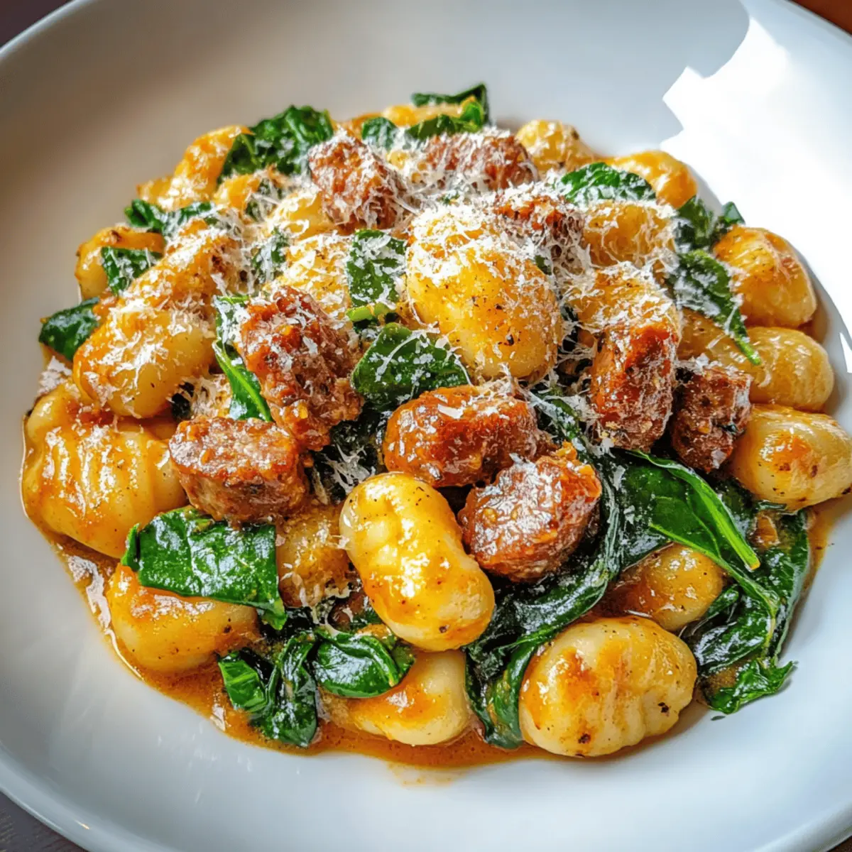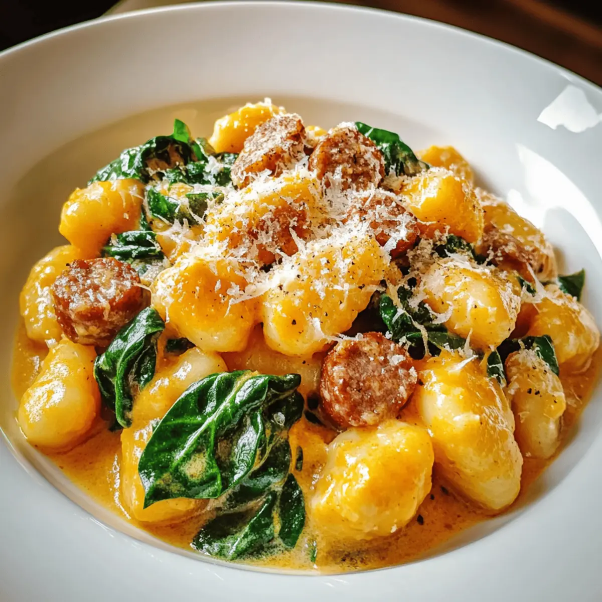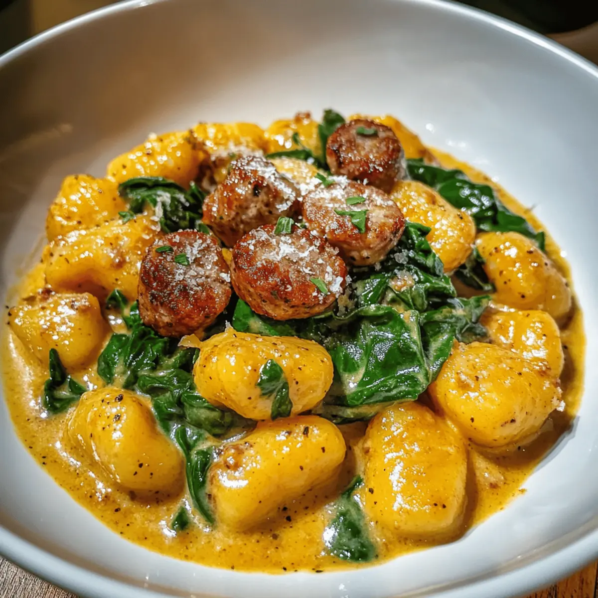 Der verführerische Duft von frisch gebackenem Kürbis schwebt durch die Küche und zwingt mich unwillkürlich an den Herd. Heute bereite ich mir cremige Kürbisgnocchi mit Spinat und italienischer Wurst zu – ein echtes Herbst-Highlight! Diese Kombination aus samtiger Kürbispüree, herzhaftem Fleisch und zarten Gnocchi wird nicht nur meine Geschmacksknospen verwöhnen, sondern ist auch in weniger als 35 Minuten zubereitet. Ideal für stressige Wochentage und selbst für Kochanfänger ein Kinderspiel. Darüber hinaus lässt sich dieses Rezept leicht anpassen, sodass auch vegetarische Feinschmecker auf ihre Kosten kommen. Neugierig, wie du dieses herbstliche Comfort-Food ganz einfach selbst zaubern kannst? Lass uns gemeinsam in die Welt der köstlichen Aromen eintauchen! Warum wirst du dieses Rezept lieben? Einfachheit: Die Zubereitung der cremigen Kürbisgnocchi ist mühelos und benötigt nur grundlegende Kochkenntnisse – perfekt für Anfänger! Vielfältig: Mit Optionen für vegetarische Alternativen oder scharfe Würste kannst du das Rezept ganz nach deinem Geschmack anpassen. Aromatischer Genuss: Die Kombination aus süßlichem Kürbis und herzhaftem Fleisch schafft harmonische, herbstliche Aromen, die deine Familie begeistern werden. Schnell: In weniger als 35 Minuten auf dem Tisch – ideal für hektische Wochentage. Gepflegte Präsentation: Die leuchtenden Farben und die cremige Konsistenz machen dieses Gericht zu einem Eyecatcher beim Abendessen. Du kannst es hervorragend mit einer einfachen Beilage, wie einem italienischen Hähnchensalat Rezept, kombinieren. Cremige Kürbisgnocchi Zutaten Für die Gnocchi • Kartoffelgnocchi – Zarte Teigtäschchen, die die cremige Sauce wunderbar aufnehmen. Alternativ kannst du auch Pasta verwenden, achte jedoch auf die Kochzeiten. • Olivenöl – Ideal zum Braten der Wurst; es verleiht dem Gericht eine fruchtige Note. Für die Sauce • Italienische Wurst – Bringt einen herzhaften, leicht scharfen Geschmack; zerkleinert für die perfekte Textur. Kann durch pflanzliche Wurst für eine vegetarische Variante ersetzt werden. • Kürbispüree – Die Seele der Sauce, die eine cremige Süße und leuchtende Farbe beiträgt. • Schlagsahne – Macht die Sauce reichhaltig; kann durch Halbfettcreme oder Kokosmilch für leichtere oder milchfreie Optionen ersetzt werden. • Parmesankäse – Verleiht der Sauce eine nussige Tiefe; optional, aber empfohlen. • Knoblauch – Für aromatischen Geschmack; fein gehackt und kurz angebraten. • Muskatnuss – Fügt warme Gewürznoten hinzu, die die Süße des Kürbisses perfekt ergänzen. • Salz und Pfeffer – Unverzichtbar zur Würzung und zur Hervorhebung aller Aromen. Für das Finish • Frischer Spinat – Bringt Farbe, Nährstoffe und eine milde, blättrige Note, wenn er während des Kochens untergehoben wird. • Frische Petersilie oder Basilikum (Optional) – Bietet ein lebhaftes Aroma als Garnitur kurz vor dem Servieren. Schritt-für-Schritt-Anleitung für Cremige Kürbisgnocchi mit Spinat und italienischer Wurst Step 1: Wasser kochen Bringe einen großen Topf mit gesalzenem Wasser zum Kochen. Füge die Kartoffelgnocchi hinzu und koche sie gemäß den Anweisungen auf der Verpackung, bis sie an die Oberfläche steigen (ca. 2–3 Minuten). Sobald die Gnocchi fertig sind, gieße sie ab und stelle sie beiseite. Step 2: Wurst anbraten Erhitze in einer großen Pfanne bei mittlerer bis hoher Hitze etwas Olivenöl. Füge die zerkleinerte italienische Wurst hinzu und brate sie für 5–7 Minuten, bis sie goldbraun ist und gut durchgegart aussieht. Nimm die Wurst aus der Pfanne und stelle sie zur Seite. Step 3: Knoblauch anbraten In derselben Pfanne mit dem verbliebenen Öl gebe den fein gehackten Knoblauch hinzu. Brate ihn etwa 1 Minute lang an, bis er aromatisch ist. Achte darauf, dass er nicht verbrennt, da er sonst bitter wird. Step 4: Sauce zubereiten Reduziere die Hitze auf mittlere bis niedrige Stufe und füge das Kürbispüree, die Schlagsahne, den Parmesan, die Muskatnuss, Salz und Pfeffer hinzu. Rühre alles gut um und lasse die Sauce für 3-4 Minuten köcheln, bis sie cremig und heiß ist. Step 5: Gnocchi und Spinat hinzufügen Füge die gekochten Gnocchi und den frischen Spinat in die Sauce. Vorsichtig umrühren, damit die Gnocchi gleichmäßig mit der cremigen Kürbissauce überzogen werden. Achte darauf, dass der Spinat zusammenfällt und eine lebendige Farbe erhält. Step 6: Wurst zurückgeben Gib die gebratene Wurst zurück in die Pfanne und vermische alles gut, bis die Wurst durchgewärmt ist. Achte darauf, dass die Mischung gut zusammenkommt und die Aromen sich entfalten. Step 7: Anrichten und Servieren Serviere die cremigen Kürbisgnocchi mit Spinat und italienischer Wurst sofort. Du kannst das Gericht nach Belieben mit frischer Petersilie oder Basilikum garnieren, um einen zusätzlichen farblichen und geschmacklichen Akzent zu setzen. Variationen & Alternativen für Cremige Kürbisgnocchi Lass deiner Kreativität bei der Zubereitung dieser köstlichen Gnocchi freien Lauf und genieße die Vielfalt der Aromen! Vegetarisch: Ersetze die italienische Wurst durch eine pflanzliche Variante oder füge gebratene Zucchini hinzu. So bleibt der cremige Genuss erhalten. Scharf: Für einen zusätzlichen Kick verwende scharfe italienische Wurst oder füge rote Paprikaflocken hinzu. Diese Würze bringt das Gericht auf ein neues Level! Lebensmittelunverträglichkeiten: Nutze Kokosmilch anstelle von Schlagsahne für eine milchfreie Option. Der cremige Geschmack bleibt dabei erhalten. Käsefrei: Lass den Parmesan weg und experimentiere mit Hefeflocken für einen herzhaften, käseähnlichen Geschmack ohne Milchprodukte. Nussige Note: Füge geröstete Walnüsse oder Pinienkerne hinzu, um eine knusprige Textur und nussigen Geschmack zu erzielen. Eine wunderbare Ergänzung zum cremigen Gnocchi! Zusätzliche Gemüse: Mische Paprika oder Mangold unter die Gnocchi, um mehr Farbe und Nährstoffe in dein 