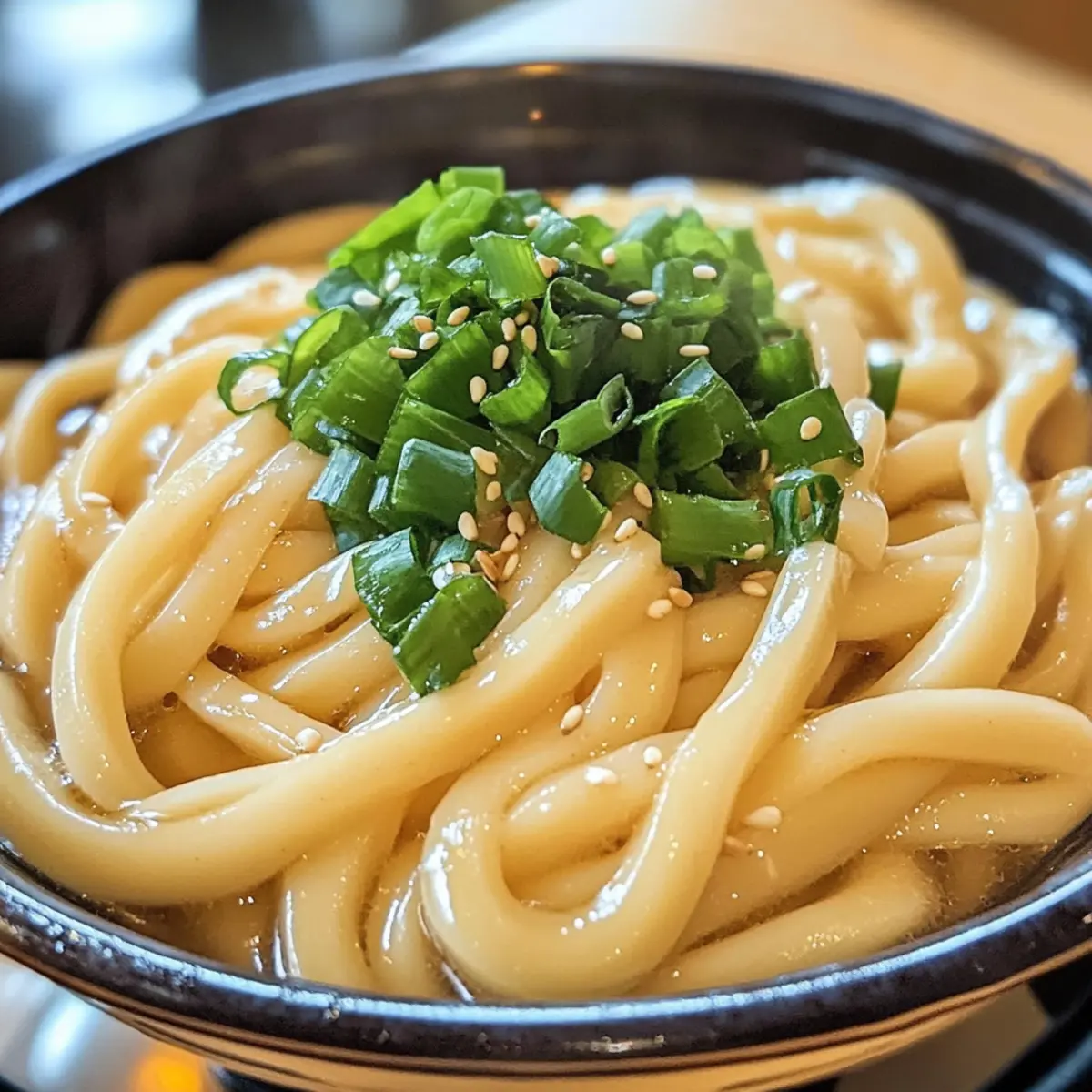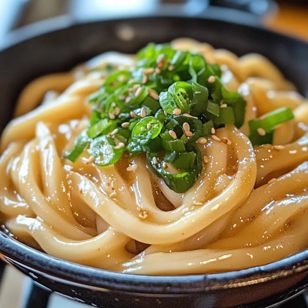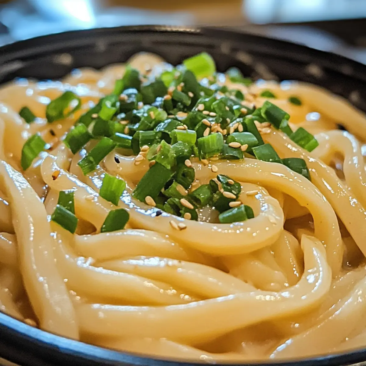 4. Verteile die Udon auf Teller und garniere mit Frühlingszwiebeln. Träufle Sesamöl darüber und serviere heiß.