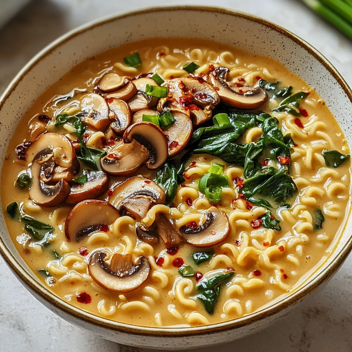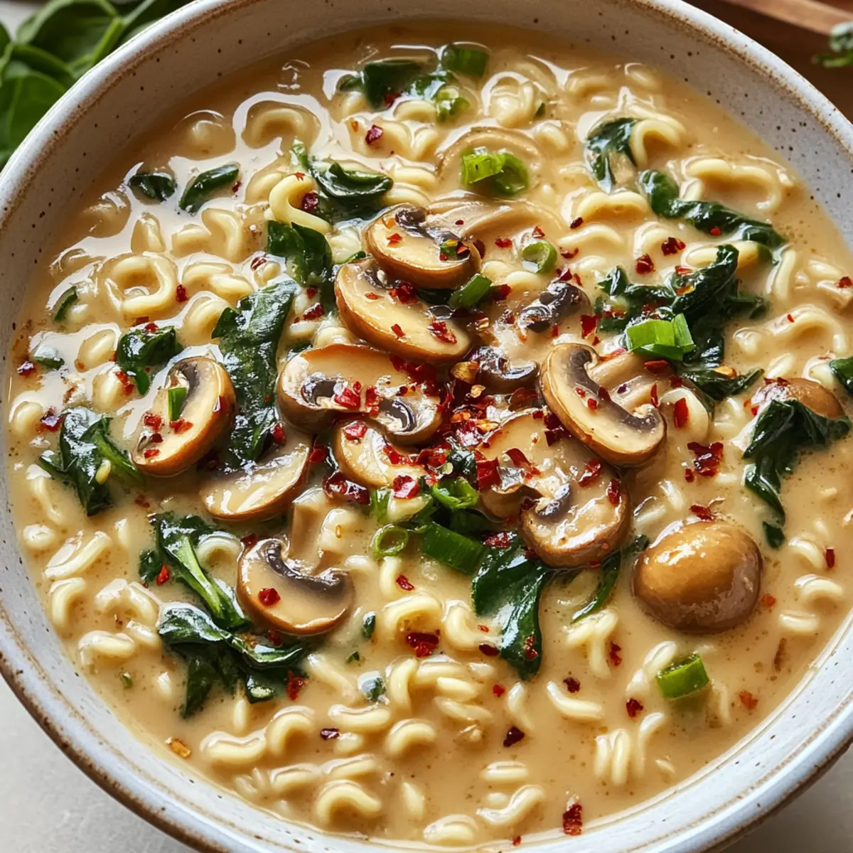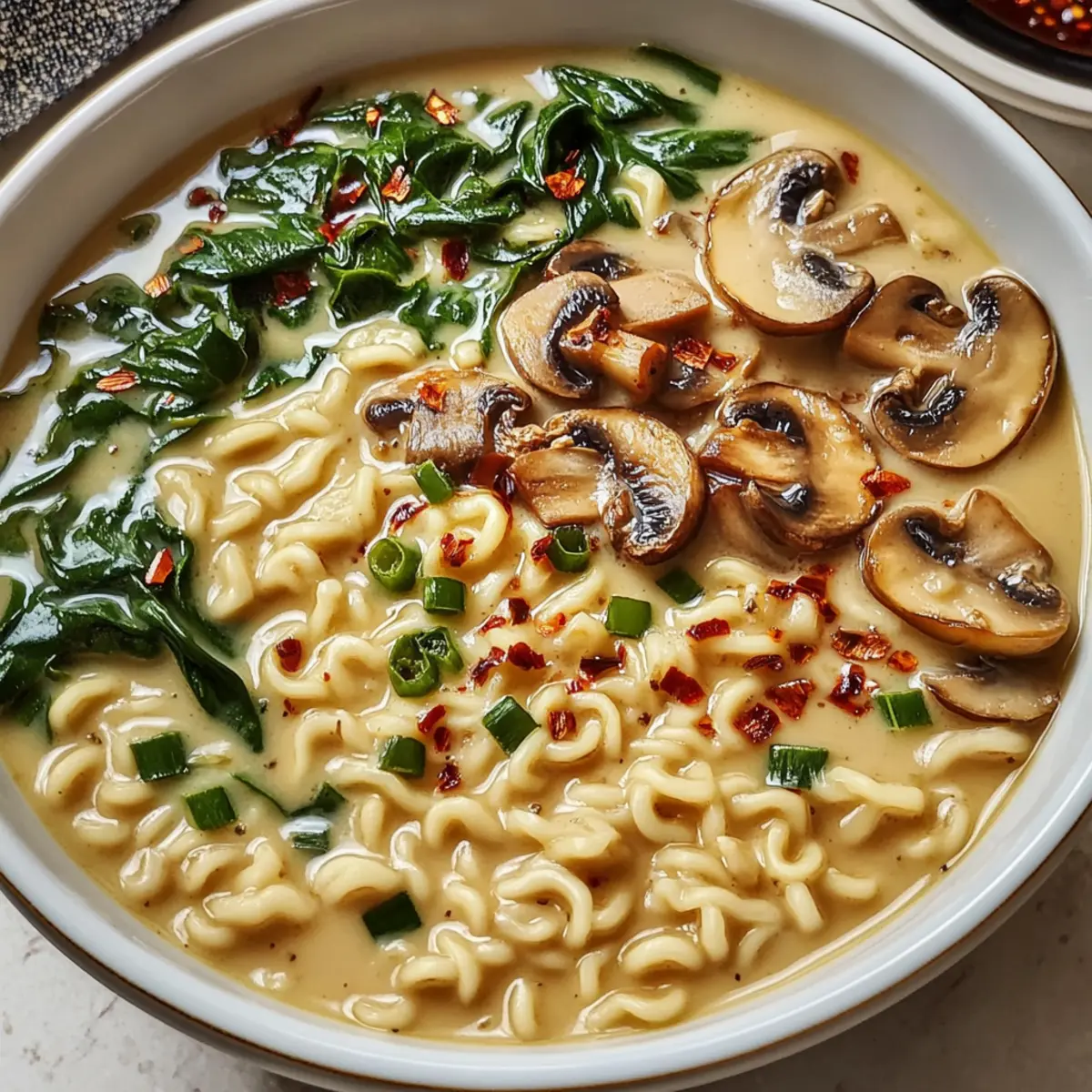 Der Duft von frisch sautierten Pilzen hat die Küche erobert und holt Erinnerungen an gemütliche Abende hervor. Heute lade ich euch ein, mit mir in die Welt der Cremigen Pilz Veganen Ramen einzutauchen. In nur fünfzehn Minuten zaubert ihr ein wohltuendes Gericht, das nicht nur umami-reiche Aromen vereint, sondern auch mit buntem Gemüse begeistert. Diese Ramen sind schnell zubereitet und lassen sich mühelos an die individuellen Vorlieben anpassen – ganz gleich, ob ihr auf der Suche nach einer gesunden Alternative oder einem köstlichen Comfort Food seid. Mit einer cremigen Kokosmilch-Brühe und zarten Baby-Bella-Pilzen wird jede Schüssel zu einer kleinen Umarmung für die Seele. Seid ihr bereit, das Rezept auszuprobieren und eure Lieben zu überraschen? Warum wirst du dieses Rezept lieben? Schnelle Zubereitung: In nur fünfzehn Minuten bringt dieses Rezept einen Hauch von Asien in eure Küche. Vielseitigkeit: Passen Sie die Zutaten nach Belieben an – ob mit extra Gemüse oder einer anderen Nudelart. Reichhaltiger Geschmack: Die Kombination aus Baby-Bella-Pilzen und cremiger Kokosmilch sorgt für einen umami-reichen Genuss, der das Herz erwärmt. Gesund und lecker: Ideal für alle, die nach gesunden Alternativen suchen, ohne auf Geschmack zu verzichten. Perfekt für alle: Ob Veganer, Vegetarier oder einfach Liebhaber von gutem Essen – diese Ramen werden alle begeistern. Mit tollen Variationen kannst du das Rezept immer wieder neu entdecken! Cremige Pilz Vegane Ramen Zutaten Für die Brühe Kochöl – Für das Anbraten der Pilze; verwende ein neutrales Öl wie Raps- oder Sonnenblumenöl. Baby-Bella-Pilze – Sorgen für einen reichen, erdigen Geschmack; du kannst sie durch Cremini- oder Shiitake-Pilze ersetzen. Gemüsebrühe – Die geschmackvolle Basis; greife zu einer natriumreduzierten Variante für ein leichteres Gericht. Frische Spinat – Fügt Nährstoffe und Farbe hinzu; auch Baby-Kale oder Pak Choi sind dafür eine gute Wahl. Kokosmilch aus der Dose – Macht die Brühe cremig; alternativ kannst du ungesüßte Soja- oder Hafercreme verwenden. Für die Nudeln Ramen-Nudeln – Die Hauptquelle der Kohlenhydrate; ersetze sie durch glutenfreie Ramen oder Reisnudeln, und vergiss nicht, das Gewürzpaket zu entsorgen. Für das Topping Frühlingszwiebel – Für eine frische Garnierung; in Ringe schneiden und über die Ramen streuen. Chili-Knoblauch-Sauce/Sriracha – Fügt Schärfe hinzu; passe die Menge deinem Geschmack an. Diese Zutaten machen die Cremigen Pilz Veganen Ramen nicht nur geschmacklich vielfältig, sondern auch anpassungsfähig für verschiedene Ernährungsbedürfnisse! Schritt-für-Schritt-Anleitung für Cremige Pilz Vegane Ramen Step 1: Öl erhitzen Erhitze in einem großen Topf bei mittlerer Hitze etwas Kochöl. Wähle ein neutrales Öl wie Raps- oder Sonnenblumenöl, um die Aromen der Baby-Bella-Pilze hervorzuheben. Nachdem das Öl heiß ist, kannst du mit dem nächsten Schritt fortfahren, wenn es leichte Wellen zeigt und zu glänzen beginnt. Step 2: Pilze anbraten Füge die in Scheiben geschnittenen Baby-Bella-Pilze in den heißem Topf hinzu und brate sie für etwa 5-7 Minuten an, bis sie goldbraun und zart sind. Achte darauf, sie regelmäßig umzurühren, damit sie gleichmäßig garen und ihr köstliches, erdiges Aroma entfalten. Step 3: Brühe hinzufügen Gieße die Gemüsebrühe in den Topf und bringe sie zum sanften Kochen. Lass die Brühe für etwa 2-3 Minuten köcheln, sodass sich die Aromen der Pilze gut entfalten können. Das leichte Sprudeln zeigt dir, dass die Brühe bereit ist für die nächsten Zutaten. Step 4: Ramen-Nudeln kochen Füge die Ramen-Nudeln in die brodelnde Brühe hinzu. Koche die Nudeln für 3 Minuten oder bis sie gerade zart sind, dabei gelegentlich umrühren, damit sie nicht zusammenkleben. Beobachte, wie sie weich werden und ihre Farbe ändern, während sie die Brühe aufnehmen. Step 5: Spinat hinzufügen Schalte die Hitze aus und füge den frischen Spinat zur Mischung im Topf hinzu. Rühre alles gut um, und beobachte, wie der Spinat in der heißen Brühe schnell zusammenfällt und seine leuchtende Farbe behält. Dies dauert nur etwa 1 Minute. Step 6: Kokosmilch einrühren Gib die Kokosmilch in den Topf und rühre sie gut unter, bis die Brühe schön cremig und gleichmäßig ist. Die Mischung sollte nun eine offene, sämige Konsistenz haben und den hauseigenen, reichhaltigen Geschmack der Cremigen Pilz Veganen Ramen ausstrahlen. Step 7: Anrichten und garnieren Verteile die fertigen Ramen gleichmäßig auf Schüsseln und garniere sie mit den in Ringe geschnittenen Frühlingszwiebeln. Träufle nach Belieben etwas Chili-Knoblauch-Sauce oder Sriracha darüber, um deinem Gericht eine würzige Note zu verleihen, und serviere es heiß. Expertentipps für Cremige Pilz Vegane Ramen Langsame Erwärmung: Um die Cremigkeit der Brühe zu bewahren, erwärme Reste langsam bei niedriger Hitze, damit die Kokosmilch nicht gerinnt. Konstanz der Textur: Wenn die Brühe beim Lagern dicker wird, füge beim Aufwärmen einen Spritzer Wasser oder Brühe hinzu, um sie wieder zu beleben. Protein hinzufügen: Für eine sättigendere Mahlzeit kannst du Rösttofu, Edamame oder Tempeh als zusätzliche Proteinquelle einfügen. Variationen: Experimentiere mit verschiedenen Pilzsorten, um den Geschmack deiner Cremigen Pilz Veganen Ramen anzupassen – Shiitake oder Cremini sind hervorragend geeignet. Gemüse ergänzen: Füge zusätzliches Gemüse wie Karotten oder Erbsenschoten hinzu, um Farbe, Textur und Nährstoffe zu steigern. Würze kontrollieren: Probiere die Brühe vor dem Servieren und passe die Menge Chili-Knoblauch-Sauce oder Sriracha deinem persönlichen Schärfewunsch an. Lagerungstipps für Cremige Pilz Vegane Ramen Zimmertemperatur: Serviere die Ramen direkt nach der Zubereitung für den besten Geschmack und die beste Textur. Bei Zimmertemperatur sollten Reste nicht länger als 2 Stunden stehen bleiben. Kühlschrank: Bewahre übrig gebliebene Cremige