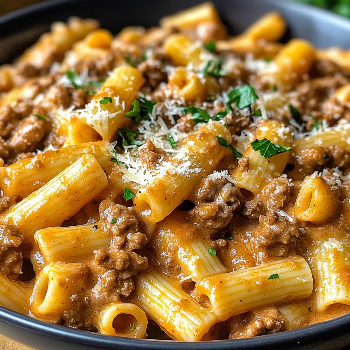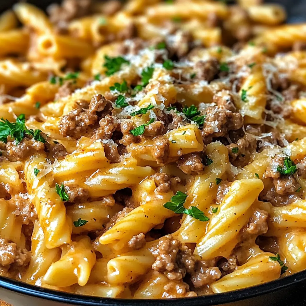 Es war einer dieser regnerischen Abende, an denen man einfach nur nach einer warmen Umarmung in Form von Essen sucht. Heute stelle ich euch meine cremigen Rindfleisch-Nudeln vor – ein Gericht, das nicht nur in kürzester Zeit zubereitet werden kann, sondern auch das Herz wärmt und den Gaumen erfreut. Mit zartem Rinderhack und einer veloursartigen Sauce umhüllt diese Kombination aus herzhaftem und cremigem Geschmack jede Pasta auf köstliche Weise. Dieses Rezept ist nicht nur ideal für stressige Wochentage, sondern eignet sich auch perfekt für gesellige Abende mit Familie und Freunden. Seid ihr bereit, euch den Komfort der italienischen Küche nach Hause zu holen? Lasst uns loslegen! Warum sind diese Rindfleisch-Nudeln unwiderstehlich? Wärme und Komfort: Die cremigen Rindfleisch-Nudeln sind die perfekte Antwort auf kalte Tage. Mit einer satten, veloursartigen Sauce, die jedem Bissen ein Gefühl von Geborgenheit verleiht, ist dieses Gericht einfach unverwechselbar. Schnelle Zubereitung: Ideal für geschäftige Wochentage, benötigt dieses Rezept nur wenige Minuten, um den gesamten Haushalt zu begeistern. Vielseitigkeit: Ob ihr frisches Gemüse hinzufügen oder das Rindfleisch gegen Geflügel eintauschen möchtet, die Möglichkeiten sind endlos! Erinnerungen schaffen: Serviert mit frischen Kräutern oder mehr Parmesan, ist es nicht nur ein Gericht, sondern eine Erfahrung, die Erinnerungen schafft. Wenn ihr nach weiteren köstlichen Rezepten sucht, könnte auch unser Cremiger Rindfleisch Stroganoff euer Interesse wecken! Cremige Rindfleisch-Nudeln Zutaten Die Basis Pasta – Wählt eine Form wie Penne, die die Sauce gut hält. Rinderhackfleisch – Ideal für einen herzhaften Geschmack, wählt mageres Hackfleisch für weniger Fett. Die Sauce Schlagsahne – Sie sorgt für eine reichhaltige und cremige Textur; halbe-halbe kann für eine leichtere Variante verwendet werden. Knoblauch – Frisch gehackter Knoblauch intensiviert das Aroma und die Geschmacksvielfalt. Zwiebel – Eine gewürfelte Zwiebel fügt Süße und Tiefe hinzu; gelbe Zwiebeln sind besonders empfehlenswert. Parmesan – Frisch gerieben sorgt für maximalen Geschmack und Cremigkeit. Gewürze und Öle Italienische Gewürzmischung – Ein Kräuter-Mix, der den Geschmack hebt. Salz und Pfeffer – Unverzichtbar für die Geschmacksabrundung; nach Belieben anpassen. Olivenöl – Zum Anbraten der Zwiebeln und des Knoblauchs, es gibt eine aromatische Basis. Die cremigen Rindfleisch-Nudeln sind der Inbegriff von Komfortessen und laden dazu ein, kreativ zu sein – experimentiert mit verschiedenen Zutaten und genießt die vielfältigen Möglichkeiten! Step-by-Step Instructions für Cremige Rindfleisch-Nudeln Step 1: Pasta kochen Bringt einen großen Topf mit gesalzenem Wasser zum Kochen. Fügt die Pasta hinzu und kocht sie gemäß der Packungsanweisung al dente – das dauert in der Regel 8-10 Minuten. Sobald die Nudeln fertig sind, gießt ihr sie ab, aber legt eine Tasse des Kochwassers beiseite. Step 2: Aromaten anbraten Erhitzt in einer großen Pfanne bei mittlerer Hitze 2 Esslöffel Olivenöl. Gebt die gewürfelte Zwiebel und den frisch gehackten Knoblauch hinein und bratet sie für etwa 5 Minuten an, bis die Zwiebel weich und durchscheinend ist. Achtet darauf, dass der Knoblauch nicht anbrennt, um bittere Aromen zu vermeiden. Step 3: Rinderhackfleisch bräunen Fügt das Rinderhackfleisch in die Pfanne und zerbrecht es mit einem Holzlöffel. Bratet das Fleisch für 7-10 Minuten, bis es gleichmäßig gebräunt ist. Würzt es während des Bratens mit Salz, Pfeffer und italienischer Gewürzmischung, um den Geschmack der cremigen Rindfleisch-Nudeln zu intensivieren. Step 4: Sauce zubereiten Reduziert die Hitze auf niedrig, gebt die Schlagsahne hinzu und rührt sanft um. Fügt nach und nach das reservierte Nudelwasser hinzu, bis die Sauce die gewünschte Konsistenz erreicht. Rührt den frisch geriebenen Parmesan unter, bis er vollständig geschmolzen ist und die Sauce cremig wird. Step 5: Alles vermengen Gebt die abgetropfte Pasta in die Pfanne und vermischt sie sorgfältig mit der cremigen Sauce. Tossiert die Nudeln, bis sie gleichmäßig mit der Sauce überzogen sind. Die cremigen Rindfleisch-Nudeln sollten jetzt in einer luxuriösen Sauce schimmern und bereit zum Servieren sein. Step 6: Anrichten und servieren Schöpft die cremigen Rindfleisch-Nudeln auf Teller und garniert sie nach Belieben mit zusätzlichem Parmesan oder frischen Kräutern. Serviert sie sofort, während sie noch heiß sind, und lasst euch von diesen köstlichen und herzhaften Aromen verwöhnen. Aufbewahrungstipps für Cremige Rindfleisch-Nudeln Raumtemperatur: Lasst die Nudeln nach dem Kochen auf Zimmertemperatur abkühlen, bevor ihr sie in den Kühlschrank stellt. Kühlschrank: Bewahrt die cremigen Rindfleisch-Nudeln in einem luftdichten Behälter im Kühlschrank auf – sie sind dort bis zu 3 Tage haltbar. Gefrierschrank: Für eine längere Haltbarkeit können die Nudeln in einem gefrierfesten Behälter bis zu 2 Monate eingefroren werden. Lässt vorher die Luft entweichen, um Gefrierbrand zu vermeiden. Wiedererwärmen: Erwärmt die Nudeln auf dem Herd bei mittlerer Hitze, gebt einen Schluck Sahne hinzu, wenn die Sauce zu dick geworden ist. So bleibt die Textur angenehm cremig. Vorbereitungen für Cremige Rindfleisch-Nudeln Die cremigen Rindfleisch-Nudeln eignen sich hervorragend für die Vorbereitung im Voraus! Ihr könnt die Zwiebeln und den Knoblauch bis zu 24 Stunden zuvor anbraten, damit die Aromen gleich in die Sauce einziehen. Das Rinderhackfleisch lässt sich ebenfalls schon 1-2 Tage vorher braten und im Kühlschrank aufbewahren – so spart ihr in der stressigen Woche Zeit. Denkt daran, die gekochte Pasta und die Sauce getrennt aufzubewahren, um die perfekte Textur zu behalten. Wenn ihr bereit seid zu servieren, erhitzt alles zusammen in einer Pfanne, fügt nach Bedarf etwas Nudelwasser hinzu, und lasst euch diese köstlichen cremigen Rindfleisch-