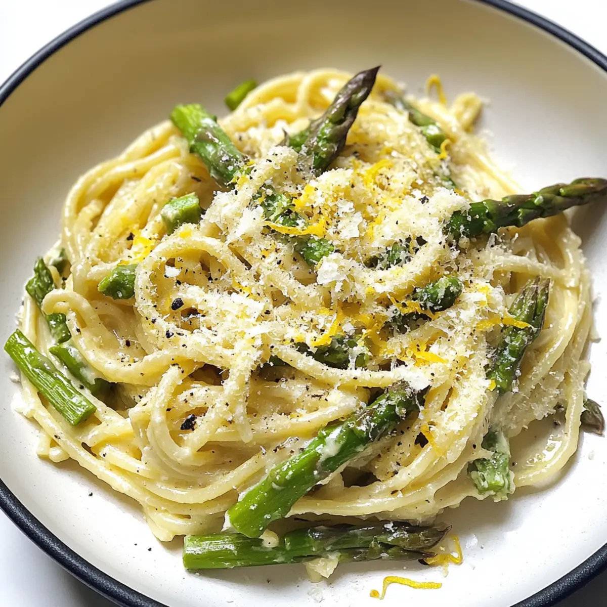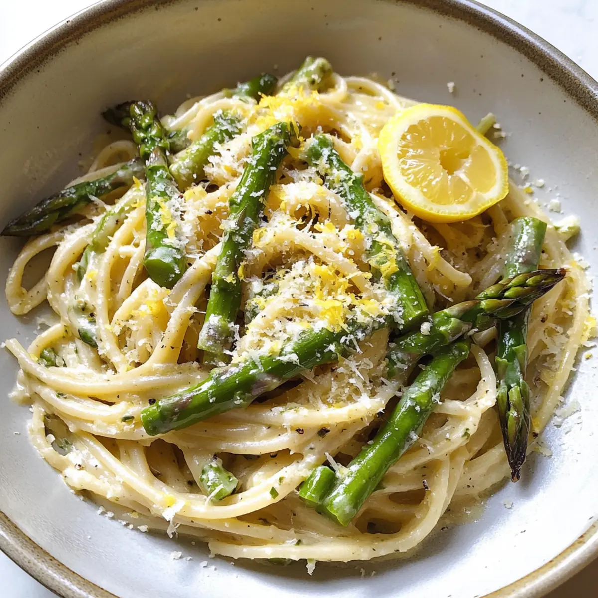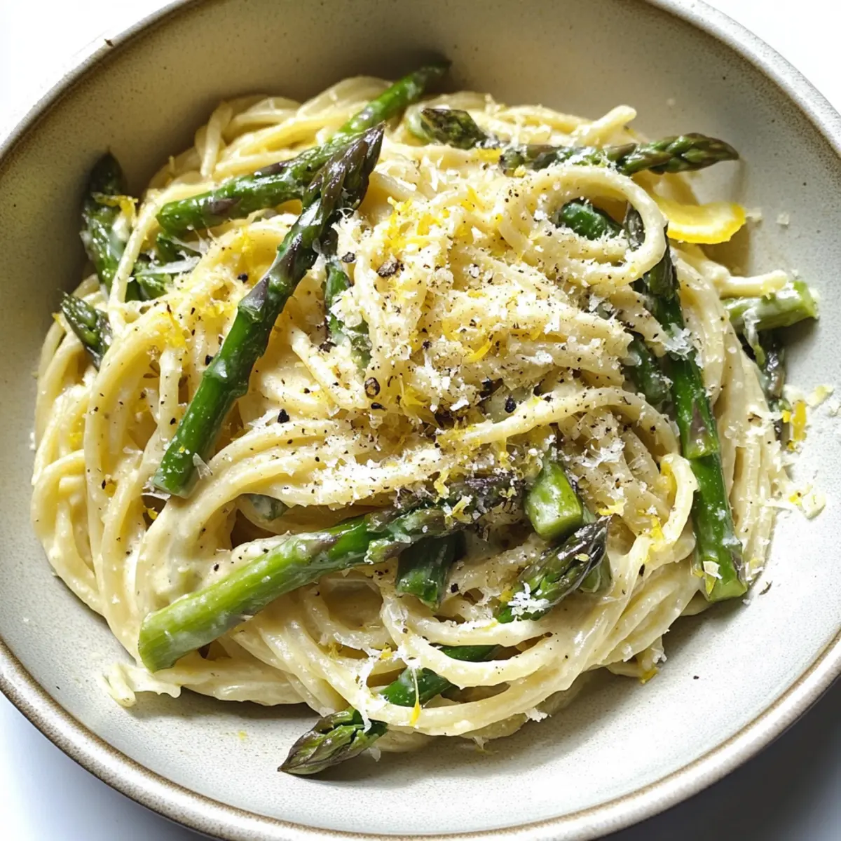 Es gibt Momente, da habe ich einfach keine Lust auf komplizierte Rezepte, aber ich möchte trotzdem etwas Köstliches zaubern. Genau in solchen Augenblicken greife ich zur cremigen Spargel-Pasta. In nur 25 Minuten wird ein vegetarisches Gericht zum Leben erweckt, das sowohl leicht als auch sättigend ist. Mit knackigem Spargel und einer zarten, zitronigen Sauce ist dieses Rezept perfekt für ein schnelles Abendessen unter der Woche oder einen besonderen Anlass. Die einfache Zubereitung und die Möglichkeit, die Pasta nach Belieben zu variieren, machen sie zu einem echten Allrounder in meiner Küche. Hast du auch Lust, ein bisschen frischen Geschmack auf deinen Teller zu bringen? Warum wirst du diese Spargel-Pasta lieben? Simplicity, die Zubereitung ist schnell und erfordert nur handelsübliche Zutaten. Frische Aromen, der Spargel und die zitrusfrische Sauce sorgen für einen aromatischen Genuss, der sofort begeistert. Vielseitigkeit, dieses Rezept lässt sich leicht anpassen, ob mit anderen Gemüsesorten oder hinzugefügtem Protein wie Hähnchen. Schnelligkeit, in nur 25 Minuten hast du ein vollwertiges und beeindruckendes Gericht auf dem Tisch. Geselligkeit, diese Pasta ist der Hit auf jedem Dinner-Tisch und erfreut Familie und Freunde. Probiere es aus und entdecke auch meine anderen köstlichen Rezepte wie Cremige Rinder Nudeln oder Cremiger Rindfleisch Stroganoff für mehr Inspiration! Cremige Spargel-Pasta Zutaten • Wusstest du, dass du mit diesen einfachen Zutaten ein köstliches Gericht zaubern kannst? Lass uns loslegen! Für die Pasta Spaghetti – Hauptkarbohydratquelle, die Struktur gibt; kannst du auch durch Penne oder Fusilli ersetzen. Grüner Spargel – Wichtiges Gemüse für knusprige Textur und Geschmack; unbedingt grün verwenden, da weißer Spargel nicht passt. Für die Sauce Gesalzene Butter – Zum Sautieren des Spargels, sorgt für reichhaltigen Geschmack; ungesalzene Butter ist auch möglich, aber dann mit einer Prise Salz ergänzen. Crème Fraîche – Hauptbestandteil der cremigen Sauce, sorgt für eine angenehme Frische; kann durch Mascarpone oder Frischkäse ersetzt werden. Bio-Zitrone – Für die frische Säure und den charakteristischen Geschmack; unbedingt Bio nutzen, um das volle Aroma zu genießen. Frisch gemahlener schwarzer Pfeffer – Unerlässlich für die Würze; für besten Geschmack grob mahlen. Zum Verfeinern Geriebener Parmesan – Fügt Umami und Salzigkeit hinzu; frische Grätung aus dem Block stärkt den Geschmack. Pasta-Kochwasser – Stärkehaltiges Wasser, das von der Pasta bleibt, hilft, die Sauce zu verfeinern und cremiger zu machen. Mit diesen Zutaten bist du bereit, deine cremige Spargel-Pasta zu kreieren! Schritt-für-Schritt-Anleitung für Cremige Spargel-Pasta Step 1: Spargel vorbereiten Wasche den grünen Spargel gründlich, breche die holzigen Enden ab und schneide ihn in 1/3 Zoll große Stücke, wobei du die Spitzen ganz lässt. Achte darauf, dass der Spargel frisch und bissfest ist, denn das sorgt für einen tollen Crunch in der cremigen Spargel-Pasta. Step 2: Pasta kochen Bringe einen großen Topf mit leicht gesalzenem Wasser zum Kochen. Koche die Spaghetti nach Packungsanweisung, meist etwa 8-10 Minuten, bis sie al dente sind. Rühre gelegentlich um, damit sie nicht zusammenkleben. Halte dir etwas von dem Kochwasser zurück und stelle die Pasta beiseite, wenn sie fertig ist. Step 3: Spargel sautieren Erhitze in einer großen Pfanne bei mittlerer Hitze die gesalzene Butter. Füge die geschnittenen Spargelstücke und die Tipps hinzu und brate sie etwa 5 Minuten lang, bis sie eine leuchtend grüne Farbe annehmen und weich sind. Gib dann die Zitronenzeste dazu und rühre alles gut um, bis die Aromen sich verbinden. Step 4: Sauce vorbereiten Entferne die Spargelstücke aus der Pfanne und stelle sie beiseite. In demselben, leeren Topf, in dem die Pasta gekocht wurde, gib die Crème Fraîche, den restlichen Zitronenabrieb und frisch gemahlenen schwarzen Pfeffer hinzu. Erhitze die Mischung bei schwacher Hitze unter Rühren, bis sie cremig und gleichmäßig ist. Step 5: Sauce verfeinern Füge nach und nach das reservierte Pasta-Wasser zur Sauce hinzu und rühre dabei weiter, bis die gewünschte cremige Konsistenz erreicht ist. Achte darauf, nicht zu viel Wasser auf einmal hinzuzufügen, um die Cremigkeit der Sauce zu bewahren. Die cremige Spargel-Pasta sollte jetzt einen schönen Glanz haben. Step 6: Parmesan einrühren Gib den frisch geriebenen Parmesan in die Sauce und rühre ihn gut ein, bis er vollständig geschmolzen ist. Probiere die Sauce und passe die Konsistenz gegebenenfalls mit mehr Pasta-Wasser an. Der Parmesan gibt der Sauce nicht nur Geschmack, sondern verleiht ihr auch eine köstliche Cremigkeit. Step 7: Pasta und Spargel kombinieren Füge die gekochten Spaghetti und die meisten Spargelstücke zur Sauce hinzu. Mische alles vorsichtig, sodass die Pasta gleichmäßig mit der cremigen Sauce überzogen ist. Achte darauf, die Taller mit dem Spargel zu umschließen, um jeden Bissen besonders zu machen. Step 8: Anrichten und servieren Serviere die cremige Spargel-Pasta heiß, garniert mit den restlichen Spargelspitzen, etwas zusätzlichem Zitronenabrieb, geriebenem Parmesan und frisch gemahlenem schwarzen Pfeffer. Vergiss nicht, die Aromen zu genießen, während du dein Gericht anrichtest, denn dieser letzte Schliff macht deine Kreation perfekt! Vorbereitung der cremigen Spargel-Pasta für stressfreie Abendessen Die cremige Spargel-Pasta ist ideal für vielbeschäftigte Köche, die sich Zeit sparen möchten! Du kannst den grünen Spargel bis zu 24 Stunden im Voraus vorbereiten, indem du ihn wäschst, die holzigen Enden entfernst und in Stücke schneidest. Bewahre ihn in einem luftdichten Behälter im Kühlschrank auf, um die Frische zu erhalten. Du kannst auch die Crème Fraîche-Mischung, die Zitronenzeste und den Pfeffer vorbereiten, so dass alles bereit ist, wenn es Zeit zum Kochen ist. Am Abend selbst bringe einfach einen To