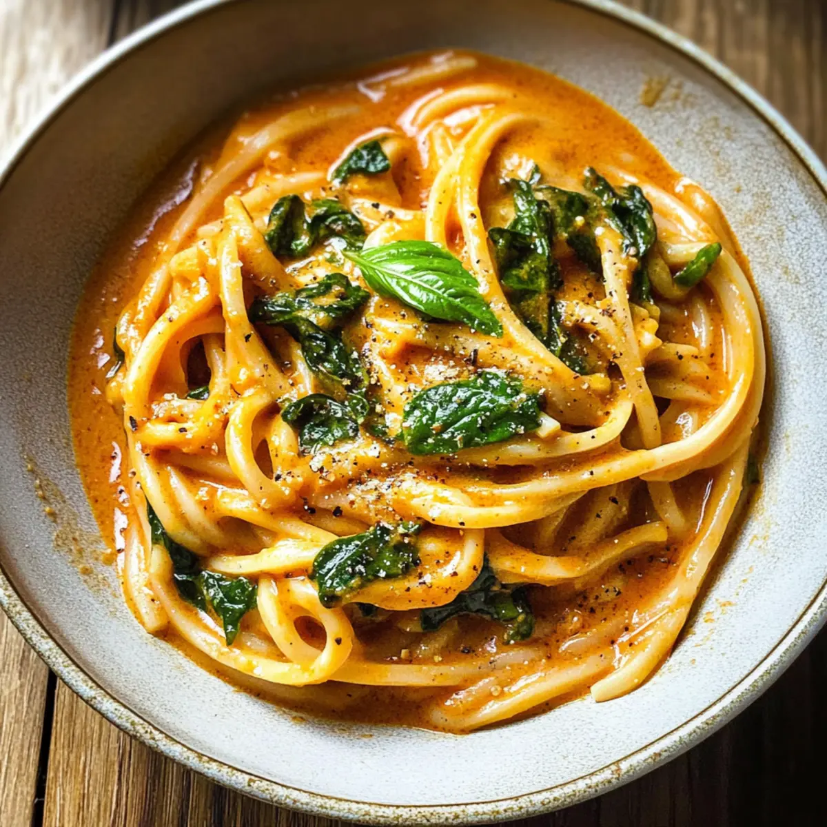 Jetzt die zuvor gekochten Udon-Nudeln in die Pfanne mit der Sauce geben und vorsichtig umrühren, bis die Nudeln gleichmäßig mit der cremigen Thai-Roten Curry-Sauce überzogen sind. Mit frischem Basilikum und schwarzem Pfeffer garnieren, um den Geschmack zu intensivieren. Servieren Sie die Cremigen Thai Rote Curry Udon Nudeln sofort und erfreuen Sie sich an diesem köstlichen Gericht!