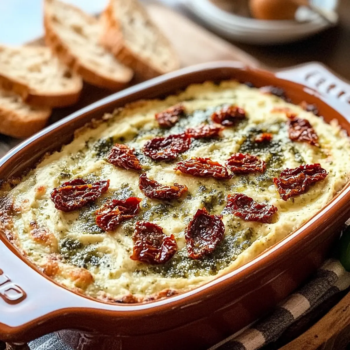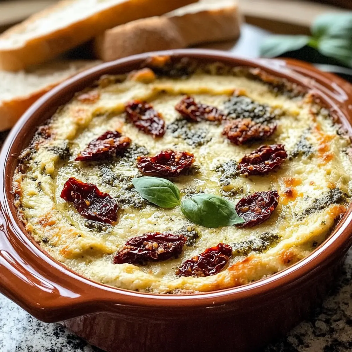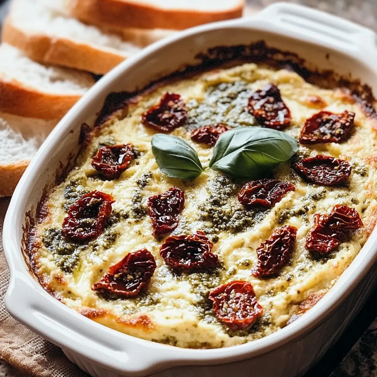 „Hast du schon einmal den betörenden Duft von sonnengetrockneten Tomaten und frischem Basilikumpesto erlebt? Unser Rezept für einen cremigen gebackenen Dip mit getrockneten Tomaten und Pesto wird garantiert deine Sinne betören! Dieser vegetarische Appetizer ist nicht nur einfach zuzubereiten, sondern glänzt auch auf jeder Feier – sei es bei einem entspannten Abend mit Freunden oder bei festlichen Anlässen. In nur 30 Minuten zauberst du eine samtige Mischung, die perfekt zu warmen Baguette-Stücken passt. Stell dir vor, wie du die perfekte Konsistenz des Dips genießt, der selbst die wählerischsten Gaumen begeistert. Neugierig geworden, wie einfach es ist, diesen mediterranen Genuss nach Hause zu bringen? Lass uns gemeinsam in die Zubereitung eintauchen!“ Warum wirst du diesen Dip lieben? Einfachheit, die überzeugt: Mit nur wenigen Zutaten und einfachen Schritten bist du in kürzester Zeit fertig. Herzhafter Geschmack, der begeistert: Die Kombination aus sonnengetrockneten Tomaten und Pesto verleiht deinem Dip ein unverwechselbares Aroma. Vielseitig, ganz nach deinem Geschmack: Ob mit Baguette, Crackern oder Gemüse – dieser Dip passt zu jeder Gelegenheit! Schnell zubereitet: In nur 30 Minuten hast du ein köstliches Gericht, das du auch im Voraus zubereiten kannst. Perfekte Textur, samtig und cremig: Jeder Bissen bringt pure Genussmomente und macht jede Zusammenkunft unvergesslich. Cremiger Dip mit getrockneten Tomaten und Pesto Zutaten Für den Dip: Basilikumpesto – Frisch oder gekauft, bietet es die perfekte Geschmackbasis. Frischkäse – Macht den Dip cremig; achte darauf, dass er weich ist für einfaches Mischen. Getrocknete Tomaten – Süß und würzig, wähle am besten ölhaltige Varianten für besseren Geschmack; tupfe überschüssiges Öl ab. Parmesankäse – Fügt Tiefe und Umami hinzu; frisch gerieben ist für die beste Textur empfohlen. Sauerrahm – Bringt eine angenehme Säure; kann durch griechischen Joghurt ersetzt werden, um es leichter zu machen. Knoblauchzehen – Sorgt für ein aromatisches Flair; frische Zehen sorgen für den besten Geschmack. Getrockneter Basilikum, Oregano, Thymian – Verstärken die Kräuternoten; können durch italienische Kräutermischung ersetzt werden, wenn nötig. Frische Basilikumblätter – Optional zur Garnierung für zusätzliche Frische. Baguette – In Scheiben geschnitten zum Servieren; warmes Baguette verbessert das Dip-Erlebnis. Entdecke die cremige Versuchung dieses cremigen gebackenen Dips mit getrockneten Tomaten und Pesto und lasse dich von seinen mediterranen Aromen verzaubern! Step-by-Step Instructions for Cremiger gebackener Dip mit getrockneten Tomaten und Pesto Step 1: Ofen vorheizen Heize deinen Ofen auf 175 °C (350 °F) vor. Dies ist der perfekte Zeitpunkt, um deine Backform vorzubereiten. Ein kleiner Auflaufform oder eine ofenfeste Schüssel eignet sich hervorragend für diesen cremigen gebackenen Dip mit getrockneten Tomaten und Pesto. Step 2: Pesto und Frischkäse vermengen In einer mittelgroßen Schüssel, mische die Hälfte des weichen Frischkäses mit dem Basilikumpesto. Rühre die Zutaten gut um, bis die Mischung schön cremig ist. Verteile die Pesto-Frischkäse-Mischung gleichmäßig in der vorbereiteten Backform, um die Basis für deinen Dip zu schaffen. Step 3: Restliche Zutaten mischen In einer separaten Schüssel vermenge den verbleibenden Frischkäse, die gehackten getrockneten Tomaten, den geriebenen Parmesan, den Sauerrahm, den fein gehackten Knoblauch und die getrockneten Kräuter. Rühre alles gut um, bis alle Zutaten gleichmäßig miteinander vermischt sind und eine homogene Masse entsteht. Step 4: Tomatenmischung schichten Verteile die Tomatenmischung gleichmäßig über die Pesto-Basis in der Backform. Achte darauf, dass die Schicht gleichmäßig ist, damit der Dip beim Backen schön aufgeht und die Aromen gut durchziehen. Step 5: Backen Schiebe die Backform in den vorgeheizten Ofen und lasse den Dip 22 bis 26 Minuten backen. Halte ein Auge auf das Gebäck; der Dip sollte an den Rändern plötzlich blubbern und eine leicht goldbraune Kruste bilden, was bedeutet, dass er fertig ist. Step 6: Abkühlen und garnieren Nehme den Dip aus dem Ofen und lasse ihn 5 bis 10 Minuten abkühlen. Dies ist wichtig, um die Aromen zu vereinen und um Verbrennungen beim Essen zu vermeiden. Garniere schließlich den cremigen Dip mit frischen Basilikumblättern für ein frisches Finish. Step 7: Servieren Serviere den cremigen gebackenen Dip mit getrockneten Tomaten und Pesto warm zusammen mit frisch geschnittenem Baguette. Die Kombination aus dem samtigen Dip und dem knusprigen Brot wird sicherlich deine Gäste begeistern! Was passt zu cremigem Dip mit getrockneten Tomaten und Pesto? Der perfekte Dip verlangt nach köstlichen Begleitern, die das Geschmackserlebnis abrunden und das Ganze zu einer unvergesslichen Mahlzeit machen. Warme Baguette-Scheiben: Sie bieten eine knusprige Textur, die wunderbar mit der samtigen Cremigkeit des Dips harmoniert. Das warme Brot zieht die köstlichen Aromen des Dips auf und sorgt so für einen wunderbaren Genussmoment. Kräcker: Diese knusprigen Snacks ergänzen den Dip perfekt und bieten einen zusätzlichen crunchigen Genuss. Sie sind leicht zu handhaben und eignen sich hervorragend für gesellige Runden. Frisches Gemüsesortiment: Karotten, Paprika und Gurken bieten einen frischen Kontrast zur Cremigkeit und sind zudem eine gesunde Alternative. Sie bringen Farbe und Vielfalt auf den Tisch und laden zum Dippen ein. Ciabatta-Toasts: Diese italienischen Brote sind für ihre fluffige Konsistenz bekannt und nehmen die Aromen des Dips hervorragend auf. Röstet sie leicht für zusätzlichen Geschmack und knusprige Textur. Weißwein: Ein trockener, frischer Weißwein harmoniert perfekt mit dem mediterranen Flair des Dips und hebt die Aromen der sonnengetrockneten Tomaten hervor. Pita-Chips: Ihr würziger, leicht salziger Geschmack bildet eine schöne Ergänzung zum Dip. Sie si