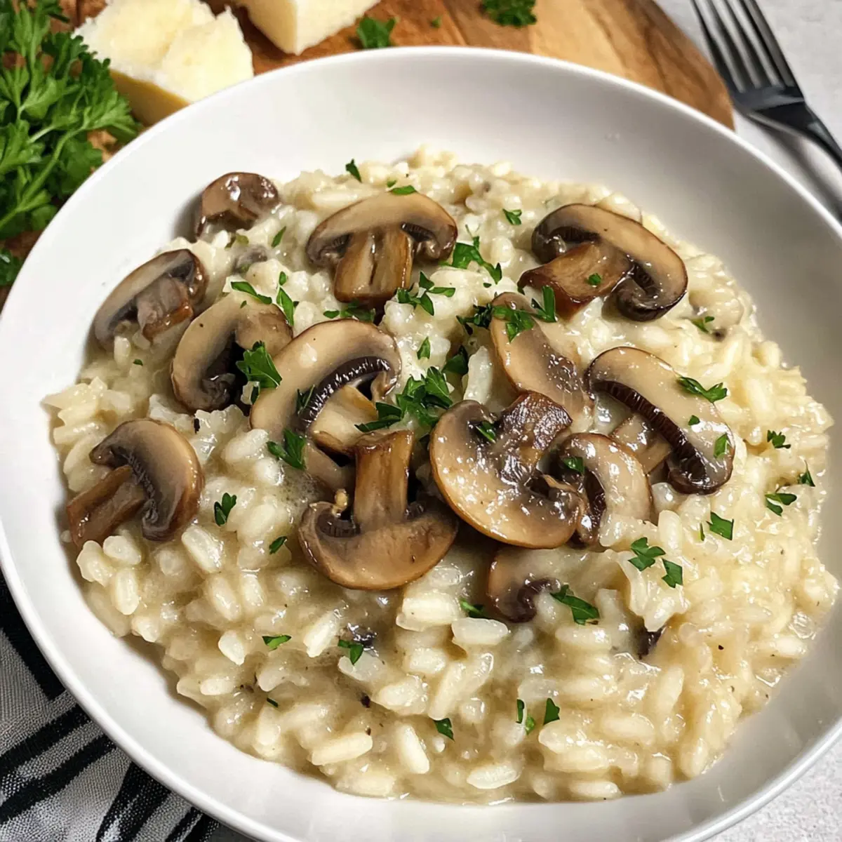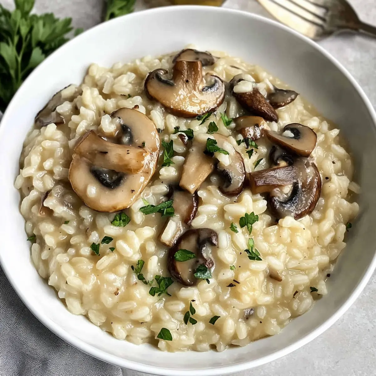 Ein bemerkenswerter Erfolg in der Küche kann oft mit einem einzigen Gericht beginnen – und das ist genau der Fall mit meinem cremigen Pilzrisotto! Diese raffinierte Beilage kombiniert die erdigen Aromen von Pilzen mit der cremigen Textur von perfekt gegartem Arborio-Reis, was sie zu einer echten Gourmet-Option für Ihre nächsten Familienessen oder festlichen Anlässe macht. Was ich an diesem Rezept liebe, ist die erstaunlich einfache Zubereitung: Mit nur wenigen Zutaten kannst du ein Gericht kreieren, das sowohl Einsteiger als auch erfahrene Köche begeistert. Dieses cremige Pilzrisotto ist zudem vegetarisch und bringt den Komfort von Hausmannskost auf ein neues Level – ideal, um die Herzen deiner Gäste oder Familie zu gewinnen. Bist du bereit, deine nächsten Kochabenteuer zu beginnen und ein wenig italienisches Flair in deine Küche zu bringen? Lass uns gleich loslegen! Warum du dieses Rezept lieben wirst Einfachheit, die überzeugt: Die Zubereitung ist unkompliziert und ermöglicht es, köstliches Essen im Handumdrehen zu zaubern. Würzige Aromen: Die Kombination aus erdigen Pilzen und cremigem Reis schafft ein unvergleichliches Geschmackserlebnis, das jeden begeistert. Vielseitigkeit: Egal ob als Beilage zu Knoblauchbrot mit Käse oder als Hauptgericht, dieses Risotto passt perfekt zu verschiedenen Gerichten. Perfektes Comfort Food: Die cremige Textur und die herzhaften Zutaten machen es zu einer Wohlfühlmahlzeit, die Erinnerungen weckt und das Zuhause gemütlich macht. Eindrucksvolles Gericht: Beeindrucke deine Gäste oder die Familie mit dieser Gourmet-Option, die auf den ersten Blick und beim ersten Bissen überzeugt. Jetzt bist du bereit, das Spargelrisotto mit Parmesan oder andere köstliche Gerichte zu entdecken! Cremiges Pilzrisotto Zutaten Für die Basis • Olivenöl – Verleiht Reichtum und hilft beim Anbraten der Pilze; kann auch durch Butter ersetzt werden. • Pilze (340 g, nach Wahl) – Stellt die erdige Geschmacksbasis des Gerichts dar; versuche es mit Cremini oder Shiitake für eine gehobene Variante. • Zwiebel (60 g, gewürfelt) – Bringt Süße und Tiefe; Schalotten sind eine mildere Alternative. • Gesalzene Butter (30 g) – Sorgt für Cremigkeit und Geschmack; ungesalzene Butter kann ebenfalls verwendet werden, wenn du zusätzliches Salz hinzufügst. • Arborio-Reis (200 g) – Die Hauptzutat, die durch Stärke Cremigkeit verleiht; andere Kurzreisarten könnten die gleiche Textur nicht erreichen. Für den Geschmack • Weißwein (120 ml) oder zusätzlicher Brühe – Sorgt für Säure und Tiefe, die das Gesamterlebnis des Gerichts verbessern; für eine alkoholfreie Variante kannst du stattdessen mehr Brühe verwenden. • Hühner- oder Pilzbrühe (720 ml, geteilt) – Bringt Wärme und Geschmack; verwende Gemüsebrühe für eine vegane Option. • Parmesan (40 g, gerieben) – Gibt einen salzigen, cremigen Abschluss; Hefeflocken können eine nicht-milchhaltige Alternative für vegane Diäten sein. Für die Garnitur • Frische Petersilie (gehackt, nach Wunsch) – Fügt Farbe und frischen Geschmack hinzu; kann durch Schnittlauch ersetzt oder ganz weggelassen werden. Dieses cremige Pilzrisotto wird dich sicher begeistern und ist ein echtes Highlight für deine Gäste! Schritt-für-Schritt-Anleitung für Cremiges Pilzrisotto Step 1: Brühe vorbereiten Erwärme die Brühe in der Mikrowelle oder bringe sie in einem kleinen Topf bei niedriger Hitze zum Simmern. Dies sollte etwa 5 Minuten dauern, bis die Brühe warm ist. Achte darauf, dass sie nicht kocht, da dies die Zubereitung des cremigen Pilzrisottos beeinträchtigen könnte. Step 2: Pilze anbraten Erhitze in einer großen Pfanne bei mittlerer bis hoher Hitze 2 Esslöffel Olivenöl. Füge 340 g gewählte Pilze hinzu und brate sie etwa 5 Minuten lang, bis sie weich und leicht gebräunt sind. Die Pilze sollten beginnen, ihre Flüssigkeit abzugeben. Nimm sie anschließend aus der Pfanne und stelle sie beiseite. Step 3: Zwiebeln sautieren In derselben Pfanne schmelze 30 g gesalzene Butter und füge 60 g gewürfelte Zwiebeln hinzu. Sauté die Zwiebeln bei mittlerer Hitze für etwa 3-4 Minuten, bis sie weich und translucent sind. Dies verleiht dem cremigen Pilzrisotto eine süßliche Tiefe. Step 4: Arborio-Reis rösten Füge 200 g Arborio-Reis zur Pfanne hinzu und röste ihn unter häufigem Rühren für etwa 5 Minuten. Der Reis sollte leicht goldbraun werden und leicht zu knistern beginnen. Dies aktiviert die Stärke im Reis, die für die Cremigkeit des Risottos sorgt. Step 5: Weißwein hinzufügen Gieße 120 ml Weißwein in die Pfanne und rühre kräftig, bis die Flüssigkeit fast vollständig verdampft ist. Dies dauert etwa 2-3 Minuten. Der Wein bringt eine frische Säure in das cremige Pilzrisotto, die den Geschmack intensiviert. Step 6: Brühe schrittweise hinzufügen Beginne, die warme Brühe – nimm immer 120 ml auf einmal – nach und nach hinzuzufügen, während du ständig rührst. Warte jeweils, bis die Flüssigkeit fast vollständig absorbiert ist, bevor du mehr hinzufügst. Dieser Prozess sollte insgesamt etwa 20 Minuten in Anspruch nehmen. Step 7: Pilze und Parmesan unterrühren Sobald der Reis al dente und cremig ist, gib die zuvor angebratenen Pilze zurück in die Pfanne. Füge 40 g geriebenen Parmesan hinzu und rühre gut um. Schmecke das cremige Pilzrisotto mit Salz und Pfeffer ab, um die Aromen zu intensivieren. Step 8: Garnieren und servieren Serviere das Risotto heiß und garniere es optional mit gehackter frischer Petersilie für einen schönen Farbtupfer. Das Cremige Pilzrisotto sollte einen schönen Glanz haben und cremig sein, perfekt für ein rustikales Abendessen oder um Gäste zu beeindrucken. Variationen & Alternativen Lass deiner Kreativität freien Lauf und entdecke viele wunderbare Alternativen, um dein Pilzrisotto noch spannender zu gestalten! Vegetarisch: Ersetze den Hühnerbrühe durch Gemüsebrühe für eine vollwertige, vegane Option. Die Aromen bleiben dabei intensiv 