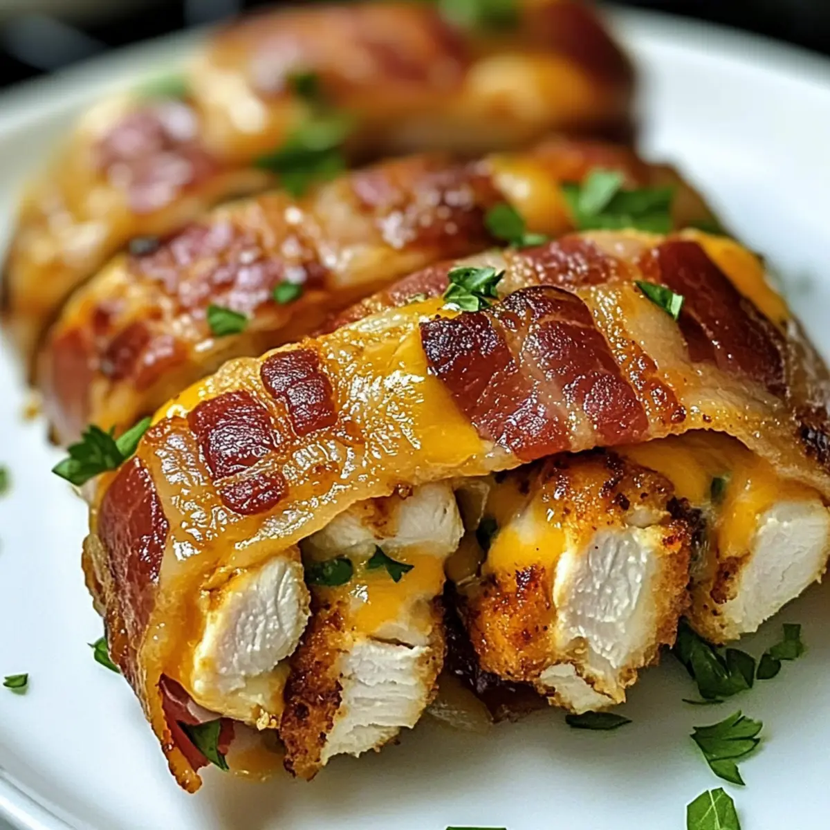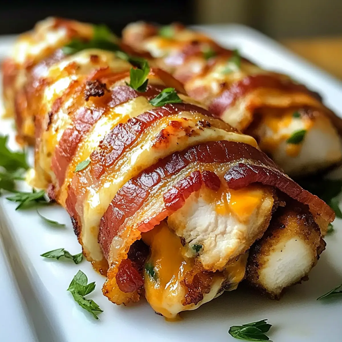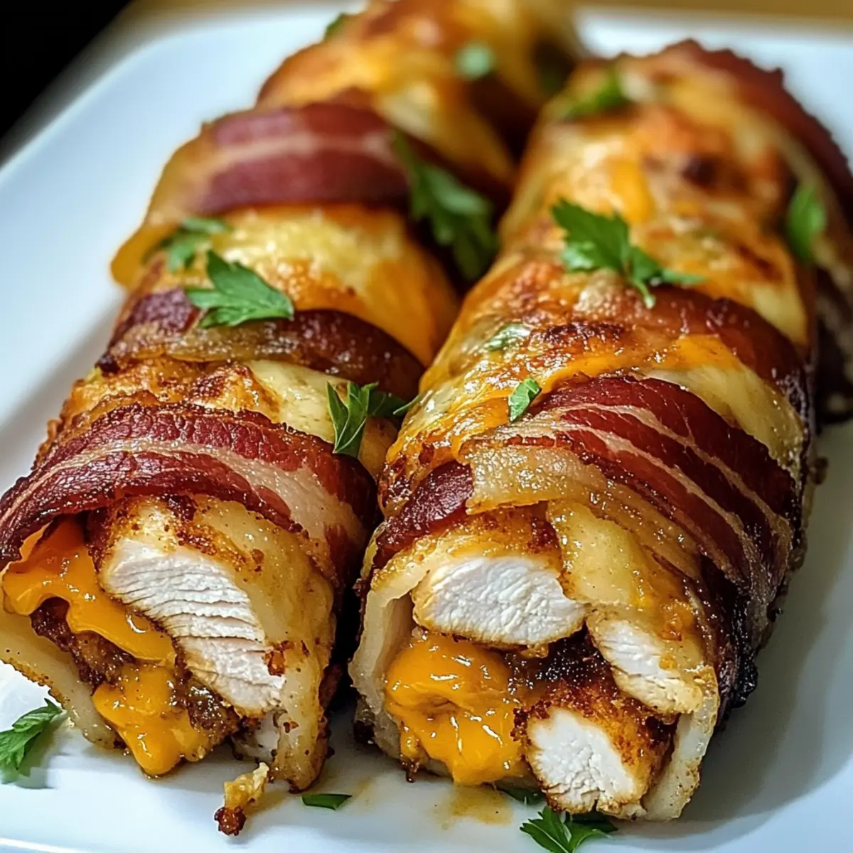 Manchmal braucht das Leben einen kleinen Genussmomente, die uns zum Schmunzeln bringen. Genau das bieten die knusprigen Hähnchen-Bacon-Wraps! Diese einfache Rezeptur verwandelt saftiges Hähnchen und knusprigen Bacon in einen schmackhaften Leckerbissen, der sich perfekt für ein schnelles Abendessen oder als beeindruckende Vorspeise eignet. Der Reiz dieser Wraps liegt nicht nur in ihrem unwiderstehlichen Geschmack, sondern auch in ihrer Vielseitigkeit – ob beim Familienessen oder beim gemütlichen Abend mit Freunden, sie werden sicher für Begeisterung sorgen. Mit nur wenigen Zutaten zubereitet und ohne großen Aufwand gelingt dir ein Gericht, das alle lieben werden. Bist du bereit, deine Geschmacksknospen auf eine kleine Reise zu schicken? Warum wirst du dieses Rezept lieben? Einfachheit: Die Zubereitung der knusprigen Hähnchen-Bacon-Wraps ist kinderleicht und benötigt nur wenige Zutaten, sodass du keine Kochprofi sein musst. Vielseitigkeit: Du kannst kreative Variationen ausprobieren, indem du verschiedene Käsesorten oder sogar Gemüse hinzufügst, was sie für jeden Geschmack anpassbar macht. Geschmacksexplosion: Der Kontrast zwischen dem saftigen Hähnchen und dem knusprigen Bacon sorgt für eine unwiderstehliche Geschmackskombination, die immer Eindruck macht. Zeitersparnis: In weniger als einer Stunde hast du ein köstliches Gericht gezaubert, perfekt für stressige Wochentage oder überraschende Gäste. Große Beliebtheit: Diese Wraps sind bei jeder Gelegenheit ein Hit, sei es zu Hause oder bei Feiern. Serviere sie mit einem dip wie Ranch-Dressing, um die Aromen noch zu verstärken! Zutaten für den Knusprigen Hähnchen-Bacon-Wrap • Für das Hähnchen Hähnchenbrust ohne Haut – Die Hauptproteinquelle, nutze Hähnchenschenkel für mehr Geschmack. • Für die Wraps Bacon – Fügt eine knusprige Textur und salzige Note hinzu. Verwende Truthahn-Bacon für eine schlankere Variante. Geriebener Cheddar – Gibt Cremigkeit und geschmackliche Tiefe. Ersetze ihn durch Mozzarella oder Pepper Jack für Variationen. Frischkäse – Sorgt für eine reichhaltige, glatte Füllung. Du kannst fettarmen Frischkäse für eine leichtere Option verwenden. • Für die Gewürze Knoblauchpulver – Fügt aromatischen Geschmack hinzu. Frischer Knoblauch kann für einen intensiveren Geschmack ersetzt werden. Zwiebelpulver – Verbessert den Gesamtschmack. Frische Zwiebel kann gewürfelt und verwendet werden. Räucherpaprika – Verleiht eine rauchige Geschmacksdimension. Normale Paprika kann als Ersatz verwendet werden. Salz und Pfeffer – Essentielle Gewürze für den Geschmack, nach persönlichem Geschmack anpassen. • Für die Zubereitung Olivenöl – Zum Anbraten des Bacons verwendet. Gemüse- oder Rapsöl kann ebenfalls verwendet werden. Frische Petersilie – Optionale Garnitur für zusätzlichen Geschmack und ansprechende Präsentation. Entdecke die köstlichen Möglichkeiten der knusprigen Hähnchen-Bacon-Wraps und genieße ein Gericht, das sich perfekt für jede Gelegenheit eignet! Schritt-für-Schritt-Anleitung für den Knusprigen Hähnchen-Bacon-Wrap Step 1: Ofen vorheizen Heize den Ofen auf 200 °C vor, um die perfekte Temperatur für das Garen der knusprigen Hähnchen-Bacon-Wraps zu erreichen. Dies sorgt dafür, dass das Hähnchen gleichmäßig gart und der Bacon knusprig wird. Bereite ein Backblech vor, indem du es mit Backpapier auslegst oder leicht einfettest. Step 2: Hähnchen vorbereiten Klopfe die Hähnchenbrust senkrecht auf eine Dicke von etwa 1,25 cm, um eine gleichmäßige Garung zu gewährleisten. Dies verbessert die zarte Konsistenz und sorgt dafür, dass das Hähnchen schnell gart. Achte darauf, gleichmäßigen Druck auszuüben, um die Form des Fleisches nicht zu zerstören. Step 3: Gewürze mischen Vermische in einer kleinen Schüssel das Knoblauchpulver, Zwiebelpulver, geräuchertes Paprikapulver, Salz und Pfeffer. Diese Mischung wird das Hähnchen reichlich würzen und den Geschmack intensivieren. Streue die Gewürzmischung gleichmäßig auf beide Seiten des Hähnchens und massiere sie sanft ein, damit der Geschmack gut einziehen kann. Step 4: Füllung zubereiten Vermenge den Frischkäse und den geriebenen Cheddar in einer Schüssel, bis die Mischung glatt und cremig ist. Diese Füllung verleiht den Wraps eine köstliche Cremigkeit. Verteile die Mischung gleichmäßig auf einer Seite jeder Hähnchenbrust, sodass sie vollständig bedeckt ist und beim Wickeln nicht herausfällt. Step 5: Hähnchen und Bacon kombinieren Wickle jede Hähnchenbrust vorsichtig mit zwei Scheiben Bacon, wobei die krosse Textur des Bacons die Füllung sicher umschließt. Achte darauf, dass die Enden des Bacons sicher in der Nähe der Füllung liegen. Wenn nötig, kannst du die Wraps mit Zahnstochern fixieren, damit sie beim Braten nicht auseinanderfallen. Step 6: Anbraten Erhitze etwas Olivenöl in einer ofenfesten Pfanne bei mittlerer Hitze. Sobald das Öl heiß ist, lege die Hähnchen-Bacon-Wraps mit der Nahtseite nach unten in die Pfanne. Lasse sie für 3 bis 4 Minuten braten, bis sie goldbraun und knusprig sind. Überwache die Wraps, um sicherzustellen, dass der Bacon nicht verbrennt. Step 7: In den Ofen transferieren Wenn die Wraps goldbraun sind, transferiere die Pfanne vorsichtig in den vorgeheizten Ofen. Backe die Wraps für 20 bis 25 Minuten weiter, bis das Hähnchen vollständig durchgegart ist und eine Innentemperatur von 74 °C erreicht hat. Die äußere Schicht sollte eine herrlich knusprige Farbe haben. Step 8: Ruhen lassen und servieren Nehme die Wraps aus dem Ofen und lasse sie etwa 5 Minuten ruhen. Diese Ruhezeit ermöglicht es dem Saft, sich im Hähnchen zu verteilen und macht das Fleisch zarter. Entferne eventuelle Zahnstochern und schneide die Wraps in Scheiben, bevor du sie servierst. Lagerungstipps für den Knusprigen Hähnchen-Bacon-Wrap Kühlschrank: Bewahre die übrig gebliebenen Wraps in einem luftdichten Behälter auf und genieße sie innerhalb von bis zu 3 Tagen