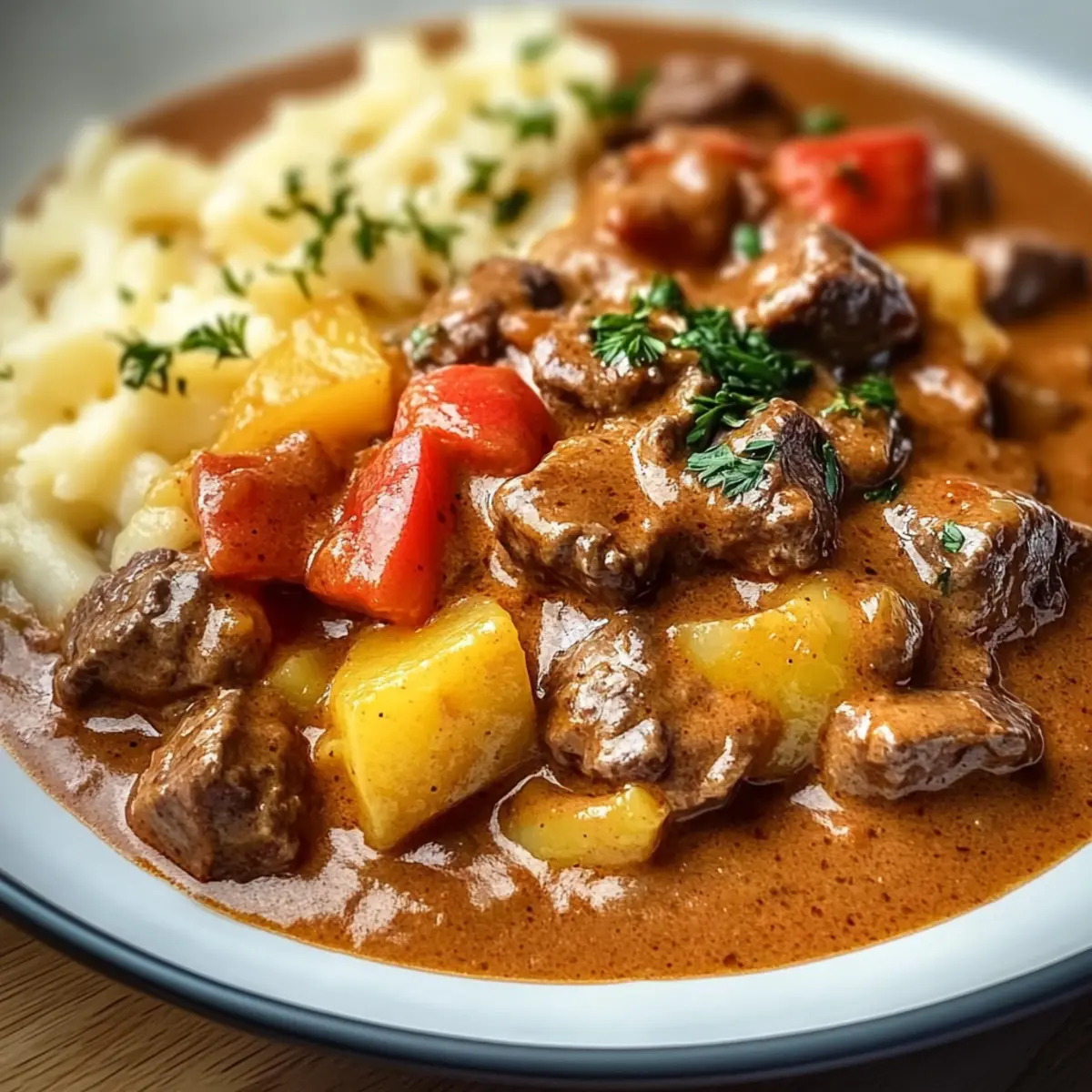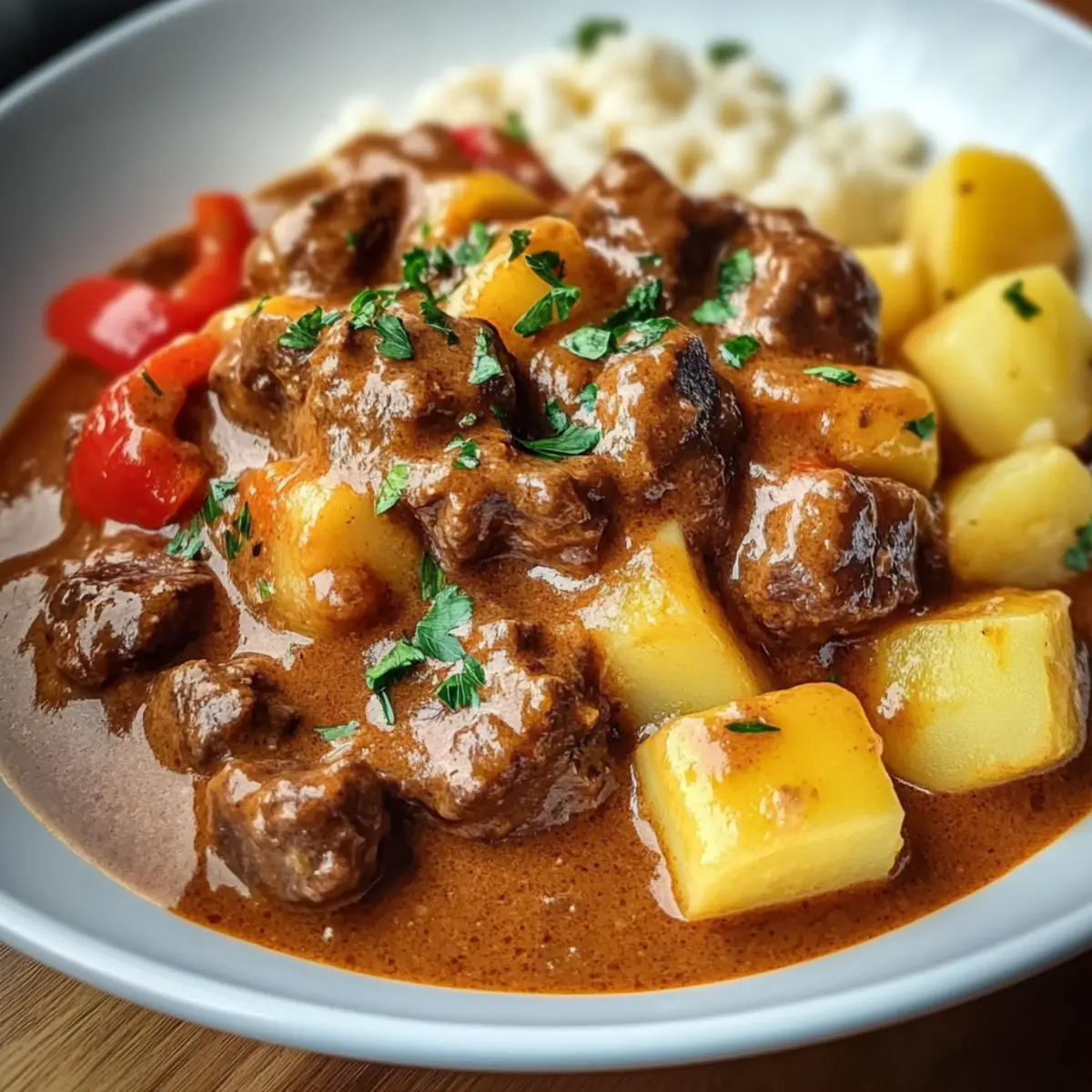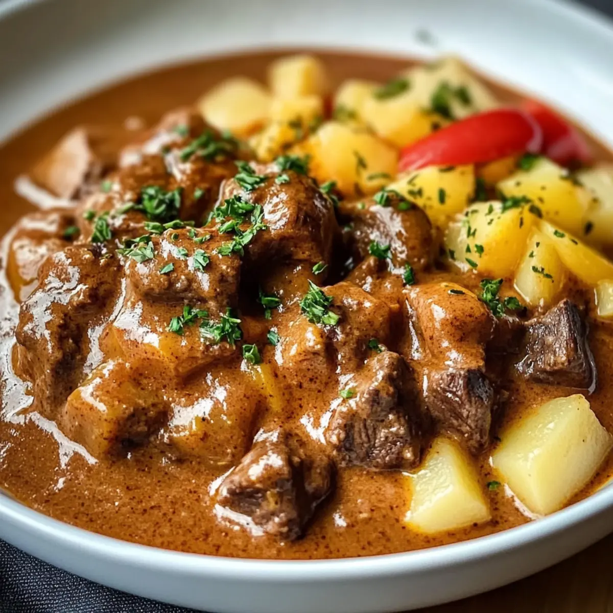 Die Küche duftet verführerisch nach frisch gebratenem Fleisch und Gewürzen, die uns an unsere Kindheit erinnern. Wenn ich an deutsches Gulasch denke, sehe ich sofort lächelnde Gesichter bei Familienessen und die Wärme eines gemütlichen Abends im Kreise der Liebsten. Dieses Rezept für Creamy German Goulash zaubert nicht nur herzhaftes Komfortessen, sondern überzeugt auch durch seine einfache Zubereitung – perfekt für alle, die die Hektik des Alltags hinter sich lassen möchten. Die Kombination aus zartem Rindfleisch, cremiger Paprikasauce und kräftigen Kartoffeln macht es zu einem wahren Genuss, den jeder lieben wird. Bereit, deine Küche in ein kleines Paradies für Feinschmecker zu verwandeln? Lass uns gleich loslegen! Warum wirst du dieses Gulasch lieben? Einfachheit: Die Zubereitung dieses deutschen Gulaschs ist unkompliziert und erfordert nur minimale Kochkenntnisse. Herzhafter Genuss: Zarte Rinderstücke und eine cremige, würzige Paprikasauce sorgen für einen vollen Geschmack, der die Seele wärmt. Vielseitig: Du kannst das Rezept ganz nach deinem Geschmack anpassen – vielleicht mit einem Schuss Rotwein oder zusätzlichen Gemüsesorten! Perfekte Konsistenz: Die Kombination aus saftigen Kartoffeln und der cremigen Sauce macht jeden Bissen zu einem Erlebnis. Familienliebling: Dieses Gericht bringt garantiert alle am Tisch zum Lächeln! Wenn du schon einmal ein einfaches, zartes Gulasch genießen wolltest, dann ist dieses Rezept genau das Richtige für dich. Deutsches Gulasch Zutaten • Diese Zutaten sind der Schlüssel zu deinem herzhaften Genuss! Für das Gulasch Rindfleisch (Schulter) – Primäre Proteinquelle; Brisket oder Rinderhose sind ebenfalls gute Alternativen. Zwiebeln – Fügen Süße und Tiefe hinzu; gelbe oder weiße Zwiebeln sind ideal. Olivenöl – Erforderlich zum Anbraten des Fleisches und für das Sautieren der Gemüse. Süßes Paprikapulver – Gibt Geschmack und Farbe; ersetze es durch normales Paprikapulver, wenn nötig. Räucherpaprika – Verleiht dem Gulasch einen rauchigen Geschmack, ist aber optional. Kümmelsamen – Fügt einen erdigen Geschmack hinzu; kann weggelassen werden, wenn nicht gewünscht. Majoran – Kräuter, die den Gesamtgeschmack unterstützen; Oregano ist eine mögliche Alternative. Cayennepfeffer – Für die Schärfe; je nach Vorliebe anpassen oder ganz weglassen. Knoblauch – Verleiht eine herzhafte Tiefe; frischer Knoblauch ist vorzuziehen. Tomatenmark – Verdickt die Sauce und gibt Reichtum. Rinderbrühe – Basis für die Sauce; Gemüsebrühe kann für eine leichtere Variante verwendet werden. Trockenrotwein – Verbessert die Aromen; kann weggelassen werden, wenn du es alkoholfrei magst. Gewürfelte Tomaten – Fügen Feuchtigkeit und Frische hinzu; Dosentomaten sind praktisch. Rote und gelbe Paprika – Geben Süße und Farbe; können durch grüne Paprika ersetzt werden. Kartoffeln – Sorgen für die Herzhaftigkeit; Yukon Gold oder mehlige Kartoffeln sind ideale Optionen. Saure Sahne – Für die Cremigkeit; kann durch Crème fraîche oder griechischen Joghurt ersetzt werden. Allzweckmehl – Verdickt die Sauce; für eine glutenfreie Option weglassen. Salz und schwarzer Pfeffer – Nach Geschmack hinzufügen. Frische Petersilie – Zum Garnieren; kann durch Schnittlauch ersetzt oder weggelassen werden. Nudeln oder Spätzle – Optionale Servierempfehlung; jede Pasta kann verwendet oder ohne serviert werden. Mit diesen Zutaten wird dein deutsches Gulasch nicht nur köstlich, sondern auch zum Highlight des Abends! Step-by-Step Instructions für Deutsches Gulasch Step 1: Rindfleisch vorbereiten Das Rindfleisch gründlich abtrocknen und mit Salz und Pfeffer würzen. In einem großen Topf etwas Olivenöl erhitzen, bis es schimmert. Die Rindfleischstücke in mehreren Chargen jeweils 3–4 Minuten von allen Seiten anbraten, bis sie goldbraun sind. Dann das Fleisch aus dem Topf nehmen und beiseitelegen. Step 2: Zwiebeln anbraten In demselben Topf die gehackten Zwiebeln hinzufügen und etwa 5–7 Minuten braten, bis sie weich und durchscheinend sind. Die Zwiebeln sollten goldbraun werden, was ihnen eine süße Note verleiht. Dadurch wird die Basis für das köstliche, cremige Gulasch gelegt. Step 3: Gewürze hinzufügen Jetzt den fein gehackten Knoblauch sowie die Gewürze wie süßes und geräuchertes Paprikapulver, Kümmelsamen und Majoran zu den Zwiebeln geben. Alles gut vermengen und für etwa 1 Minute weiterbraten, bis die Aromen sich entfalten und der Knoblauch duftet. Dies gibt unserem deutschem Gulasch die richtige würzige Note. Step 4: Tomatenmark einrühren Füge das Tomatenmark hinzu und koche es für eine weitere Minute mit, damit sich die Aromen intensivieren. Diese Zutat wird die Basis der Sauce verdicken und eine schöne Tiefe in die Geschmacksrichtung bringen. Rühre alles gut um, bis es gleichmäßig verteilt ist. Step 5: Brühe und Wein hinzufügen Gieße nun die Rinderbrühe und optional den trockenen Rotwein in den Topf. Verwende einen Holzlöffel, um alles gut zu vermengen und die braunen Reste vom Topfboden zu kratzen. Diese geschmacklichen Elemente sorgen dafür, dass unser deutsches Gulasch besonders reichhaltig wird. Step 6: Fleisch und Gemüse zurückgeben Das angebratene Rindfleisch zurück in den Topf geben und die gewürfelten Tomaten sowie die geschnittenen Paprika hinzufügen. Alles gut vermischen, sodass das Fleisch und das Gemüse gleichmäßig verteilt sind. Dies sorgt für einen harmonischen Geschmack in jeder Gabel. Step 7: Langsam köcheln lassen Die Mischung zum Köcheln bringen, dann die Hitze reduzieren und den Topf abdecken. Das Gulasch 2–3 Stunden sanft köcheln lassen, bis das Rindfleisch zart ist. Gelegentlich umrühren, um sicherzustellen, dass nichts am Boden anbrennt. Die lange Kochzeit sorgt für ein intensiv wohlschmeckendes Ergebnis. Step 8: Kartoffeln hinzufügen Nach 2 Stunden die in Würfel geschnittenen Kartoffeln hinzufügen und weitere 30–45 Minuten köcheln l