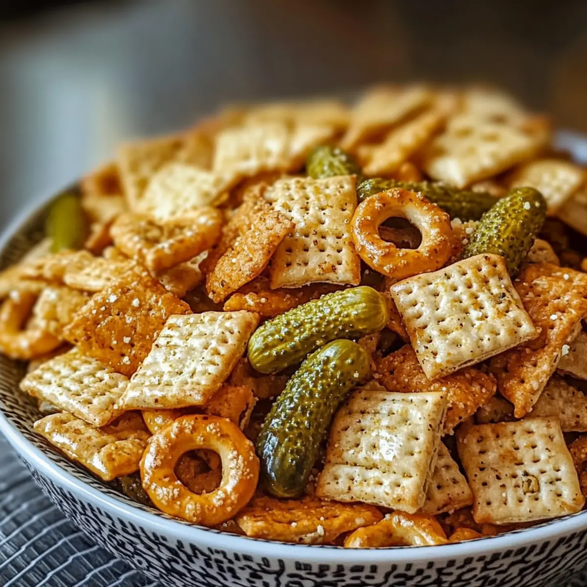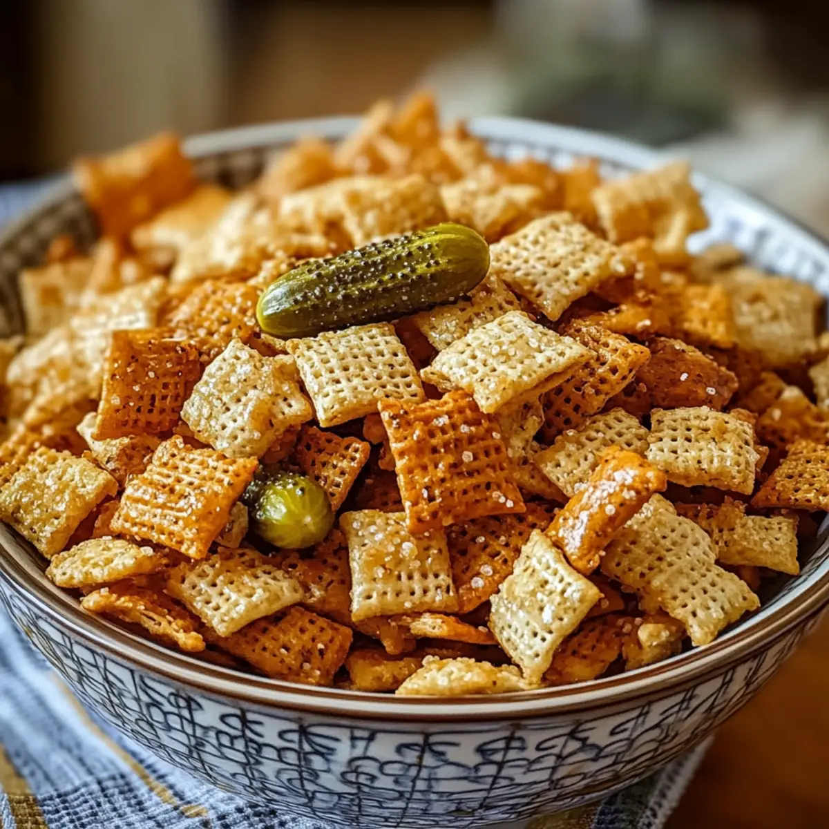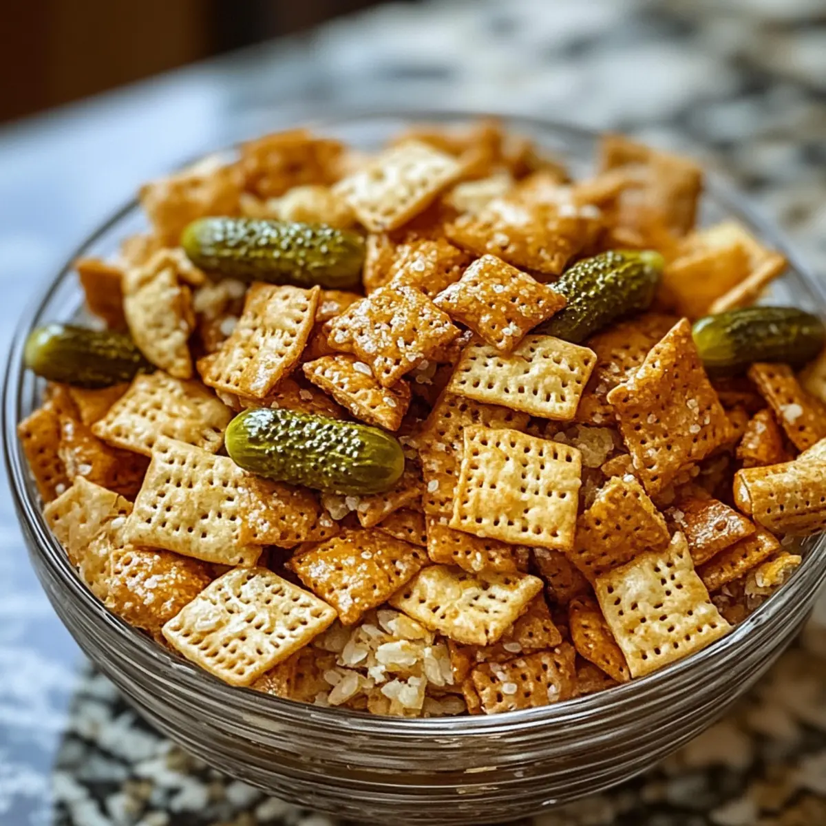 Eines Nachmittags, während ich in meiner Küche mit verschiedenen Snacks experimentierte, hatte ich die geniale Idee, einmal etwas ganz Neues auszuprobieren: Dillgurken Chex Mix! Diese schnelle und einfache Mischung hat sich als ein perfekter Snack für meine Movie Nights herausgestellt. Mit ihrem würzigen und knackigen Geschmack ist sie nicht nur budgetfreundlich, sondern bietet auch jede Menge Anpassungsmöglichkeiten, um sicherzustellen, dass jeder Geschmack bedient wird. Ob für gesellige Treffen oder einfach nur zum Knabbern zwischendurch – dieser Dillgurken Chex Mix wird garantiert zum Hit. Neugierig, wie einfach es ist, diesen köstlichen Snack zuzubereiten? Lass uns loslegen! Warum wirst du diesen Snack lieben? Einzigartige Kombination: Der Dillgurken Chex Mix verbindet die besten Texturen mit einem unverwechselbaren würzigen Geschmack, der deine Geschmacksknospen zum Tanzen bringt. Schnell zuzubereiten: In weniger als einer Stunde hast du eine köstliche Mischung, die perfekt für jede Gelegenheit ist. Anpassungsfähig: Mit optionalen Zutaten kannst du deinen Mix nach Belieben personalisieren – füge Nüsse oder andere Snacks hinzu, um ihn noch interessanter zu machen. Budgetfreundlich: Ideal für alle, die leckere Snacks ohne viel Geld zubereiten möchten. Für alle Gelegenheiten: Ob zum Filmeabend oder einfach als kleiner Hungerzwischendurch, dieser Snack kommt bei jedem gut an! Entdecke auch andere kreative Snacks und Gerichte. Dillgurken Chex Mix Zutaten • Du brauchst diese Zutaten, um deinen eigenen Dillgurken Chex Mix zu kreieren! Für die Mischung Chex Cerealien (Reis und Mais) – verleihen den perfekten Crunch und Textur; eine Mischung sorgt für Abwechslung. Pretzel-Windungen – fügen eine salzige und knusprige Dimension hinzu. Bagel Chips – bieten einen herzhaften Biss für zusätzliche Textur. Für die Würzung Butter – dient als Bindemittel für alle Zutaten und bringt Reichtum und Geschmack. Dillgurken-Gewürz – das Hauptgewürz, das den charakteristischen, würzigen Geschmack von Dillgurken bringt. Knoblauchpulver – verstärkt die herzhaften Noten und fügt Tiefe hinzu. Zwiebelpulver – ergänzt den Knoblauch und hebt den Gesamtgeschmack. Dillkraut – sorgt für Frische im Geschmack und ist entscheidend für das authentische Gurkengefühl. Salz – notwendig, um die Aromen auszubalancieren; kann nach Geschmack angepasst werden. Diese Zutaten machen deinen Dillgurken Chex Mix zu einem unwiderstehlichen Snack! Schritt-für-Schritt-Anleitung für Dillgurken Chex Mix Step 1: Ofen vorheizen Heize den Ofen auf 120°C (250°F) vor, um eine langsame und gleichmäßige Backtemperatur zu gewährleisten. Dies sorgt dafür, dass dein Dillgurken Chex Mix knusprig wird und die Aromen gut miteinander verschmelzen. Ein vorgeheizter Ofen ist entscheidend für die perfekte Textur deines Snacks! Step 2: Trockenmischung vorbereiten Vermenge in einer großen Schüssel die Reis- und Mais-Chex-Cerealien, die Pretzel-Windungen und die Bagel Chips. Achte darauf, dass alles gleichmäßig verteilt ist, wobei du die Mischung sorgfältig durchmischst, damit jede Zutat das gute Crunch-Gefühl beisteuert. Diese Basis sorgt für die köstlichen Texturen in deinem Dillgurken Chex Mix. Step 3: Butter und Gewürze vermengen Schmelze die Butter in einer separaten Schüssel in der Mikrowelle oder auf dem Herd, bis sie vollständig geschmolzen ist. Füge nun das Dillgurken-Gewürz, Knoblauchpulver, Zwiebelpulver, Dillkraut und Salz hinzu und verrühre alles gründlich, bis eine glatte, würzige Mischung entsteht. Diese aromatische Butter wird dem Snack seinen tollen Geschmack verleihen. Step 4: Butter über die Mischung gießen Gieße die geschmolzene Butter über die trockene Mischung in der großen Schüssel. Verwende einen großen Spatel oder deine Hände, um alles vorsichtig zu vermengen. Stelle sicher, dass jede Zutat gleichmäßig mit der würzigen Butter überzogen ist. Dies ist der Schlüssel zu einem schmackhaften Dillgurken Chex Mix. Step 5: Mischung auf ein Backblech verteilen Verteile die Mischung gleichmäßig auf einem großen Backblech in einer einzigen Schicht. Achte darauf, dass die Zutaten nicht übereinander liegen, da dies ein gleichmäßiges Backen fördert. Wenn du das Blech voll machst, garantiere ich dir eine optimale Knusprigkeit für den perfekten Snack. Step 6: Backen Backe die Mischung im Ofen für 45 Minuten. Rühre alle 15 Minuten um, damit die Zutaten gleichmäßig geröstet werden und nicht verbrennen. Beobachte den Snacks während des Backens, bis sie schön goldbraun und duftend sind. So entsteht der ideale Dillgurken Chex Mix für deinen nächsten Filmabend. Step 7: Abkühlen lassen Lass die Mischung vollständig abkühlen, bevor du sie in einen luftdichten Behälter umfüllst. Dies ist wichtig, um die Knusprigkeit zu bewahren. Nachdem dein Dillgurken Chex Mix abgekühlt ist, kannst du ihn für bis zu zwei Wochen aufbewahren und immer wieder genießen! Vorbereitung für deinen Dillgurken Chex Mix Der Dillgurken Chex Mix ist ideal für die Vorbereitung im Voraus und spart dir wertvolle Zeit an hektischen Tagen! Du kannst die trockenen Zutaten – Reis- und Mais-Chex, Pretzel-Windungen und Bagel Chips – bis zu 3 Tage im Voraus in einem luftdichten Behälter lagern, wodurch sie frisch bleiben. Die aromatische Butter-Mischung kann ebenfalls bis zu 24 Stunden im Voraus zubereitet und im Kühlschrank aufbewahrt werden; es verhindert, dass die Aromen verblassen. Wenn du bereit bist, deinen Snack zu genießen, mische die Butter einfach mit der trockenen Mischung, verteile sie auf einem Blech und backe sie, bis sie goldbraun ist. So hast du jederzeit einen leckeren, knusprigen Snack zur Hand! Tipps für den besten Dillgurken Chex Mix Optimale Textur: Verwende eine Mischung aus Reis- und Mais-Chex, um den besten Crunch zu erzielen. Eine einheitliche Mischung sorgt für ein unvergessliches Geschmackserlebnis. Luftdicht aufbewahren: Bewahre den Dillgurken 