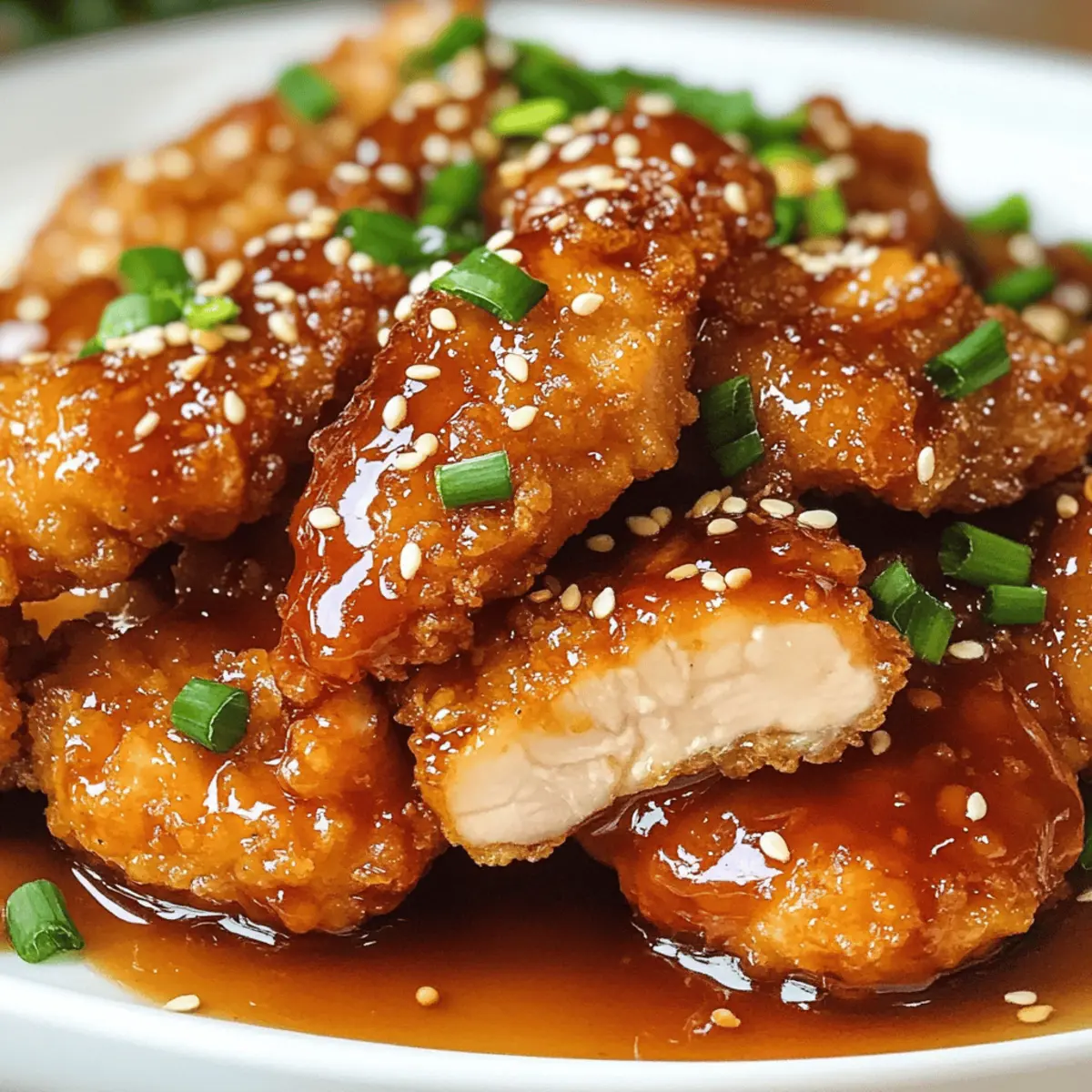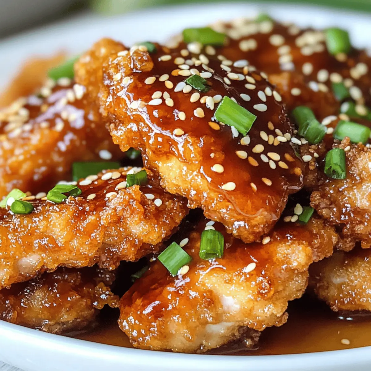 Wenn der Geruch von frisch gebratenem Hühnchen durch die Küche zieht, bin ich sofort in einer anderen Welt. Das Doppelt Knusprige Honig Knoblauch Hühnchen ist für mich das perfekte Gericht, um den hektischen Alltag hinter mir zu lassen und meine Liebsten zu verwöhnen. Die knusprige Panade, kombiniert mit einer süß-salzigen Knoblauchsoße, sorgt für ein Geschmackserlebnis, das sowohl bei alltäglichen Abendessen als auch bei feierlichen Anlässen glänzt. Einleuchtend und unkompliziert zuzubereiten, bringt dieses Rezept die gewohnte Gemütlichkeit auf den Tisch – ideal also für alle, die die Schnellküche hinter sich lassen wollen und auf der Suche nach einem echten Hingucker sind. Seid ihr bereit, mit mir zusammen in die Welt des Doppelt Knusprigen Honig Knoblauch Hühnchens einzutauchen? Was macht dieses Rezept so besonders? Unvergleichlicher Geschmack: Die Kombination aus süßem Honig und herzhaftem Knoblauch verleiht diesem Gericht eine einzigartige Geschmacksnote, die jeden Bissen zum Erlebnis macht. Doppelte Knusprigkeit: Dank der speziellen Panade wird das Hühnchen besonders knusprig, was perfekt zum saftigen Fleisch passt. Einfache Zubereitung: Mit nur wenigen Schritten und Zutaten zauberst du dieses Gericht schnell und unkompliziert – ideal für stressige Wochentage! Besonderer Hingucker: Ob bei einem gemütlichen Abendessen oder einer Feier, dieses Hühnchen wird deine Gäste begeistern und das Gespräch auf sich ziehen. Vielseitige Beilagen: Kombiniere es mit Dampfreis oder geröstetem Gemüse für eine ausgewogene Mahlzeit – so wird jede Portion zu einem Fest! Aufbewahrungstipp: Die Reste können bis zu drei Tage im Kühlschrank aufbewahrt werden, ohne an Knusprigkeit zu verlieren. Doppelt Knuspriges Honig Knoblauch Hühnchen Zutaten Für die Marinade • Hähnchenbrust/-schenkel – Verwende die Schenkel für saftigeres Fleisch. • Buttermilch (1 Tasse) – Zartet das Hühnchen und verleiht zusätzlichen Geschmack; kann durch ein Joghurt-Wasser-Gemisch ersetzt werden. Für die Panade • Allzweckmehl (1½ Tassen) – Sorgt für die knusprige Hülle; keine direkten Alternativen empfohlen. • Speisestärke (½ Tasse) – Verbessert die Knusprigkeit der Panade; kann durch Reis- oder Kartoffelmehl ersetzt werden. • Salz (1 TL) – Verstärkt den Geschmack; nach Geschmack anpassen. • Schwarzer Pfeffer (1 TL) – Bringt Wärme; frisch gemahlen ist empfehlenswert. • Paprika (1 TL) – Fügt eine milde Schärfe und Farbe hinzu; geräucherte Paprika sorgt für zusätzlichen Geschmack. • Knoblauchpulver (1 TL) – Intensiviert den Geschmack; frischer Knoblauch kann ebenso verwendet werden. • Zwiebelpulver (1 TL) – Fügt herzhafte Noten hinzu; bei Empfindlichkeit gegenüber Allium weglassen. • Cayennepfeffer (½ TL) – Für das gewisse Etwas an Schärfe; nach persönlicher Vorliebe anpassen. Für das Frittieren • Pflanzenöl zum Frittieren – Notwendig für das Frittieren; alternative Öle wie Canola oder Erdnussöl funktionieren ebenfalls gut. • Olivenöl (2 EL) – Für die Zubereitung der Sauce; neutrales Öl kann ebenfalls verwendet werden. Für die Honig-Knoblauch-Sauce • Knoblauch (6 Zehen, gehackt) – Frischer Geschmacksträger der Sauce. • Honig (1 Tasse) – Hauptsüßstoff der Sauce; Ahornsirup als interessante Alternative möglich. • Sojasauce (¼ Tasse) – Liefert Tiefe und Umami; alternativ kann auch eine natriumarme Sojasauce genutzt werden. • Schwarzer Pfeffer (1 TL) – Würzmittel für die Sauce. Das Doppelt Knusprige Honig Knoblauch Hühnchen wird all deine Sinne ansprechen und wird schnell zum Favoriten bei dir und deinen Liebsten! Schritt-für-Schritt-Anleitung für Doppelt Knuspriges Honig Knoblauch Hühnchen Step 1: Hähnchen marinieren Schneide die Hähnchenbrust oder -schenkel in der Mitte durch und lege sie in eine Schüssel mit Buttermilch. Stelle sicher, dass das Fleisch gut bedeckt ist, und mariniere es für mindestens 1 Stunde im Kühlschrank, am besten über Nacht. Diese Marinade wird das Doppelt Knusprige Honig Knoblauch Hühnchen zarter und geschmackvoller machen. Step 2: Panade vorbereiten In einer großen Schüssel vermische das Allzweckmehl, die Speisestärke, Salz, schwarzen Pfeffer, Paprika, Knoblauchpulver, Zwiebelpulver und Cayennepfeffer gut miteinander. Diese trockenen Zutaten sorgen für die knusprige Hülle des Hühnchens, also nimm dir die Zeit, alles gründlich zu kombinieren, bevor du mit dem nächsten Schritt fortfährst. Step 3: Hähnchen panieren Nimm das mariniertes Hähnchen aus der Buttermilch und lasse das überschüssige Wasser abtropfen. Wälze die Stücke dann in der Mehlmischung, presse die Panade gut an, damit sie haften bleibt. Lege die panierten Hähnchenstücke auf einen Teller und wiederhole diesen Vorgang, bis alle Hähnchenstücke gut bedeckt sind. Step 4: Öl erhitzen Erhitze in einem tiefen Topf oder einer Fritteuse ausreichend Pflanzenöl, so dass die Temperatur bei 175 °C (350 °F) liegt. Teste die Temperatur mit einem Küchenthermometer oder indem du einen Holzlöffel hineinsteckst; es sollten Blasen aufsteigen, wenn das Öl heiß genug ist. Step 5: Hähnchen frittieren Lass das Hühnchen in das heiße Öl gleiten und frittier es in Chargen, um eine Überfüllung zu vermeiden. Brate die Stücke für 7–9 Minuten oder bis sie goldbraun und durchgegart sind. Nutze ein Küchenthermometer, um sicherzustellen, dass die Innentemperatur 75 °C (165 °F) erreicht. Lass die fertigen Stücke auf einem Kühlgitter abtropfen. Step 6: Sauce zubereiten Erhitze in einem kleinen Topf bei mittlerer Hitze das Olivenöl und füge den gehackten Knoblauch hinzu. Brate den Knoblauch an, bis er aromatisch ist, aber nicht bräunt. Gieße dann den Honig und die Sojasauce dazu, füge schwarzen Pfeffer hinzu und lass die Mischung für etwa 3-5 Minuten köcheln, bis sie etwas eindickt. Step 7: Hähnchen glasieren Nimm das frisch frittierte Hähnchen und tauche es in die heiße Honig-Knoblauch-Sau