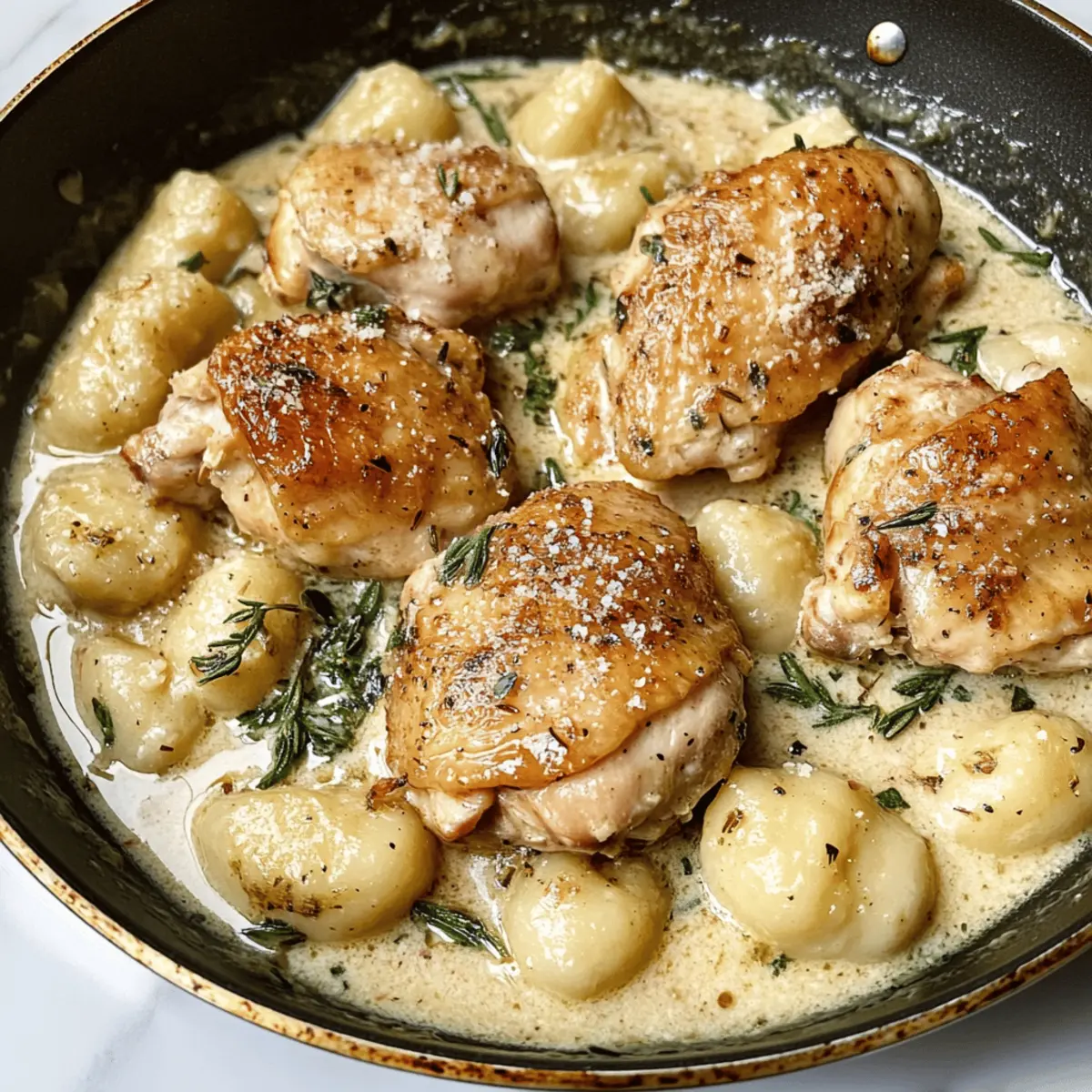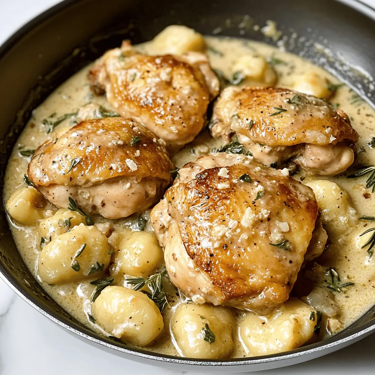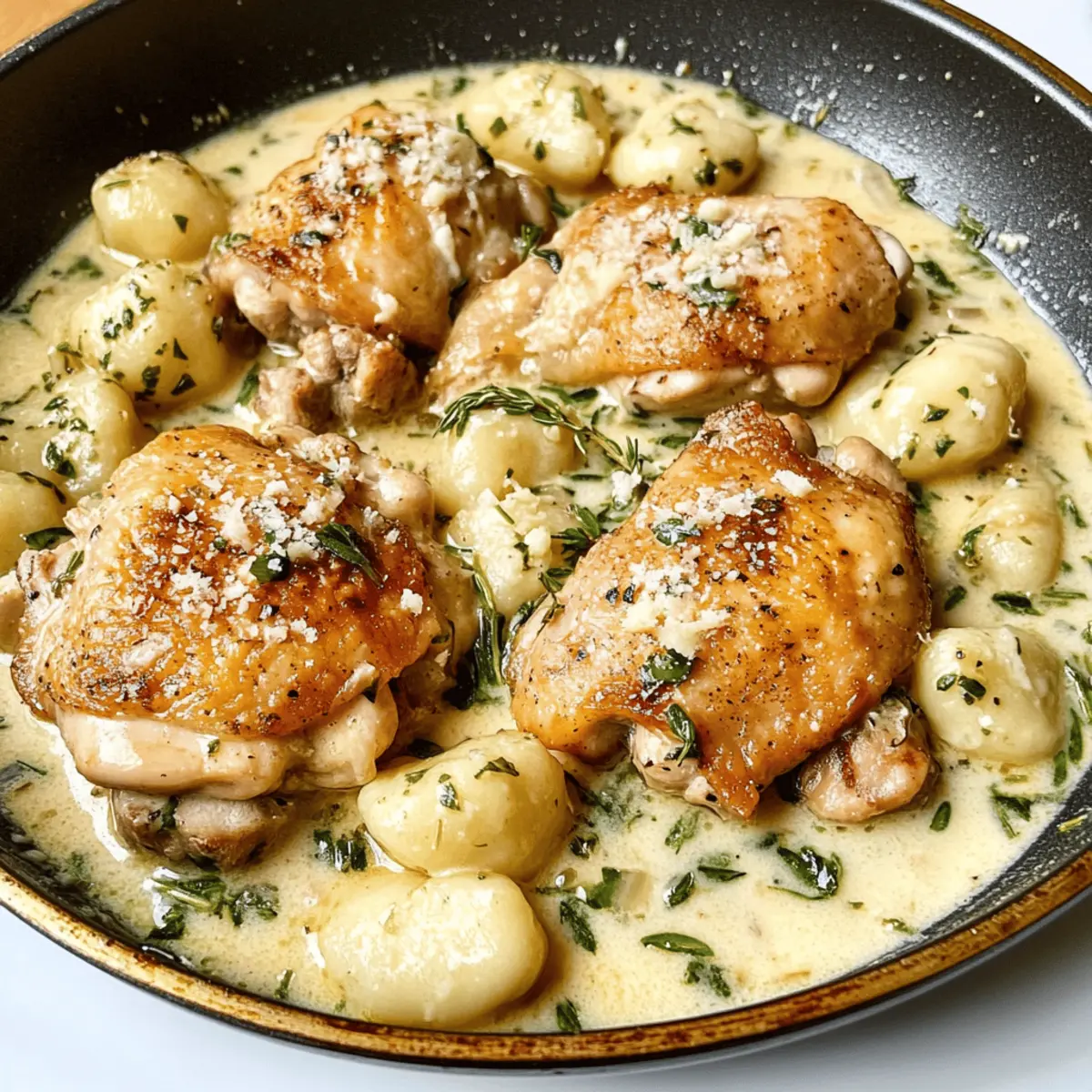 Das Rascheln von Kräutern und das Surren der Pfanne sind wie Musik in meiner Küche, besonders wenn ich mein Ein-Pfanne Knoblauch-Parmesan Hähnchen und Gnocchi zubereite. In nur unter einer Stunde verwandeln sich zarte Hähnchenstücke und luftige Gnocchi in ein cremiges, aromatisches Gericht, das selbst die wählerischsten Esser begeistern wird. Diese unkomplizierte Zubereitung bringt nicht nur den Wow-Faktor auf den Tisch, sondern sorgt auch für minimalen Abwasch – perfekt für geschäftige Wochentage! Neugierig, wie sich diese Geschmackskombination in Ihrem eigenen Zuhause entfaltet? Lassen Sie uns gemeinsam den Herd zum Glühen bringen! Warum ist dieses Rezept besonders? Einfachheit: Dieses leckere Gericht benötigt nur eine Pfanne, was die Zubereitung und den Abwasch zum Kinderspiel macht. Aromatische Kombination: Knoblauch, Parmesan und frische Kräuter vereinen sich zu einem Geschmackserlebnis, das jeden Gaumen verzückt. Schnell zubereitet: In weniger als einer Stunde sind Sie bereit, dieses köstliche Essen zu genießen – ideal für hektische Abende! Familienfreundlich: Dieses Gericht begeistert sowohl Kinder als auch Erwachsene und ist eine großartige Möglichkeit, die Familie zusammenzubringen. Vielseitig: Sie können problemlos Gemüse oder verschiedene Proteine hinzufügen, um es ganz nach Ihrem Geschmack zu gestalten. Entdecken Sie auch unsere anderen einfachen Rezeptideen, um die Abwechslung auf den Tisch zu bringen! Ein-Pfanne Knoblauch-Parmesan Hähnchen und Gnocchi Zutaten • Ein Gericht, das nicht nur schnell zubereitet ist, sondern auch köstlich schmeckt! Für die Sauce Mittlere Schalotte – sorgt für Süße und Tiefe im Geschmack; kann durch eine kleine Zwiebel ersetzt werden. Knoblauchzehen (4) – liefern einen reichen, aromatischen Geschmack; frische Zehen sind am besten. Baby-Portobello- oder Weiße Champignons (4 oz) – bringen umami Geschmack ins Spiel; jede Pilzsorte kann als Substitute verwendet werden. Frische Thymianblätter (½ Bund) – verleihen erdige Noten; getrockneter Thymian kann in geringerer Menge verwendet werden. Parmesan Käse (1½ oz, gerieben) – sorgt für Cremigkeit und herzhaftes Aroma; Pecorino Romano kann als schärfere Alternative verwendet werden. Allzweckmehl (2 EL) – verdickt die Sauce; glutenfreies Mehl ist eine passende Alternative. Vollmilch oder 2% Milch (3 Tassen) – kreiert eine cremige Sauce; Alternativen wie Mandel- oder Hafermilch sind ebenfalls möglich, können aber den Geschmack verändern. Für das Hähnchen und die Gnocchi Hähnchenschenkel, entbeint und hautlos (1½ lbs) – zarte Hauptproteinquelle; kann durch Hähnchenbrust ersetzt werden, aber die Garzeit ändern. Regelmäßiges Salz – verstärkt den Geschmack; nach persönlichem Gusto anpassen. Frisch gemahlener schwarzer Pfeffer – fügt Würze und Tiefe hinzu; weißer Pfeffer kann für milderen Geschmack verwendet werden. Ungesalzene Butter (2 EL) – bringt Reichhaltigkeit in die Sauce; kann durch Olivenöl ersetzt werden. Olivenöl (1 EL) – verhindert Anhaften und fügt Geschmack hinzu; jedes Kochöl kann im Notfall verwendet werden. Regalstabile Kartoffelgnocchi (1 lb) – die Hauptkohlenhydratquelle, die für eine zähe Textur sorgt; frische Gnocchi benötigen weniger Kochzeit. Für die Garnitur Baby-Spinat (1 oz) – trägt zur Nährstoffaufnahme und einer Farbexplosion bei; kann durch Grünkohl oder andere Blattgemüse ersetzt werden. Frische Zitronenspalten – ein Spritzer Zitrone bringt Frische und belebende Aromen ins Gericht. Lassen Sie das Kochen beginnen und genießen Sie jede köstliche Gabel dieser Ein-Pfanne Knoblauch-Parmesan Hähnchen und Gnocchi! Schritt-für-Schritt-Anleitung für Ein-Pfanne Knoblauch-Parmesan Hähnchen und Gnocchi Step 1: Zutaten vorbereiten Zuerst die Schalotte fein würfeln, den Knoblauch hacken und die Pilze in Scheiben schneiden. Den Babyspinat grob hacken und die Thymianblätter abzupfen. Diese Vorbereitungen sind essenziell, um die Aromen gleichmäßig in das Ein-Pfanne Knoblauch-Parmesan Hähnchen und Gnocchi zu integrieren. Step 2: Hähnchen würzen Die entbeinten und hautlosen Hähnchenschenkel großzügig mit Koscher-Salz und frisch gemahlenem schwarzem Pfeffer würzen. Dies sorgt für einen intensiven Geschmack und eine perfekt gewürzte Basis für das Gericht. Step 3: Hähnchen braten In einer großen Pfanne Butter und Olivenöl bei mittlerer Hitze erhitzen. Die gewürzten Hähnchenschenkel 4-5 Minuten pro Seite anbraten, bis sie goldbraun sind und eine Innentemperatur von 74°C (165°F) erreicht haben. Anschließend das gebratene Hähnchen aus der Pfanne nehmen und beiseitelegen. Step 4: Aromatische Zutaten anbraten In derselben Pfanne das restliche Butterfett erhitzen und die gewürfelte Schalotte hinzufügen. Für etwa 3-5 Minuten anbraten, bis sie goldbraun wird. Die geschnittenen Pilze und die Thymianblätter dazugeben und weitere 2-3 Minuten braten, bis die Pilze weich sind und die Flüssigkeit verdampft ist. Den gehackten Knoblauch 30 Sekunden lang anbraten, bis er duftet. Step 5: Sauce zubereiten Das Allzweckmehl über die Pilzmischung streuen und unter Rühren leicht rösten, bis es goldbraun ist. Dann langsam die Milch einrühren, dabei ständig weiterrühren, um Klumpen zu vermeiden. Die Mischung zum Köcheln bringen und 2-3 Minuten kochen lassen, bis die Sauce leicht eindickt. Step 6: Gnocchi kochen Die Regalstabilen Kartoffelgnocchi in die simmernde Sauce geben und regelmäßig umrühren. Etwa 3-4 Minuten kochen, bis die Gnocchi aufsteigen und zart sind. Achten Sie darauf, sie nicht zu lange zu kochen, damit sie nicht matschig werden. Step 7: Gericht vollenden Den geriebenen Parmesan und den gehackten Babyspinat in die Sauce einrühren, bis der Käse geschmolzen ist und der Spinat verwelkt. Die zuvor gebratenen Hähnchenschenkel zurück in die Pfanne legen, damit sie sich mit der Sauce verbinden. Step 8: Servieren Das fertige Ein-Pfanne Knoblauch-Parmesan Hähnchen und Gnocchi au