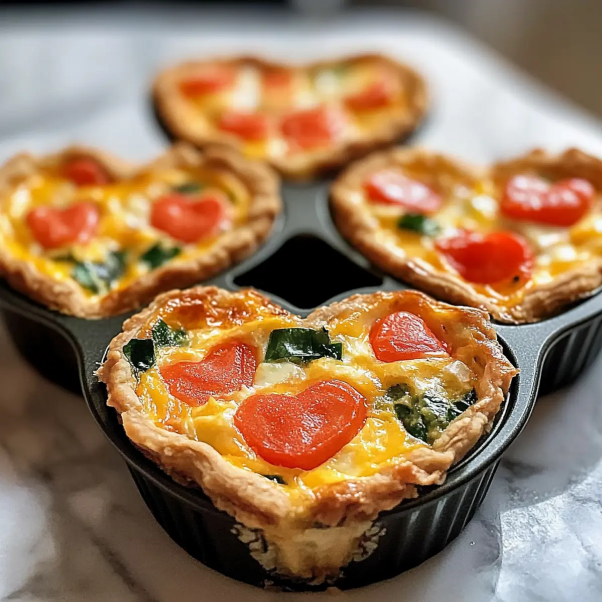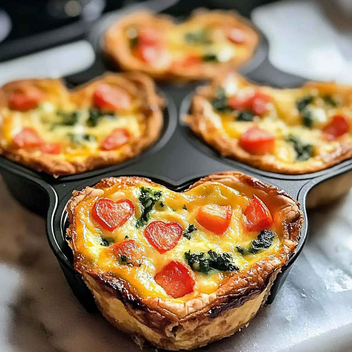 „Wussten Sie, dass eine einfache Quiche nicht nur köstlich, sondern auch für jedes Herz geeignet ist? Ich habe dieses Rezept für eine einfache herzförmige Quiche entwickelt, das nicht nur das Auge erfreut, sondern auch den Gaumen verzaubert. Diese schmackhaften kleinen Quiches sind schnell zubereitet, lassen sich nach Lust und Laune anpassen und passen perfekt zu Brunch oder Mittagessen. Wenn Sie also auf der Suche nach einer gesunden und optisch ansprechenden Snack-Option sind, sind diese crustless Mini-Quiches mit frischen Gemüse und gooey Käse eine wunderbare Lösung. Und das Beste? Sie brauchen dafür weniger als 30 Minuten! Sind Sie bereit, Spaß in Ihrer Küche zu haben und Ihre Lieben zu beeindrucken?“ Warum werden Sie dieses Rezept lieben? Einfachheit: Die Zubereitung dieser herzförmigen Quiches ist kinderleicht – perfekt für Kochanfänger und erfahrene Köche. Vielfalt: Passen Sie die Zutaten ganz nach Ihrem Geschmack an, indem Sie verschiedene Gemüsesorten und Käsesorten kombinieren. Gesund: Diese glutenfreien und vegetarischen Mini-Quiches sind nicht nur köstlich, sondern auch nahrhaft und sättigend. Schnelligkeit: In weniger als 30 Minuten haben Sie ein angesagtes Gericht auf dem Tisch. Anziehungskraft: Die süße Herzform wird Ihre Gäste bestimmt begeistern und sorgt für Gesprächsstoff – ideal für Brunchs oder romantische Anlässe. Entdecken Sie auch unsere schmackhaften Beilagen für ein komplettes Erlebnis! Einfache herzförmige Quiche Zutaten • Diese Zutaten machen Ihre Quiche zu einem Hit! Für die Basis Eier – Sie sorgen für Struktur und enthalten wertvolles Protein; verwenden Sie 6 Eiweiße als Ersatz für 3 ganze Eier. Milch – Fügt Cremigkeit hinzu und sorgt für Feuchtigkeit; pflanzliche Milch ist eine hervorragende milchfreie Option. Für die Füllung Geriebener Käse – Bringt Geschmack und verbindet die Zutaten; ersetzen Sie ihn durch milchfreien Käse, falls nötig. Würfelig geschnittenes Gemüse (z.B. Paprika, Zwiebeln, Spinat) – Sorgt für Nährstoff- und Geschmacksvielfalt; härtere Gemüsesorten vorher anbraten, um den Geschmack zu intensivieren. Für die Würze Salz & Pfeffer – Essentiell für den Geschmack; nach Belieben anpassen. Nutzen Sie diese einfachen Zutaten, um Ihre eigene einfache herzförmige Quiche zu kreieren! Schritt-für-Schritt-Anleitung für die einfache herzförmige Quiche Step 1: Ofen vorheizen Heizen Sie Ihren Ofen auf 190 °C (375 °F) vor. Dies sorgt dafür, dass die Quiche gleichmäßig backt und schön aufgeht. Ein idealer Zeitpunkt, um die herzförmige Muffinform vorzubereiten und Ihr Kochumfeld einzurichten; so sind Sie bereit, sobald der Ofen heiß ist. Step 2: Muffinform einfetten Fetten Sie eine herzförmige Muffinform großzügig mit Kochspray oder Butter ein. Achten Sie darauf, dass jede Vertiefung gut behandelt wird, um ein Ankleben der Quiches zu verhindern. Dies erleichtert das Entnehmen nach dem Backen und sorgt dafür, dass Ihre einfache herzförmige Quiche perfekt aussieht. Step 3: Eier und Milch vermischen In einer großen Schüssel die Eier und die Milch gründlich verquirlen. Fügen Sie Salz und Pfeffer nach Geschmack hinzu, um der Mischung mehr Tiefe zu verleihen. Diese Mischung bildet die Basis Ihrer Quiche und sollte gut homogen sein, damit die Aromen gleichmäßig verteilt werden. Step 4: Füllung vorbereiten Teilen Sie den geriebenen Käse und das gewürfelte Gemüse gleichmäßig auf die Vertiefungen der Muffinform auf, sodass sie etwa zur Hälfte gefüllt sind. Dies verhindert, dass die Füllung beim Backen überläuft. Wählen Sie Ihre Lieblingsgemüsesorten, um eine nahrhafte und bunte einfache herzförmige Quiche zu kreieren. Step 5: Eimischung hinzufügen Gießen Sie die Eier-Milch-Mischung vorsichtig in jede Vertiefung der Muffinform, bis sie etwa zu drei Vierteln gefüllt sind. Achten Sie darauf, dass alle Zutaten gleichmäßig verteilt sind, damit jede kleine Quiche gleichmäßig backt und pufft. Dies ist der letzte Schritt vor dem Backen. Step 6: Backen Schieben Sie die Muffinform in den vorgeheizten Ofen und backen Sie die Quiches für 15–18 Minuten, bis sie goldbraun und aufgeblasen sind. Ein Zahnstocher sollte sauber herauskommen, wenn Sie ihn in die Mitte stechen. Achten Sie darauf, dass Sie nicht zu lange backen, damit die Quiches nicht austrocknen. Step 7: Abkühlen lassen und servieren Lassen Sie die Quiches für 3–5 Minuten in der Form abkühlen. Dies hilft, sie leichter herauszuholen. Nach dem Abkühlen vorsichtig die Quiches aus der Muffinform nehmen und auf einem Servierteller anrichten. Ihre einfache herzförmige Quiche ist nun bereit, serviert zu werden – warm oder kalt! Bereiten Sie Ihre einfache herzförmige Quiche im Voraus zu! Die einfache herzförmige Quiche eignet sich hervorragend für die Vorbereitung, was viel Zeit an hektischen Tagen spart. Sie können die Eimischung bis zu 24 Stunden im Voraus vorbereiten und im Kühlschrank aufbewahren – so bleiben die Aromen frisch und intensiv. Die gewürfelten Gemüse können ebenfalls bereits bis zu 3 Tage im Voraus geschnitten und in einem luftdichten Behälter aufbewahrt werden, um ihren Geschmack zu bewahren. Wenn Sie bereit sind zu backen, fügen Sie einfach die Eimischung zu den vorbereiteten Gemüsen in den Muffinförmchen hinzu und backen Sie die Quiches gemäß der Anleitung. Mit diesen praktischen Vorbereitungen ergibt sich ein schmackhaftes Ergebnis mit minimalem Aufwand! Was servieren mit einfacher herzförmiger Quiche? Genießen Sie eine unvergessliche Mahlzeit, indem Sie diese köstlichen Quiches mit einer Vielzahl von passenden Beilagen kombinieren. Frischer grüner Salat: Light and zesty, a fresh salad with vinaigrette adds brightness to the meal and balances the quiche’s richness. Knuspriges Baguette: A slice of warm, crusty baguette is perfect for soaking up any leftover flavors from the quiche. It adds a delightful texture contrast. Süßkartoffel-Pommes: These crispy, oven-bak