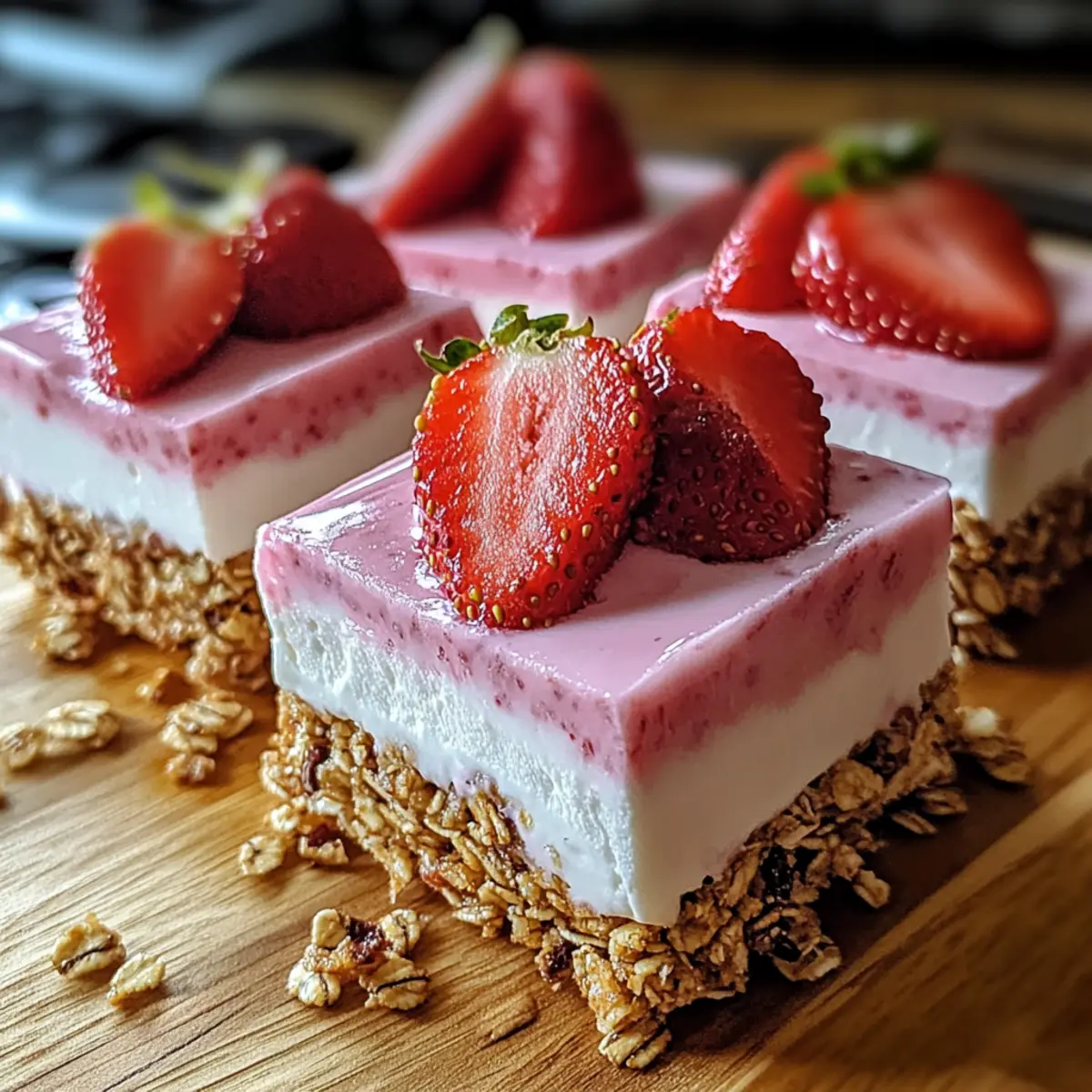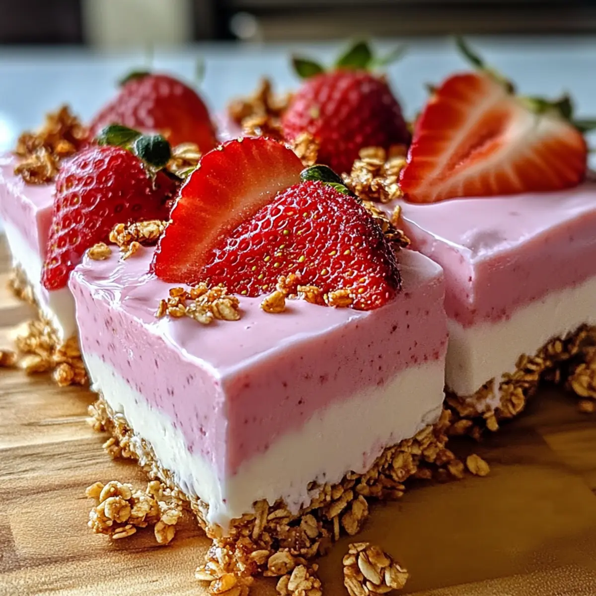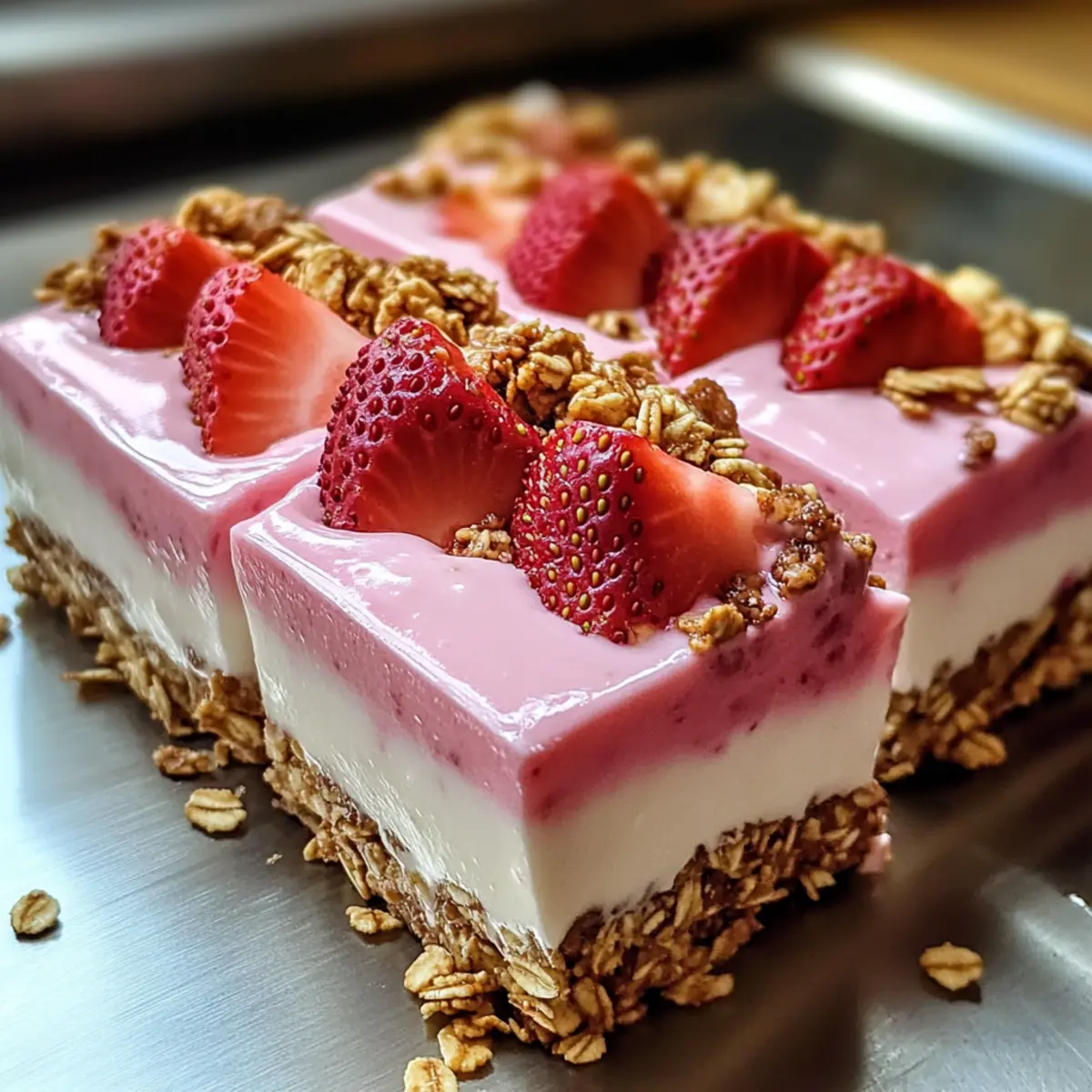 Als ich das erste Mal von den Erdbeer-Joghurt-Riegeln hörte, stellte ich mir vor, wie sie im heißen Sommerwind kühl und erfrischend schmecken würden. Diese leckeren Riegel vereinen eine knusprige Granola-Basis mit cremigen Joghurtschichten und sind die perfekte Antwort auf die Sehnsucht nach etwas Frischem und Leichtem. Das Beste daran? Sie sind nicht nur schnell zubereitet, sondern auch anpassbar, sodass jeder Genussliebhaber auf seine Kosten kommt. Egal, ob du frische Erdbeeren oder eine andere Beerenmischung bevorzugst, die Möglichkeiten sind endlos! Lass uns gemeinsam diese gesunde, no-bake Sommerleckerei kreieren, die sich ideal für entspannte Nachmittage eignet. Bist du bereit, deinen eigenen, köstlichen Snack zu zaubern? Warum sind Erdbeer-Joghurt-Riegel so beliebt? Erfrischend und gesund: Diese Riegel bieten die perfekte Balance aus erfrischender Frucht und cremigem Joghurt. Sie sind die ultimative Wahl für einen gesunden Snack an heißen Sommertagen. Einfache Zubereitung: Mit nur wenigen Schritten kannst du sie zubereiten – ideal, wenn die Zeit drängt. Vielseitig anpassbar: Ob mit verschiedenen Früchten oder Joghurtvarianten, du kannst deiner Kreativität freien Lauf lassen. Kein Backen nötig: Diese no-bake Leckerei ist sowohl für Backneulinge als auch für erfahrene Köche einfach umsetzbar. Crowd-Pleaser: Perfekt für Partys oder Familienfeiern – die bunten Schichten ziehen jeden in ihren Bann! Erdbeer-Joghurt-Riegel Zutaten • Diese Zutaten sorgen dafür, dass deine Erdbeer-Joghurt-Riegel super lecker und erfrischend schmecken! Für die Granola-Basis Granola – sorgt für die knusprige Textur; selbstgemacht ist eine wunderbare Variation! Geschmolzenes Kokosöl – bindet die Granola-Mischung; du kannst auch geschmolzene Butter verwenden. Honig – dient als süßer Geschmacksträger; für eine vegane Variante kannst du Ahornsirup verwenden. Weiße Schokoladenstückchen – verleihen Süße und Cremigkeit; optional für eine milchfreie Version weglassen. Für die Joghurtschichten Naturjoghurt – bietet eine cremige Textur und viel Protein; verwende pflanzlichen Joghurt für eine vegane Alternative. Vanillejoghurt – sorgt für zusätzliche Süße und Geschmack; du kannst auch deinen Lieblingsgeschmack verwenden. Für die fruchtige Schicht Frische Erdbeeren – bringen Farbe und natürliche Süße; gefrorene Erdbeeren sind auch eine gute Option, wenn frische nicht verfügbar sind. Zitronensaft – hebt den Geschmack; frischer Limettensaft ist eine gute Alternative. Vanilleextrakt – verstärkt das Aroma; du kannst auch Zitronenextrakt für einen interessanten Twist verwenden. Schritt-für-Schritt-Anleitung für Erdbeer-Joghurt-Riegel Step 1: Erdbeerpüree zubereiten Mixe 1½ Tassen frische Erdbeeren, 2 Esslöffel Honig und einen Spritzer Zitronensaft in einem Mixer, bis die Mischung schön glatt ist. Achte darauf, die Erdbeeren vollständig zu pürieren, damit du ein sämiges Püree erhältst. Stelle das Püree zur Seite, während du die Joghurtmischung vorbereitest. Step 2: Joghurtschichten mischen In einer Schüssel kombinierst du 1 Tasse Vanillejoghurt, 2 Esslöffel Honig und 1 Teelöffel Vanilleextrakt und rührst gut um, bis alles homogen ist. In einer separaten Schüssel vermengst du den Naturjoghurt mit dem vorbereiteten Erdbeerpüree und gewürfelten Erdbeeren. So entsteht eine leckere, fruchtige Schicht für die Erdbeer-Joghurt-Riegel. Step 3: Granola-Basis kombinieren In einer großen Schüssel mischst du das Granola mit 2 Esslöffeln geschmolzenem Kokosöl und 2 Esslöffeln Honig. Rühre alles gründlich durch, bis die Granola-Mischung gut benetzt ist. Wenn du möchtest, kannst du auch weiße Schokoladenstückchen hinzufügen, um den Riegeln eine süße Note zu verleihen. Step 4: Riegel zusammenstellen Drücke die Granola-Mischung gleichmäßig in die Riegelform, sodass eine feste Basis entsteht. Gieße die Vanille-Joghurtschicht darauf und klopfe leicht, um Luftblasen zu entfernen. Fülle anschließend die Erdbeer-Joghurtschicht über die Vanille-Schicht und achte darauf, dass genügend Platz bleibt, um das Volumen zu berücksichtigen. Step 5: Riegel einfrieren Stecke die Eisstiele in die Riegel und platziere die Form in den Gefrierschrank. Lasse die Erdbeer-Joghurt-Riegel mindestens 4 Stunden frieren, bis sie fest sind. Dies sorgt dafür, dass die Schichten schön zusammenhalten und die Riegel sich leicht aus der Form lösen lassen. Step 6: Riegel aus der Form lösen Um die Riegel aus der Form zu lösen, halte sie kurz unter warmes Wasser, damit sie sich leichter herausziehen lassen. Ziehe die Riegel vorsichtig aus der Form und serviere sie sofort oder lagere sie in einem luftdichten Behälter im Kühlschrank oder Gefrierfach für späteren Genuss. Lagerungstipps für Erdbeer-Joghurt-Riegel Kühlschrank: Bewahre die Erdbeer-Joghurt-Riegel in einem luftdichten Behälter auf, damit sie bis zu 3 Tage frisch bleiben. So bleiben Geschmack und Textur optimal. Gefrierschrank: Du kannst die Riegel bis zu 2 Wochen in einem gefriergeeigneten Behälter einfrieren. Achte darauf, sie gut zu verpacken, um Gefrierbrand zu vermeiden. Auftauen: Zum Servieren die gefrorenen Riegel über Nacht im Kühlschrank auftauen lassen. So bleiben sie angenehm kühl und erfrischend. Wiedererwärmen: Diese Riegel sind am besten kalt serviert und benötigen keine erneute Erwärmung. Tipps zur Vorbereitung der Erdbeer-Joghurt-Riegel Die Erdbeer-Joghurt-Riegel sind ideal für eine unkomplizierte und zeitsparende Essensvorbereitung! Du kannst die Granola-Basis bis zu 3 Tage im Voraus zubereiten, indem du sie in einem luftdichten Behälter im Kühlschrank aufbewahrst, um die Knusprigkeit zu bewahren. Das Erdbeerpüree lässt sich ebenfalls hervorragend für 24 Stunden vorbereiten, sodass du beim Zusammenstellen der Riegel Zeit sparst. Wenn du bereit bist zu genießen, drücke einfach die Granola-Mischung in deine Form, gieße die Joghurtschichten darüber und friere sie für mind