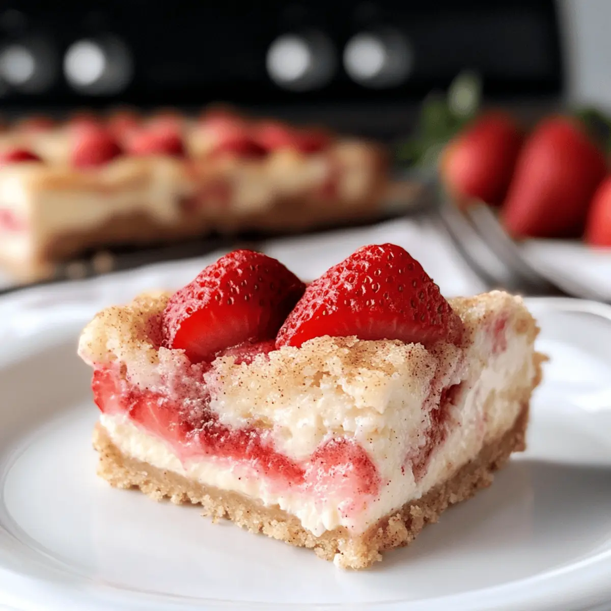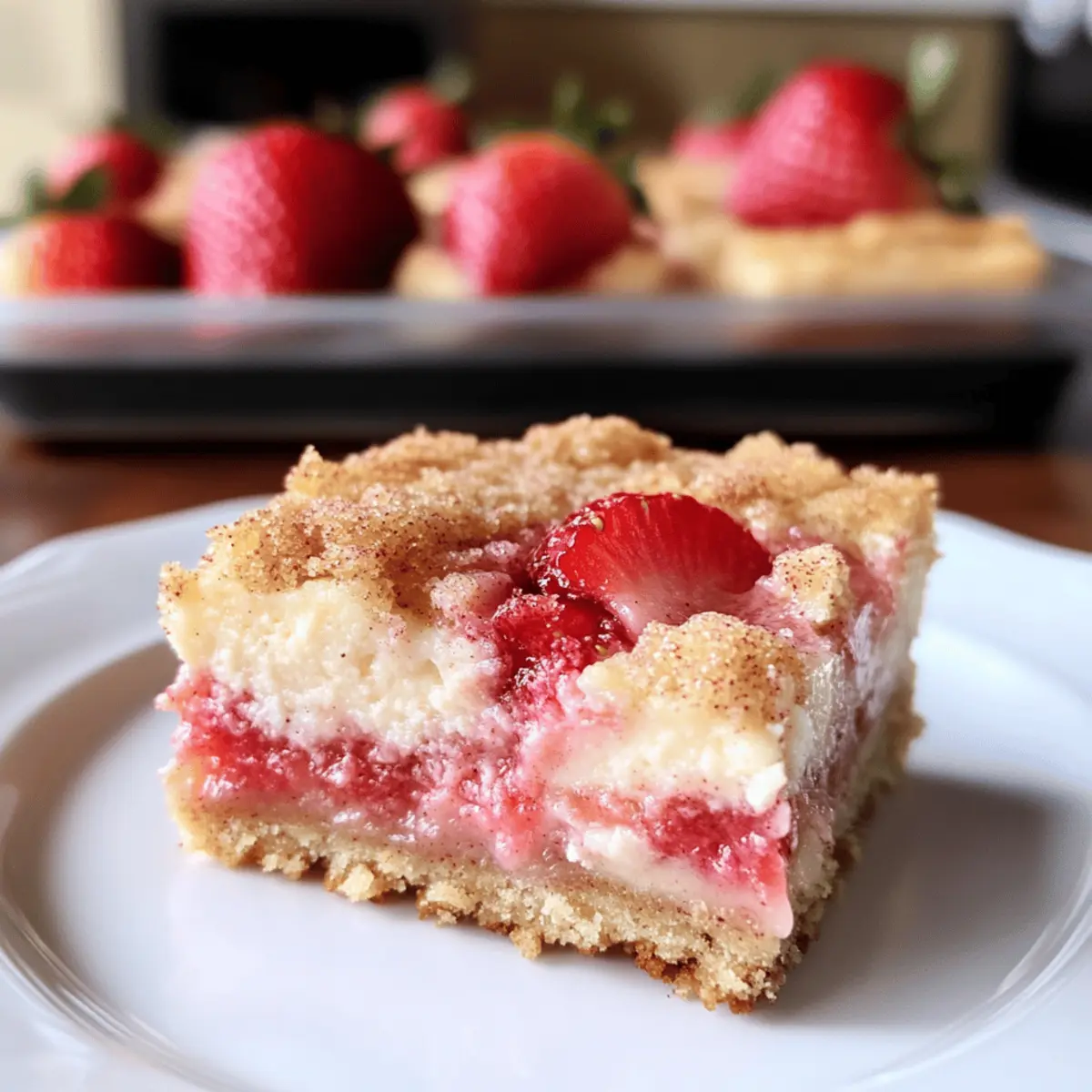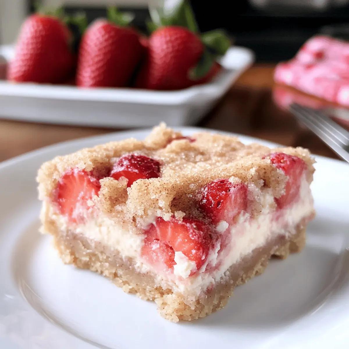 Kaum etwas lässt mich so sehr in die Vorfreude schwelgen wie der heiße Sommer und die saftigen Erdbeeren, die er mit sich bringt! Heute möchte ich euch ein Rezept vorstellen, das die essenzielle Leichtigkeit des Sommers perfekt einfängt: die Erdbeer-Snickerdoodle-Cheesecake-Riegel. Diese himmlischen Riegel vereinen die Frische süßer Erdbeeren mit der cremigen Verwöhnung eines Cheesecakes, eingebettet in eine zarte Schicht von Zimt-Snickerdoodle-Teig. Sie sind nicht nur ein wahrer Augenschmaus, sondern auch schnell zubereitet und ideal für gesellige Runden im Freien. Und das Beste? Nach ein paar Stunden im Kühlschrank entfaltet sich das volle Geschmackserlebnis und garantiert, dass ihr immer wieder nach diesem Rezept greifen werdet. Seid ihr bereit, eure Liebsten mit einem Dessert zu überraschen, das sie immer wieder nach mehr greifen lässt? Warum sind diese Riegel ein Muss? Einzigartige Kombination: Die Erdbeer-Snickerdoodle-Cheesecake-Riegel bieten die perfekte Mischung aus fruchtiger Frische und cremiger Köstlichkeit. Dies macht sie zu einem einzigartigen Dessert, das sonst keiner anbietet. Einfache Zubereitung: Mit nur wenigen Schritten könnt ihr diese Riegel stressfrei zubereiten – ideal für alle, die schnelles und leckeres Essen lieben. Perfekt für den Sommer: Wie wäre es mit einem erfrischenden Dessert auf euren Grillpartys? Diese Riegel sind der Hit und werden garantiert von den Gästen geliebt! Flexibel und vielseitig: Ihr könnt die Erdbeeren leicht durch andere Beeren ersetzen, um neue Geschmackskombinationen zu kreieren. Schaut euch auch meine Tipps zu saisonalen Früchten an! Kühle Genussmomente: Nach ein paar Stunden im Kühlschrank entfalten die Riegel ihr volles Aroma und werden zu einem himmlischen Genuss – perfekt, um sie bei warmem Wetter zu servieren! Erdbeer-Snickerdoodle-Cheesecake-Riegel Zutaten Für den Teig • Butter – 6 El, Zimmertemperatur; sorgt für Reichtum und Feuchtigkeit im Keksteig. • Zucker – 1/2 Tasse für den Teig und 2 El für die Erdbeeren; passt die Süße nach Geschmack an. • Ei – 1 für den Teig und 1 für die Cheesecake-Schicht; bindet die Zutaten zusammen und sorgt für Feuchtigkeit. • Vanilleextrakt – 1 1/2 Tl für den Teig, 1 Tl für die Cheesecake; verstärkt den Geschmack, kann durch Mandelextrakt ersetzt werden. • Allzweckmehl – 2 Tassen; gibt Struktur für die Keks-Schicht, bietet sich auch ein glutenfreies Mehl als Alternative an. • Backpulver – 1 Tl; hilft der Keks-Schicht beim Aufgehen; kann im Notfall auch durch Natron ersetzt werden. • Zimt – 1 Tl für den Teig, 1/2 Tl für die Erdbeermischung und 1/2 Tl zum Drüberstreuen; bringt Wärme und Gewürz; Muskatnuss wäre eine gute Alternative. • Salz – 1/2 Tl; balanciert die Süße; unerlässlich für den Geschmack. Für die Erdbeerschicht • Frische Erdbeeren – 1 1/2 Tassen, in kleine Stücke geschnitten; sorgt für eine fruchtige Schicht und natürliche Süße, können auch durch Himbeeren oder Blaubeeren ersetzt werden. • Maisstärke – 1 1/2 Tl; verdickt die Erdbeermischung; kann auch mit Mehl ersetzt werden. Für die Cheesecake-Schicht • Frischkäse – 8 oz, weich; bildet die cremige Cheesecake-Schicht, stelle sicher, dass er weich genug ist für das einfache Mischen. • Zucker – 1/4 Tasse; verstärkt die Süße in der Cheesecakeschicht. • Ei – 1; gibt der Cheesecake-Schicht die nötige Bindung. Die Erdbeer-Snickerdoodle-Cheesecake-Riegel sind bereit, euer neues Lieblingsdessert zu werden! Schritt-für-Schritt-Anleitung für Erdbeer-Snickerdoodle-Cheesecake-Riegel Step 1: Ofen vorheizen und Form vorbereiten Heizt den Ofen auf 175 °C (350 °F) vor und bereitet eine 9×9 Zoll (23×23 cm) Backform vor, indem ihr sie mit einem Antihaft-Spray einsprüht. Dies stellt sicher, dass die Erdbeer-Snickerdoodle-Cheesecake-Riegel nach dem Backen leicht herausgenommen werden können. Step 2: Butter und Zucker cremig rühren In einer Rührschüssel die zimmerwarme Butter mit 1/2 Tasse Zucker schaumig schlagen. Fügt ein Ei und den Vanilleextrakt hinzu und mixe alles gut durch, bis die Mischung hell und fluffig ist. Dieser Schritt sorgt für eine reichhaltige Basis der Riegel. Step 3: Trockene Zutaten vermengen In einer separaten Schüssel das Allzweckmehl, den Backpulver, den Zimt und das Salz vermischen. Diese trockenen Zutaten hinzugeben und gut mit der feuchten Mischung vermengen, bis ein trockener Teig entsteht. Dieser Teig wird die köstliche Basis unserer Erdbeer-Snickerdoodle-Cheesecake-Riegel bilden. Step 4: Erdbeeren vorbereiten In einer kleinen Schüssel die geschnittenen frischen Erdbeeren mit 2 Esslöffeln Zucker, 1 1/2 Teelöffeln Maisstärke und 1/2 Teelöffeln Zimt vermengen. Gut umrühren und beiseite stellen, damit die Erdbeeren etwas Saft ziehen können und die Füllung perfekt gewürzt wird. Step 5: Cheesecake-Mischung herstellen In einer weiteren Schüssel den Frischkäse mit 1/4 Tasse Zucker, einem Ei und etwas Vanilleextrakt glatt rühren. Schlage die Mischung, bis sie cremig und klumpenfrei ist. Diese Mischung sorgt für die himmlische Cheesecake-Schicht der Erdbeer-Snickerdoodle-Cheesecake-Riegel. Step 6: Schichtweise zusammenstellen Drückt die Hälfte des Keks-Teigs gleichmäßig in den Boden der vorbereiteten Backform. Darauf kommt die Cheesecake-Mischung, die gleichmäßig verteilt werden sollte. Anschließend die Erdbeermischung gleichmäßig darauflegen und gegebenenfalls überschüssige Flüssigkeit abgießen, um einen durchweichten Boden zu vermeiden. Step 7: Restlichen Teig hinzufügen Die verbleibende Keksmasse in kleinen Stückchen über die Erdbeeren bröseln. Dies verleiht den Riegeln eine köstliche und knusprige Schicht. Zum Abschluss mit etwas Zimt-Zucker bestreuen, um den süßen, gewürzten Geschmack zu intensivieren. Step 8: Backen und Auskühlen lassen Die Backform in den vorgeheizten Ofen stellen und die Erdbeer-Snickerdoodle-Cheesecake-Riegel 25-30 Minuten backen, bis die Ränder goldb