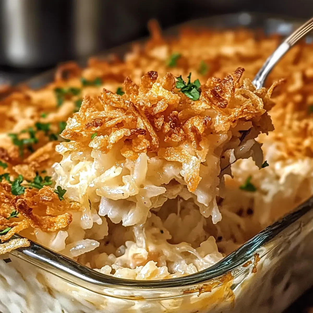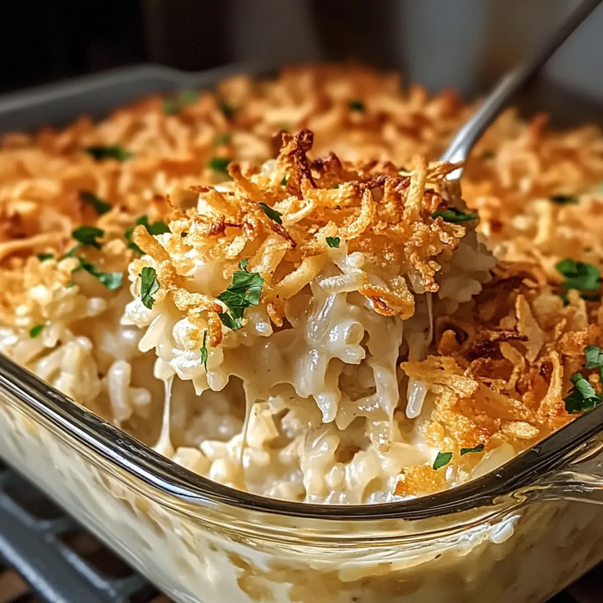 Die Küche erfüllt sich mit dem warmen, einladenden Duft des Französischen Zwiebel-Hühnchen-Reis-Auflaufs – ein Gericht, das mich sofort in die herzlichen Familienabende meiner Kindheit zurückversetzt. Diese köstliche Auflaufform kombiniert zarte Hühnerstücke mit cremigen Suppen und wird mit knusprigen, frittierten Zwiebeln gekrönt, die für den perfekten Biss sorgen. Ideal für hektische Wochentage bietet dieses familienfreundliche Rezept nicht nur eine schnelle Zubereitung, sondern lässt sich auch wunderbar an unterschiedliche Diäten anpassen. Ob mit Putenreste, vegetarischen Alternativen oder einem milchfreien Twist – die Möglichkeiten sind grenzenlos. Neugierig, wie einfach es ist, dieses zeitlose Comfort Food auf Ihren Tisch zu bringen? Warum werden Sie dieses Rezept lieben? Einfachheit: Die Zubereitung ist unkompliziert und benötigt nur grundlegende Kochfähigkeiten, wodurch jeder, vom Anfänger bis zum erfahrenen Koch, problemlos mitmachen kann. Vielfältigkeit: Passen Sie das Rezept ganz nach Ihren Vorlieben an – sei es mit Putenresten, als vegetarische Variante oder sogar milchfrei! Schneller Genuss: Ideal für hektische Wochentage, ist dieser Auflauf in kürzester Zeit fertig und sorgt für zufriedene Gesichter am Tisch. Herzhafter Geschmack: Die Kombination aus zartem Hähnchen, cremigen Zutaten und knusprigen Zwiebeln sorgt für ein Geschmackserlebnis, das Erinnerungen an gemütliche Familienabende weckt. Perfekte Reste: Ideal zum Vorbereiten, können Sie den Auflauf bis zu 24 Stunden im Voraus zubereiten und im Kühlschrank lagern – genießen Sie die Zeitersparnis während der Woche! Für weitere köstliche Ideen könnten Sie meinen Artikel über gesunde Aufläufe lesen! Zutaten für Französisches Zwiebel-Hühnchen-Reis-Auflauf • Entdecken Sie, was dieser köstliche Auflauf benötigt! Für den Auflauf Gekochter weißer Reis – Liefert die Basis und Struktur des Gerichts. Ersetzen Sie ihn durch Vollkornreis für einen nussigen Geschmack und zusätzlichen Ballaststoffen. Zerfetztes gekochtes Hähnchen – Sorgt für Protein und Herzhaftigkeit. Verwenden Sie Rotisserie-Hühnchen oder übrig gebliebene Pute für mehr Komfort. Hühnchencremesuppe – Dient als cremiger Binder mit reichhaltigem Geschmack. Einfache low-sodium oder hausgemachte Alternativen können verwendet werden, könnten aber die Textur leicht verändern. Französische Zwiebelsuppe – Verleiht dem Auflauf den klassisch reichen Zwiebelgeschmack. Sauerrahm – Fügt Cremigkeit hinzu und balanciert den Geschmack. Ersetzen Sie ihn durch milchfreien Joghurt für eine milchfreie Version. Geriebener Käse (Mozzarella oder Schweizer) – Sorgt für eine schmelzige, cremige Textur. Wählen Sie Mozzarella für einen milderen Geschmack oder Schweizer Käse für eine nussigere Note. Frittierte Zwiebeln – Bieten ein knuspriges Topping und intensiven Zwiebelgeschmack, der sowohl im Auflauf als auch oben verwendet wird. Knoblauchpulver und Zwiebelpulver – Verstärken die herzhaften Aromen und verleihen dem Gericht Tiefe. Salz und schwarzer Pfeffer – Zum Abschmecken nach Belieben. Gehackte Petersilie – Frische Beigabe für Farbe und Helligkeit beim Servieren. Lassen Sie dieses Rezept zu einem neuen Familienliebling werden und genießen Sie die herzlichen Abende zusammen! Schritt-für-Schritt-Anleitung für Französisches Zwiebel-Hühnchen-Reis-Auflauf Step 1: Ofen vorheizen Heizen Sie den Ofen auf 175°C (350°F) vor und bereiten Sie eine gefettete 23×33 cm große Auflaufform vor. Dies sorgt für eine gleichmäßige Wärmeverteilung und hilft, dass der Auflauf während des Backens nicht anklebt. Warten Sie, bis der Ofen die gewünschte Temperatur erreicht hat, bevor Sie mit den nächsten Schritten fortfahren. Step 2: Zutaten mischen In einer großen Rührschüssel kombinieren Sie den gekochten Reis, das zerfetzte Hähnchen, die Hühnchencremesuppe, die französische Zwiebelsuppe, den Sauerrahm, den geriebenen Käse, 1 Tasse der frittierten Zwiebeln, das Knoblauchpulver, Salz und Pfeffer. Rühren Sie die Mischung gründlich, bis alle Zutaten gut verbunden sind und eine cremige Konsistenz entsteht. Step 3: Mischung in die Form übertragen Breiten Sie die vorbereitete Mischung gleichmäßig in der gefetteten Auflaufform aus. Verwenden Sie einen Spatel, um die Mischung glatt zu streichen und sicherzustellen, dass sie sich gleichmäßig verteilt. Dies wird helfen, dass der Auflauf beim Backen gleichmäßig gart und eine schöne Textur erhält. Step 4: Backen Backen Sie den Auflauf für etwa 30 Minuten ohne Abdeckung, bis die Ränder anfangen zu blubbern und die Oberfläche leicht goldbraun wird. Achten Sie darauf, den Auflauf während des Backens zu beobachten, um sicherzustellen, dass er nicht übergart oder anbrennt. Step 5: Topping hinzufügen Nehmen Sie den Auflauf nach 30 Minuten aus dem Ofen und streuen Sie die restlichen ½ Tasse der frittierten Zwiebeln gleichmäßig über die Oberfläche. Dadurch entsteht ein extra knuspriges Topping, das dem Französischen Zwiebel-Hühnchen-Reis-Auflauf den letzten Schliff gibt. Stellen Sie den Auflauf zurück in den Ofen. Step 6: Fertig backen Backen Sie den Auflauf für weitere 5 Minuten, bis die Zwiebeln knusprig und goldbraun sind. Die zusätzliche Backzeit sorgt dafür, dass das Topping schön knusprig bleibt und die Aromen des Auflaufs sich perfekt entfalten. Halten Sie ein Auge darauf, um sicherzustellen, dass alles gut gelingt. Step 7: Garnieren und servieren Nehmen Sie den Auflauf aus dem Ofen und garnieren Sie ihn mit frischer, gehackter Petersilie, um ihm Farbe und Frische zu verleihen. Lassen Sie ihn kurz abkühlen und servieren Sie ihn dann heiß. Ihr Französischer Zwiebel-Hühnchen-Reis-Auflauf ist nun bereit, genossen zu werden! Die perfekte Vorbereitung für den Französischen Zwiebel-Hühnchen-Reis-Auflauf Der Französische Zwiebel-Hühnchen-Reis-Auflauf ist ideal für die Vorbereitung im Voraus! Sie können die gesamte Mischung bis zu 24