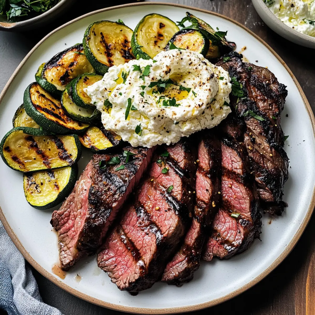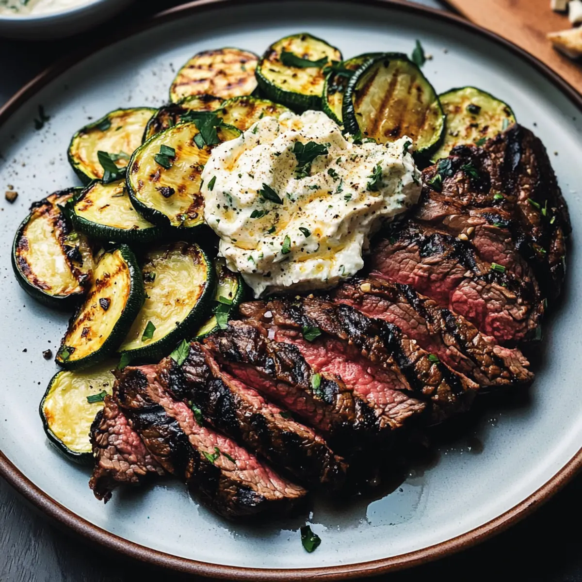 Wenn der Grill im Sommer aufheizt, gibt es nichts Besseres, als die Aromen frisch gegrillter Speisen zu genießen. Heute lade ich euch ein, mit mir ein köstliches Gegrilltes Steak und Zucchini zuzubereiten, das perfekt für eure nächsten BBQ-Pläne ist. Dieses Gericht vereint die saftige Würze des marinierten Steaks und das zarte, leicht geröstete Gemüse, das jeder Feier einen besonderen Glanz verleiht. Mit einer cremigen, luftigen Whipped Feta als Krönung wird es sicher zum Star auf dem Tisch und verspricht, selbst die anspruchsvollsten Gaumen zu erfreuen. Zudem lässt sich dieses Rezept schnell zubereiten und bietet die Möglichkeit, es je nach diätetischen Vorlieben anzupassen. Seid ihr bereit, eure Grillkünste auf die nächste Stufe zu heben? Warum wirst du dieses Rezept lieben? Einfachheit in Perfektion: Die Zubereitung ist unkompliziert und erfordert nur grundlegende Grillfähigkeiten. Vielfältige Möglichkeiten: Du kannst abhängig von deinen Vorlieben Variationen wie Zucchini durch Paprika oder die Feta-Creme durch eine vegane Alternative ersetzen. Sommerliche Frische: Das Gericht vereint saftiges Steak mit frischem Gemüse, das perfekt zum Grillen im Freien passt. Köstliche Aromen: Die harmonische Kombination aus würzigem Steak und cremiger Whipped Feta sorgt für ein Geschmackserlebnis, das deine Gäste begeistern wird. Schnelle Zubereitung: In weniger als 30 Minuten kannst du dieses köstliche Gericht auf den Tisch bringen. Perfekt für spontane Grillabende! Genieße es am besten mit einem frischen grünen Salat oder als Hauptgericht bei deinem nächsten BBQ! Gegrilltes Steak und Zucchini Zutaten • Hol dir die perfekten Zutaten für dein Grillvergnügen! Für das Steak Flank Steak – Hauptprotein, das einen reichhaltigen, fleischigen Geschmack bietet; du kannst es durch Skirt Steak ersetzen, wenn flank nicht verfügbar ist. Sojasauce – Fügt Umami und Salz zu deiner Marinade hinzu; Tamari ist eine glutenfreie Option. Honig – Sorgt für Süße und gleicht die Aromen in der Marinade aus; für eine vegane Option kann Ahornsirup verwendet werden. Knoblauch (Zehen) – Verbessert den Geschmack in der Marinade; für Bequemlichkeit kannst du zerhackten Knoblauch verwenden. Rotweinessig – Fügt Säure für die Marinade hinzu; Apfelessig kann als Ersatz dienen. Schwarzer Pfeffer – Bietet Würze; frisch gemahlener Pfeffer ist vorzuziehen für besseren Geschmack. Salz – Essentiell für die Würze; nach Geschmack anpassen. Für die Zucchini Zucchini – Sorgt für Frische und Textur; kann durch gegrillte Paprika oder geröstete Tomaten ersetzt werden, wenn gewünscht. Kümmelsamen – Fügt Wärme und Tiefe zu deinem Gericht hinzu; vor der Verwendung leicht rösten für intensiveren Duft. Sesamsamen – Bringt einen nussigen Geschmack und Crunch; kann weggelassen werden, wenn Allergien bestehen. Olivenöl (extra vergine) – Wird sowohl für die Marinade als auch zum Grillen verwendet; am besten frisch zur Anwendung. Für die Whipped Feta Feta Käse – Cremige Komponente für die Whipped Feta; kann durch eine vegane Käsealternative ersetzt werden. Sahne – garantiert, dass die Whipped Feta cremig und luftig bleibt; Milch kann verwendet, benötigt jedoch Anpassungen für die Konsistenz. Zitrone (Saft) – Fügt eine erfrischende Säure hinzu; frisch gepresster Saft hat den besten Geschmack. Das Zusammenstellen dieser Zutaten macht dein Erlebnis beim Kochen von gegrilltem Steak und Zucchini noch aufregender und verspricht, deine Gäste kulinarisch zu verwöhnen! Schritt-für-Schritt-Anleitung für Gegrilltes Steak und Zucchini Step 1: Steak marinieren Vermische in einer Schüssel Sojasauce, Honig, Knoblauch, Rotweinessig, schwarzer Pfeffer und Salz zu einer Marinade. Gieße die Mischung über das Flank Steak und wende es, damit es gleichmäßig bedeckt ist. Lasse das Steak mindestens 30 Minuten marinieren, optimal wäre über Nacht, um die Aromen gut durchziehen zu lassen. Step 2: Gewürze rösten Erhitze eine kleine Pfanne bei mittlerer Hitze und füge Kümmelsamen und Sesamsamen hinzu. Röste die Gewürze unter gelegentlichem Rühren circa 2 bis 3 Minuten lang, bis sie aromatisch werden. Lass die gerösteten Gewürze kurz abkühlen, damit sie beim Servieren knusprig bleiben. Step 3: Whipped Feta zubereiten Gib den Feta, Olivenöl, den Saft einer Zitrone und die Sahne in eine Küchenmaschine. Mixe alles, bis die Mischung cremig und glattrührig ist. Falls die Konsistenz zu dick ist, füge etwas mehr Sahne hinzu. Schmecke die Whipped Feta mit Salz und Pfeffer ab und stelle sie beiseite. Step 4: Grill vorheizen Heize deinen Grill auf hohe Temperatur vor, sodass die Grillroste heiß werden. Wenn du eine Grillpfanne verwendest, lasse sie ebenfalls auf großer Hitze vorheizen. Die richtige Temperatur ist entscheidend für das perfekte Gegrillte Steak und Zucchini. Step 5: Steak und Zucchini grillen Lege das marinierte Flank Steak auf den heißen Grill und grille es 3 bis 5 Minuten pro Seite für einen mittelrare Gargrad. Lege gleichzeitig die in Scheiben geschnittene Zucchini auf den Grill und grille sie etwa 5 bis 10 Minuten lang, bis sie schön zart und leicht angebräunt ist. Step 6: Steak ruhen lassen und schneiden Nehme das Steak nach dem Grillen vom Grill und lasse es etwa 5 Minuten ruhen. Dies ist wichtig, damit sich die Säfte im Fleisch setzen können. Schneide das Steak anschließend gegen die Faser in dünne Scheiben, um eine zarte Textur zu gewährleisten. Step 7: Anrichten Richte das gegrillte Steak zusammen mit den Zucchini auf einem großen Teller an. Gib großzügige Löffel der Whipped Feta darüber und streue die gerösteten Gewürze als Krönung über das Gericht. Diese Kombination aus Gegrilltem Steak und Zucchini ist nicht nur schmackhaft, sondern auch ein echter Hingucker auf dem Tisch! Perfekte Vorbereitungen für Gegrilltes Steak und Zucchini Diese Gegrilltes Steak und Zucchini ist ideal für Eilige und kann hervorragend im Voraus vorbereitet w