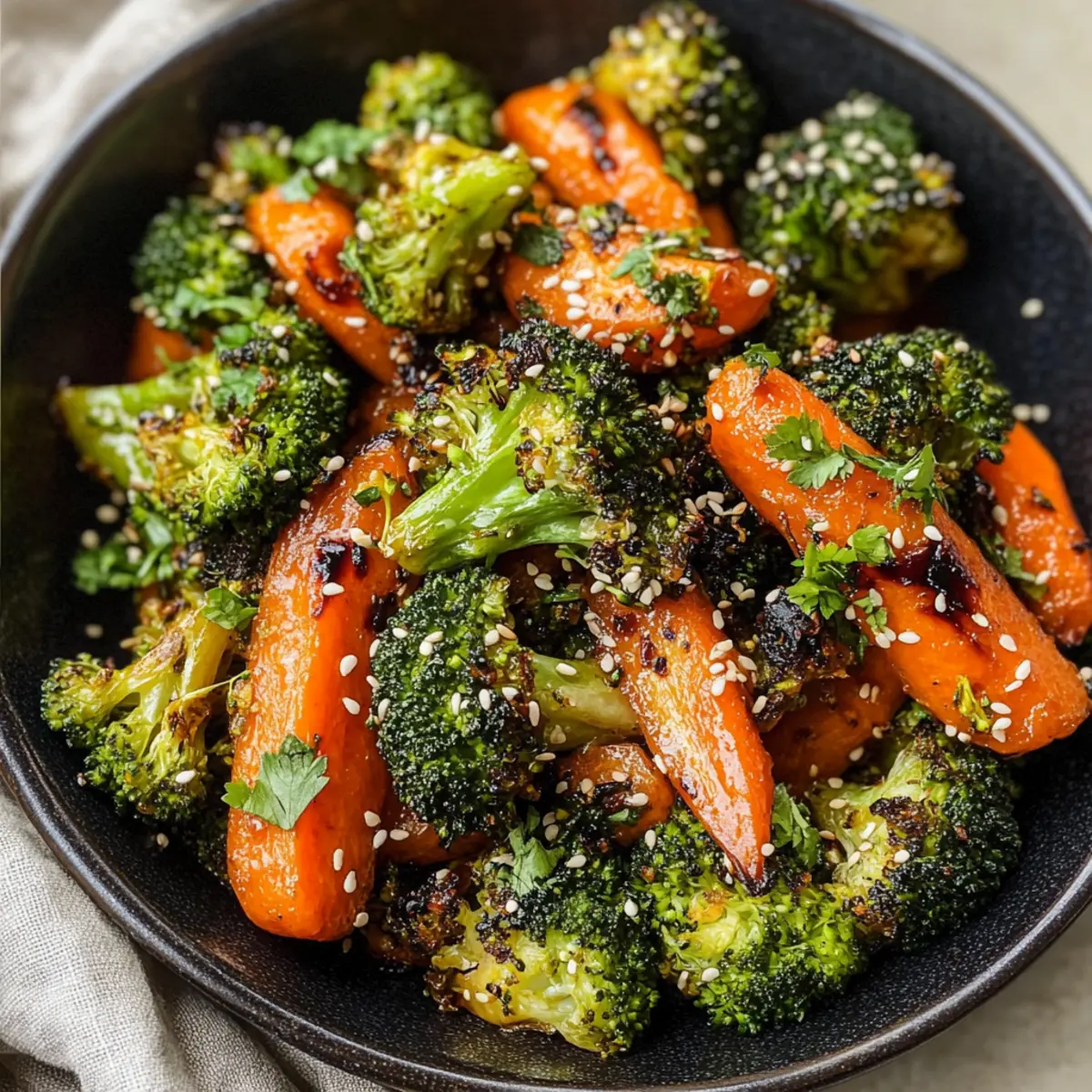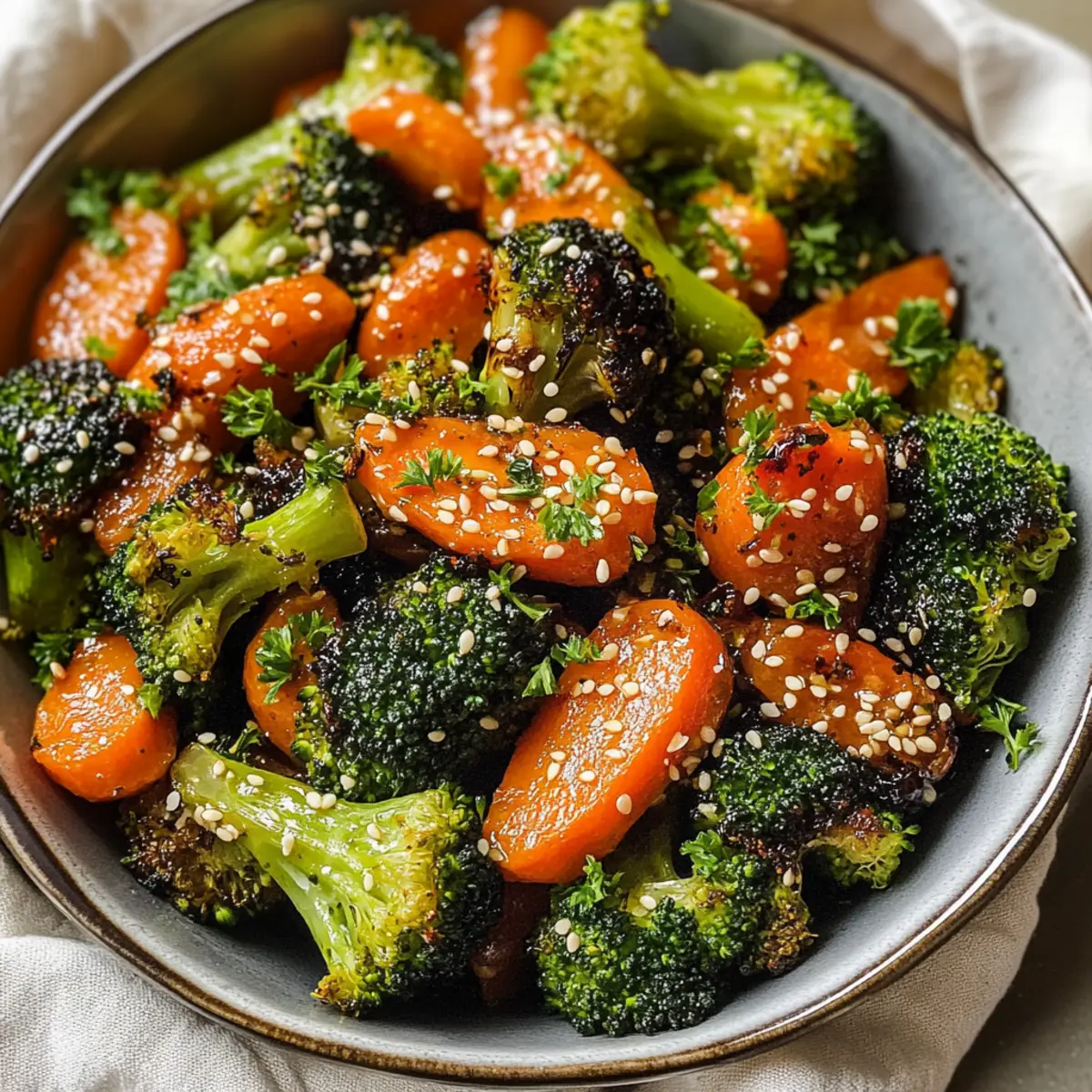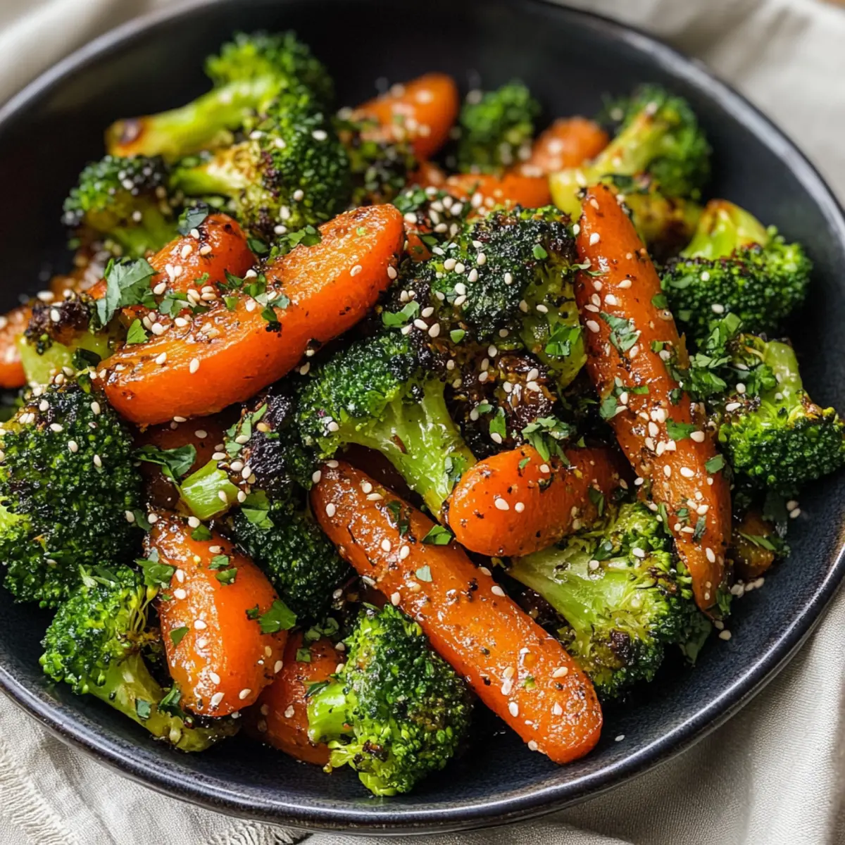 Die anderen Gäste am Tisch schauten fasziniert zu, als ich den Ofen öffnete und das Aroma frisch gerösteter Gemüse in die Luft stieg. Mein asiatisch inspiriertes Rezept für gerösteten Brokkoli und Karotten hat nicht nur die Sinne geweckt, sondern auch die Vorfreude auf das bevorstehende Essen gesteigert. Diese einfache und gesunde Beilage vereint knackigen Brokkoli und süße Karotten, die zusammen mit Sojasauce, Ingwer, Honig und geröstetem Sesamöl für ein unverwechselbares Geschmackserlebnis sorgen. In nur 30 Minuten zubereitet, ist dieses Gericht perfekt für diejenigen, die Stress in der Küche vermeiden möchten, aber dennoch ein Farbenspiel auf dem Teller genießen wollen. Sind Sie bereit, Ihre nächste Mahlzeit aufzupeppen und Ihre Familie oder Freunde mit einer köstlichen Mischung aus Aromen zu überraschen? Warum sollten Sie gerösteten Brokkoli lieben? Einfachheit: Die Zubereitung ist kinderleicht und benötigt nur minimalen Aufwand. Gesund und nahrhaft: Diese Beilage ist nicht nur reich an Ballaststoffen, sondern auch voller wichtiger Vitamine. Asiatische Aromen: Die Kombination aus Sojasauce und Sesamöl macht jedes Gericht zum Genuss. Vielseitig einsetzbar: Ob zu Fleisch, Fisch oder als vegetarische Option – sie passt perfekt! Schnell gemacht: In nur 30 Minuten auf dem Tisch, ideal für hektische Wochentage. Gönnen Sie sich diesen köstlichen Genuss und entdecken Sie auch andere gesunde Beilagen, die zu Ihrem Lieblingsgericht passen! Gerösteter Brokkoli und Karotten Zutaten Für das Gemüse • Brokkoli-Röschen – Bietet eine knackige Textur und ist eine hervorragende Quelle für Ballaststoffe und Mikronährstoffe. Substitution: Blumenkohl kann für einen anderen Geschmack verwendet werden. • Karotten – Fügen Süße und lebendige Farbe hinzu, reich an Beta-Carotin. Substitution: Andere Wurzelgemüse wie Pastinaken können eingesetzt werden. • Knoblauch – Verleiht aromatische Tiefe und Geschmack. Substitution: Knoblauchpulver kann verwendet werden, wenn frischer Knoblauch nicht verfügbar ist. Für die Marinade • Avocadoöl – Ideal zum Rösten, es verbessert den Geschmack und liefert gesunde Fette. Substitution: Olivenöl ist eine passende Alternative. • Honig – Sorgt für Süße und Karamellisierung. Substitution: Für eine vegane Option kann Ahornsirup verwendet werden. • Natriumreduzierte Sojasauce – Liefert einen Umami-Geschmack. Substitution: Tamari für glutenfreie Bedürfnisse. • Reisessig – Fügt Säure und Frische hinzu. Substitution: Apfelessig funktioniert als Ersatz. • Gemahlener Ingwer – Trägt würzige, erdige Noten bei. Substitution: Frischer Ingwer kann für einen stärkeren Geschmack gewürfelt werden. • Geröstetes Sesamöl – Verbessert das gesamte Geschmacksprofil. Hinweis: Geteilte Verwendung—1 Esslöffel zum Kochen und 1 Esslöffel zum Verfeinern. • Schwarzer Pfeffer – Für die Würze. Optional: Rote Paprika flocken können für Schärfe hinzugefügt werden. Garnitur • Sesamsamen und gehackte Petersilie – Für die ansprechende Präsentation. Schritt-für-Schritt-Anleitung für Gerösteter Brokkoli und Karotten im asiatischen Stil Step 1: Ofen vorheizen Heizen Sie den Ofen auf 200°C vor und legen Sie ein Backblech mit Backpapier aus. Dies verhindert, dass der geröstete Brokkoli und die Karotten ankleben und erleichtert das Reinigen nach dem Kochen. Das Vorheizen des Ofens ist wichtig, um eine gleichmäßige Röstung zu gewährleisten, sodass das Gemüse perfekt zart und leicht karamellisiert wird. Step 2: Gemüse vorbereiten In einer großen Schüssel schneiden Sie die Brokkoli-Röschen und Karotten in gleichmäßige Stücke, um ein gleichmäßiges Garen zu gewährleisten. Fügen Sie den fein gehackten Knoblauch hinzu, um dem Gemüse Aroma zu verleihen. Rühren Sie sanft um, damit alle Zutaten vorbereitet sind und bereit für die Marinade für den Gerösteten Brokkoli und die Karotten sind. Step 3: Marinade hinzufügen Gießen Sie das Avocadoöl, den Honig, die natriumreduzierte Sojasauce, den Reisessig, den gemahlenen Ingwer und 1 Esslöffel geröstetes Sesamöl über die Gemüse-Mischung. Werfen Sie alles gut durch, bis das Gemüse gleichmäßig mit der Marinade bedeckt ist. Diese Aromen sind entscheidend, um den asiatischen Geschmack in den gerösteten Brokkoli und Karotten hervorzuheben. Step 4: Gemüse verteilen Verteilen Sie das marinierte Gemüse in einer einzigen Schicht auf dem vorbereiteten Backblech. Achten Sie darauf, die Stücke nicht zu überlappen, damit sie gleichmäßig gegart werden und eine schöne Bräunung erhalten. Diese Anordnung trägt dazu bei, dass der Brokkoli und die Karotten knusprig und ansprechend auf dem Teller aussehen. Step 5: Rösten im Ofen Rösten Sie das Gemüse im vorgeheizten Ofen für etwa 30 Minuten. Um eine gleichmäßige Garung und Bräunung zu erzielen, wenden Sie die Mischung nach der Hälfte der Backzeit vorsichtig um. Achten Sie darauf, dass das Gemüse weich ist und eine goldene Farbe annimmt, bevor Sie es herausnehmen. Der Duft wird Ihre Küche durchziehen und Lust auf mehr machen. Step 6: Fertigstellen und servieren Sobald der geröstete Brokkoli und die Karotten fertig sind, träufeln Sie das verbleibende geröstete Sesamöl darüber. Dies verleiht dem Gericht den letzten Schliff und intensiviert den Geschmack. Optional können Sie das Gemüse mit frisch gemahlenem schwarzem Pfeffer, Sesamsamen und gehackter Petersilie garnieren, um eine ansprechende Präsentation zu erreichen und den Genuss zu vervollständigen. Was passt zu geröstetem Brokkoli und Karotten? Die Kombination aus zartem, geröstetem Gemüse sorgt für eine aufregende Ergänzung zu jedem Hauptgericht und verwandelt eine einfache Mahlzeit in ein Fest für die Sinne. Gebackener Lachs: Der zarte Fisch harmoniert wunderbar mit dem leicht süßen Brokkoli und den aromatischen Karotten. Die Kombination sorgt für ein gesundes, delikates Gericht, das sowohl Herzhaftigkeit als auch Frisc