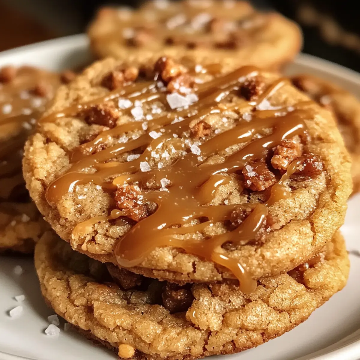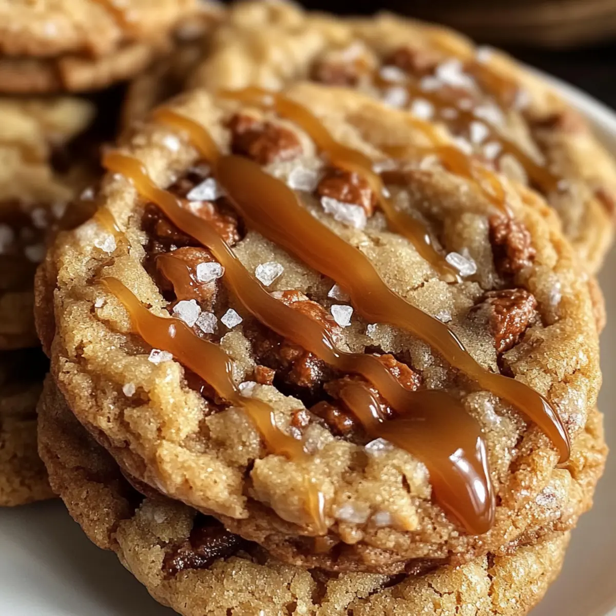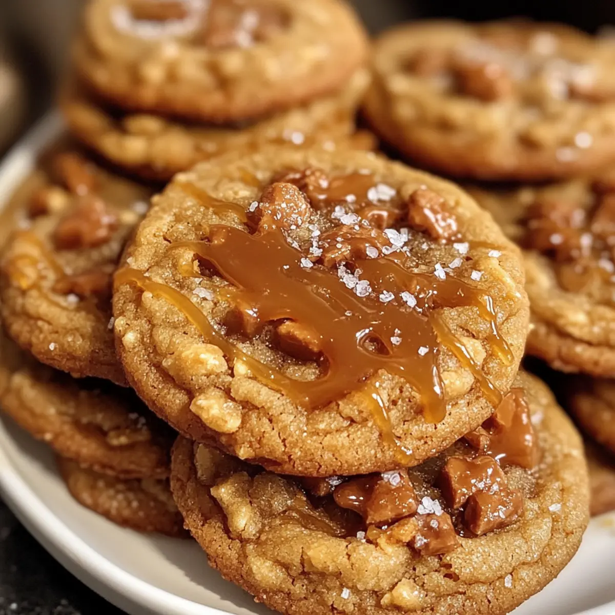Sobald der köstliche Duft von frisch gebackenen Keksen durch die Küche zieht, bringt es mich sofort zurück in die Kindheit, als das Backen ein fester Bestandteil unserer Familientraditionen war. Die gesalzenen Karamell-Toffee-Kekse vereinen die süße, klebrige Verführung von Karamell mit dem knackigen Biss von Toffee-Stückchen. Dieses Rezept ist nicht nur schnell zubereitet, sondern sorgt auch für Begeisterung bei Familie und Freunden – perfekt für gemütliche Herbstabende oder festliche Anlässe. Wenn du Lust auf eine köstliche Kombination aus Aromen und Texturen hast, dann sind diese Kekse genau das Richtige für dich. Bist du bereit, die Küche in ein wahres Duftparadies zu verwandeln? Warum sind diese Kekse so unwiderstehlich? Einzigartiger Geschmack: Die Kombination aus süßem Karamell und knackigem Toffee sorgt für ein Geschmackserlebnis, das sowohl jung als auch alt begeistert. Einfache Zubereitung: Mit nur wenigen grundlegenden Zutaten verwandelst du deine Küche in eine Backstube ohne großen Aufwand. Perfekt für Anlässe: Diese Kekse sind nicht nur ein Genuss, sondern auch ein echter Hingucker auf jeder Kaffeetafel oder beim nächsten Fest. Vielseitigkeit: Du kannst kreative Variationen ausprobieren, wie z.B. verschiedene Nüsse oder Schokoladenstückchen hinzufügen, um deine Kekse zu personalisieren. Wohltuende Kindheitserinnerungen: Der Duft frisch gebackener Kekse weckt sentimental die schönsten Erinnerungen aus der Kindheit. Diese gesalzenen Karamell-Toffee-Kekse sind ein Genuss, der Geborgenheit bringt. Zutaten für gesalzene Karamell-Toffee-Kekse • Diese köstlichen gesalzenen Karamell-Toffee-Kekse verlangen nach den besten Zutaten für ein optimales Geschmackserlebnis. Für den Teig: Ungesalzene Butter – sorgt für Reichhaltigkeit und Feuchtigkeit; verwende zimmerwarme Butter für eine bessere Textur. Hellbrauner Zucker – fügt Süße und einen Hauch von Melasse hinzu; dunkler brauner Zucker kann für ein intensiveres Aroma verwendet werden. Ei – bindet die Zutaten und trägt zur Struktur der Kekse bei; nutze ein zimmerwarmes Ei für einfacheres Mischen. Reiner Vanilleextrakt – verstärkt den Gesamteindruck; Imitat-Vanille ist eine kostengünstige Alternative. Unbehandelte Mehl – sorgt für die Struktur der Kekse; achte darauf, das Mehl korrekt zu messen, um dichte Kekse zu vermeiden. Backpulver – ein Treibmittel, das hilft, die Kekse aufgehen zu lassen. Natron – arbeitet mit dem Backpulver für eine luftige Textur. Salz – verstärkt die Aromen und balanciert die Süße. Für die Füllung: Karamellstücke – sorgen für süße, klebrige Pockets; können durch Schokoladenstückchen ersetzt werden, wenn du einen anderen Geschmack ausprobieren möchtest. Toffee-Stücke – bringen eine knusprige Textur ein; können gegen gehackte Nüsse für zusätzlichen Crunch oder Geschmack ausgetauscht werden. Schritt-für-Schritt-Anleitung für gesalzene Karamell-Toffee-Kekse Step 1: Ofen vorheizen und Blech vorbereiten Heize den Ofen auf 175 Grad Celsius vor und lege ein Backblech mit Backpapier aus. Dies sorgt dafür, dass die Kekse beim Backen nicht kleben bleiben und schön gleichmäßig durchbacken. Achte darauf, dass der Ofen die richtige Temperatur erreicht, bevor du die Teigportionen hineinlegst. Step 2: Butter weich machen Erweiche die ungesalzene Butter in der Mikrowelle für etwa 20 Sekunden, dabei darauf achten, dass sie nicht schmilzt. Die Butter sollte weich, aber nicht flüssig sein, damit sie sich besser mit dem Zucker vermischen lässt und die gesalzenen Karamell-Toffee-Kekse eine perfekte Textur erhalten. Step 3: Butter und Zucker vermengen Gib die weiche Butter zusammen mit dem hellbraunen Zucker in eine Rührschüssel. Schlage die Mischung mit einem Handmixer oder einer Küchenmaschine, bis sie leicht und fluffig ist. Dies dauert ungefähr 2-3 Minuten und sorgt dafür, dass die Kekse beim Backen schön luftig werden. Step 4: Ei und Vanille hinzufügen Füge das zimmerwarme Ei und den reinen Vanilleextrakt zur Butter-Zucker-Mischung hinzu. Rühre alles gut durch, bis die Zutaten gut miteinander verbunden sind. Achte darauf, dass die Masse gleichmäßig ist, um sicherzustellen, dass jeder Biss in den gesalzenen Karamell-Toffee-Keksen voll von Geschmack ist. Step 5: Trockene Zutaten mischen Siebe das unbehandelte Mehl, das Backpulver, das Natron und das Salz in eine separate Schüssel. Dann gib die trockenen Zutaten langsam zur feuchten Mischung hinzu. Rühre alles vorsichtig zusammen, bis gerade so alles vermischt ist, um eine Übermischung zu vermeiden, die die Kekse zäh machen kann. Step 6: Karamell und Toffee einarbeiten Falte nun vorsichtig die Karamell- und Toffee-Stücke unter den Teig. Stelle sicher, dass die Stücke gleichmäßig verteilt sind, um den gesalzenen Karamell-Toffee-Keksen eine köstliche Süße und den perfekten Crunch zu verleihen. Halte ein paar Stücke für die Dekoration zurück. Step 7: Teig portionieren Verwende einen Esslöffel oder einen Eisportionierer, um gleichmäßige Portionen des Teigs auf das Backblech zu setzen. Lasse genügend Abstand zwischen den Teigportionen, damit die Kekse beim Backen Platz haben, sich auszubreiten und schön gleichmäßig golden zu werden. Step 8: Kekse backen Schiebe das Backblech in den vorgeheizten Ofen und backe die Kekse für etwa 10-11 Minuten, bis die Ränder goldbraun sind. Sie sollten in der Mitte noch etwas weich wirken, da sie beim Abkühlen fest werden. Behalte die Kekse im Auge, um das perfekte Backergebnis zu erzielen. Step 9: Kekse nach dem Backen formen Nimm die Kekse nach dem Backen aus dem Ofen und forme sie vorsichtig mit einem Löffel nach, solange sie noch warm sind. Diese Technik sorgt dafür, dass sie eine schöne, gleichmäßige Form haben und die gesalzenen Karamell-Toffee-Kekse besonders ansprechend aussehen. Step 10: Abkühlen und dekorieren Lasse die Kekse auf einem Kuchengitter abkühlen. Während sie sich setzen, kannst du die zurückbehaltene