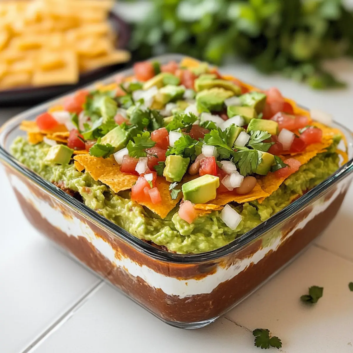 Gesunde 7-Schichten-Bohnen-Dip mit griechischem Joghurt – der perfekte Snack für gesellige Abende.