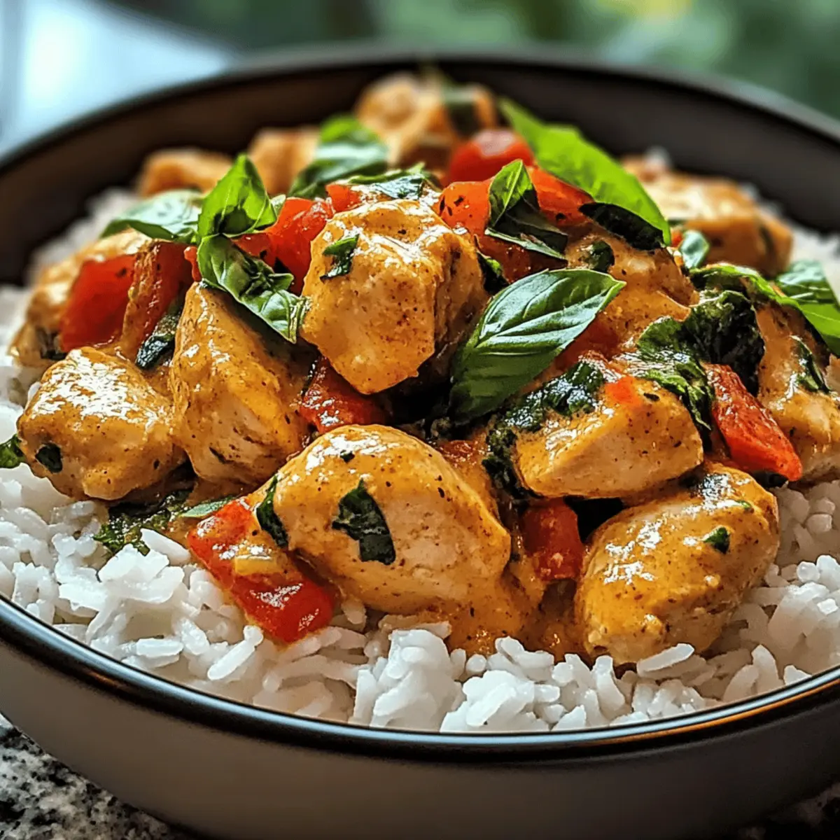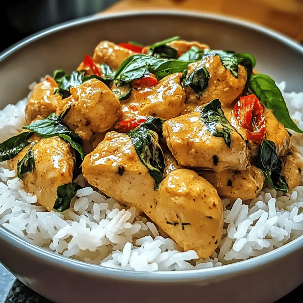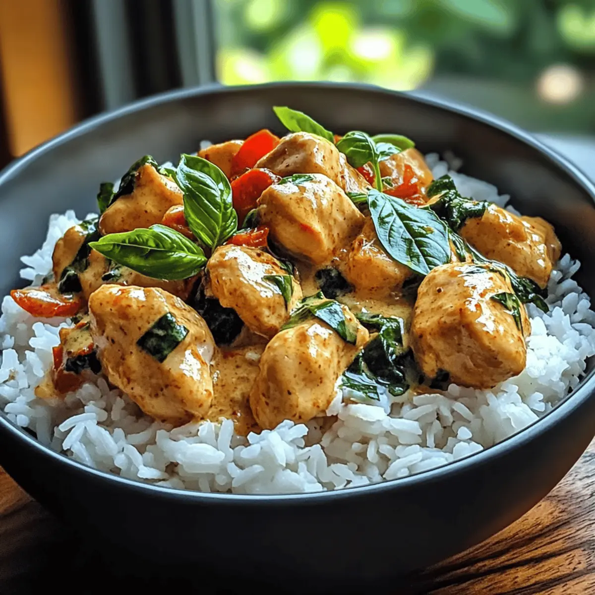 Dieses Gewürzte Kokosnuss-Basilikum-Hühnchen mit Reis vereint tropische Aromen mit einfacher Zubereitung für ein schnelles und leckeres Abendessen.