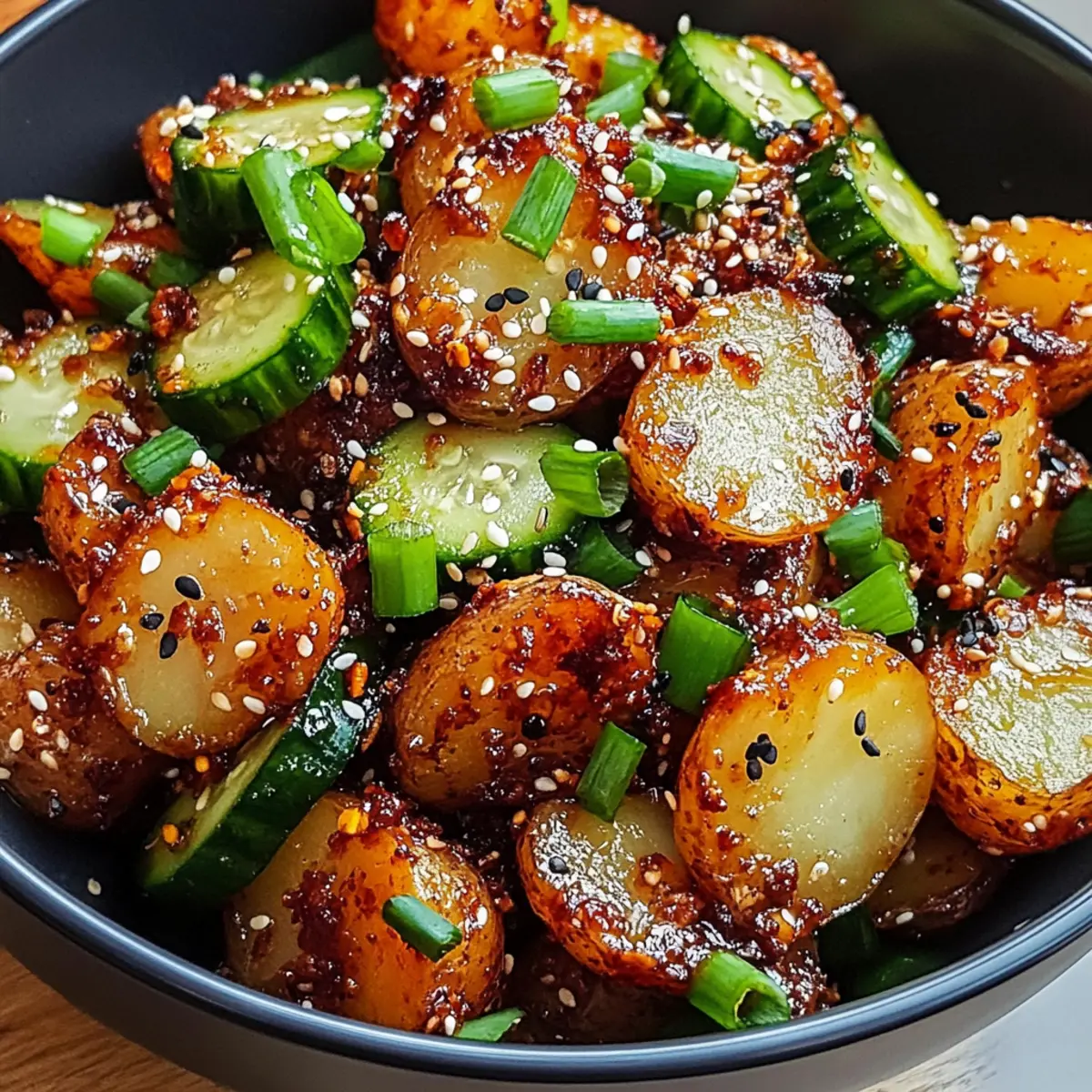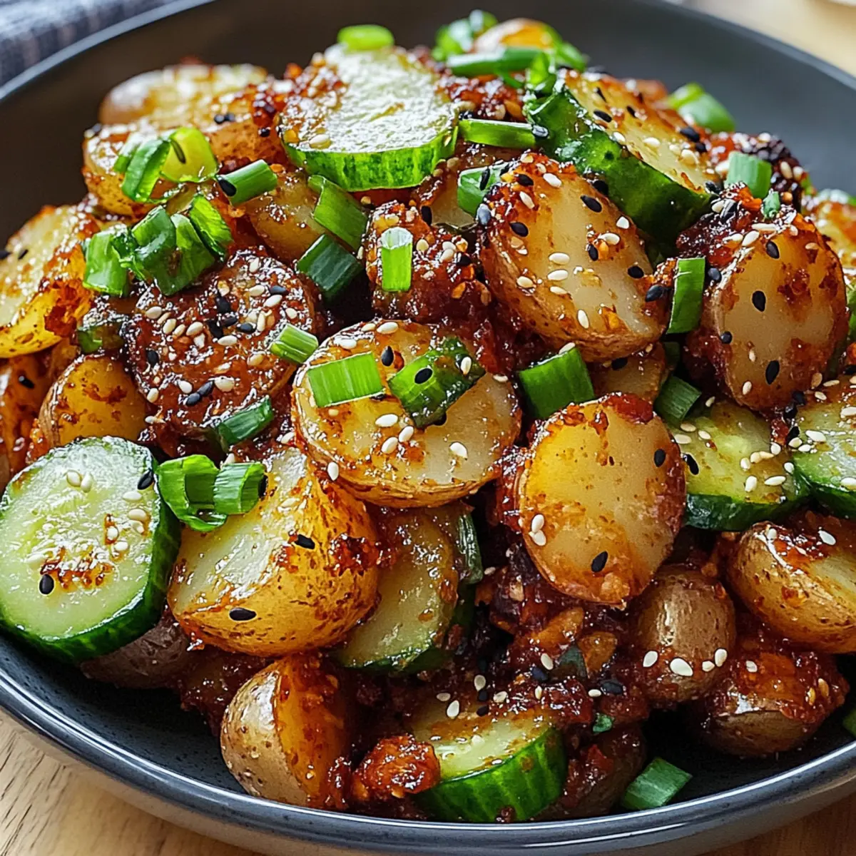 Als ich neulich in meiner Küche stand, überkam mich die Lust auf etwas Neues und Aufregendes. Die Erfahrung, die nach dem ersten Biss des Crispy Gochujang Kartoffelsalats folgt, ist einfach unwiderstehlich. Diese Mischung aus knusprigen, gerösteten Kartoffeln und einer knalligen, würzigen Sauce ist nicht nur ein Augenschmaus, sondern auch eine vollwertige Freude für den Gaumen. Außerdem ist dieser Salat blitzschnell zuzubereiten und anpassbar für verschiedene Diäten, sodass er ideal für ein Familienessen oder eine gesellige Runde ist. Egal, ob als Beilage zu Gegrilltem oder als erfrischende Hauptspeise, dieser Gochujang Kartoffelsalat wird garantiert bei jedem Anlass ein Hit! Bist du bereit, deine Geschmacksknospen auf eine neue Reise zu schicken? Warum wirst du diesen Gochujang Kartoffelsalat lieben? Einzigartiger Geschmack: Die Kombination aus knusprigen Kartoffeln und würziger Gochujang-Sauce bringt Farbtupfer auf den Tisch. Einfach zuzubereiten: Selbst Anfänger können sich diesen kreativen Salat in kürzester Zeit zubereiten. Vielseitig: Egal ob vegan, glutenfrei oder mit zusätzlichen Zutaten – der Salat passt sich deinen Vorlieben an. Perfekte Beilage oder Hauptgericht: Ideal für Grillabende, Picknicks oder als frisches Hauptgericht – dieser Salat ist der Publikumsliebling! Frisch und Crunchy: Mit einem köstlichen Crunch bei jedem Bissen erlebst du eine Geschmacksexplosion, die begeistert. Gochujang Kartoffelsalat Zutaten • Diese Zutaten sorgen für das ultimative Geschmackserlebnis! Für die Kartoffeln Baby Kartoffeln – Sie sorgen für eine buttrige Textur; Yukon Gold oder rote Sorten sind ideal. Olivenöl – Unentbehrlich für das Rösten und sorgt für knusprige Ergebnisse. Salz, schwarzer Pfeffer, Knoblauchpulver – Diese Gewürze heben den natürlichen Kartoffelgeschmack hervor. Für das Dressing Gochujang – Die fermentierte Chili-Paste verleiht dem Salat seine charakteristische würzige Süße; die Menge kann nach Geschmack angepasst werden. Honig oder Ahornsirup – Fügt eine angenehme Süße hinzu; Ahornsirup ist eine großartige vegane Option. Reisessig – Notwendig für die Auffrischung der Aromen und sorgt für die nötige Säure. Sojasauce oder Tamari – Bringt herzhaften Geschmack; Tamari ist glutenfrei. Sesamöl – Ein Spritzer fügt Nussigkeit hinzu und rundet den Geschmack ab. Mayonnaise oder griechischer Joghurt (optional) – Für eine cremige Note; griechischer Joghurt macht das Dressing leichter. Knoblauch (gehackt) & Ingwer (gerieben) – Frische Aromen, die das Geschmacksprofil des Salats anheben. Für die Garnitur Frühlingszwiebel – Gibt einen milden Zwiebelgeschmack ab und verbessert die Präsentation. Geröstete Sesamsamen – Fügen einen nussigen Crunch hinzu, ideal für die Dekoration. Gurke (in Scheiben) – Ein erfrischendes Element, das für einen angenehmen Kontrast sorgt. Kimchi (optional) – Sorgt für eine traditionelle koreanische Geschmacksnote. Knusprige Schalotten oder Erdnüsse (optional) – Für den extra Crunch und zusätzliche Geschmacksnuancen. Hinweis: Der Gochujang Kartoffelsalat kann mit vielen weiteren Zutaten nach deinem Geschmack angepasst werden! Schritt-für-Schritt-Anleitung für Gochujang Kartoffelsalat Step 1: Ofen vorheizen Heize den Ofen auf 220 °C (425 °F) vor und lege ein Backblech mit Backpapier aus. Diese Vorbereitung ist wichtig, damit die Kartoffeln gleichmäßig rösten und knusprig werden. Das Backpapier hilft, dass die Kartoffeln nicht ankleben und erleichtert die Reinigung. Step 2: Kartoffeln vorbereiten Wasche und trockne die Baby Kartoffeln gründlich. Halbieren oder vierteln sie je nach Größe und gib sie in eine große Schüssel. Vermische die Kartoffeln mit Olivenöl, Salz, schwarzem Pfeffer und Knoblauchpulver, sodass sie gleichmäßig bedeckt sind. Dies sorgt für intensiven Geschmack und lässt die Kartoffeln beim Rösten schön knusprig werden. Step 3: Kartoffeln rösten Verteile die vorbereiteten Kartoffeln gleichmäßig auf dem Backblech. Röste die Kartoffeln im vorgeheizten Ofen für etwa 35–40 Minuten, bis sie goldbraun und knusprig sind. Wende die Kartoffeln nach der Hälfte der Zeit, um sicherzustellen, dass sie von allen Seiten gleichmäßig garen. Die äußere Schicht sollte schön goldig sein. Step 4: Dressing zubereiten Während die Kartoffeln rösten, bereite das Dressing vor. In einer großen Schüssel vermischt du Gochujang, Honig oder Ahornsirup, Reisessig, Sojasauce oder Tamari und Sesamöl. Füge den gehackten Knoblauch und den geriebenen Ingwer hinzu und rühre alles gut durch, bis eine cremige Sauce entsteht, die die perfekt würzige Basis für deinen Gochujang Kartoffelsalat bildet. Step 5: Salat zusammenstellen Sobald die Kartoffeln knusprig und goldbraun sind, nimm sie aus dem Ofen und lass sie kurz abkühlen. Gib die warmen Kartoffeln in die Schüssel mit dem Dressing. Füge die gehackten Frühlingszwiebeln, gerösteten Sesamsamen, die in Scheiben geschnittene Gurke und optional Kimchi hinzu. Mische alle Zutaten vorsichtig, damit die Kartoffeln nicht zerbrechen, aber gut mit der würzigen Sauce bedeckt sind. Step 6: Servieren Serviere den Gochujang Kartoffelsalat warm oder kalt, je nach Vorliebe. Garniere ihn mit zusätzlichen Toppings wie knusprigen Schalotten oder Erdnüssen für den extra Crunch. Dieser Salat eignet sich hervorragend für ein gemütliches Essen oder eine gesellige Runde, und die aufregenden Aromen werden deine Gäste begeistern. Gochujang Kartoffelsalat im Voraus zubereiten Der Gochujang Kartoffelsalat ist perfekt für die Essensvorbereitung! Du kannst die Baby Kartoffeln bis zu 3 Tage im Voraus rösten und im Kühlschrank aufbewahren. Achte darauf, sie vollständig abkühlen zu lassen, bevor du sie in einem luftdichten Behälter lagerst, damit sie ihre Knusprigkeit behalten. Das Dressing lässt sich ganz einfach bis zu 24 Stunden vorher zubereiten – mische einfach alle Zutaten und bewahre es im Kühlschrank auf. Wenn du be