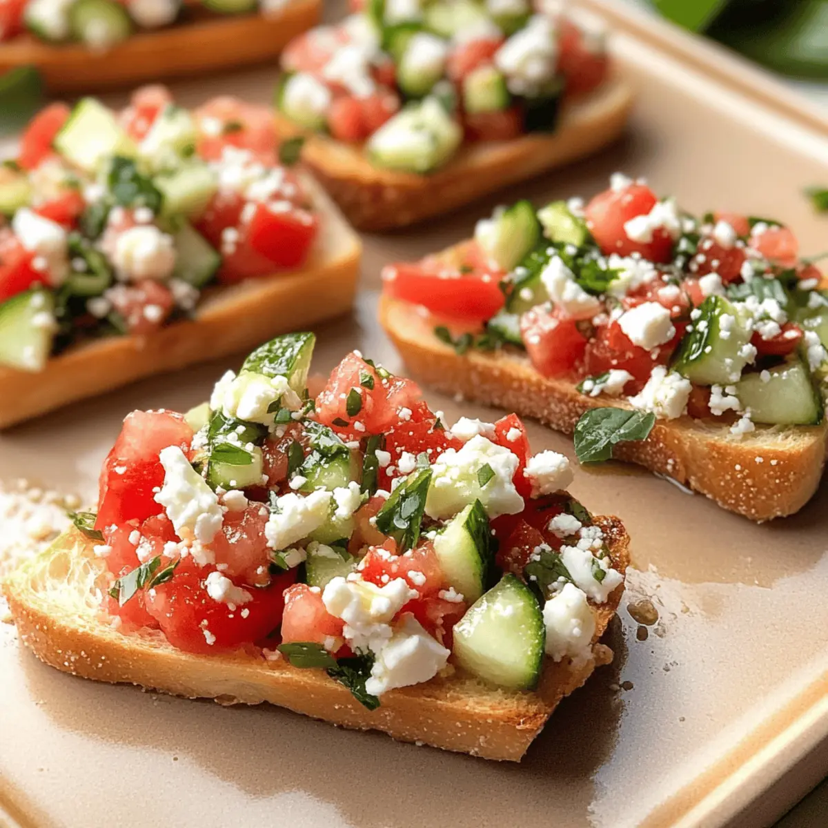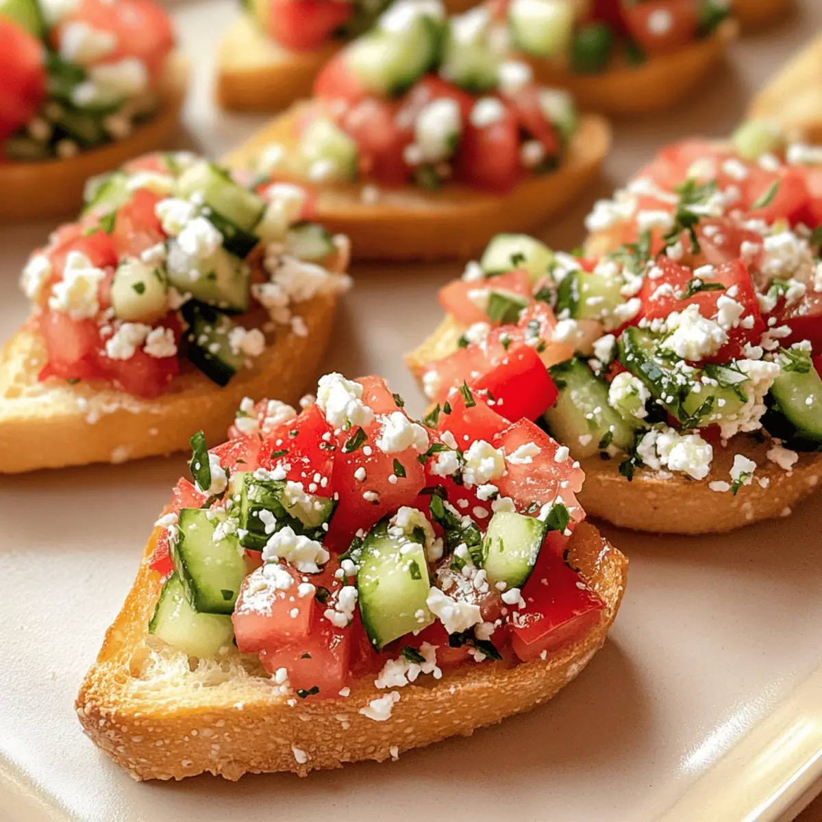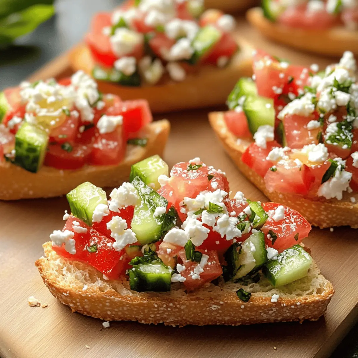 Wusstest du, dass ein einfaches Stück Brot in der Kombination mit frischem Gemüse und würzigem Feta zu einem Geschmackserlebnis verwandelt werden kann? Die Griechische Bruschetta ist nicht nur ein Fest für die Augen, sondern auch für den Gaumen! Dieses Rezept bringt die Aromen des Mittelmeerraums direkt in deine Küche – ideal für gesellige Abende oder als schneller Snack. In nur 20 Minuten erhältst du ein köstliches Gericht, das mit seinen knackigen Toppings und dem knusprigen Crostini selbst die anspruchsvollsten Gäste überzeugt. Egal, ob du ein leidenschaftlicher Koch oder einfach jemand bist, der nach einer gesunden und leckeren Vorspeise sucht, dieses Rezept wird dir den Tag versüßen. Bist du bereit, etwas Mediterranes in dein Zuhause zu bringen? Lass uns zusammen loslegen! Warum ist diese Bruschetta ein Muss? Schnell und einfach: Mit nur 20 Minuten Vorbereitungszeit ist die Griechische Bruschetta der perfekte Snack für jede Gelegenheit. Frische Aromen: Die Kombination aus knackigem Gemüse und cremigem Feta sorgt für einen Geschmack, der die Sinne begeistert. Vielseitig einsetzbar: Ob als elegante Vorspeise oder als Teil eines Mezze-Platters, diese Bruschetta passt immer gut dazu. Gesund und leicht: Mit nur etwa 77 Kalorien pro Portion ist sie eine guilt-free Option für bewusste Genießer. Wenn du die Aromen des Mittelmeers noch weiter erkunden möchtest, schau dir auch unser Rezept für Zitronenreis Griechischer Art an, das perfekt dazu passt! Griechische Bruschetta Zutaten Für das Crostini Baguette – Ideal als Basis, frisch gebacken oder vom Vortag. Für die Füllung Roma-Tomaten – Sie sorgen für die Frische und Saftigkeit; du kannst auch Kirschtomaten verwenden. Entkernte englische Gurke – Sie bringt Crunch und Frische; eine normale Gurke kann ebenfalls verwendet werden, wenn sie gut abgetropft ist. Frisch zerbröckelter Feta – Der cremige und salzige Geschmack; für eine andere Note kannst du auch Ziegenkäse verwenden. Gehackte Frühlingszwiebeln – Fügt einen milden Zwiebelgeschmack hinzu; ersetze sie durch Schalotten für eine süßere Option. Für das Dressing Zitrone – Bringt Frische; Limette kann ebenfalls eine tolle Alternative sein. Extra natives Olivenöl – Sorgt für reichhaltigen Geschmack; verwende Avocadoöl für eine leichtere Option. Rotweinessig – Erhöht die Säure; Apfelessig ist ein guter Ersatz. Knoblauchpulver – Fügt Tiefe hinzu; frisch gehackter Knoblauch ist ebenfalls sehr aromatisch. Salz – Unverzichtbar für den Geschmack; nach Belieben hinzufügen. Frisch gemahlener schwarzer Pfeffer – Gibt eine leichte Schärfe; weißer Pfeffer kann eine mildere Note bieten. Getrocknete Oregano-Blätter – Ein klassisches mediterranes Gewürz; italienisches Gewürz kann eine passende Alternative sein. Getrockneter Dill – Verleiht einen einzigartigen Kräutergeschmack; frischer Dill verstärkt das Aroma. Getrocknetes Basilikum oder frisches Basilikum – Bringt aromatische Frische; frisches Basilikum ist vorzuziehen für einen intensiveren Geschmack. Genieße die Zubereitung deiner Griechischen Bruschetta und entdecke, wie einfach es ist, den Zauber des Mittelmeers in dein Zuhause zu holen! Schritt-für-Schritt-Anleitung für Griechische Bruschetta Schritt 1: Backofen vorheizen Heize deinen Backofen auf 190°C (375°F) vor. Dies ist wichtig, um sicherzustellen, dass dein Crostini richtig knusprig wird. Während der Ofen aufheizt, kannst du die Baguette-Scheiben vorbereiten. Schritt 2: Baguette schneiden Schneide das Baguette in 24 gleichmäßige Rundscheiben oder halbiere es längs, um größere Stücke zu erhalten. Achte darauf, dass die Scheiben etwa 1-2 cm dick sind, damit sie beim Backen schön goldbraun und knusprig werden. Schritt 3: Baguette belegen Lege die geschnittenen Baguette-Scheiben auf ein Backblech und bestreiche beide Seiten großzügig mit hochwertigem, extra nativem Olivenöl. Dies verleiht den Crostini nicht nur Geschmack, sondern sorgt auch für eine appetitliche, goldene Farbe. Schritt 4: Crostini backen Backe das Baguette im vorgeheizten Ofen für 5 Minuten. Drehe die Scheiben vorsichtig um und backe sie anschließend für weitere 5-7 Minuten, bis sie goldbraun und knusprig sind. Achte darauf, dass sie nicht verbrennen! Schritt 5: Gemüse vorbereiten Während die Crostini backen, würfle die Roma-Tomaten und die Gurke fein. Hacke die Frühlingszwiebeln und bröckle den Feta-Käse. Diese frischen Zutaten bieten eine bunte und geschmackvolle Grundlage für deine Griechische Bruschetta. Schritt 6: Dressing zubereiten In einer großen Schüssel vermischst du den frisch gepressten Zitronensaft, Olivenöl, Rotweinessig, Knoblauchpulver, Salz, Pfeffer, Oregano, Dill und Basilikum. Rühre alles gut um, sodass die Aromen sich verbinden und eine köstliche Marinade entsteht. Schritt 7: Zutaten kombinieren Füge die vorbereiteten, gewürfelten Tomaten, Gurken, Frühlingszwiebeln und den Feta in die Schüssel mit dem Dressing hinzu. Mische alles vorsichtig, bis die Gemüsewürfel und der Feta gleichmäßig mit dem Dressing überzogen sind. Schritt 8: Servieren Nehme die knusprigen Crostini aus dem Ofen und löffle die Bruschetta-Mischung großzügig darauf. Die Kombination aus crunchy Crostini und frischem Gemüse wird deinen Gästen gefallen. Serviere die Griechische Bruschetta sofort, damit sie frisch und köstlich bleibt! Was passt zu Griechischer Bruschetta? Die Griechische Bruschetta ist nicht nur ein Augenschmaus, sondern auch eine geschmackliche Offenbarung. Entdecke, wie du mit diesen köstlichen Begleitern ein rundum gelungenes Menü zaubern kannst. Cremige Hummus: Mit ihrem nussigen Geschmack ergänzt Hummus die frischen Aromen der Bruschetta perfekt. Serviere ihn als Dip für zusätzlichen Genuss. Würzige Oliven: Ein Mix aus griechischen Oliven bringt salzige, herzhafte Noten ins Spiel und harmoniert wunderbar mit der Frische der Bruschetta. Erfrischender Salat: Ein einfacher grüner Salat mit Zitronen