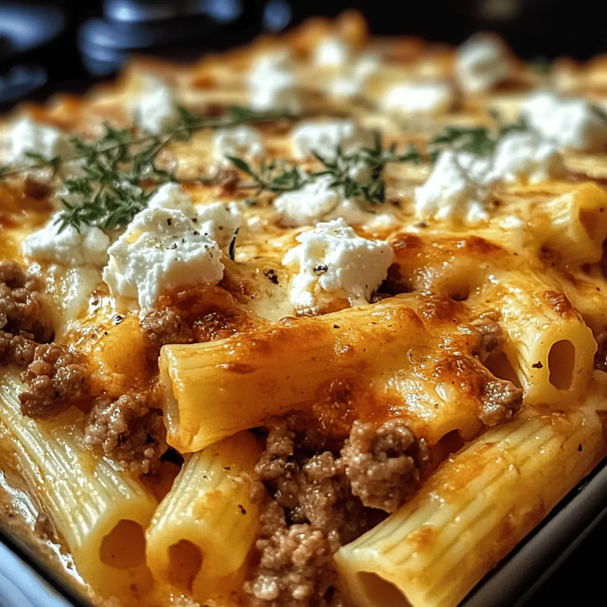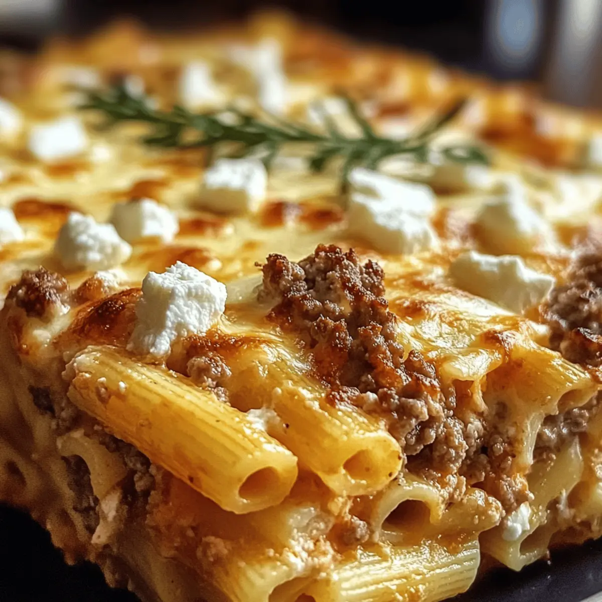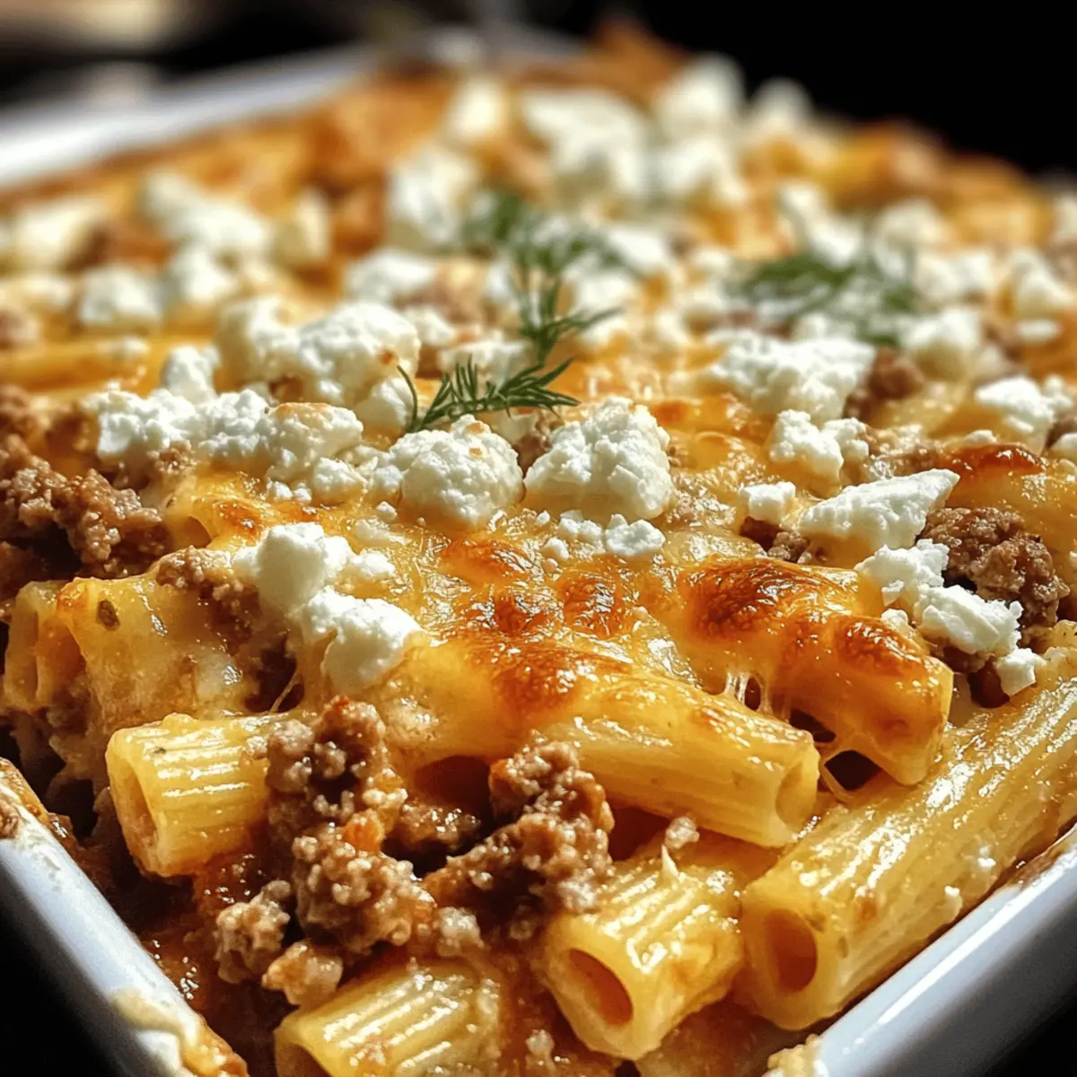 Ein verführerischer Duft von frisch gebackenem griechischem Nudel-Auflauf mit Feta und Hackfleisch zieht durch die Küche, während ich darauf warte, dass die Käsekruste goldbraun wird. Diese köstliche, herzhafte Speise ist nicht nur ein Gaumenschmaus, sondern auch blitzschnell zubereitet und eignet sich perfekt für jede Familie. Mit einer Kombination aus zarten Kritharaki, würzigem Hackfleisch und schmelzendem Feta wird jeder Bissen zum kulinarischen Genuss, der Erinnerungen an warme Sommerabende am Mittelmeer wachruft. Ob für ein schnelles Abendessen unter der Woche oder als Highlight einer festlichen Zusammenkunft – dieser Auflauf ist einfach unschlagbar! Neugierig, wie Sie dieses herzliche Gericht zu Hause zubereiten können? Lassen Sie uns gemeinsam in die Zubereitung eintauchen! Warum wird dieser Auflauf Ihr Favorit? Einfache Zubereitung: Selbst wenn Sie neu in der Küche sind, gelingt dieser griechische Nudel-Auflauf mit Feta und Hackfleisch im Handumdrehen. Wunderbarer Geschmack: Die Kombination aus würzigem Hackfleisch und cremigem Feta sorgt für eine Geschmacksexplosion, die jeder lieben wird. Familienfreundlich: Kinder und Erwachsene werden gleichermaßen begeistert sein, was dieses Gericht perfekt für gemeinsame Mahlzeiten macht. Vielseitig und anpassbar: Fügen Sie nach Belieben Gemüse wie Paprika oder Spinat hinzu, um noch mehr Nährstoffe und Geschmack zu integrieren. Zeitsparend: Die Zubereitung ist schnell, perfekt für geschäftige Tage oder wenn Sie spontane Gäste haben. Köstlicher Komfort: Dieses Gericht ist wie eine Umarmung auf dem Teller – es bringt Wärme und Freude in jeden Bissen und erinnert an die mediterrane Küche. Werfen Sie auch einen Blick auf die Rezepte für Cremige Rinder Nudeln oder Zartes Rinderbraten Mit zur Abwechslung! Griechischer Nudel-Auflauf Zutaten • Entdecken Sie, was Sie für diesen köstlichen griechischen Nudel-Auflauf mit Feta und Hackfleisch benötigen! Für die Nudeln Kritharaki – Diese griechischen Reisnudeln bilden die perfekte Basis für das Gericht und sorgen für eine einzigartige Textur. Wenn nicht verfügbar, verwenden Sie Orzo als Ersatz. Für die Sauce Hackfleisch – Verleiht dem Auflauf Protein und würzigen Geschmack; kann durch Putenhackfleisch oder eine pflanzliche Alternative ersetzt werden, um eine leichtere Variante zu erhalten. Zwiebel, fein gewürfelt – Fügt der Sauce Süße und Tiefe hinzu; jede aromatische Zwiebelvariante funktioniert hier. Knoblauch, gehackt – Hebt das Gesamtgeschmackserlebnis hervor; bei Bedarf kann Knoblauchpulver verwendet werden. Olivenöl – Für das Sautieren von Zwiebel und Fleisch, was zur Reichhaltigkeit beiträgt; kann durch Pflanzenöl ersetzt werden, wenn nötig. Gehackte Tomaten aus der Dose – Bildet die Basis für die Sauce, liefert Feuchtigkeit und Säure; frische Tomaten sind ebenfalls möglich, müssen jedoch geschält und entkernt werden. Tomatenmark – Intensiviert den Tomatengeschmack der Sauce; kann durch mehr gehackte Tomaten ersetzt werden, wobei weniger verwendet werden sollte, um überschüssige Feuchtigkeit zu vermeiden. Oregano und Thymian – Sorgen für klassische mediterrane Aromen; andere Kräuter wie Basilikum oder Rosmarin können als Ersatz genutzt werden. Zimt (optional) – Gibt einen warmen, einzigartigen Geschmack, der zur griechischen Küche gehört; kann weggelassen oder durch Muskatnuss ersetzt werden. Salz & Pfeffer – Unentbehrlich zum Würzen; nach Geschmack anpassen. Für den Belag Feta, zerbröselt – Fügt den charakteristischen griechischen Geschmack und Cremigkeit hinzu; kann durch Ziegenkäse für einen anderen Geschmack ersetzt werden. Geriebener Gouda oder Mozzarella – Für den Belag und zusätzliche Cremigkeit; verwenden Sie jeden geschmolzenen Käse, den Sie bevorzugen. Damit haben Sie alle Zutaten, die Sie für diesen köstlichen griechischen Nudel-Auflauf mit Feta und Hackfleisch benötigen. Viel Spaß beim Kochen! Schritt-für-Schritt-Anleitung für Griechischer Nudel-Auflauf mit Feta und Hackfleisch Step 1: Nudeln kochen Bringen Sie einen großen Topf mit gesalzenem Wasser zum Kochen und fügen Sie die Kritharaki hinzu. Kochen Sie die Nudeln gemäß der Packungsanweisung, bis sie al dente sind, und schöpfen Sie sie dann mit einem Sieb ab. Lassen Sie die Nudeln gut abtropfen und stellen Sie sie beiseite, während Sie die Sauce zubereiten. Step 2: Gemüse anbraten Erhitzen Sie in einer großen Pfanne bei mittlerer Hitze 2 Esslöffel Olivenöl. Fügen Sie die fein gewürfelte Zwiebel und den gehackten Knoblauch hinzu und sautieren Sie sie, bis die Zwiebel weich und glasig ist, was etwa 5 Minuten dauert. Rühren Sie regelmäßig um, um sicherzustellen, dass der Knoblauch nicht verbrennt und die Aromen gut zur Geltung kommen. Step 3: Fleisch anbraten Geben Sie das Hackfleisch in die Pfanne mit den Zwiebeln und dem Knoblauch. Zerteilen Sie das Fleisch mit einem Holzlöffel und braten Sie es an, bis es gleichmäßig braun und durchgegart ist, etwa 8-10 Minuten. Achten Sie darauf, das Fleisch gut zu vermengen, damit es gleichmäßig kocht und seine Aromen entfaltet. Step 4: Sauce zubereiten Rühren Sie das Tomatenmark und die gehackten Tomaten in die Pfanne mit dem angebratenen Fleisch. Fügen Sie Oregano, Thymian, Zimt (falls verwendet), Salz und Pfeffer hinzu. Lassen Sie die Sauce für etwa 10-15 Minuten bei schwacher Hitze köcheln, bis sie leicht eingedickt ist und die Aromen gut miteinander verschmelzen. Step 5: Mischen und schichten Vermengen Sie die abgetropften Kritharaki mit der Fleischsauce in der Pfanne, bis alles gut durchmischt ist. Fetten Sie eine Auflaufform mit etwas Olivenöl ein und geben Sie die Mischung hinein. Streuen Sie den zerbröselten Feta und den geriebenen Käse gleichmäßig über die oberste Schicht, um eine köstliche Käsekruste zu schaffen. Step 6: Backen Heizen Sie den Ofen auf 180 °C vor. Stellen Sie die vorbereitete Auflaufform in den Ofen und backen Sie den Auflauf für 20 Minu