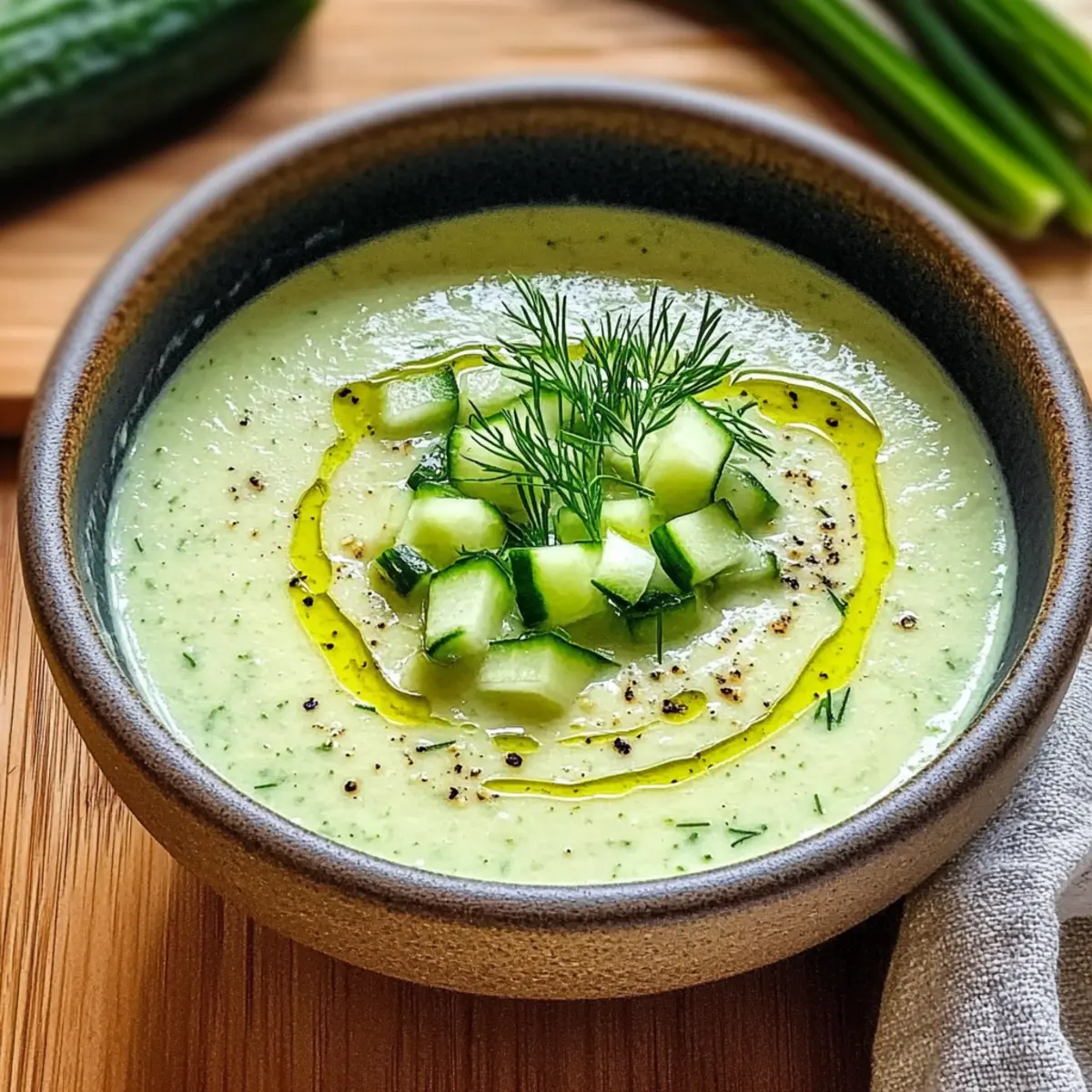 Es ist heiß draußen, der Sommer lässt grüßen! Wenn ich an erfrischende Gerichte denke, kommt mir sofort mein Lieblingsrezept für Gurken-Gazpacho in den Sinn. Mit diesem Rezept verwandele ich einfache Zutaten wie knackige Gurken, cremigen griechischen Joghurt und frische Kräuter in eine köstliche kalte Suppe, die nicht nur leicht zuzubereiten ist, sondern auch perfekt für laue Sommerabende. Diese Gurken-Gazpacho ist nicht nur ein echter Publikumsmagnet, sondern auch gesund und wahnsinnig erfrischend – ideal für alle, die dem Fast-Food-Alltag entkommen möchten. Und wie wäre es damit: Mit einem Hauch Zitronensaft und aromatischem Dill hast du in nur wenigen Minuten ein kleines Meisterwerk auf dem Tisch. Bist du bereit für einen köstlichen Sommer? Wusstest du, dass Gazpacho gesund ist? Erfrischend und nahrhaft: Dieses Gurken-Gazpacho ist die perfekte Antwort auf heiße Sommertage, da es nicht nur köstlich, sondern auch leicht und gesund ist. Einfache Zubereitung: Die Zutaten sind unkompliziert und erfordern kaum Kochkenntnisse, sodass du schnell ein ausgefallenes Gericht zaubern kannst. Vielseitig kombinierbar: Serviere es als Vorspeise, Snack oder Teil eines Buffets – es wird stets begeistern! Zeitersparnis: In nur wenigen Minuten zubereitet und dann gekühlt, sodass du mehr Zeit mit deinen Liebsten verbringen kannst. Optisch ansprechend: Diese kalte Suppe sieht nicht nur lecker aus, sondern überzeugt auch durch ihre lebendigen Farben. Hol dir diese Erfrischung für deine nächste Sommerabend-Veranstaltung! Gurken-Gazpacho Zutaten Für die Grundzutaten Gurken – Sie sind die Hauptzutat und sorgen für Frische und Hydration; verwende englische Gurken für ihre knackige Textur und minimalen Kerne. Griechischer Joghurt – Dieser verleiht eine cremige Konsistenz und einen leicht säuerlichen Geschmack; ersetze ihn durch pflanzlichen Joghurt für eine vegane Variante. Extra vergine Olivenöl – Für reichhaltigen Geschmack und eine fruchtige Note; unverzichtbar für die Tiefe des Gerichts. Zitronensaft – Fügt Helligkeit und Säure hinzu, um das Gericht auszubalancieren. Rotweinessig – Bietet einen subtilen, säuerlichen Geschmack, der die frischen Zutaten ergänzt. Frischer Dill – Verleiht eine aromatische Frische; kann bei Bedarf durch Basilikum, Minze oder Petersilie ersetzt werden. Salz und Pfeffer – Unverzichtbar für die Würze und um den Gesamtgeschmack zu heben. Für die Garnitur Frische Scallions – Diese bringen zusätzlichen Geschmack und eine schöne Farbe als Garnitur. Zusätzliche Gurkenscheiben – Ideal, um das Gazpacho zu garnieren und eine schöne Präsentation zu erzielen. Dieses erfrischende Gurken-Gazpacho ist nicht nur ein Genuss für den Gaumen, sondern bringt auch Farbe und Vitalität auf deinen Tisch! Step-by-Step Instructions für Gurken-Gazpacho Step 1: Zutaten vorbereiten Schneide die Gurken in grobe Stücke; es ist nicht nötig, sie zu schälen, wenn du englische Gurken verwendest. Hacke frischen Dill und schneide die Frühlingszwiebeln für die Garnitur in feine Ringe. Stelle sicher, dass alle Zutaten frisch sind, um den besten Geschmack für deine Gurken-Gazpacho zu erzielen. Step 2: Alles zusammenmixen Gebe die vorbereiteten Gurken, den griechischen Joghurt, das Olivenöl, den Zitronensaft, den Rotweinessig und den Dill in einen Mixer. Mixe alles bei hoher Geschwindigkeit, bis die Mischung vollkommen glatt und cremig ist. Füge nach Bedarf einen Schuss kaltes Wasser hinzu, um eine gewünschte Konsistenz zu erreichen. Step 3: Abgeschmecken Probiere die Gazpacho und verleihe ihr mit Salz und Pfeffer den letzten Schliff. Mixe die Mischung erneut für ein paar Sekunden, damit sich die Gewürze gleichmäßig verteilen. Achte darauf, dass der Geschmack frisch und ausgewogen ist, damit deine Gurken-Gazpacho köstlich bleibt. Step 4: Kühlen Gieße die Gazpacho in einen luftdichten Behälter und stelle diesen für mindestens 2-3 Stunden in den Kühlschrank. So meldet sich der Geschmack optimal und das Gericht wird schön kühl. Wenn du mehr Zeit hast, lasse die Gazpacho noch länger kühlen, damit die Aromen sich intensivieren. Step 5: Servieren und Anrichten Nach dem Kühlen schmecke die Gazpacho erneut ab und passe die Würze nach Bedarf an. Serviere die kalte Suppe in hübschen Schalen oder Gläsern und garniere sie mit den geschnittenen Frühlingszwiebeln, einem Schuss Olivenöl und eventuell einigen zusätzlichen Gurkenscheiben. Vorausplanung für dein Gurken-Gazpacho Diese Gurken-Gazpacho ist ideal für die Vorausplanung, sodass du Zeit an hektischen Sommertagen sparen kannst! Bereite die Zutaten wie Gurken, Dill und Frühlingszwiebeln bis zu 24 Stunden im Voraus vor, indem du sie schnittbereit lagerst. Mische die Hauptzutaten (Gurken, griechischer Joghurt, Olivenöl, Zitronensaft, Rotweinessig und Dill) und bewahre die Mischung in einem luftdichten Behälter im Kühlschrank für 2-3 Tage auf, um die Aromen zu intensivieren. Achte darauf, vor dem Servieren die Gazpacho erneut abzuschmecken und bei Bedarf nachzuwürzen. So bleibt dein Gericht frisch und schmeckt einfach köstlich – perfekt für eine schnelle, gesunde Mahlzeit an sommerlichen Tagen! Gurken-Gazpacho Variationen & Alternativen Lass mich dir zeigen, wie du dieses erfrischende Gurken-Gazpacho nach deinem Geschmack anpassen kannst! Vegan: Verwandle die Gazpacho, indem du griechischen Joghurt durch pflanzlichen Joghurt ersetzt. So bleibt das Gericht vegan und ebenso cremig! Kräuterwechsel: Nutze statt Dill frische Minze oder Basilikum für eine überraschende Geschmacksrichtung. Diese Kräuter bringen eine neue aromatische Frische ins Spiel! Schärfer: Für einen kleinen Kick füge beim Mixen eine halbe Jalapeño oder eine Prise Chiliflocken hinzu. Dies gibt deinem Gazpacho eine aufregende, würzige Note, die begeistert. Fruity Twist: Experimentiere mit einem Schuss Wassermelone oder Honigmelone im Mix. Diese süßen Aromen harmonieren wunderbar mit dem erdigen Geschmack d