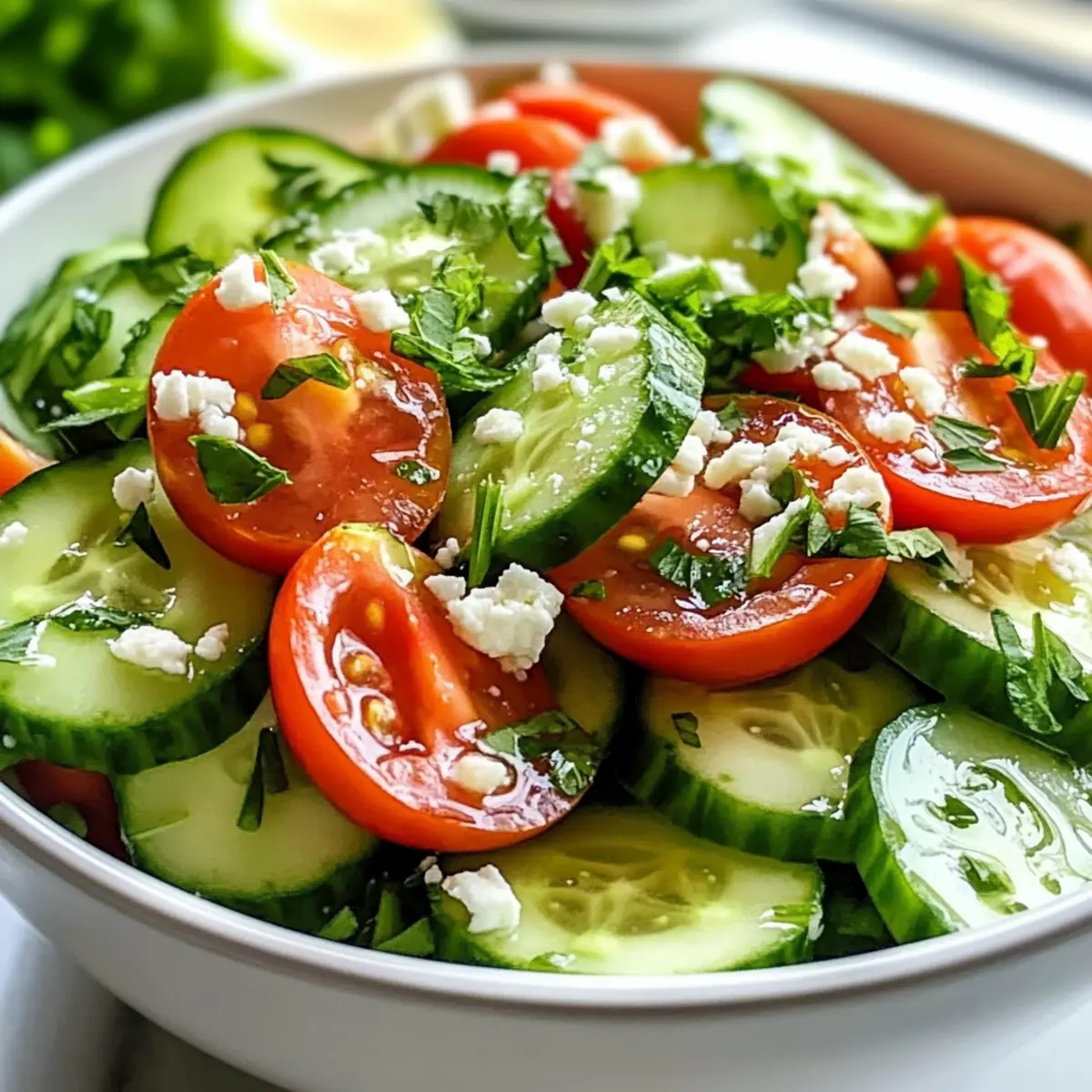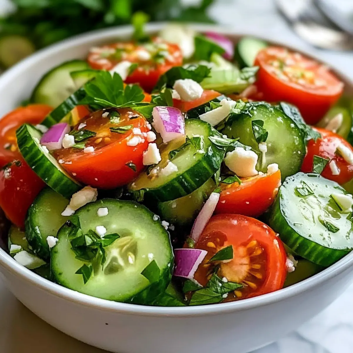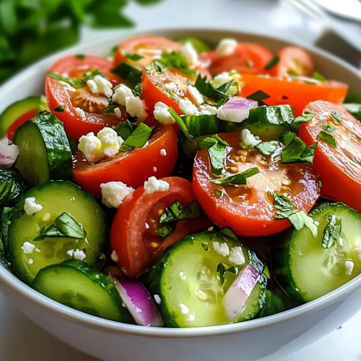 Stell dir vor, du sitzt an einem warmen Sommertag im Garten, und ein erfrischender Wind weht durch die Luft. Genau in diesem Moment kommt der Gurken-Tomaten-Salat auf den Tisch – ein leichter, gesunder Genuss, der nicht nur frisch schmeckt, sondern auch im Handumdrehen zubereitet ist. Diese einfache und köstliche Kombination aus knackigen Gurken und saftigen Tomaten ist perfekt für die Grillparty oder als Fast-Food-Ersatz an heißen Tagen. Du kannst ihn nach Belieben mit frischen Kräutern oder verschiedenen Dressings gestalten, sodass er immer wieder aufs Neue begeistert. Bist du bereit, die frische Leichtigkeit dieses Salats zu entdecken? Lass uns gemeinsam in die Zubereitung eintauchen! Warum ist dieser Salat so besonders? Frische Aromen: Dieser Gurken-Tomaten-Salat bringt das Beste des Sommers auf deinen Tisch – mit knackigen Gurken und saftigen Tomaten, die perfekt harmonieren. Einfach zuzubereiten: Mit nur wenigen Zutaten und in weniger als 15 Minuten zubereitet, ist dieser Salat ideal für Hektik im Alltag oder schnelle Grillpartys. Gesunde Wahl: Mit frischen Zutaten ist er nicht nur lecker, sondern auch gesund, ideal für eine ausgewogene Ernährung. Vielseitig anpassbar: Ob mit Feta, einer cremigen Joghurtsauce oder frischen Kräutern, du kannst den Salat nach deinem Geschmack abwandeln. Und wenn du noch mehr Ideen suchst, schau dir auch unseren Dip für Rohkost an! Crowd-Pleaser: Dieser Salat sieht nicht nur toll aus, sondern wird auch von Familie und Freunden gleichermaßen geliebt. So bringst du frischen Schwung in jedes Buffet! Zutaten für den Gurken-Tomaten-Salat • Dieser erfrischende Gurken-Tomaten-Salat ist so einfach zuzubereiten und voller Geschmack! Für den Salat Gurken – 2 große Gurken, geschält und in Scheiben geschnitten, liefern den idealen Crunch und viel Feuchtigkeit. Tomaten – 3 mittlere Tomaten oder eine Handvoll halbierte Cherrytomaten, die saftige Frische hinzufügen. Rote Zwiebel – ½ kleine rote Zwiebel, fein geschnitten, sorgt für einen leicht scharfen Biss. Frische Kräuter – 2 Esslöffel gehackte Petersilie oder Basilikum für extra Geschmack und eine schöne Präsentation. Olivenöl – 3 Esslöffel, die Basis für das Dressing und für eine reichhaltige Note. Rotweinessig oder Zitronensaft – 2 Esslöffel, um dem Salat Frische und Säure zu verleihen. Salz und Pfeffer – Zum Würzen nach Geschmack, damit alle Aromen zur Geltung kommen. Knoblauch (optional) – 1 kleine, gehackte Knoblauchzehe für einen zusätzlichen Geschmackskick. Feta-Käse (optional) – Ein wenig zerbröselter Feta, um dem Salat eine cremige Textur und zusätzlichen Geschmack zu verleihen. Für das Dressing Olivenöl, Rotweinessig oder Zitronensaft – Diese beiden Optionen verleihen dem Gurken-Tomaten-Salat die perfekte Balance von Licht und Säure. Schritt-für-Schritt-Anleitung für den Gurken-Tomaten-Salat Step 1: Gemüse vorbereiten Zuerst die Gurken und Tomaten vorbereiten. Die 2 großen Gurken schälen und in gleichmäßige Scheiben schneiden. Anschließend die 3 mittleren Tomaten waschen und entweder in Würfel schneiden oder, bei Cherrytomaten, halbieren. In einer großen Schüssel die geschnittenen Gurken und Tomaten zusammen mit ½ klein geschnittener roter Zwiebel vermengen, damit die Aromen gut zur Geltung kommen. Step 2: Frische Kräuter hinzufügen Jetzt die frischen Kräuter hinzufügen. 2 Esslöffel gehackte Petersilie oder Basilikum zur Schüssel geben und alles sanft unterheben, sodass die Kräuter gleichmäßig verteilt sind. Dies verleiht dem Gurken-Tomaten-Salat eine frische Note und steigert das visuelle Erlebnis. Bereite dich auf den nächsten Schritt vor, indem du eine kleine Schüssel für das Dressing bereitstellst. Step 3: Dressing anrühren In einer kleinen Schüssel 3 Esslöffel Olivenöl mit 2 Esslöffeln Rotweinessig oder Zitronensaft vermengen. Mit Salz und Pfeffer nach Geschmack würzen und alles kräftig mit einem Schneebesen oder einer Gabel verrühren, bis eine homogene Mischung entsteht. Das Dressing sollte gut emulgieren und eine glänzende, gleichmäßige Konsistenz haben, um den Salat perfekt zu verfeinern. Step 4: Dressing hinzufügen Das frisch vorbereitete Dressing gleichmäßig über die Gemüse-Mischung in der großen Schüssel gießen. Mit einem großen Löffel alles vorsichtig vermengen, sodass das Gemüse gut mit dem Dressing überzogen wird, aber die Textur erhalten bleibt. Achte darauf, die Gurken und Tomaten nicht zu zerdrücken. Dies sorgt dafür, dass der Gurken-Tomaten-Salat knackig bleibt. Step 5: Chillzeit genießen Optional: Den Gurken-Tomaten-Salat für 10-15 Minuten im Kühlschrank ruhen lassen, damit sich die Aromen noch besser entfalten. Dies fügt eine erfrischende Kühle hinzu und hebt den Geschmack auf ein neues Niveau. Bereite in der Zwischenzeit die Tischdeko oder das Hauptgericht vor, während der Salat um die Aufmerksamkeit der Aromen ringt. Step 6: Servieren und genießen Kurz vor dem Servieren kannst du nach Belieben etwas zerbröselten Feta-Käse über den Gurken-Tomaten-Salat streuen, um eine cremige Komponente hinzuzufügen. Dann in Schüsseln anrichten und genießen! Dieser Salat ist eine perfekte Begleitung zu Grillgerichten oder auch als leichtes Mittagessen an heißen Sommertagen geeignet. Meal Prep für den Gurken-Tomaten-Salat Der Gurken-Tomaten-Salat ist ideal für die Meal Prep und spart dir kostbare Zeit während hektischer Wochentage! Du kannst die 2 großen Gurken, die 3 Tomaten und die ½ kleine rote Zwiebel bis 24 Stunden im Voraus schneiden und in einem luftdichten Behälter im Kühlschrank aufbewahren. Um die Frische zu bewahren, füge die Kräuter und das Dressing erst kurz vor dem Servieren hinzu, da sie sonst ihre Knackigkeit verlieren. Für die finale Zubereitung musst du die vorbereiteten Zutaten nur in einer Schüssel mischen, das Dressing hinzufügen und eventuell Feta darüberstreuen – schon hast du einen köstlichen, erfrischenden Salat, der wie frisch zuberei