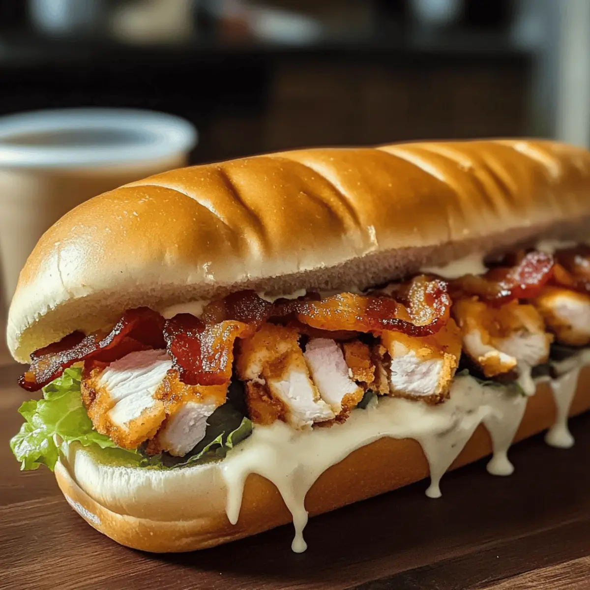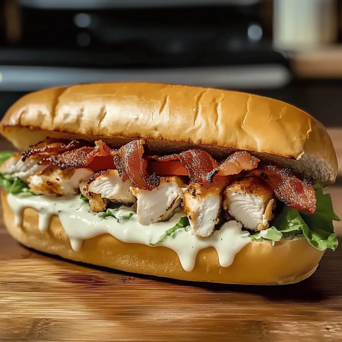 Ein köstlicher Hähnchen-Bacon-Ranch-Sub mit saftigem Hähnchen, knusprigem Bacon und cremigem Ranch-Dressing.