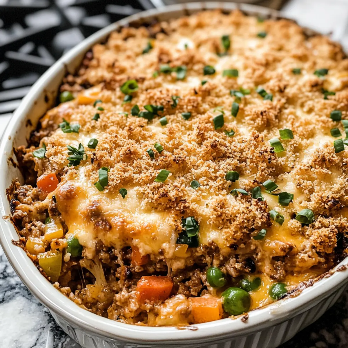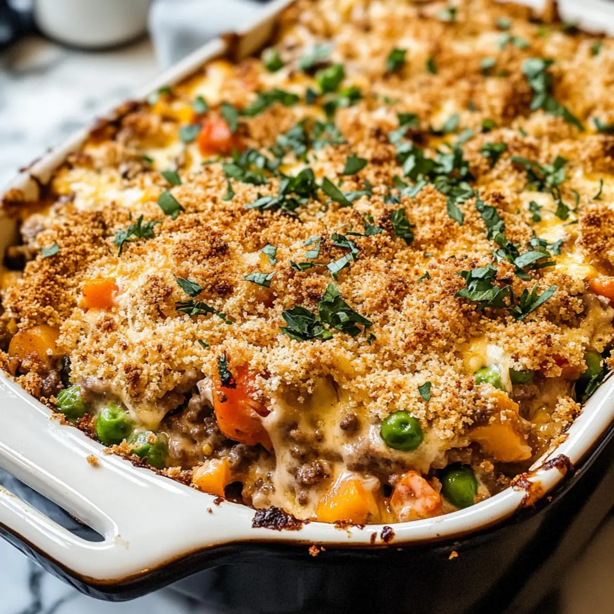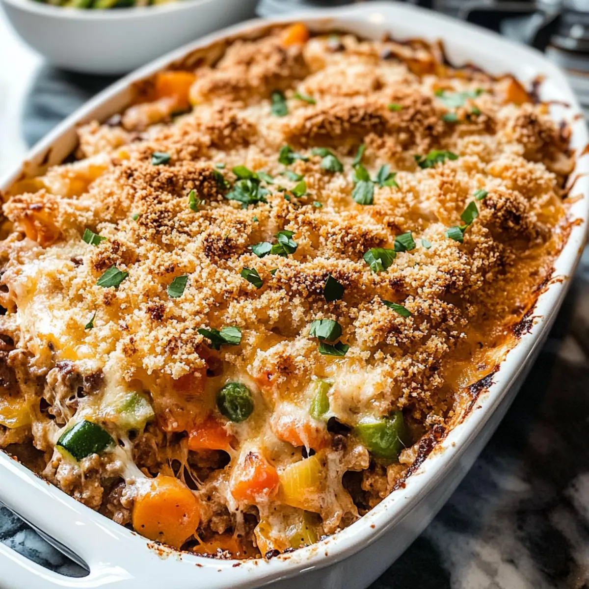 Hast du jemals beim Blick in den Kühlschrank das Gefühl gehabt, dass dir die Ideen ausgehen? Manchmal kann es eine kleine Herausforderung sein, etwas Aufregendes und Nahrhaftes aus dem scheinbar Gewöhnlichen zu kreieren. Genau hier kommt unser Hamburger Auflauf ins Spiel! Dieses Rezept vereint die Herzhaftigkeit von Rinderhackfleisch mit cremigen Nudeln und frischem Gemüse zu einem Gericht, das sich perfekt für die ganze Familie eignet. Die Kombination aus ganzen Körnern und gesunden Zutaten macht dieses Gericht nicht nur schmackhaft, sondern auch nährstoffreich. Und das Beste daran? Die Zubereitung erfolgt einfach und schnell, sodass du mehr Zeit für deine Lieben hast. Bist du bereit, deine Küche mit diesen köstlichen Aromen zu verzaubern? Warum wirst du diesen Auflauf lieben? Einfachheit pur: Dieser Hamburger Auflauf ist unkompliziert zuzubereiten und benötigt nur grundlegende Kochkünste, sodass du schnell ein köstliches Abendessen auf den Tisch bringen kannst. Herzhafter Geschmack: Die Kombination aus saftigem Rinderhackfleisch, cremigen Nudeln und gesunden Gemüse verleiht diesem Gericht einen reichhaltigen und befriedigenden Geschmack. Familienfreundlich: Ideal für die ganze Familie, begeistert er sowohl Kinder als auch Erwachsene und bringt alle zusammen am Tisch. Vielseitig: Du kannst jederzeit Zutaten austauschen, wie zum Beispiel das Rinderhackfleisch gegen Hähnchen oder etwas mehr Gemüse, um jeden Geschmack zu treffen. Zeitersparnis: Perfekt für hektische Wochenabende, lässt sich der Auflauf einfach vorbereiten und im Handumdrehen genießen. Nährstoffreich: Mit ganzen Körnern und frischen Zutaten ist er eine gesunde Wahl, die dennoch gemütlich und köstlich ist. Probiere auch unseren Eingemachten Gemüseauflauf, der ähnliche Vorteile bietet! Hamburger Auflauf Zutaten Mit diesen Zutaten bist du bestens gerüstet, um einen leckeren Hamburger Auflauf zuzubereiten! Für die Nudeln • Vollkorn-Nudeln – Sorgen für Struktur und enthalten viele Ballaststoffe. Alternative: Rotini oder Eiernudeln. Für die Füllung • Extra-natives Olivenöl – Ideal zum Anbraten der Gemüse; kann durch Pflanzenöl ersetzt werden. • Karotten, Zwiebel, grüne Paprika – Bringen Geschmack und Nährstoffe; je nach Vorlieben anpassbar. • Koscheres Salz & schwarzer Pfeffer – Verstärkt den Geschmack; nach Belieben anpassen. • Knoblauch – Für aromatische Tiefe; frischer Knoblauch ist besonders empfehlenswert. • Hot Sauce – Für etwas Würze; nach persönlichem Geschmack dosieren. • Räucherpaprika & gemahlener Kreuzkümmel – Sorgt für warme Aromen; kann durch Chili-Pulver ersetzt werden. • Mageres Rinderhackfleisch (93% fettarm) – Die Hauptproteinquelle; kann auch durch Hühnchen oder Pute ersetzt werden. • Low Sodium Rinderbrühe – Für zusätzliche Feuchtigkeit und Geschmack; alternativ auch Gemüsebrühe oder Wasser verwenden. • Tomatensauce – Für einen würzigen Geschmack; wird eine Variante ohne Salz bevorzugt, ist diese gesünder. • 2% Naturjoghurt – Fügt Cremigkeit und einen leicht säuerlichen Geschmack hinzu; kann durch Sauerrahm ersetzt werden. • Geriebener Cheddar-Käse – Gibt eine reichhaltige, schmelzende Note; kann durch Monterey Jack oder Mozzarella ersetzt werden. Für das Topping • Panko-Brösel – Für eine knusprige Kruste; Vollkorn-Panko sorgt für zusätzliche Ballaststoffe. • Frische Frühlingszwiebeln – Für die Garnitur und zusätzlichen Geschmack; können auch durch Schnittlauch ersetzt werden. Schritt-für-Schritt-Anleitung für Hamburger Auflauf Step 1: Ofen vorheizen und Auflaufform vorbereiten Heize den Ofen auf 180°C vor. Bereite eine große Auflaufform vor, indem du sie mit einem Antihaft-Spray besprühst. Dies hilft, das Ankleben des Hamburger Auflaufs zu vermeiden und sorgt dafür, dass er gleichmäßig gart. Lass den Ofen ordentlich vorheizen, damit die Aromen beim Backen optimal zur Geltung kommen. Step 2: Vollkornnudeln kochen Setze einen großen Topf mit gesalzenem Wasser auf und bringe ihn zum Kochen. Füge die Vollkornnudeln hinzu und koche sie nach Anleitung, bis sie sehr bissfest (al dente) sind, etwa 6-7 Minuten. Gieße die Nudeln ab und stelle sie beiseite, damit sie während der Zubereitung des Auflaufs nicht zu weich werden. Step 3: Gemüse anbraten Erhitze in einer großen Pfanne 2 Esslöffel extra-natives Olivenöl bei mittlerer Hitze. Füge die gewürfelten Karotten, Zwiebeln und die grüne Paprika hinzu und brate sie ca. 10 Minuten lang an, bis sie weich sind. Rühre gelegentlich um, damit sie gleichmäßig garen und sich die Aromen entfalten können. Step 4: Gewürze und Knoblauch hinzufügen Gib den fein gehackten Knoblauch, Hot Sauce, Räucherpaprika und gemahlenen Kreuzkümmel in die Pfanne. Brate die Mischung für etwa 30 Sekunden an, bis der Knoblauch duftet. Dies verstärkt den Geschmack des Hamburger Auflaufs und bereitet deine Küche auf die bevorstehenden Aromen vor. Step 5: Rinderhackfleisch braten Erhöhe die Hitze und füge das mageres Rinderhackfleisch hinzu. Brate das Fleisch ca. 6 Minuten lang, bis es vollständig durchgegart und braun ist. Achte darauf, das Fleisch mit einem Holzlöffel zu zerkleinern, damit es gleichmäßig gart. Gieße überschüssiges Fett ab, falls nötig. Step 6: Brühe und Tomatensauce hinzufügen Reduziere die Hitze und rühre die Rinderbrühe sowie die Tomatensauce ein. Lasse die Mischung 3 Minuten lang simmern, damit sich die Aromen vermischen und die Sauce etwas eindickt. Währenddessen solltest du den köstlichen Duft bereits wahrnehmen, der dir Appetit macht. Step 7: Pasta und Joghurt einmischen Nehme die Pfanne vom Herd und mische die vorgekochten Nudeln, den Naturjoghurt und ¾ Tasse geriebenen Cheddar-Käse unter das Gemüse und Hackfleisch. Rühre alles gut um, damit die cremige Mischung gleichmäßig verteilt ist und die Nudeln mit der fantastischen Sauce überzogen sind. Step 8: Mischung in die Auflaufform geben Fülle die Mischung i