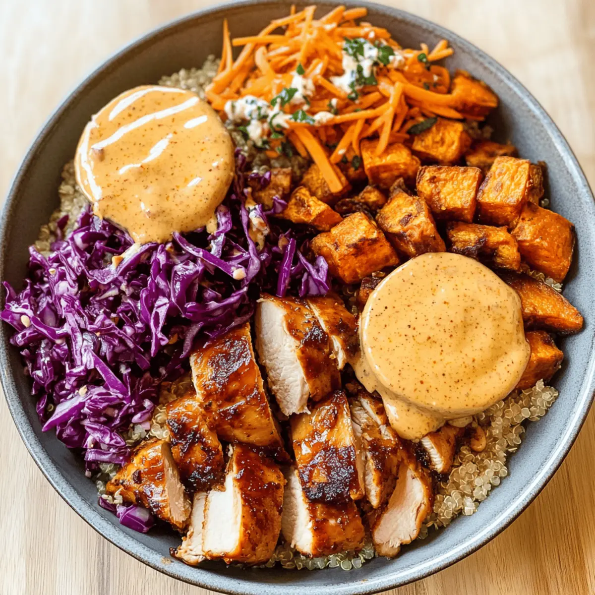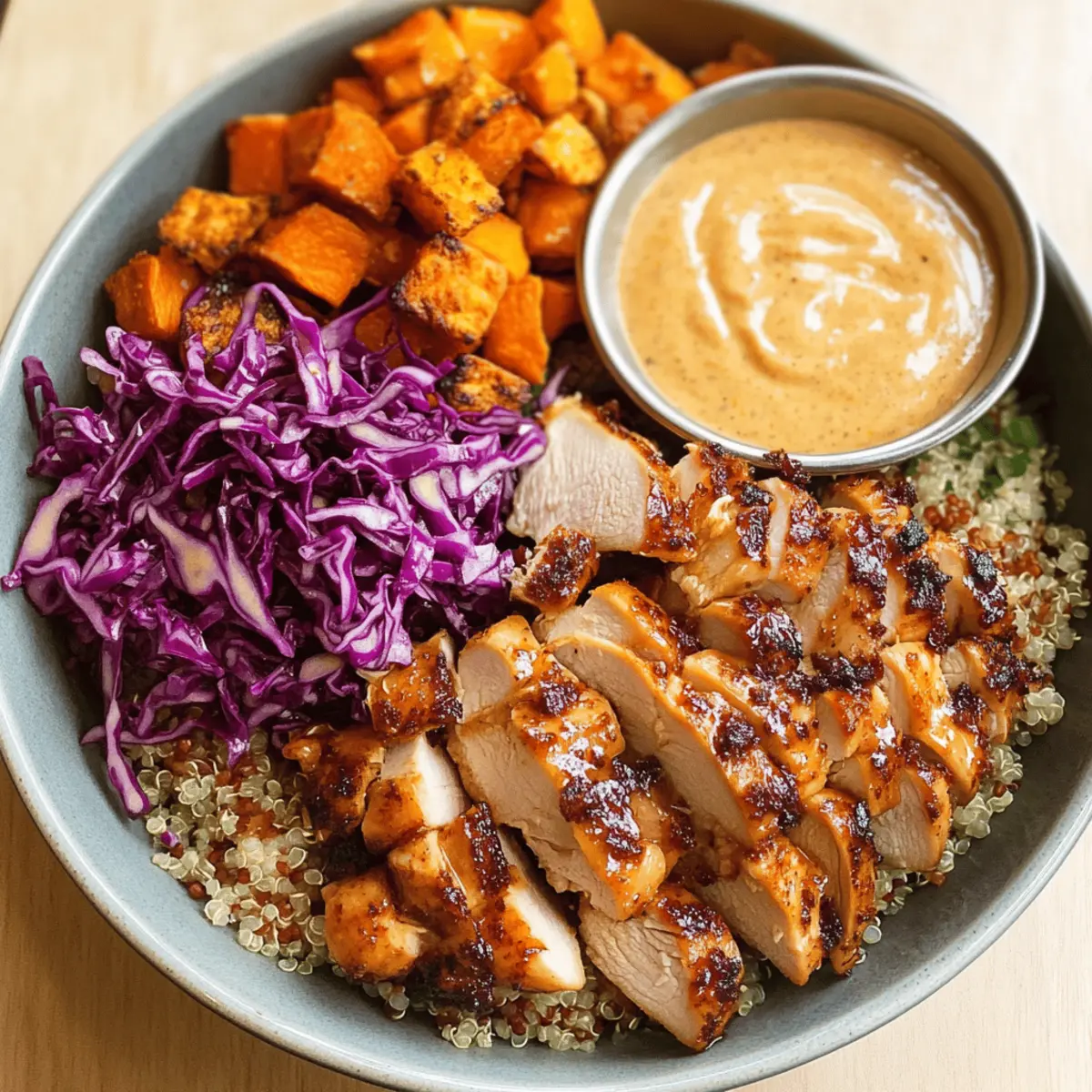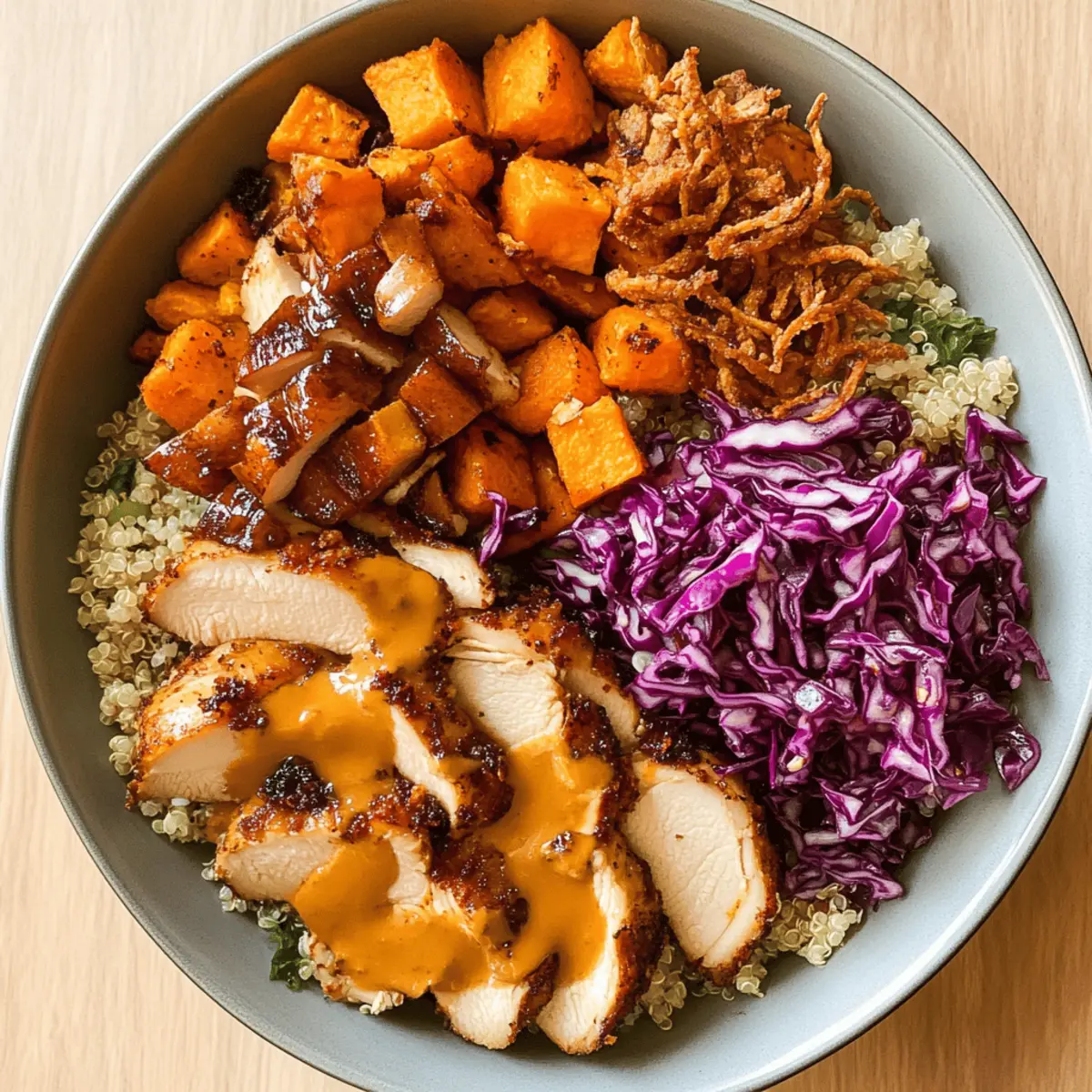 Hast du je von einem Gericht gehört, das sowohl die Seele wärmt als auch den Gaumen erfreut? Meine Sweetgreen-inspirierte Heißer Honig Hähnchen-Schale ist genau das – eine perfekte Mischung aus zartem Hähnchen, knusprigen Süßkartoffeln und einem knackigen Cole Slaw, das jeden Biss zu einem Fest der Aromen macht. Diese köstliche und nährstoffreiche Mahlzeit ist nicht nur schnell zubereitet, sondern auch äußerst anpassungsfähig, sodass du sie ganz nach deinem Geschmack gestalten kannst! Egal, ob du Lust auf ein herzhaftes Abendessen oder ein gesundes Essen für die Woche hast, diese Schale ist eine ausgezeichnete Wahl. Neugierig, wie du dieses einfache und vielseitige Rezept noch weiter verfeinern kannst? Lass uns eintauchen! Warum wirst du dieses Rezept lieben? Gesunde Vielfalt: Diese Heißer Honig Hähnchen-Schale ist nicht nur nahrhaft, sondern auch unglaublich anpassbar – du kannst die Zutaten nach deinem Geschmack oder Vorrat im Kühlschrank variieren. Komfort in jedem Biss: Die Kombination aus zartem Hähnchen und knusprigen Süßkartoffeln sorgt für ein Wohlfühlerlebnis, das alle begeistert. Schnelle Zubereitung: Mit einer Zubereitungszeit von weniger als 30 Minuten ist dieses Rezept ideal für geschäftige Wochentage. Einfache Zubereitung: Mit nur wenigen Schritten und alltäglichen Zutaten erhältst du ein Gourmetgericht, das jeden beeindruckt – perfekt für deine nächste Dinnerparty! Einmaliges Geschmackserlebnis: Das süß-würzige Honig-Dressing verwandelt jede Schale in ein Geschmackserlebnis. Ergänze sie mit einem frischen Cole Slaw Rezept und genieße eine perfekte Balance aus Aromen! Aufbewahrungstipps: Die einzelnen Komponenten lassen sich separat aufbewahren, sodass du jederzeit ein schnelles, gesundes Abendessen zubereiten kannst. Heißer Honig Hähnchen-Schale Zutaten • Hühnchen: Ein zartes Protein – Hähnchenschenkel bleiben saftig, Hähnchenbrust ist eine gesunde Alternative. • Olivenöl: Verbessert den Geschmack und sorgt dafür, dass die Gewürze gut haften. • Gewürze (Chilipulver, italienische Kräuter, geräuchertes Paprika, Knoblauchpulver, Zwiebelpulver, Zitronenpfeffer, schwarzer Pfeffer, Salz): Gewürze zum Würzen des Hähnchens – genieße den besonderen Geschmack, indem du das Hühnchen einmassierst und einstechtest. • Süßkartoffeln: Fügen eine süße Note und eine cremige Textur hinzu – können durch andere Wurzelgemüse ersetzt werden. • Avocadoöl: Ideal zum Rösten von Süßkartoffeln – bietet gesunde Fette. • Maisstärke: Sorgt für Knusprigkeit beim Rösten der Süßkartoffeln. • Quinoa: Leichte und flauschige Basis, absorbiert die Aromen gut – kann durch Vollkornreis, weißen Reis oder Farro ersetzt werden. • Butter oder Olivenöl: Zum Anbraten von Knoblauch vor dem Kochen der Quinoa – bringt zusätzlichen Geschmack. • Hühnerbrühe: Verleiht der Quinoa einen herzhaften Geschmack. • Rotkohl & Karotten: Die Hauptzutaten im Cole Slaw – sorgen für Knackigkeit und Farbe. • Mayonnaise, Senf, Apfelessig, Zucker: Dressing-Zutaten für Cole Slaw – schaffen eine harmonische Balance aus Cremigkeit, Säure und Süße. • Heißes Honig-Senf-Dressing: Eine süß-würzige Mischung aus Honig, Senf, Essig und roten Pfefferflocken für das besondere Finish – perfekt für die Heißer Honig Hähnchen-Schale. • Knusprige Zwiebelringe: für einen knackigen Topping – können auch durch angebratene Zwiebeln ersetzt oder ganz weggelassen werden. Schritt-für-Schritt-Anleitung für die Heißer Honig Hähnchen-Schale Step 1: Hühnchen marinieren Beginne damit, das Hühnchen in einer Schüssel mit Olivenöl und einer Mischung aus Chili-Pulver, italienischen Kräutern, geräuchertem Paprika, Knoblauch- und Zwiebelpulver, Zitronenpfeffer, schwarzem Pfeffer und Salz zu marinieren. Stelle sicher, dass das Hähnchen gleichmäßig bedeckt ist. Lass es für mindestens 15 Minuten im Kühlschrank marinieren, damit die Aromen gut einziehen können. Step 2: Hähnchen kochen Erhitze eine große Pfanne bei mittlerer Hitze und füge etwas Olivenöl hinzu. Lege die marinierten Hähnchenschenkel in die Pfanne und brate sie 7–8 Minuten pro Seite, bis sie goldbraun und durchgegart sind. Die Innentemperatur sollte mindestens 75 °C betragen. Nimm das Hähnchen aus der Pfanne und lass es für einige Minuten ruhen, bevor du es in Scheiben schneidest. Step 3: Süßkartoffeln vorbereiten Während das Hähnchen ruht, heize deinen Ofen auf 220 °C vor. Schäle die Süßkartoffeln, würfle sie und wirf sie in einer Schüssel mit Avocadoöl, Salz, Pfeffer und Maisstärke. Lege die gewürfelten Süßkartoffeln auf ein Backblech in einer einzigen Schicht und röste sie 25–30 Minuten lang, bis sie goldbraun und knusprig sind. Drehe sie nach der Hälfte der Zeit um, um ein gleichmäßiges Rösten zu gewährleisten. Step 4: Quinoa kochen Für die Quinoa, erhitze in einem mittelgroßen Topf etwas Butter oder Olivenöl und füge gehackten Knoblauch hinzu. Brate den Knoblauch 1–2 Minuten an, bis er duftet. Gib die Quinoa hinzu, rühre um, und füge dann die Hühnerbrühe hinzu. Bring die Mischung zum Kochen, reduziere die Hitze, decke den Topf ab und lass die Quinoa 15–20 Minuten köcheln, bis die Flüssigkeit absorbiert ist. Lass sie nach dem Kochen noch 5 Minuten ruhen, bevor du sie auflockerst. Step 5: Cole Slaw zubereiten In der Zwischenzeit, schneide den Rotkohl und die Karotten klein und gib sie in eine große Schüssel. In einer separaten Schüssel mische Mayonnaise, Senf, Apfelessig, Zucker und etwas Salz und Pfeffer, um das Dressing zu erstellen. Vermische das Dressing mit dem Gemüse und stelle die Mischung für mindestens 10 Minuten in den Kühlschrank, damit die Aromen einziehen können. Step 6: Dressing zubereiten Für das heiße Honig-Senf-Dressing, mische in einer kleinen Schüssel Honig, Senf, Apfelessig, rote Pfefferflocken und etwas Olivenöl. Rühre alles gut um, bis die Mischung glatt ist. Stelle das Dressing bei