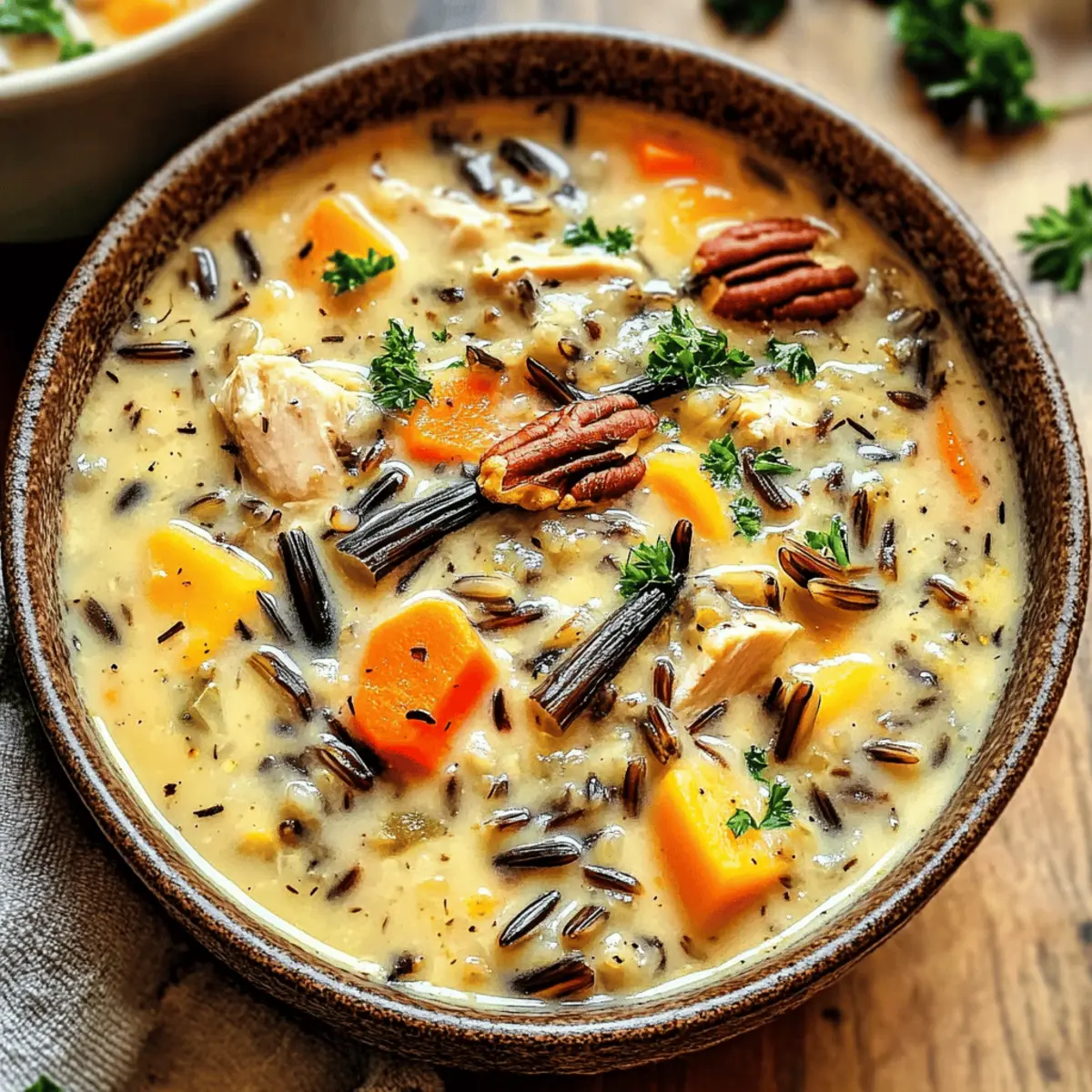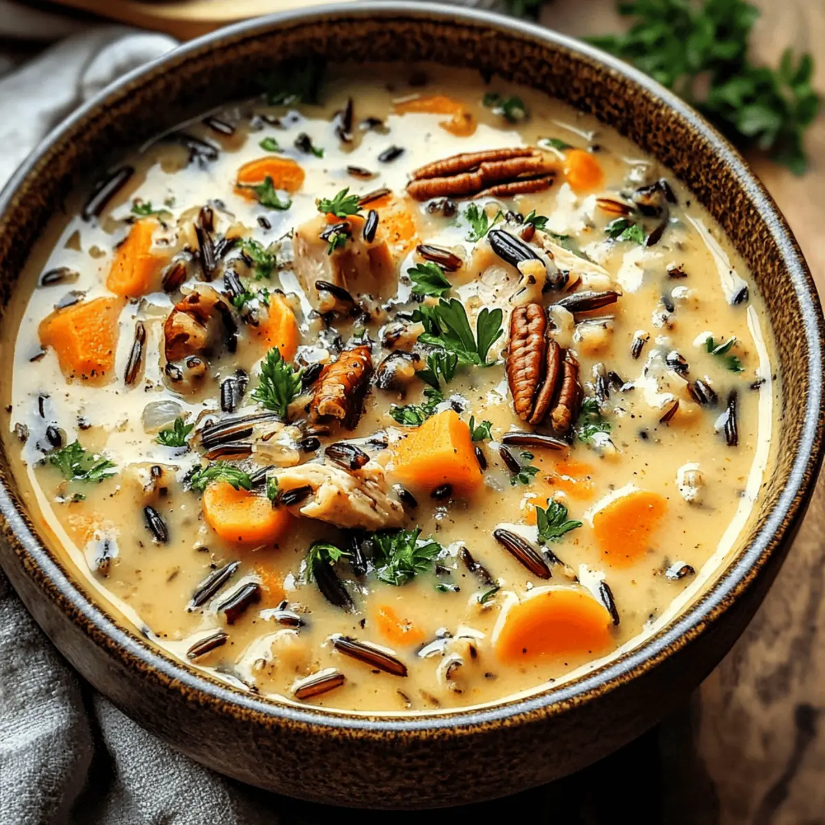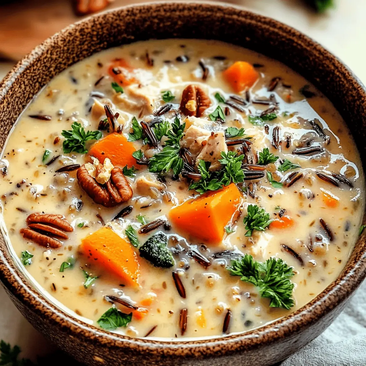 Es gibt nichts Besseres, als an einem kühlen Herbstabend in eine heiße Schüssel Herbst Wildreissuppe zu tauchen. Diese cremige, herzhaft-wärmende Suppe kombiniert die erdigen Aromen von Wildreis mit frischen, saisonalen Zutaten und zaubert ein Gefühl von Geborgenheit in Ihr Zuhause. Perfekt für all jene, die sich nach wohltuender Hausmannskost sehnen, bietet dieses Rezept nicht nur eine einfache Zubereitung, sondern auch die Freiheit, nach Lust und Laune zu variieren – seien es zusätzliche Gemüse oder eine vegetarische Variante. Mit jedem Löffel dieser köstlichen Suppe kommen Erinnerungen an gemütliche Abende und das Teilen von guten Momenten auf. Neugierig, wie Sie die Aromen des Herbstes in Ihrer Küche lebendig werden lassen können? Warum ist diese Suppe ein Muss? Herbstliche Aromen: Diese Suppe kombiniert den nussigen Geschmack von Wildreis mit aromatischen Kräutern, die eine wahre Geschmacksexplosion bieten. Schnell und einfach: Mit wenigen Zutaten und klaren Schritten gelingt Ihnen diese köstliche Herbst Wildreissuppe im Handumdrehen. Vielseitigkeit: Ob vegetarisch oder mit Hähnchen, die Anpassungsmöglichkeiten sind endlos – fügen Sie Ihr Lieblingsgemüse oder Gewürze hinzu, um das Gericht zu personalisieren. Gesund und sättigend: Reich an Ballaststoffen und Protein schützt sie nicht nur vor der Kälte, sondern ist auch eine nährstoffreiche Wahl. Verwöhnen Sie Ihre Lieben mit dieser wärmenden Umarmung in Schalen, die Erinnerungen an heimelige Abende weckt und die Stimmung aufhellt. Wenn Sie noch mehr köstliche Rezepte entdecken möchten, schauen Sie sich auch unsere vegetarischen Suppenrezepte an! Herbst Wildreissuppe Zutaten • Diese herzhaft-cremige Suppe ist der Inbegriff von Komfort und eignet sich perfekt für entspannte Herbstabende! Für die Brühe Hühnerbrühe – bildet die geschmackliche Basis der Suppe; verwenden Sie eine natriumarme Variante für eine gesündere Option. Trockener Sherry – fügt Tiefe und Komplexität hinzu; verwenden Sie alternativ einen Schuss Weißwein, wenn gewünscht. Für die Basis Wilder Reis – sorgt für einen nussigen Geschmack und eine angenehme Textur; vor dem Kochen gründlich abspülen, um überschüssige Stärke zu entfernen. Olivenöl – ideal zum Anbraten von Gemüse und zum Aromatisieren; kann durch Butter ersetzt werden, wenn ein reichhaltigerer Geschmack gewünscht ist. Für die Aromen Zwiebel – verleiht Süße und Tiefe; gelbe Zwiebeln sind die ideale Wahl, aber jede Sorte funktioniert. Karotten – bringen Süße und Nährstoffe ein; kann bei Bedarf durch Pastinaken ersetzt werden. Sellerie – sorgt für eine frische Note; entfernen, wenn nicht verfügbar. Cremini-Pilze – bringen umami Geschmack ins Spiel; können durch Champignons oder Shiitake ersetzt werden. Knoblauch – intensiviert das Aroma; frisch ist am besten, Knoblauchpulver funktioniert aber auch. Getrockneter Thymian – fördert die herbstliche Geschmacksnote; passt hervorragend zu Herbstgerichten. Getrockneter Salbei – verleiht eine erdige Note; kann durch italienische Gewürze ersetzt werden. Getrockneter Rosmarin – sorgt für einen robusten Geschmack; sparsam verwenden, da er intensiv ist. Rote Pfefferflocken – für eine optionale Schärfe; weglassen, wenn eine mildere Variante bevorzugt wird. Für die cremige Note Schlagsahne oder Kokosnussmilch – sorgt für eine reichhaltige und cremige Konsistenz; Kokosnussmilch ist eine großartige, milchfreie Option. Für die Garnierung Frische Petersilie – macht die Suppe lebhafter; andere frische Kräuter wie Schnittlauch oder Koriander können ebenfalls verwendet werden. Gehackte Pekannüsse oder Walnüsse – für zusätzlichen Geschmack und Crunch; kann durch Mandeln ersetzt oder ganz weggelassen werden. Geriebener Parmesan – steigert den herzhaften Genuss; bitte weglassen, um die Suppe milchfrei zu halten. Für die Würze Salz und Pfeffer – sind unverzichtbar für die Feinabstimmung des Geschmacks; immer nach Geschmack anpassen. Gekochtes Hähnchen – ergänzt die Suppe mit Protein und Herzhaftigkeit; Rotisserie-Hähnchen macht die Zubereitung einfacher. Tauchen Sie ein in den Genuss dieser Herbst Wildreissuppe und lassen Sie die saisonalen Aromen Ihr Zuhause erfüllen! Schritt-für-Schritt-Anleitung für die Herbst Wildreissuppe Step 1: Wildreis kochen Kochen Sie den gründlich abgespülten Wildreis in einem Topf mit 4 Tassen Hühnerbrühe. Bringen Sie die Brühe zum Kochen und reduzieren Sie dann die Hitze, um die Mischung 45-50 Minuten lang sanft köcheln zu lassen, bis der Reis zart ist. Gießen Sie überschüssige Flüssigkeit ab und stellen Sie den Reis beiseite, während Sie den Rest der Herbst Wildreissuppe vorbereiten. Step 2: Gemüse anschwitzen Erhitzen Sie in einem großen Topf 2 Esslöffel Olivenöl bei mittlerer Hitze. Fügen Sie 1 gewürfelte Zwiebel, 2 gewürfelte Karotten und 2 Stangen gewürfelten Sellerie hinzu. Braten Sie das Gemüse 5-7 Minuten lang an, bis es weich und leicht gebräunt ist. Geben Sie dann 250 g in Scheiben geschnittene Cremini-Pilze dazu und braten Sie diese an, bis sie zart sind, und fügen Sie kurz vor Ende 2 gewürfelte Knoblauchzehen und die getrockneten Kräuter hinzu, bis sie duften. Step 3: Suppe köcheln lassen Ergänzen Sie den Topf mit der angebratenen Gemüse-Mischung um 4 Tassen Hühnerbrühe und den vorgekochten Wildreis. Rühren Sie 2 Tassen zerrissenes Hähnchenfleisch und optional einen Schuss trockenen Sherry hinzu. Lassen Sie die Suppe bei niedriger Hitze 30-60 Minuten köcheln, damit sich die Aromen voll entfalten können; rühren Sie gelegentlich um, bis sie gut durchgewärmt ist. Step 4: Finale Abrundung Fügen Sie 1 Tasse Schlagsahne oder Kokosnussmilch zur Suppe hinzu und rühren Sie um, bis sie gut vermischt ist. Schmecken Sie die Herbst Wildreissuppe mit Salz und Pfeffer ab und fügen Sie frische gehackte Petersilie hinzu, um einen lebhaften Geschmack zu gewährleisten. Erhitzen Sie die Suppe erneut leicht