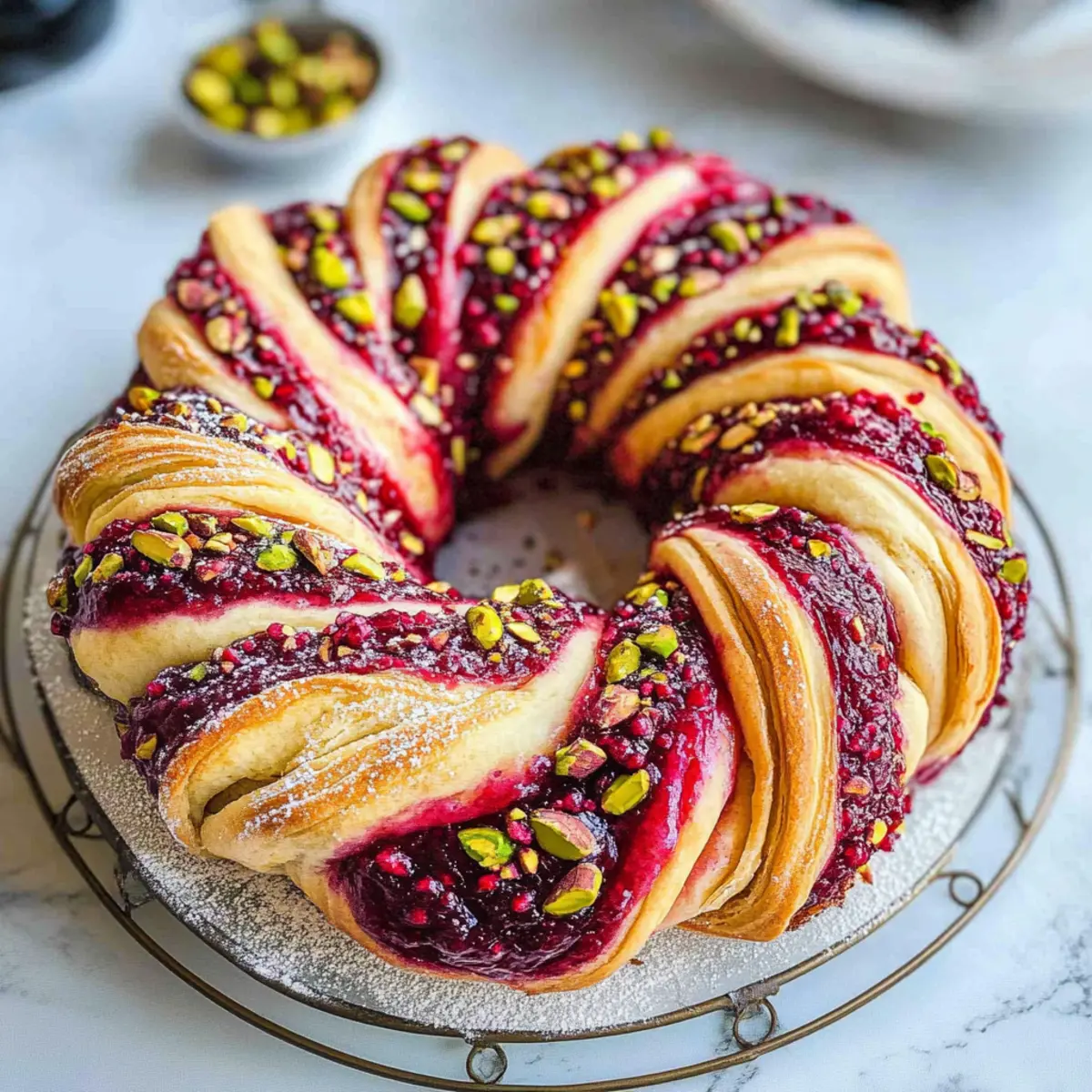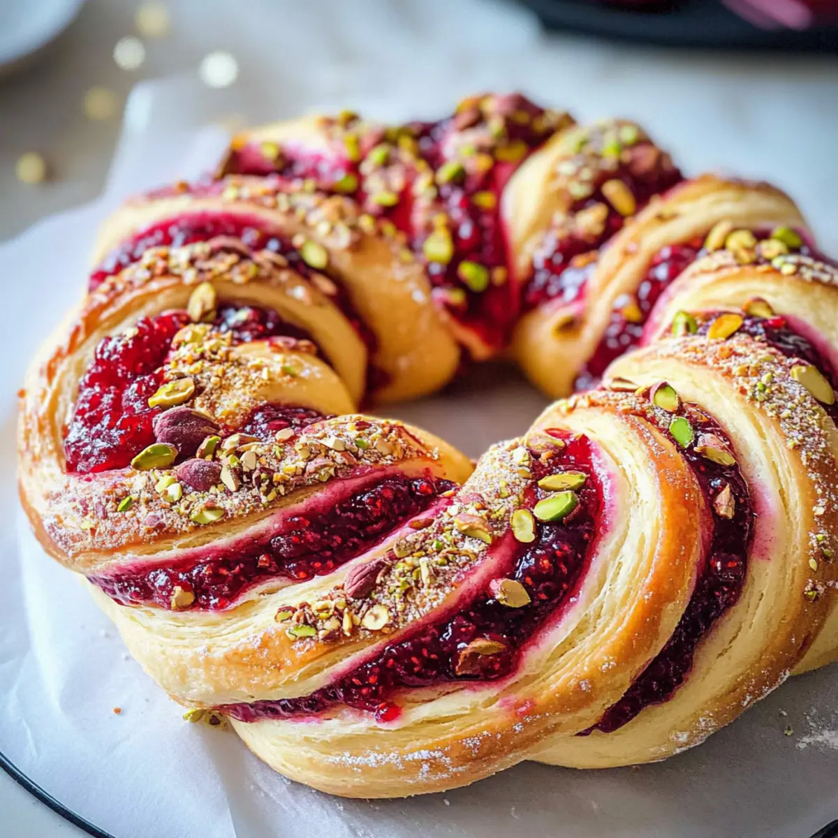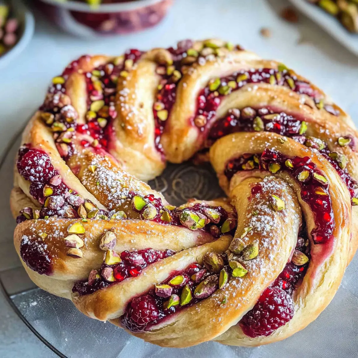 Jedes Mal, wenn ich die köstliche Kombination aus Himbeeren und Pistazien auf meinem Küchentisch entdecke, fühle ich mich in die festliche Zeit des Jahres zurückversetzt. Das Himbeer- und Pistazienkranz Rezept ist mehr als nur ein Hingucker; es ist ein wahres Geschmackserlebnis, das fruchtige Süße und knusprige Texturen perfekt vereint. Mit seinem hellen, fluffigen Teig und den lebhaften Farben bringt dieser Kranz nicht nur Freude in Ihre Küche, sondern ist auch eine wunderbare Möglichkeit, Ihre Lieben zu beeindrucken oder als Geschenk zu überraschen. Einfach zuzubereiten und ein echter Publikumsliebling – dieses Rezept wird sicherlich zum Highlight Ihrer festlichen Backzeit! Welche Geschichten und Erinnerungen werden Sie mit diesem besonderen Kranz verbinden? Warum ist dieser Himbeer- und Pistazienkranz einzigartig? Ein Genuss für die Sinne: Dieser Kranz verbindet die aufregende Kombination aus süßen Himbeeren und knackigen Pistazien, die nicht nur herrlich schmeckt, sondern auch visuell begeistert. Einfache Zubereitung: Die Schritte sind unkompliziert, sodass sowohl Anfänger als auch erfahrene Bäcker mühelos zum Ziel kommen. Festlich und Vielseitig: Perfekt als Mittelpunkt Ihrer Weihnachtsfeiern oder als persönliches Geschenk – jeder wird beeindruckt sein! Weniger Zeitaufwand: Schnell und einfach gemacht, bleibt mehr Zeit für das, was wirklich zählt – die Feiertage mit Familie und Freunden zu genießen. Ein wahres Geschmackserlebnis: Dieser Kranz wird schnell zum Favoriten und sorgt nicht nur in der eigenen Küche, sondern auch bei Ihren Liebsten für Begeisterung. Himbeer- und Pistazienkranz Zutaten Für den Teig: Mehl – sorgt für die Basis und Struktur des Kranzes. Butter – macht den Teig schön weich und aromatisch; ersetze sie durch vegane Margarine für eine pflanzliche Variante. Zucker – süßt den Teig und sorgt für eine goldene Farbe beim Backen; Kokoszucker ist eine zuckerfreie Option. Eier – geben dem Teig Haltbarkeit und Lockheit; für eine vegane Variante kannst du Apfelmus oder Chia-Ei nutzen. Backpulver – sorgt für das Aufgehen des Teigs; stelle sicher, dass es frisch ist. Prise Salz – hebt den Geschmack der anderen Zutaten hervor. Für die Füllung: Himbeeren – die Hauptzutat, die für eine fruchtige, süße Note sorgt; frisch oder gefroren verwenden. Gemahlene Pistazien – fügen eine nussige Textur und einen festlichen Geschmack hinzu; ersetze sie durch Mandeln oder Walnüsse für Variation. Flüssigkeit: Milch – sorgt für die richtige Konsistenz des Teigs; pflanzliche Milch wie Mandel- oder Hafermilch sind tolle Alternativen. Dieser Himbeer- und Pistazienkranz Rezept ist nicht nur ein Gaumenschmaus, sondern auch eine Augenweide, perfekt für festliche Anlässe oder zum Verschenken! Schritt-für-Schritt-Anleitung für Himbeer- und Pistazienkranz Rezept Step 1: Ofen vorheizen Heizen Sie Ihren Ofen auf 180°C vor. Dies ist der erste wichtige Schritt, um sicherzustellen, dass Ihr Himbeer- und Pistazienkranz gleichmäßig gebacken wird. Eine gut vorgeheizte Umgebung ermöglicht es dem Teig, schnell aufzugehen und eine schön goldene Farbe zu entwickeln. Während der Ofen heiß wird, können Sie mit der Vorbereitung des Teigs beginnen. Step 2: Butter und Zucker cremig rühren In einer großen Schüssel die weiche Butter und den Zucker mit einem Handmixer oder einer Rührschüssel cremig rühren. Achten Sie darauf, dass die Mischung hell und fluffig wird, was etwa 2-3 Minuten dauert. Diese Basis sorgt für einen köstlich süßen und zarten Teig, der die Himbeeren und Pistazien perfekt ergänzt. Step 3: Eier hinzufügen Fügen Sie die Eier nacheinander zu der Butter-Zucker-Mischung hinzu und schlagen Sie jedes Ei gut unter, bevor Sie das nächste hinzufügen. Dies sollte insgesamt etwa 1-2 Minuten in Anspruch nehmen. Die Eier verleihen dem Teig Struktur und sorgen dafür, dass Ihr Himbeer- und Pistazienkranz schön aufgeht und fluffig bleibt. Step 4: Trockene Zutaten mischen In einer separaten Schüssel das Mehl, Backpulver, gemahlene Pistazien und eine Prise Salz vermengen. Diese Zutaten gut umrühren, um sicherzustellen, dass das Backpulver gleichmäßig verteilt ist. Anschließend die trockenen Zutaten nach und nach zur feuchten Mischung hinzufügen und dabei ständig rühren. Step 5: Milch einrühren Gießen Sie die Milch in die Teigmischung und verrühren Sie alles gut, bis ein glatter und homogener Teig entsteht. Dies kann etwa 2 Minuten dauern. Der Teig sollte leicht klebrig, aber nicht zu nass sein. Achten Sie darauf, alle Zutaten gut zu vermischen, um eine gleichmäßige Textur zu gewährleisten. Step 6: Himbeeren unterheben Sobald der Teig gut vermischt ist, heben Sie vorsichtig die Himbeeren unter. Seien Sie dabei behutsam, um die Beeren nicht zu zerdrücken. Die Himbeeren sollten gleichmäßig im Teig verteilt sein, um Ihrem Himbeer- und Pistazienkranz eine fruchtige Note zu geben, ohne den Teig zu wässrig zu machen. Step 7: Teig in die Form geben Fetten Sie eine Kranzform gut ein und geben Sie den Teig hinein. Verteilen Sie ihn gleichmäßig, damit der Kranz beim Backen eine schöne Form annimmt. Achten Sie darauf, dass der Teig den Rand der Form erreicht, um sicherzustellen, dass Ihr Himbeer- und Pistazienkranz gleichmäßig aufgeht. Step 8: Backen Legen Sie die Kranzform in den vorgeheizten Ofen und backen Sie Ihren Himbeer- und Pistazienkranz für 25-30 Minuten. Der Kranz ist fertig, wenn die Oberfläche goldbraun ist und ein eingestochener Zahnstocher sauber herauskommt. Achten Sie darauf, den Kranz nicht zu lange zu backen, um eine trockene Textur zu vermeiden. Step 9: Abkühlen lassen und servieren Nehmen Sie den Kranz nach dem Backen aus dem Ofen und lassen Sie ihn etwa 10-15 Minuten in der Form abkühlen. Danach vorsichtig herausnehmen und auf einem Kuchengitter vollständig abkühlen lassen. Servieren Sie den Himbeer- und Pistazienkranz, wenn er noch leicht warm ist, und genießen Sie die köstliche Kombinat