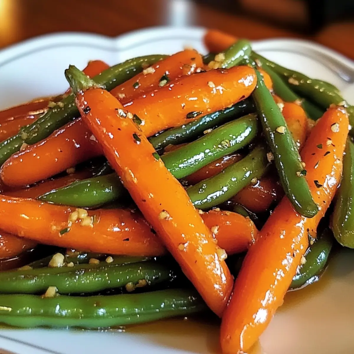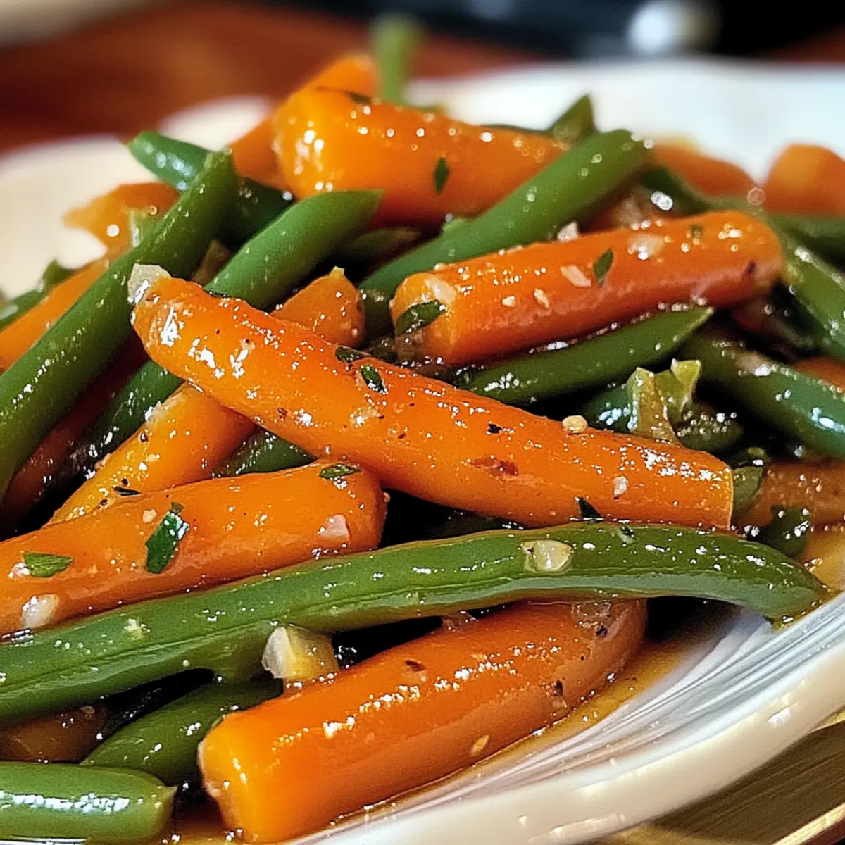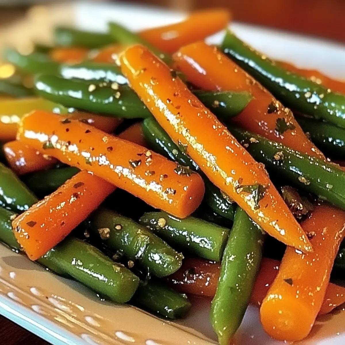 Der verführerische Duft von geröstetem Gemüse kann einen nach einem langen Tag sofort in gute Laune versetzen. Heute präsentiere ich dir ein unkompliziertes Rezept für honigglasierten Karotten und grünen Bohnen, das nicht nur deine Geschmacksknospen erfreut, sondern auch perfekt in dein herzhaftes Abendessen integriert werden kann. Diese bunten Beilagen vereinen süße und herzhafte Aromen, die selbst wählerische Esser anspricht. Ein großer Vorteil: Die Zubereitung ist blitzschnell und einfach, ideal für geschäftige Wochentage oder festliche Anlässe. Zudem lässt sich das Rezept ganz nach deinem Geschmack anpassen, kannst du beispielsweise anstelle von Honig auch Ahornsirup verwenden, um eine vegane Variante zu kreieren. Neugierig auf die Details? Lass uns gleich in die Zubereitung eintauchen! Warum solltest du dieses Rezept ausprobieren? Einfachheit pur: Die Zubereitung der honigglasierten Karotten und grünen Bohnen ist kinderleicht und erfordert keine speziellen Kochkenntnisse. Vielfältige Anpassungsmöglichkeiten: Du kannst das Rezept problemlos abwandeln und verschiedene Gemüsesorten wie Brokkoli oder Paprika hinzufügen. Süß und herzhaft: Die Kombination aus süßem Honig und herzhaften Aromen sorgt für ein Geschmackserlebnis, das bei jedem Anlass begeistert. Schnell zubereitet: In nur 30 Minuten hast du eine leckere Beilage, die sowohl bei Wochendinner als auch bei besonderen Feierlichkeiten glänzt. Perfekt für alle: Diese Beilage spricht selbst die wählerischsten Esser an und ergänzt zahlreiche Hauptgerichte, wie zum Beispiel Knuspriges Honig Feta. Lass dich von diesem unwiderstehlichen Rezept verzaubern! Honigglasierten Karotten und grünen Bohnen Zutaten • Hinweis: Dieses Rezept für honigglasierten Karotten und grünen Bohnen ist nicht nur einfach, sondern auch anpassbar – du kannst die Zutaten ganz nach deinem Geschmack variieren! Für das Gemüse: Karotten – bringen Süße und leuchtende Farbe; frisch für die beste Textur verwenden. Grüne Bohnen – sorgen für Knackigkeit und ergänzen die Zartheit der Karotten; frische Bohnen sind ideal. Bei tiefgefrorenen Bohnen: vorher auftauen und gut abtrocknen. Für die Glasur: Honig – süßt und karamellisiert das Gemüse; für eine vegane Option durch Ahornsirup oder Agavendicksaft ersetzen. Olivenöl – beschichtet das Gemüse perfekt und unterstützt das Rösten. Balsamico-Essig – balanciert die Süße mit einer angenehmen Säure; kann durch Apfelessig oder Rotweinessig ersetzt werden. Salz und Pfeffer – verstärken den Geschmack; nach Belieben anpassen. Optionale Garnierungen: Frische Kräuter – wie Petersilie oder Thymian für zusätzlichen Geschmack und eine hübsche Präsentation. Schritt-für-Schritt-Anleitung für Honigglasierten Karotten und grünen Bohnen Step 1: Gemüse vorbereiten Wasche die Karotten und grünen Bohnen gründlich unter kaltem Wasser. Schneide die Karotten in gleichmäßige Stücke, etwa 2-3 cm lang, und die grünen Bohnen in Hälften. Dadurch garen sie gleichmäßig und sehen ansprechend aus. Lege das Gemüse in eine große Schüssel und stelle es bereit. Step 2: Honigglasur zubereiten In einer Rührschüssel vermengst du den Honig, Olivenöl, Balsamico-Essig, Salz und Pfeffer. Rühre die Mischung mit einem Schneebesen gut durch, bis sie homogen und leicht dicklich ist. Dies wird die köstliche Glasur für die honigglasierten Karotten und grünen Bohnen. Step 3: Gemüse mit Glasur vermengen Gib die vorbereiteten Karotten und grünen Bohnen in die Schüssel mit der Honigglasur. Tossiere das Gemüse gründlich, bis es gleichmäßig mit der Glasur überzogen ist. Achte darauf, dass jedes Stück Karotte und Bohne gut umhüllt wird, um den besten Geschmack zu erzielen. Step 4: Gemüse rösten Heize deinen Ofen auf 200°C vor. Breite das gesunde Gemüse gleichmäßig auf einem mit Backpapier ausgelegten Backblech aus. Röste die Mischung für 20-25 Minuten, bis die Karotten weich und leicht caramelisiert sind. Wende das Gemüse nach der Hälfte der Garzeit, um eine gleichmäßige Bräune zu erreichen. Step 5: Servieren Nehme das Backblech aus dem Ofen und lasse die honigglasierten Karotten und grünen Bohnen kurz abkühlen. Garnieren kannst du diese mit frischen Kräutern wie Petersilie oder Thymian für einen zusätzlichen Farb- und Geschmackskick. Folge diesen Schritten und genieße ein köstliches und gesundes Gemüsegericht! Honigglasierten Karotten und grünen Bohnen Variationen Du kannst dieses Rezept nach Belieben anpassen und deine eigene Note hinzufügen, um den Geschmack zu intensivieren und neue Aromen zu entdecken. Vegan: Ersetze den Honig durch Ahornsirup oder Agavendicksaft, um eine köstliche vegane Variante zu kreieren. Der süße Geschmack bleibt erhalten, und du kannst das Gericht ganz ohne tierische Produkte genießen. Andere Gemüse: Probiere aus, andere Gemüsesorten wie Rosenkohl, Brokkoli oder Paprika zu verwenden. Diese Variationen bringen unterschiedliche Texturen und Geschmäcker in dein Gericht. Nüsse für Crunch: Füge eine Handvoll gerösteter Mandeln oder Walnüsse hinzu, um deinem Gericht einen herrlichen Crunch zu verleihen. Die Knusprigkeit sorgt für ein spannendes Mundgefühl. Rauchiger Geschmack: Grill die Mischung für ein paar Minuten, um ihr eine rauchige Note zu verleihen. Dies ist besonders lecker, wenn du die Aromen in Kombination mit gegrilltem Fleisch servierst. Würzige Note: Ergänze die Glasur mit einer Prise Cayennepfeffer oder Paprika, um dem Gericht ein wenig Schärfe hinzuzufügen. Dies entfaltet eine interessante Geschmackstiefe. Süßere Variante: Mische zusätzlich etwas Zucker oder braunen Zucker in die Glasur für eine intensivere Süße. Dies eignet sich besonders gut für festliche Anlässe. Frische Kräuter: Füge während des Röstens einen Zweig Thymian oder Rosmarin hinzu. Die Kräuter verleihen dem Gemüse einen frischen, aromatischen Geschmack. Wenn du auf der Suche nach schnellen und leckeren Rezeptideen bist