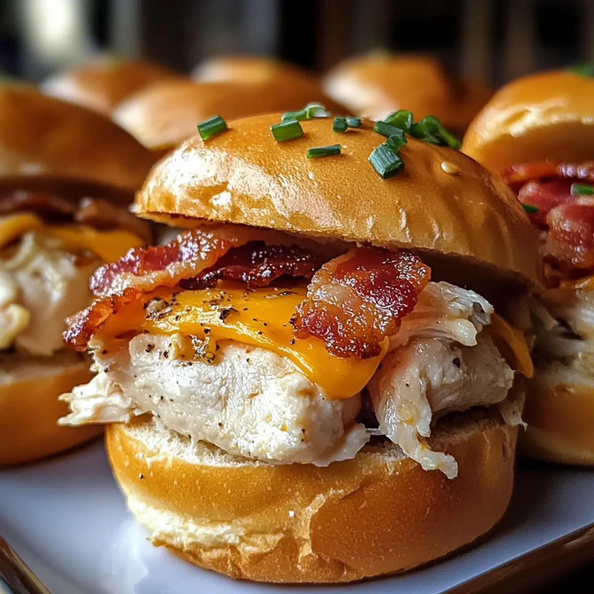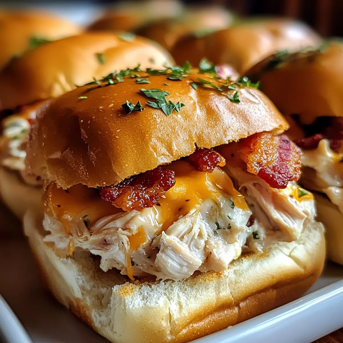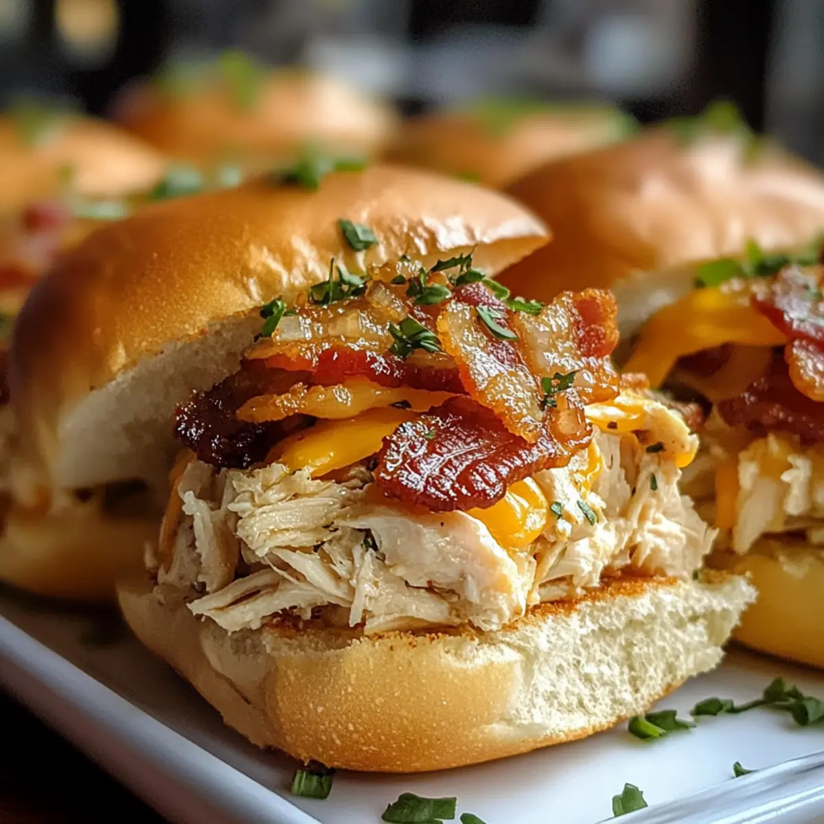Als ich neulich in der Küche stand und den köstlichen Duft von frisch gebratenem Speck einatmete, wusste ich, dass es Zeit für Hühnchen Bacon Ranch Sliders war. Diese kleinen Meisterwerke sind nicht nur ein echter Publikumsmagnet, sondern auch überraschend schnell zubereitet – in nur 40 Minuten sind sie perfekt für jedes Treffen oder ein gemütliches Familienessen. Stellen Sie sich vor, zartes, geschreddertes Hühnchen vereint sich mit knusprigem Speck und einer cremigen Ranch-Dressing-Soße, alles verpackt in weich-warmen Brötchen. Zudem lassen sie sich wunderbar nach Ihrem Geschmack anpassen, sodass jeder Gast auf seine Kosten kommt. Klingt das nicht verlockend? Lassen Sie uns gemeinsam in die Welt dieser köstlichen Slider eintauchen! Warum werden Sie diese Sliders lieben? Schnelle Zubereitung: In nur 40 Minuten sind diese Hühnchen Bacon Ranch Sliders fertig – ideal für ungeduldige Feinschmecker! Vielseitige Aromen: Passen Sie die Geschmäcker mit verschiedenen Käsesorten oder Toppings wie Avocado an! Klassiker neu interpretiert: Diese Sliders sind eine leckere Kombination aus Herzhaftem und Cremigem, die alle begeistert. Perfekte für jede Gelegenheit: Egal ob beim Grillen oder beim Familienessen, sie sind ein echter Hit! Einfache Lagerung: Bereiten Sie sie im Voraus vor und genießen Sie sie später – einfach im Kühlschrank aufbewahren oder einfrieren. Hühnchen Bacon Ranch Slider Zutaten • Für die Füllung Hühnchenbrust – Hauptquelle für Protein; gekocht und geschreddert für zarte Bissen. Ersetzen Sie es durch Putenbrust für eine leichtere Variante. Bacon – Fügt einen knusprigen, herzhaften Geschmack hinzu; verwenden Sie Putenbacon für eine fettärmere Option. Ranch-Dressing – Sorgt für Cremigkeit und Geschmack; genießen Sie hausgemacht oder gekauft, griechischer Joghurt kann eine gesündere Alternative sein. Geriebener Cheddar – Ergänzt die Aromen und fügt Cremigkeit hinzu; probieren Sie auch Mozzarella oder Pepper Jack aus. Slider-Brötchen – Die Grundlage für die Füllung; wahlweise Vollkorn- oder glutenfreie Brötchen für unterschiedliche Vorlieben. Olivenöl – Zum Braten des Hühnchens; kann durch Avocadoöl oder ein neutrales Öl ersetzt werden. Gewürze (Knoblauchpulver, Zwiebelpulver, Paprika, Salz, Pfeffer) – Steigern den Geschmack des Hühnchens; passen Sie die Gewürze nach Ihrem Geschmack an. Frische Petersilie (optional) – Zum Garnieren; kann durch Schnittlauch oder Frühlingszwiebeln ersetzt werden für zusätzlichen Geschmack. • Für den Belag Zusätzliche Toppings – Jalapeños, Avocado oder verschiedene Käsesorten für eine individuelle Geschmacksrichtung. Diese Hühnchen Bacon Ranch Slider sind nicht nur ein Fest für den Gaumen, sondern lassen sich auch leicht anpassen und mit verschiedenen Geschmäckern genießen! Schritt-für-Schritt-Anleitung für Hühnchen Bacon Ranch Slider Step 1: Ofen vorheizen Heizen Sie den Ofen auf 175°C (350°F) vor. Dies sorgt dafür, dass die Hühnchen Bacon Ranch Sliders gleichmäßig garen und die Käseschicht schön schmilzt. Eine gute Vorbereitung ist der Schlüssel zu schmackhaften Snacks, also stellen Sie sicher, dass Ihr Ofen gut vorgeheizt ist, während Sie die anderen Zutaten vorbereiten. Step 2: Hühnchen anbraten Erhitzen Sie etwas Olivenöl in einer großen Pfanne bei mittlerer Hitze. Fügen Sie die Hühnchenbruststücke hinzu, die mit Knoblauchpulver, Zwiebelpulver, Paprika, Salz und Pfeffer gewürzt sind. Braten Sie das Hühnchen 6-7 Minuten auf jeder Seite, bis es durchgegart ist und eine goldene Farbe hat. Lassen Sie es dann leicht abkühlen, um später das Hühnchen zu shredden. Step 3: Hühnchen zerkleinern Nach dem Abkühlen können Sie das Hühnchen mit zwei Gabeln shredden oder einfach mit den Händen zerreißen. Geben Sie das zarte, geschredderte Hühnchen in eine große Schüssel. Fügen Sie das Ranch-Dressing hinzu und vermengen Sie alles gut, bis die Hühnchenmasse gleichmäßig mit dressing umhüllt ist. Step 4: Brötchen vorbereiten Schneiden Sie die Slider-Brötchen in zwei Hälften und platzieren Sie die unteren Hälften in einer Backform. Es ist wichtig, diese Basis vorzubereiten, da sie den köstlichen Inhalt halten und die Sliders zusammen verbinden. Stellen Sie sicher, dass die Brötchen ausreichend Platz haben, um beim Backen nicht zu zerdrücken. Step 5: Füllung schichten Verteilen Sie die Hühnchen-Ranch-Mischung gleichmäßig auf den unteren Brötchenhälften in der Backform. Dann legen Sie die knusprigen Baconstücke darüber und streuen Sie den geriebenen Cheddar-Käse auf die Füllung. Achten Sie darauf, dass alles gut verteilt ist, damit jeder Slider die volle Aromenvielfalt erfährt. Step 6: Brötchen abdecken und backen Setzen Sie die oberen Hälften der Brötchen sorgfältig auf die gefüllten unteren Hälften. Decken Sie die gesamte Backform mit Aluminiumfolie ab, um die Feuchtigkeit zu bewahren. Backen Sie die Sliders für 15 Minuten, dann nehmen Sie die Folie ab und backen Sie für weitere 5 Minuten, bis der Käse geschmolzen und die Oberseite goldbraun ist. Step 7: Abkühlen und servieren Lassen Sie die Hühnchen Bacon Ranch Sliders nach dem Backen etwas abkühlen, damit Sie sie leichter schneiden können. Garnieren Sie die Sliders nach Belieben mit frischer Petersilie oder Schnittlauch, um einen zusätzlichen Farbtupfer zu erhalten. Dann schneiden Sie die Sliders in Portionen und genießen Sie dieses köstliche Gericht! Lagerungstipps für Hühnchen Bacon Ranch Sliders Zimmertemperatur:: Diese sliders sollten nicht länger als 2 Stunden bei Zimmertemperatur stehen gelassen werden, um die Sicherheit der Lebensmittel zu gewährleisten. Kühlschrank:: Bewahren Sie übrig gebliebene Hühnchen Bacon Ranch Sliders in einem luftdichten Behälter bis zu 3 Tage im Kühlschrank auf, um die Frische zu maximieren. Gefrierschrank:: Für eine längere Lagerung können die Sliders einzeln in Frischhaltefolie eingewickelt und bis zu 2 Monate im Gef