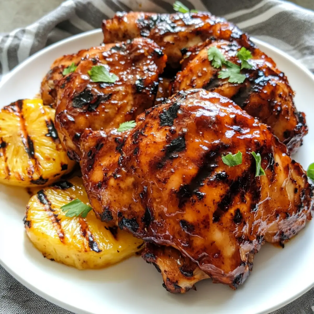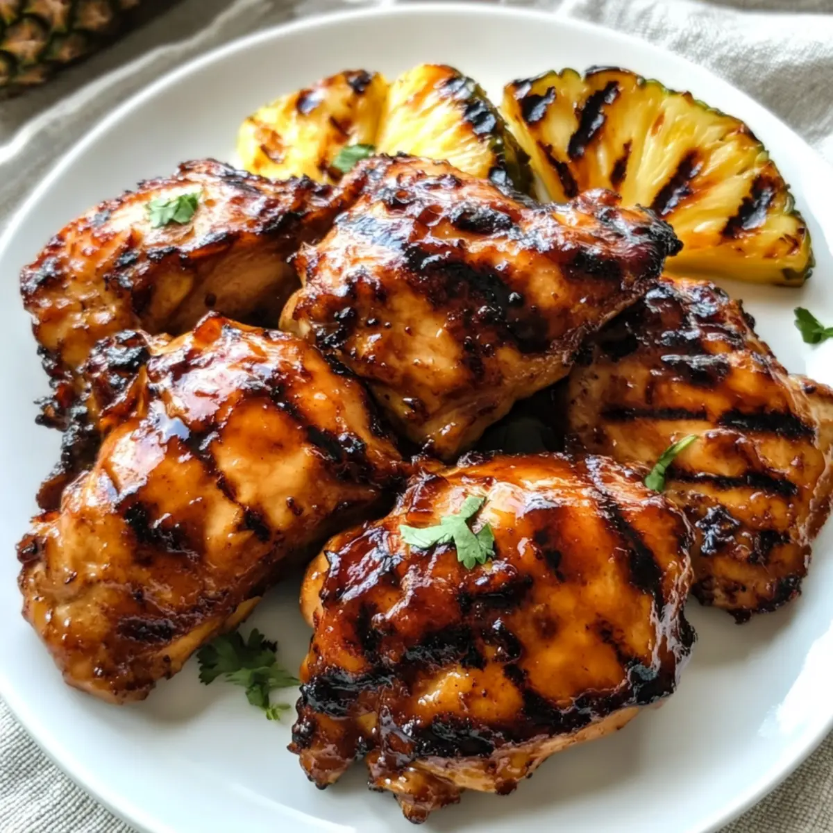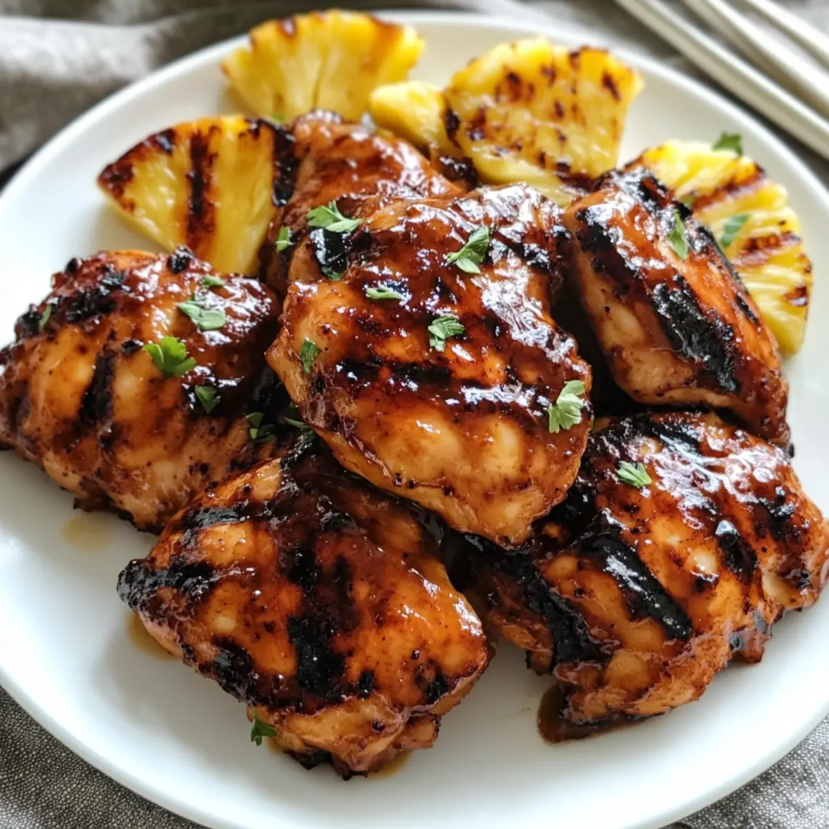 „Stell dir vor, du stehst an einem sonnenverwöhnten Strand, umgeben von sanften Wellen und dem verlockenden Duft von frisch gegrilltem Huli Huli Hähnchen, das in der Luft liegt.“ Dieses köstliche Rezept bringt die Aromen Hawaiis direkt zu dir nach Hause und ist perfekt für Grillabende oder als schnelles Abendessen unter der Woche. Die einfache Zubereitung macht es zum idealen Gericht für die ganze Familie, und das Beste ist, dass du es im Voraus marinieren kannst, um wertvolle Zeit zu sparen. Mit dem richtigen Mix aus süßem, herzhaftem und rauchigem Geschmack wirst du diese BBQ-Delikatesse garantiert lieben! Bist du bereit, deine Grillkünste auf das nächste Level zu heben und deine Liebsten mit einem Hauch von exotischem Flair zu begeistern? Warum solltest du Huli Huli Hähnchen lieben? Einzigartiger Geschmack: Der verlockende Mix aus süßem Ananas- und würzigem Ingwer verleiht diesem Gericht ein unverwechselbares Aroma. Einfache Zubereitung: Mit nur wenigen Schritten zauberst du schnell ein köstliches Essen, ideal für geschäftige Wochentage oder Grillpartys. Familienfreundlich: Die Einbeziehung der Familie in die Marinierung und das Grillen macht das Kochen zu einem gemeinsamen Erlebnis. Gesunde Anpassungen: Du kannst auch glutenfreie Optionen wählen, indem du Sojasauce durch Kokos-Aminos ersetzt, um das Gericht abzurunden. Vielfältige Variationen: Ob mit Hähnchenbrust oder zusätzlichem Gemüse, die Variationen dieses Rezeptes erlauben dir kreative Freiheit. Perfekte Grilllichkeit: Dank der karamellisierten Glasur wird dein Huli Huli Hähnchen jeden Gaumen erfreuen und sofort Erinnerungen an einen luau zaubern! Huli Huli Hähnchen Zutaten Für die Marinade: Brauner Zucker – verleiht eine süße Note, die die herzhaften Aromen perfekt ausbalanciert; Kokoszucker ist eine gute glutenfreie Substitute. Ketchup – dient als Basis für die Marinade und sorgt für eine angenehme, pikante Frische; achte auf bio oder zuckerreduzierte Optionen. Sojasauce – gibt Tiefe mit umami; für eine glutenfreie Variante sieh dir Kokos-Aminos an. Ananassaft – bringt eine tropische Süße ins Spiel; frisch gepresster Saft ist hierfür ideal. Apfelessig – sorgt für eine knackige Säure, die die Aromen auflockert; Reisessig kann ebenfalls verwendet werden. Frischer Ingwer, gehackt – intensiviert das Aroma und bringt eine erwärmende Würze; gemahlener Ingwer kann kurzfristig eingesetzt werden, verändert aber die Textur. Gehackter Knoblauch – fügt Schärfe und Tiefe hinzu; frischer Knoblauch ist am besten, aber gegebenenfalls kann auch abgepackter verwendet werden. Für das Hähnchen: Hähnchenschenkel, ohne Haut und Knochen – die ideale Wahl für saftigen Genuss; alternativ kannst du dünnere Hähnchenbrust oder aufgeschnittenes Fleisch verwenden, um die Marinade besser aufnehmen zu können. Optionale Zutaten: Rote Pfefferflocken – füge eine würzige Note hinzu, wenn du es scharf magst; die perfekte Ergänzung für alle, die es pikant lieben. Gegrillte Ananasstücke – bringen zusätzlichen Geschmack und eine frische Note, perfekt zu deinem Huli Huli Hähnchen; eine tropische Bereicherung für jedes BBQ. Entdecke die Freude am Kochen mit diesem Huli Huli Hähnchen und genieße die Aromen von Hawaii direkt in deiner Küche! Step-by-Step Instructions für Huli Huli Hähnchen Step 1: Marinade zubereiten In einer Schüssel vermischst du den braunen Zucker, Ketchup, Sojasauce, Ananassaft, Apfelessig, gehackten Ingwer und Knoblauch gut miteinander. Diese Mischung sorgt für die typische Geschmackstiefe des Huli Huli Hähnchens. Hebe etwa ⅓ Tasse der Marinade für das spätere Bestreichen auf und stelle den Rest zur Seite. Step 2: Hähnchen marinieren Schneide überschüssiges Fett von den Hähnchenschenkeln ab, lass jedoch etwas Fett dran für den Geschmack. Gib die Hähnchenteile in einen Ziploc-Beutel, gieße die vorbereitete Marinade darüber, verschließe den Beutel und massiere die Marinade gut ein. Lege den Beutel für mindestens 6 bis 24 Stunden in den Kühlschrank, damit das Hähnchen die Aromen aufnehmen kann. Step 3: Grill vorbereiten Heize deinen Grill auf mittelhohe Temperatur vor, etwa 200–230 °C. Fette die Grillroste leicht ein, um ein Ankleben des Hähnchens zu verhindern. Ein gut vorgeheizter Grill sorgt für perfekte Grillstreifen und eine schöne Karamellisierung des Huli Huli Hähnchens. Step 4: Hähnchen grillen Lege die marinierten Hähnchenschenkel auf den heißen Grill und grille sie für etwa 5 Minuten pro Seite. Achte darauf, dass die Temperatur des Hähnchens 74 °C erreicht, was es sicher zu essen macht. Während des Grillens beginnt das Hähnchen, eine schöne braune Farbe zu entwickeln. Step 5: Hähnchen bestreichen und fertigstellen Senke die Grillhitze etwas und bestreiche das Hühnerfleisch mit der reservierten Marinade. Lasse das Huli Huli Hähnchen für 1 weitere Minute pro Seite baste, um den Geschmack zu intensivieren. Dadurch entsteht eine köstliche Glanzschicht, die das Hähnchen unwiderstehlich macht. Step 6: Ruhen lassen und servieren Nimm das Hähnchen vom Grill und lege es für etwa 5 Minuten auf einen Teller, abgedeckt mit Alufolie. Das Ruhen lässt die Säfte sich setzen, was zu einem saftigeren Hähnchen führt. Serviere das Huli Huli Hähnchen schließlich mit Beilagen deiner Wahl und genieße die tropischen Aromen. Lagerungstipps für Huli Huli Hähnchen Zimmertemperatur:: Halte mariniertes Huli Huli Hähnchen nicht länger als 2 Stunden bei Zimmertemperatur, um die Lebensmittelsicherheit zu gewährleisten. Kühlschrank:: Bewahre übrig gebliebenes Huli Huli Hähnchen in einem luftdichten Behälter für bis zu 3 Tage im Kühlschrank auf, um die Frische zu erhalten. Gefrierfach:: Friere portionierte Reste von Huli Huli Hähnchen in einem gefrierfesten Behälter für bis zu 3 Monate ein; dies bewahrt den Geschmack und die Textur. Wiedererwärmen:: Zum besten Ergebnis das Huli Huli Hähnchen auf dem Grill oder im Ofen bei 180 