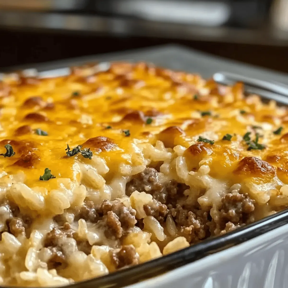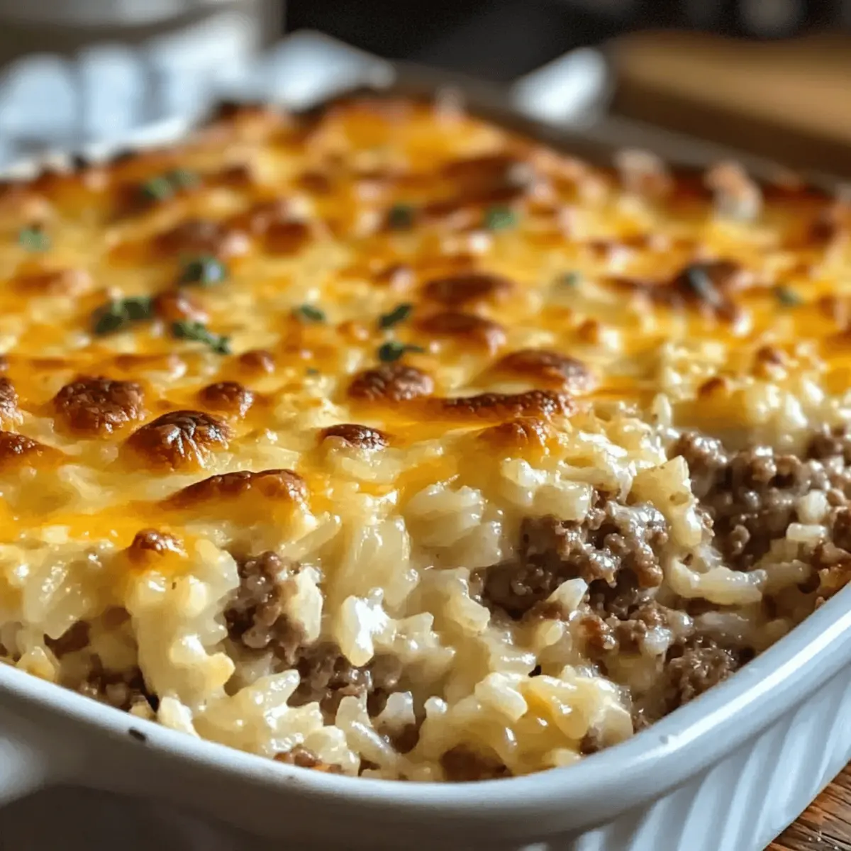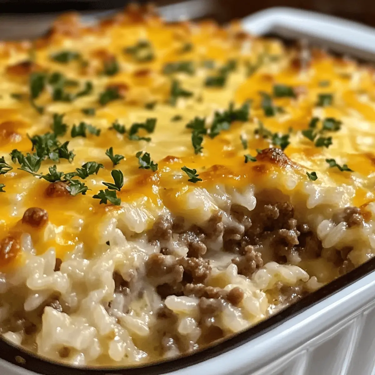 Wusstet ihr, dass der Käse-Hackfleisch-Reis-Auflauf nicht nur ein Rezept, sondern ein Stück Kindheit ist? Während der Zubereitung strömt der verlockende Duft von würzigem Hackfleisch und geschmolzenem Käse durch die Küche und weckt Erinnerungen an gemütliche Familientreffen. Dieses Rezept kombiniert saftiges Hackfleisch, fluffigen Reis und cremigen Käse zu einem köstlichen Gericht, das perfekt für hektische Abende geeignet ist. Schnell und einfach in der Zubereitung, ist dieser Auflauf äußerst familienfreundlich und nutzt praktische Vorratsartikel für ein stressfreies Kocherlebnis. Aber das Beste daran? Er eignet sich hervorragend für Reste und kann problemlos für ein weiteres Abendessen aufbewahrt werden! Bereit, die Herzen eurer Lieben zu erobern? Lasst uns gemeinsam in die Details eintauchen! Warum ist dieser Auflauf so beliebt? Köstlicher Komfort: Der Käse-Hackfleisch-Reis-Auflauf vereint herzhaftes Hackfleisch, fluffigen Reis und geschmolzenen Käse in einem Gericht, das einfach nach Hause schmeckt. Schnelle Zubereitung: In weniger als einer Stunde steht dieses leckere Familienessen auf dem Tisch, ideal für stressige Wochentage. Reste-Held: Perfekt zum Vorbereiten und Ideal für die Aufbewahrung, sodass ihr die Reste mühelos in den nächsten Tagen genießen könnt. Anpassbar: Variiert die Zutaten nach Lust und Laune – fügt Gemüse wie Erbsen oder Karotten hinzu oder nutzt eine andere Käsesorte! Um mehr über leckere, einfache Rezepte zu erfahren, schaut euch auch unsere Zitronen Knoblauch Butterbohnen oder das Gegrilltes Steak Chimichurri an! Käse-Hackfleisch-Reis-Auflauf Zutaten Hinweis: Hier findet ihr alles, was ihr für diesen köstlichen Käse-Hackfleisch-Reis-Auflauf braucht! Für die Mischung • Hackfleisch – Hauptbestandteil, der für reichhaltigen Geschmack und eine herzliche Textur sorgt. Für eine leichtere Variante kann Hackfleisch durch Puten- oder Hähnchenfleisch ersetzt werden. • Gekochter Reis – Bildet die Basis des Auflaufs und sorgt für Sättigung. Brauner Reis kann verwendet werden, wenn er vorher vollständig gekocht wurde. • Eingelegte Champignonsuppe – Sorgt für Cremigkeit und Tiefe. Die Suppe kann durch eine Hühnersuppe ersetzt werden. • Milch – Macht die Mischung cremiger und kann durch jede Art von Milch oder eine pflanzliche Alternative ersetzt werden. • Geriebener Cheddar – Für die käseige Schicht und den herzhaften Geschmack. Kann durch Monterey Jack, Mozzarella oder eine Mischung ersetzt werden. • Worcestershiresauce – Fügt umami Geschmack hinzu; prüft, ob sie glutenfrei ist. • Knoblauchpulver – Verstärkt den herzhaften Geschmack; frischer, gehackter Knoblauch kann ebenfalls verwendet werden. • Zwiebelpulver – Sorgt für ein aromatisches Aroma; frische Zwiebeln sind ebenfalls möglich, wobei die Garzeit angepasst werden sollte. • Salz und Pfeffer – Essentielle Gewürze für den perfekten Geschmack. Für die Toppings • Zusätzlicher geriebener Cheddar – Für die goldene, geschmolzene Käsekruste obenauf. • Optionales Gemüse – Fügen Sie Erbsen, Karotten oder Brokkoli hinzu, um die Nährstoffe zu verbessern. Diese Zutaten machen euren Käse-Hackfleisch-Reis-Auflauf zu einem super leckeren, familienfreundlichen Abendessen! Schritt-für-Schritt-Anleitung für Käse-Hackfleisch-Reis-Auflauf Step 1: Ofen vorheizen Heizt euren Ofen auf 175°C vor und fettet eine 9×13-Zoll große Auflaufform ein, damit der Käse-Hackfleisch-Reis-Auflauf beim Backen nicht anklebt. Während der Ofen aufheizt, könnt ihr bereits die Zutaten vorbereiten und die Vorfreude auf das köstliche Gericht steigern. Step 2: Hackfleisch anbraten In einer großen Pfanne das Hackfleisch bei mittlerer Hitze anbraten, bis es gleichmäßig braun ist, etwa 6-8 Minuten. Achte darauf, überschüssiges Fett abzugießen, um eine zu fettige Mischung zu vermeiden. Das gebratene Hackfleisch sorgt für die herzhafte Basis des Käse-Hackfleisch-Reis-Auflaufs. Step 3: Mischung anrühren In einer großen Schüssel das gebratene Hackfleisch, 2 Tassen gekochten Reis, eine Dose eingelegte Champignonsuppe, ½ Tasse Milch, 1 Tasse geriebenen Cheddar, Worcestershiresauce, Knoblauchpulver, Zwiebelpulver sowie Salz und Pfeffer gut vermengen. Die cremige Konsistenz der Mischung lässt den Auflauf besonders lecker aussehen. Step 4: Mischung einfüllen Die Hackfleischmischung gleichmäßig in die vorbereitete Auflaufform geben und glatt streichen. Dadurch wird sichergestellt, dass sich alle Zutaten gut miteinander vermischen, und es entsteht eine köstliche Grundlage für den Käse-Hackfleisch-Reis-Auflauf. Step 5: Käse bestreuen Die restlichen ½ Tasse geriebenen Cheddar gleichmäßig über die Mischung streuen. Dies sorgt für eine köstliche, geschmolzene Käsekruste, die den Auflauf perfekt abrundet. Der Käse wird beim Backen schön goldbraun. Step 6: Backen Den Auflauf im vorgeheizten Ofen für etwa 25–30 Minuten backen, bis er heiß und sprudelnd ist und der Käse eine schöne goldene Farbe hat. Achte darauf, die Uhr im Auge zu behalten, damit der Käse nicht verbrennt. Step 7: Abkühlen lassen Nach dem Backen den Käse-Hackfleisch-Reis-Auflauf aus dem Ofen nehmen und ein paar Minuten abkühlen lassen. Dies erleichtert das Servieren und lässt die Aromen sich setzen, bevor du deinen Lieben das wohlschmeckende Gericht anrichtest. Käse-Hackfleisch-Reis-Auflauf Variationen Lasst eurer Kreativität freien Lauf und passt diesen köstlichen Auflauf ganz nach eurem Geschmack an! Dairy-Free: Nutzt pflanzliche Milch und veganen Käse für eine milchfreie Variante, die trotzdem cremig schmeckt. Grünes Gemüse: Ergänzt gefrorene oder frische Erbsen und Karotten, um zusätzliche Nährstoffe zu erhalten. Diese Farben bringen nicht nur Freude auf den Teller, sondern bereichern auch den Geschmack. Spicy Kick: Fügt gehackte Jalapeños oder etwas Cayennepfeffer hinzu, um dem Auflauf eine feurige Note zu verleihen. So wird jede Biss zur spannende