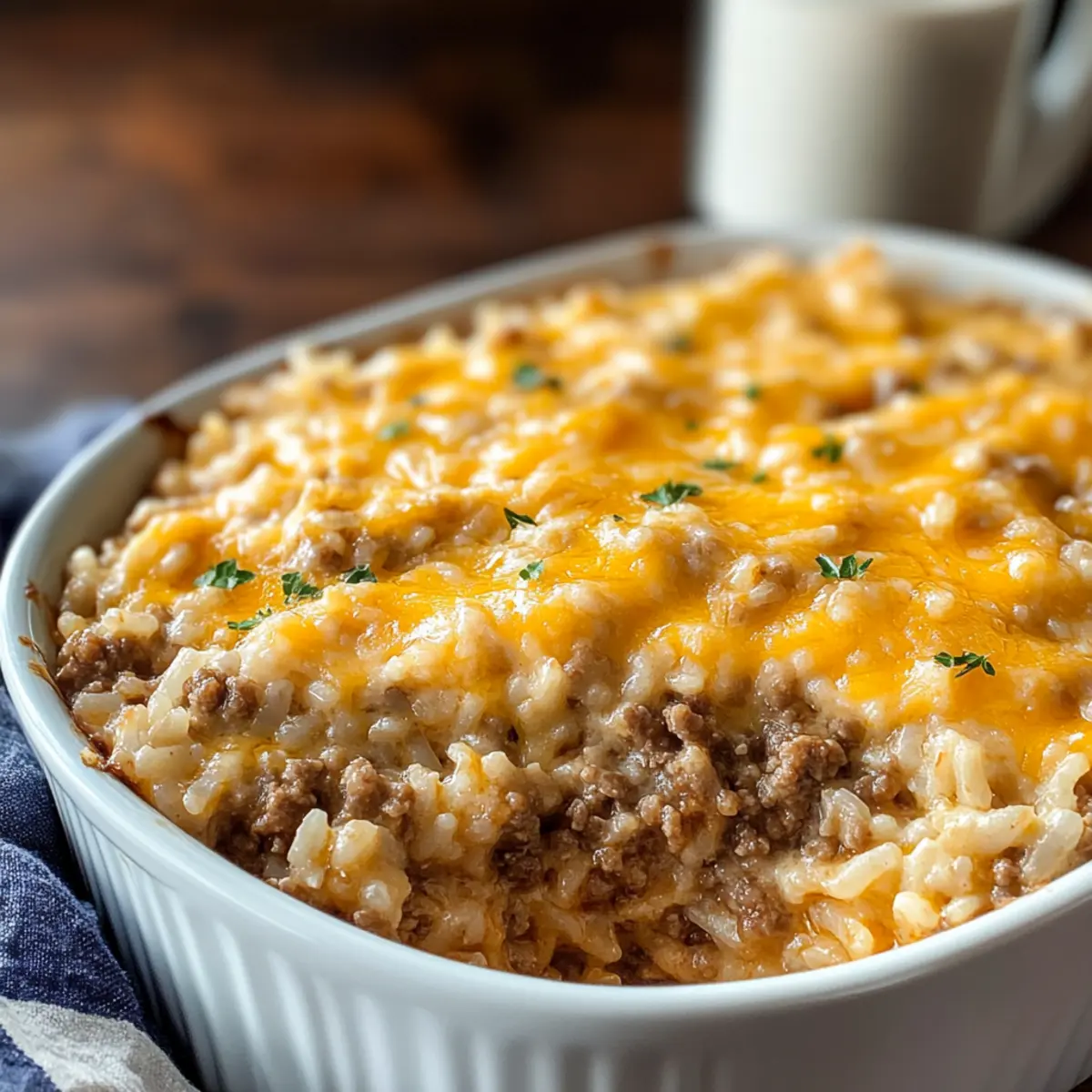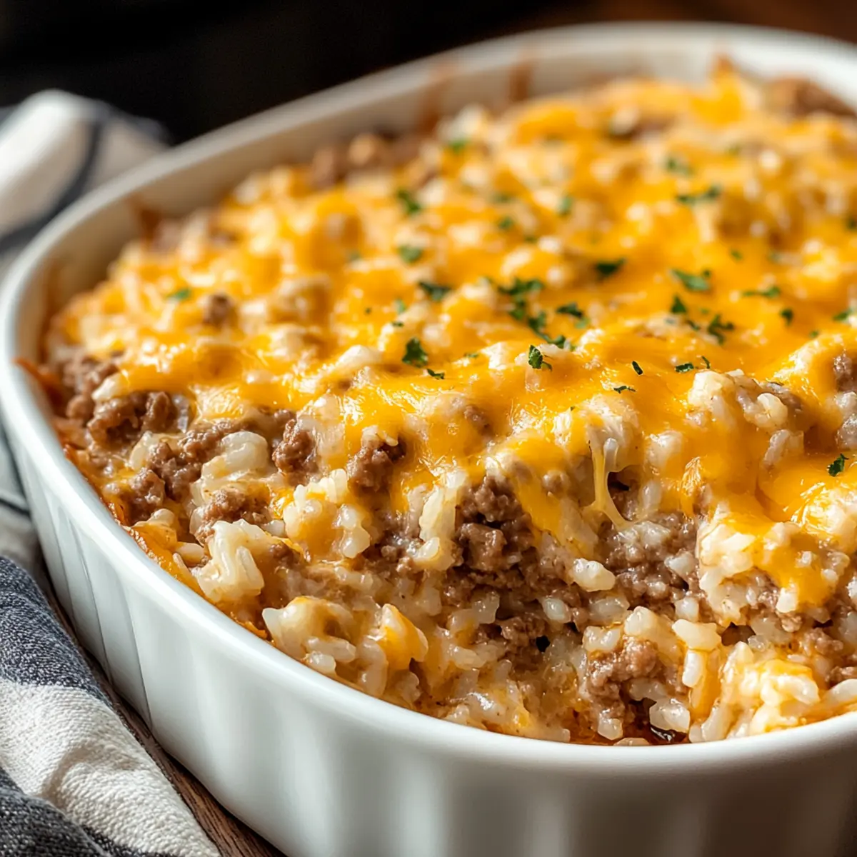 Ein herzhafter Käse-Hackfleisch- und Reisauflauf, der die ganze Familie begeistert.