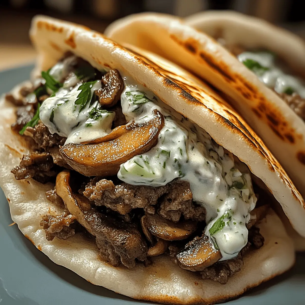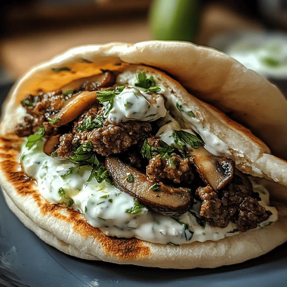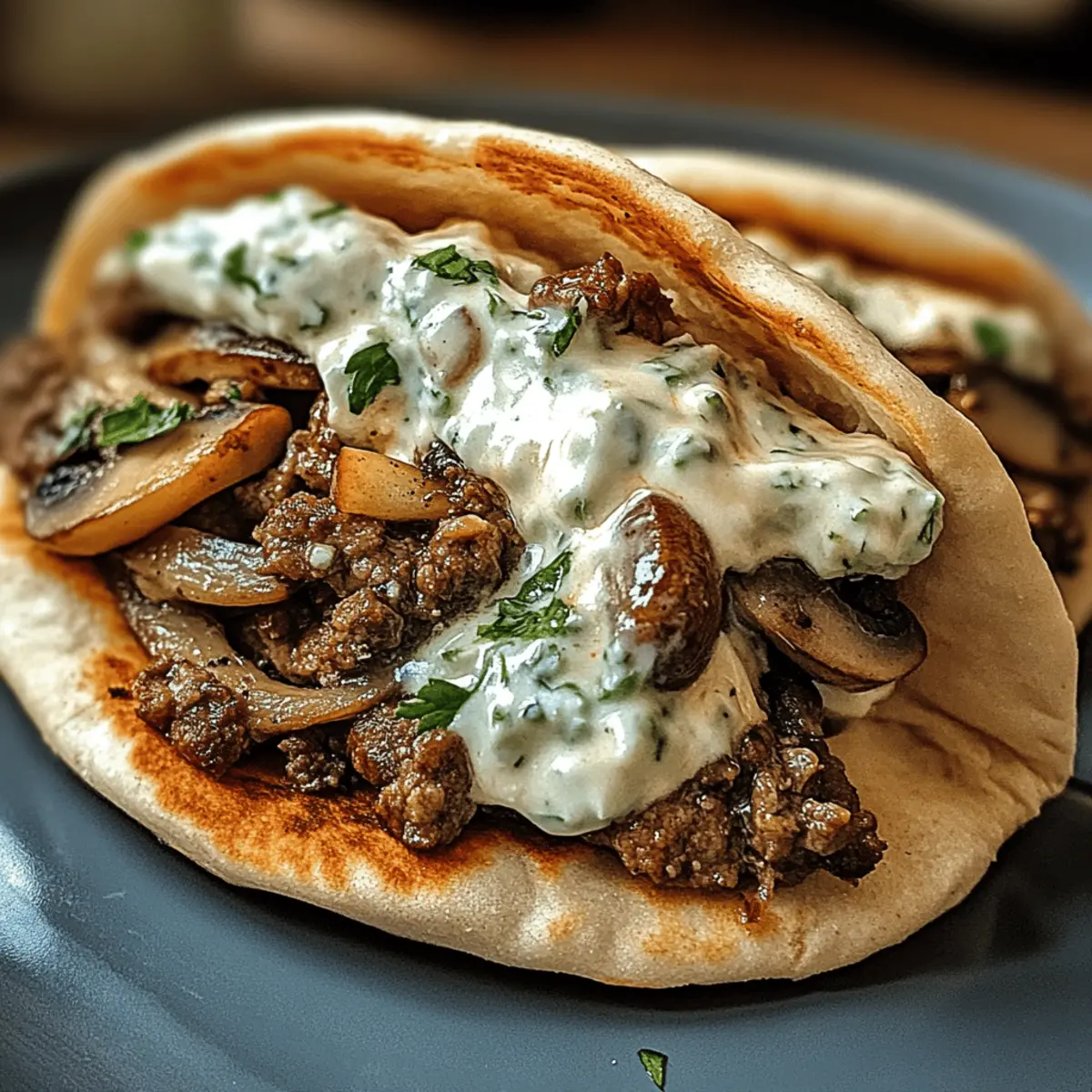 In der Hektik des Alltags ist es manchmal schwer, etwas Leckeres auf den Tisch zu zaubern, ohne dass es stundenlang dauert. Doch mit meinen Käse-Rindfleisch und Pilz-Pita-Taschen mit Tzatziki-Sauce wird Kochen zum Kinderspiel! Diese herzhaften Pita-Taschen vereinen saftiges Rindfleisch und aromatische Pilze, umhüllt von zartschmelzendem Käse – einfach unwiderstehlich. Die erfrischende Tzatziki-Sauce sorgt für eine perfekte Balance und macht sie zum idealen Gericht für entspannte Abende oder gesellige Zusammenkünfte. Und das Beste? Sie sind leicht anpassbar, sodass jeder seine eigenen Lieblingszutaten einbringen kann. Neugierig, wie du diese köstlichen Pita-Taschen ganz einfach selbst zubereiten kannst? Lass uns gleich loslegen! Warum wirst du diese Pita-Taschen lieben? Leichtigkeit: Die Zubereitung dieser Pita-Taschen ist kinderleicht und braucht nur wenige Schritte. Ideal für Kochanfänger! Vielseitigkeit: Ob mit zusätzlichem Gemüse oder anderen Käsesorten, jeder kann seine Lieblingsversion kreieren – ein Rezept für die ganze Familie! Würzig und frisch: Die Kombination aus herzhaftem Rindfleisch, Pilzen und der kühlen Tzatziki-Sauce sorgt für ein Geschmacksabenteuer, das begeistert. Perfekte Snacks: Diese Pita-Taschen sind nicht nur ein leckeres Abendessen, sondern auch tolle Teilchen für Partys oder Treffen mit Freunden. Mit einem frischen Salat oder knusprigen Pommes hast du ein rundum gelungenes Gericht! Wenn du nach weiteren köstlichen Ideen suchst, schau dir auch Gemüseauflauf mit Creme oder Knoblauchbrot mit Käse an! Zutaten für Käse-Rindfleisch und Pilz-Pita-Taschen • Diese köstlichen Pita-Taschen sind schnell zubereitet und jeder wird sie lieben! Für die Füllung Rinderhackfleisch – der Hauptproteinlieferant; wähle mageres Fleisch für eine gesündere Option. Champignons – verleihen der Füllung eine herzhafte, umami Note; kannst jede Pilzart verwenden, die dir gefällt. Käse (z.B. Mozzarella oder Cheddar) – sorgt für die cremige, schmelzige Textur; für eine vegane Variante einfach mit pflanzlichem Käse austauschen. Pita-Brot – dient als Hülle für die Füllung; Vollkorn-Pita ist eine gesündere Wahl. Für die Tzatziki-Sauce Griechischer Joghurt – die Basis der Tzatziki-Sauce, sorgt für Cremigkeit; kann durch Sauerrahm ersetzt werden. Gurke – sorgt für Frische in der Sauce; kann gerieben oder gewürfelt verwendet werden. Knoblauch – intensiviert den Geschmack; frischer Knoblauch liefert die besten Ergebnisse. Zitronensaft – bringt einen frischeren Geschmack in die Tzatziki; Limettensaft kann auch verwendet werden. Salz und Pfeffer – für die nötige Würze. Jede Zutat trägt zu den köstlichen Käse-Rindfleisch und Pilz-Pita-Taschen mit Tzatziki-Sauce bei, die nicht nur sämig, sondern auch vollgepackt mit Geschmack sind! Schritt-für-Schritt-Anleitung für Käse-Rindfleisch und Pilz-Pita-Taschen mit Tzatziki-Sauce Step 1: Tzatziki-Sauce vorbereiten In einer Schüssel griechischen Joghurt, geriebene Gurke, fein gehackten Knoblauch, Zitronensaft, Salz und Pfeffer gut vermischen. Rühre alles zusammen, bis die Zutaten gut kombiniert sind. Decke die Schüssel ab und stelle die Tzatziki-Sauce für mindestens 30 Minuten in den Kühlschrank, damit sie schön durchziehen kann. Dadurch entsteht eine erfrischende Begleitung für die Käse-Rindfleisch und Pilz-Pita-Taschen. Step 2: Rinderhackfleisch und Pilze anbraten Erhitze eine große Pfanne bei mittlerer Hitze und füge das Rinderhackfleisch hinzu. Brate es für etwa 5-7 Minuten an, bis es gleichmäßig gebräunt ist. Dann die in Scheiben geschnittenen Champignons dazugeben und mit Salz und Pfeffer würzen. Rühre alles gut um und brate es weiter, bis die Pilze zart sind, etwa weitere 3-4 Minuten. Dies sorgt für eine herzhafte Füllung der Pita-Taschen. Step 3: Käse schmelzen Wenn das Rinderhackfleisch und die Pilze fertig sind, reduziere die Hitze auf niedrig. Füge den gewählten Käse (z.B. Mozzarella oder Cheddar) hinzu und rühre, bis der Käse vollständig geschmolzen ist. Achte darauf, die Mischung gut zu vermengen, damit der Käse gleichmäßig verteilt ist. Dies verleiht den Käse-Rindfleisch und Pilz-Pita-Taschen die gewünschte Cremigkeit und einen köstlichen Geschmack. Step 4: Pita-Taschen zusammenstellen Nehme die Pita-Brote zur Hand und öffne sie vorsichtig. Fülle jedes Pita-Brot mit einer großzügigen Portion der Rinderhackfleisch- und Pilzmischung. Achte darauf, dass die Füllung gleichmäßig verteilt ist, um ein Überlaufen zu vermeiden. Toppe die Füllung mit einem Löffel der vorbereiteten Tzatziki-Sauce für zusätzlichen Geschmack. Step 5: Servieren Die Käse-Rindfleisch und Pilz-Pita-Taschen sollten warm serviert werden. Platziere die gefüllten Pita-Taschen auf einem Teller und serviere sie zusammen mit einem frischen Salat oder knusprigen Pommes. Achte darauf, dass die Tzatziki-Sauce zusätzlich serviert wird, sodass jeder nach Belieben nachlegen kann. Dieses Gericht verspricht einen köstlichen Genuss für alle! Variationen für Käse-Rindfleisch und Pilz-Pita-Taschen Lass deiner Kreativität freien Lauf und passe dieses Rezept ganz nach deinem Geschmack an! Gemüseboost: Füge gewürfelte Paprika oder Spinat zur Fleischmischung hinzu für eine nahrhafte Ergänzung. So kannst du ganz einfach die Vitamine aufstocken. Andere Käsesorten: Probiere Feta oder Gouda aus, um dem Gericht eine neue Note zu verleihen. Der kräftige Geschmack von Feta bringt eine mediterrane Note, die fantastisch harmoniert. Leichtere Proteine: Verwende Putenschnitzel oder Hähnchen statt Rinderhackfleisch für eine schlankere Variante. Diese Optionen sind ebenso köstlich und bieten eine schöne Abwechslung. Gewürzvariationen: Experimentiere mit verschiedenen Kräutern in der Tzatziki-Sauce, wie Dill oder Minze, um unterschiedliche Geschmacksprofile zu entdecken. Ein wenig frisches Dill bringt einen wunderbaren klaren Geschmack. Veganer Genuss: Ersetze das Rinderhack durch p